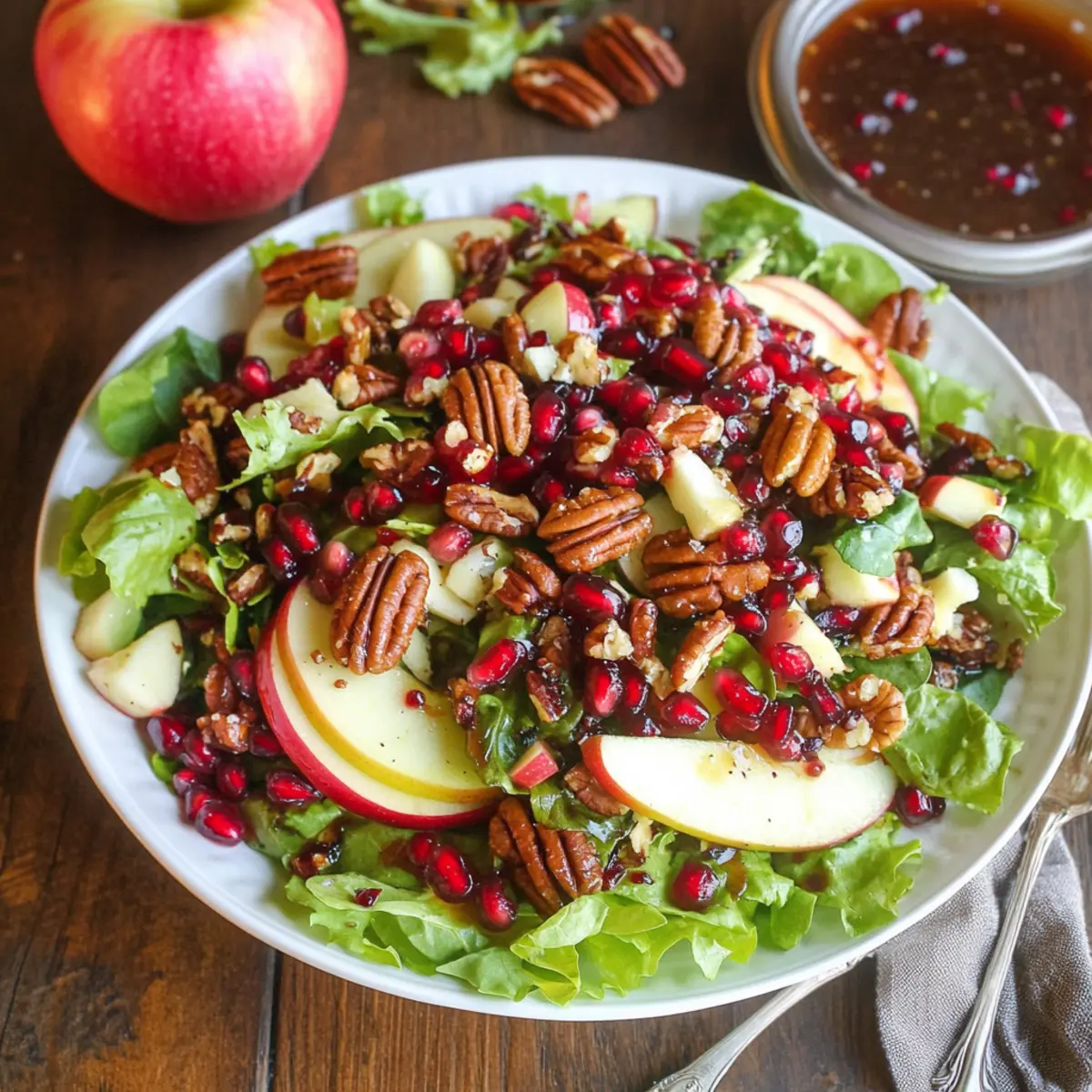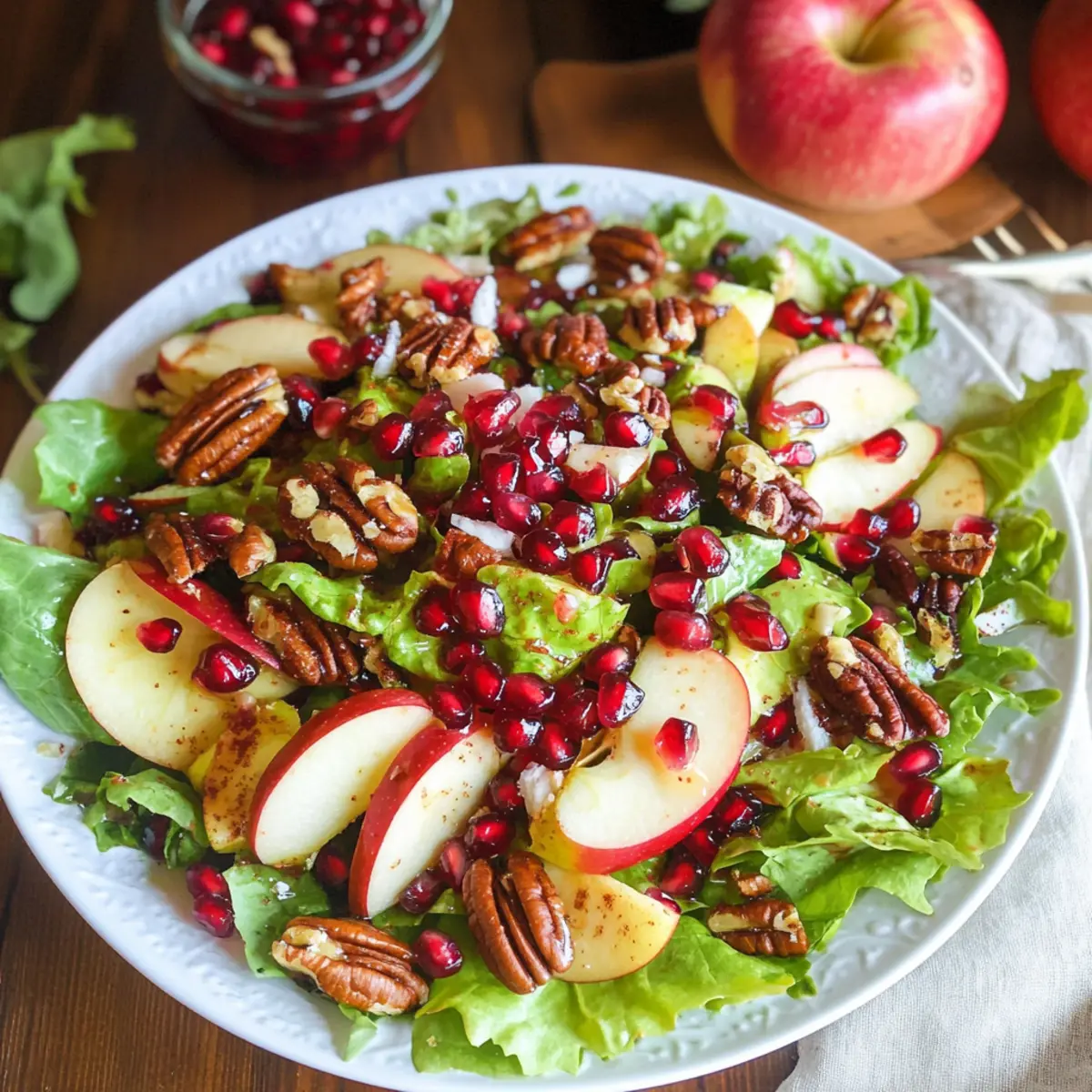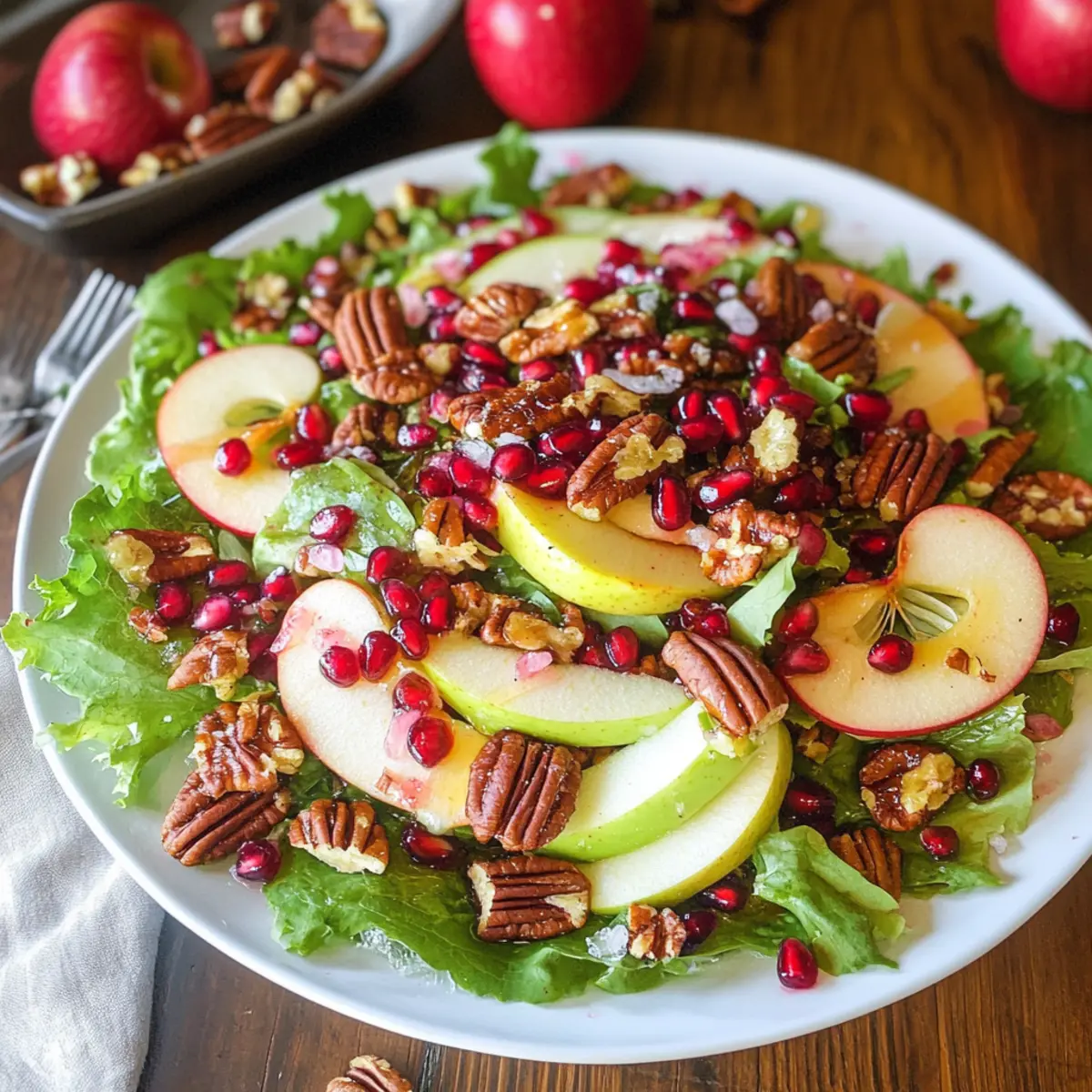 Jump to Recipe Print RecipeAs I stood in my kitchen, the crisp aroma of fresh apples mingled with the vibrant burst of pomegranate seeds, transporting me into the holiday spirit. This Apple Pomegranate Salad not only embodies the essence of festive gatherings but also brings a delightful balance of sweet and savory to the table. With luscious ingredients like crunchy candied nuts and seasonal fruits, this salad is a quick, gluten-free option that can be prepped in just 20 minutes. Whether you’re adding it to your Thanksgiving feast or bringing it to a potluck, this visually stunning dish is sure to impress your family and friends. Are you ready to make a salad that’s as delicious as it is beautiful? Why should you try this salad? Festive Vibes: This Apple Pomegranate Salad brings a burst of holiday cheer to your table, making it the perfect centerpiece for any celebration. Crowd Pleaser: The combination of sweet and tart flavors paired with crunchy textures appeals to everyone, from kids to adults. Quick Preparation: It takes just 20 minutes to whip up this salad, leaving you more time to enjoy the festivities. Versatile Serving: Perfect as a side for roasted meats or as a light lunch option, it suits every occasion beautifully. Don’t forget to check out my delicious Apple Feta Salad for another festive option! Apple Pomegranate Salad Ingredients For the Candied Nuts • Butter – Adds richness and is essential for coating the nuts; use oil for a vegan version. • Pecans (or Walnuts) – Provide a delightful crunch and nutty flavor; almonds can be a great substitute. • Pumpkin Seeds (Raw Pepitas) – Offer healthy fats and a satisfying crunch; can be replaced with sunflower seeds if desired. • Brown Sugar – Sweetens the nuts during cooking; maple syrup can give a different sweetness profile. For the Salad • Lettuce Mix – Forms the fresh base of the salad; spinach or arugula can be used for variety. • Apples (1-2, thinly sliced) – Add sweetness and crispness; pears make a tasty alternative. • Pomegranate Seeds – Provide bursts of tart flavor and beautiful color; swap with dried cherries or cranberries if needed. • Dried Cranberries – Contribute sweetness and chewiness; any other dried fruits can substitute. • Feta Cheese (crumbled) – Adds a tangy contrast to the sweetness; goat cheese or omitting it works for a vegan option. • Red Onion (thinly sliced) – Offers sharpness and depth; shallots can be a milder alternative. • Kosher Salt – Enhances flavors without making the dish overly salty. • Black Pepper – Provides a gentle kick of spice. For the Dressing • Dijon Mustard – Adds a tangy kick to the dressing; whole grain mustard can provide more texture. • Maple Syrup or Honey – Sweetens the dressing beautifully; agave syrup serves well for a vegan alternative. • White Wine Vinegar – Provides acidity that balances the sweetness; lemon juice can work for a brighter flavor. • Olive Oil – A rich base for the dressing; consider any neutral oil or avocado oil for a different taste. This delightful Apple Pomegranate Salad is not only a feast for the eyes but also a burst of flavors that will delight your guests this holiday season! Step‑by‑Step Instructions for Apple Pomegranate Salad Step 1: Prepare Candied Nuts In a skillet over medium-low heat, melt 2 tablespoons of butter. Once melted, add 1 cup of pecans and ½ cup of pumpkin seeds along with ¼ cup of brown sugar. Stir constantly for about 3-4 minutes until the nuts are fragrant and evenly coated in the sugar, turning a golden color. Pour the mixture onto a parchment-lined tray to cool completely. Step 2: Make Dressing In a jar, combine 2 tablespoons of Dijon mustard, 2 tablespoons of maple syrup (or honey), and ¼ cup of white wine vinegar. Add ⅓ cup of olive oil, a pinch of kosher salt, and freshly ground black pepper to taste. Secure the lid and shake vigorously until the dressing is well emulsified, creating a smooth, creamy consistency that will beautifully coat your Apple Pomegranate Salad later. Step 3: Prep Salad Ingredients Prepare your fresh ingredients by thinly slicing 1-2 crisp apples and ¼ of a red onion. Next, carefully remove the arils from 1 pomegranate, enjoying the juicy seeds as you go. Set aside these beautiful ingredients, allowing their vibrant colors and flavors to shine through in your festive Apple Pomegranate Salad. Step 4: Assemble Salad In a large mixing bowl, place 6 cups of your selected lettuce mix. Gently add half of the sliced apples, red onions, pomegranate seeds, and a handful of dried cranberries. Drizzle some of the prepared dressing over the ingredients and toss carefully, ensuring an even distribution without bruising the delicate greens. Step 5: Serve Transfer the assembled Apple Pomegranate Salad to a serving platter for an impressive presentation. Top with the remaining ingredients, including the candied nuts and a crumbly portion of feta cheese. Finish with a light drizzle of the extra dressing, inviting everyone to dive into this luscious, festive dish that captures the holiday spirit! Helpful Tricks for Apple Pomegranate Salad Nutty Perfection: Keep an eye on the candied nuts as they can burn quickly. Stir continuously for even caramelization and to prevent sticking. Vibrant Presentation: Toss only half of the salad ingredients initially; this helps distribute flavors evenly and prevents sinking. Freshness Hack: Slice apples just before serving to avoid browning. A quick dip in lemon juice can also keep them crisp and vibrant. Dress Right: Coat the salad with just enough dressing to enhance flavors without overwhelming. Serve extra dressing on the side for guests who may want more. Balanced Flavor: Taste your dressing before adding it to the salad; adjust sweetness or acidity based on your preference to enhance the Apple Pomegranate Salad experience. Make Ahead Options These vibrant Apple Pomegranate Salad ingredients are perfec
