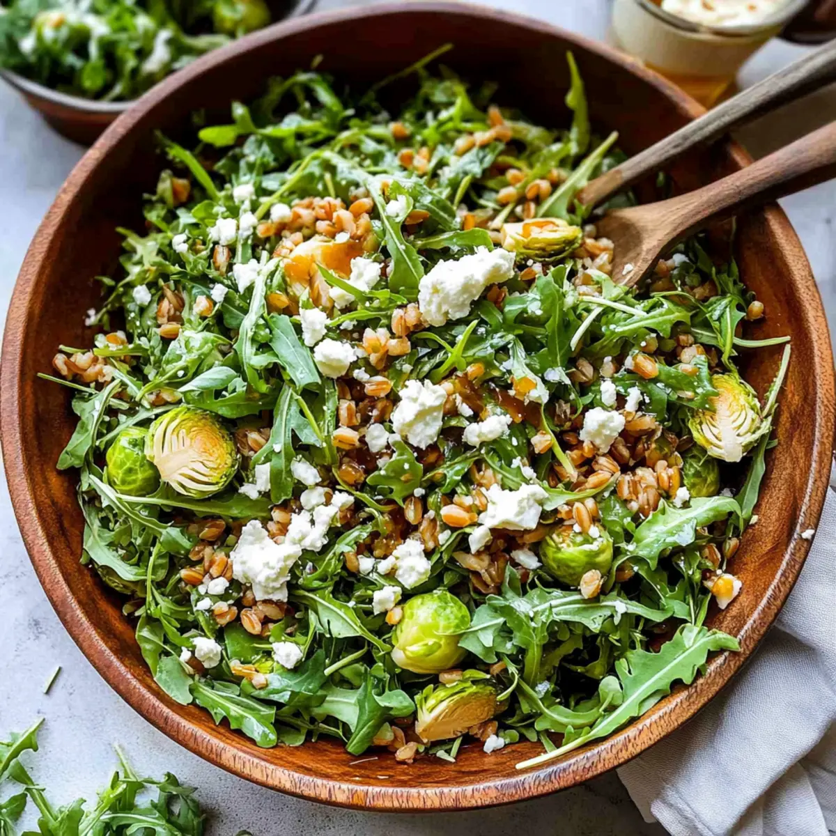 In a large mixing bowl, combine fresh arugula, shredded Brussels sprouts, cooled farro, and chopped pecans. Toss gently with a pinch of kosher salt. This vibrant mixture will serve as the base of your salad, ensuring that every bite is filled with peppery freshness and satisfying crunch from the Brussels sprouts.