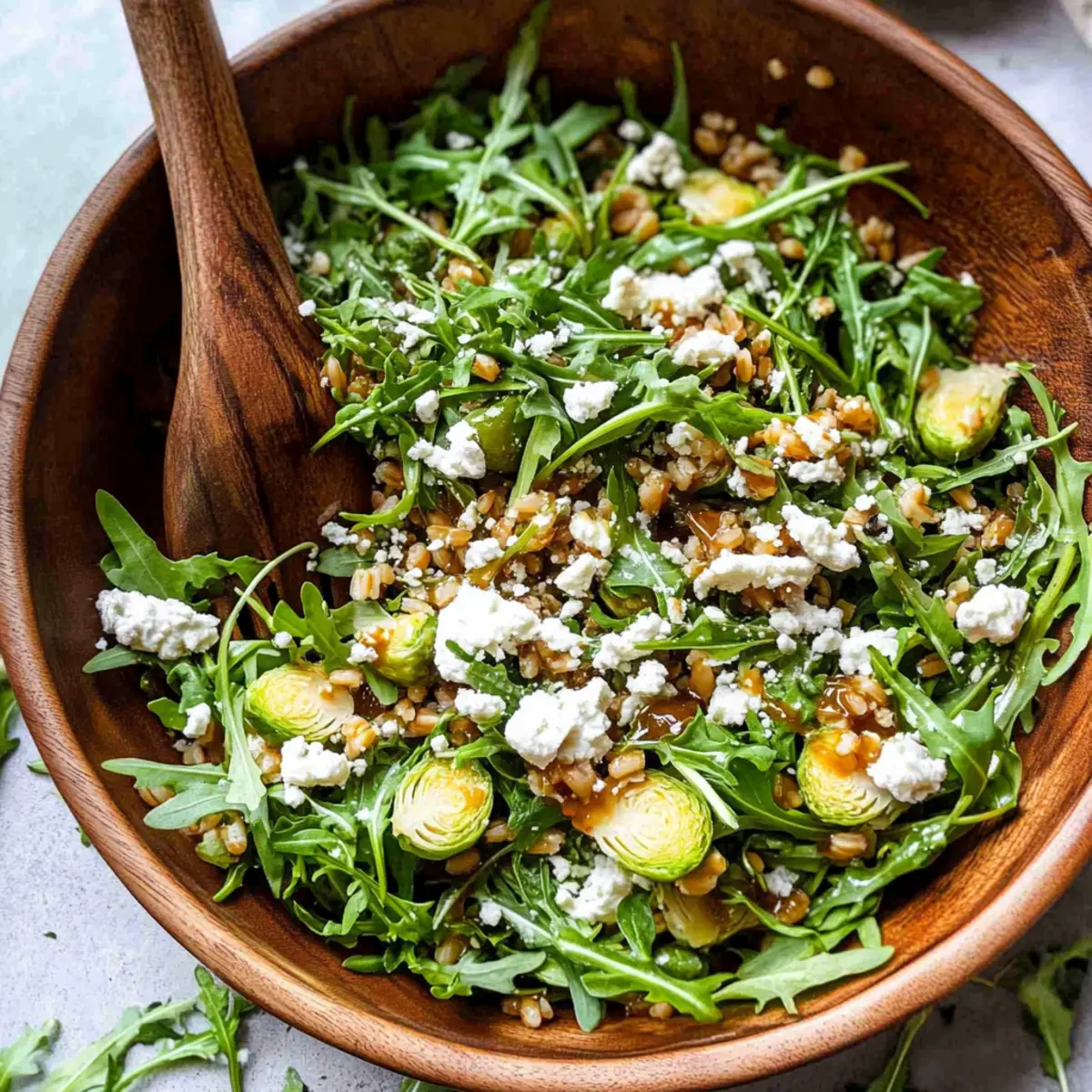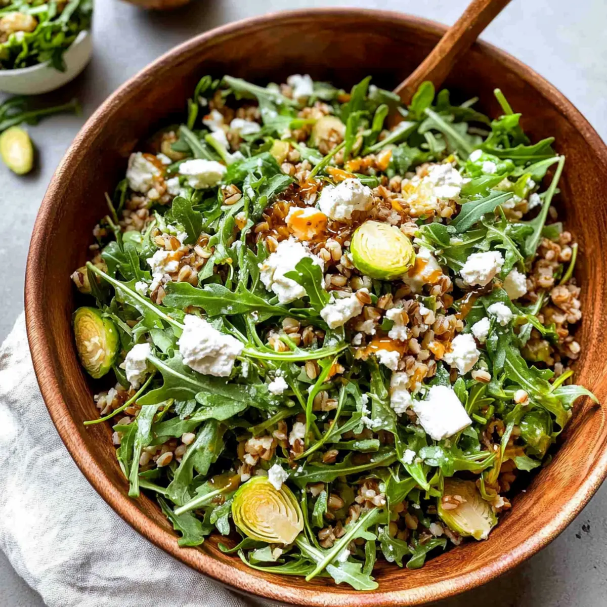 3. In a large mixing bowl, combine fresh arugula, shredded Brussels sprouts, cooled farro, and chopped pecans. Toss gently with a pinch of kosher salt.