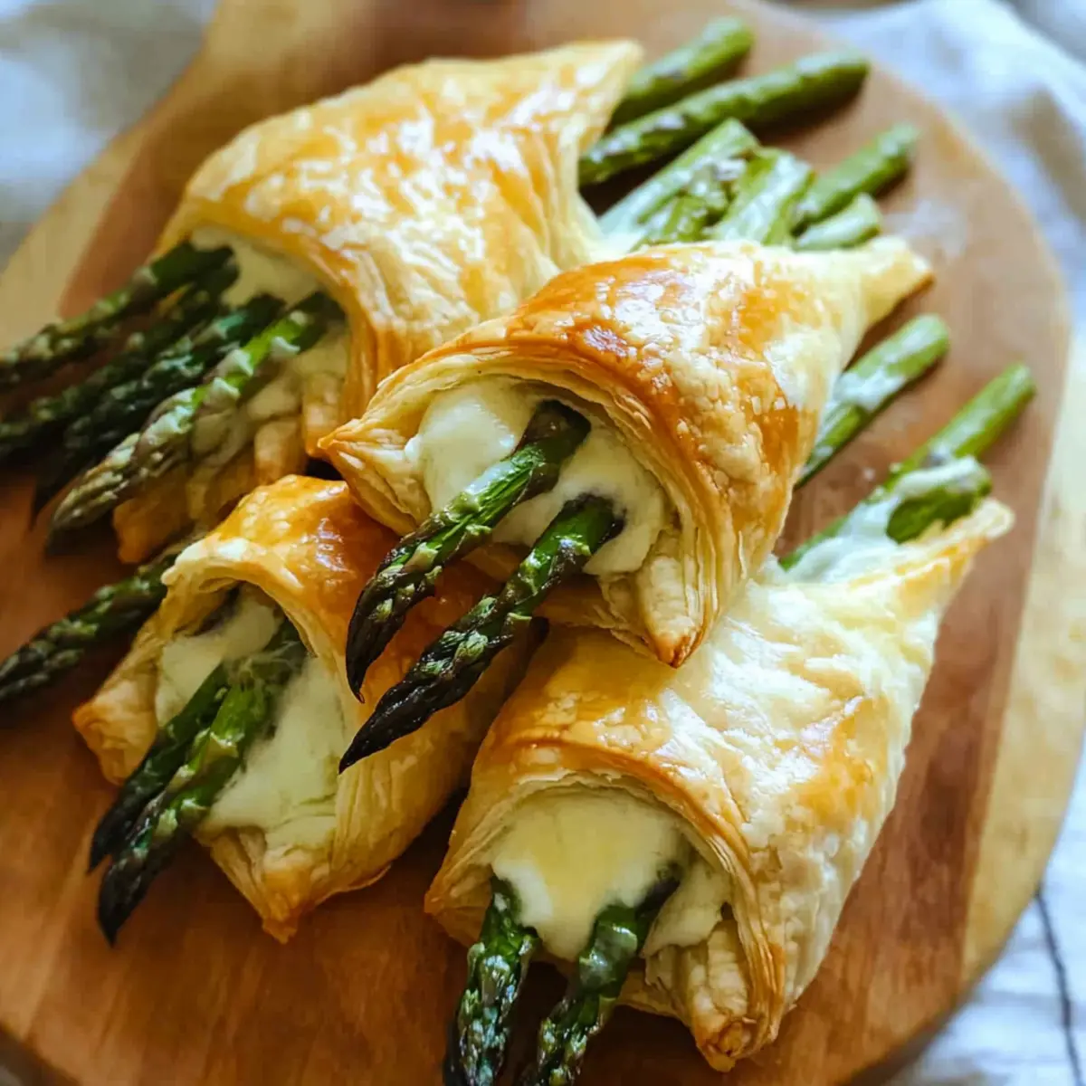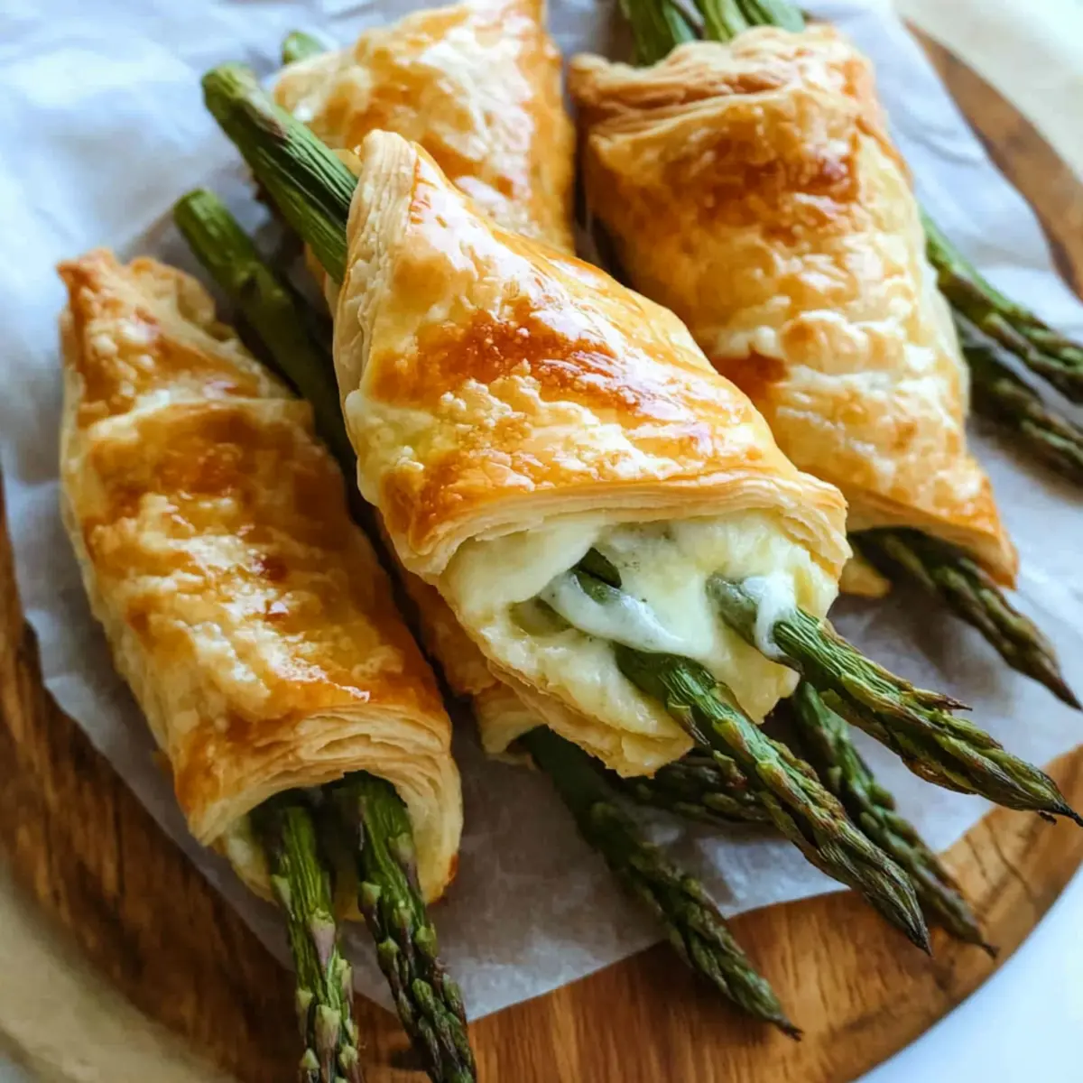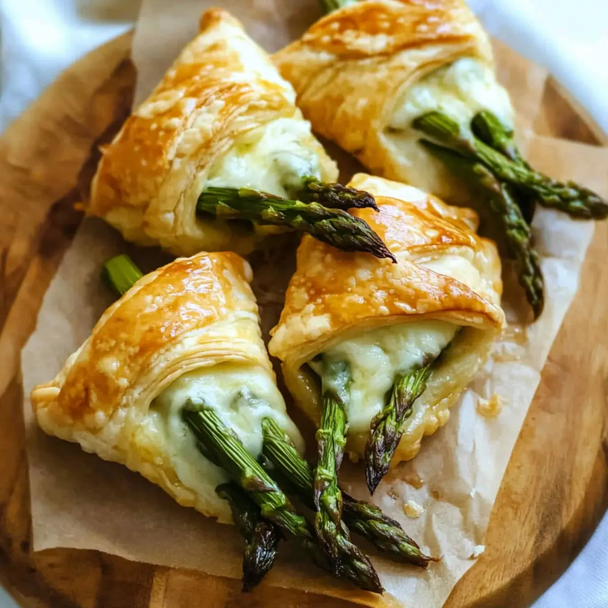 Jump to Recipe Print RecipeA delightful crunch, a dash of creaminess, and a burst of flavor await you with every bite of these Savory Asparagus Puff Pastry Bundles. Whipping up this quick and easy brunch recipe is just a 30-minute adventure in your kitchen—perfect for those who crave homemade goodness but are short on time. The combination of tender asparagus and gooey, melted cheese nestled in flaky golden pastry makes this dish not only a crowd-pleaser but also a fantastic way to celebrate special occasions like Easter and Mother’s Day. Plus, it’s vegetarian-friendly and versatile enough to accommodate meat lovers, too! Are you ready to make an irresistible brunch that your friends and family will rave about? Why Choose Asparagus Puff Pastry? Quick and Easy: This recipe comes together in just 30 minutes, making it a breeze for even the busiest home cooks. Crowd-Pleasing Delight: The gooey melted cheese partnered with tender asparagus makes these bundles a guaranteed hit at any brunch gathering, much like our delightful Garlic Lemon Asparagus. Versatile Offering: Feel free to customize with your favorite vegetables or cheeses—your creativity can transform these bundles into a unique dish each time. Perfect for Celebrations: Whether it’s an Easter feast or a Mother’s Day brunch, these Savory Asparagus Puff Pastry Bundles elevate any occasion with their elegant appeal. Nutritious and Satisfying: Loaded with fiber and antioxidants, asparagus keeps this dish deliciously healthy, proving that comfort food can also be guilt-free! Asparagus Puff Pastry Ingredients For the Filling • Asparagus – Fresh green vegetable that provides a tender, flavorful core; trim two inches from the bottom of the stalks for tenderness. • Dijon Mustard – Adds a tangy bite to the filling; can be substituted with grainy mustard for a different texture. • Mayonnaise – Provides creaminess and richness; omit if preferred or substitute with Greek yogurt for a lighter option. • Parmesan Cheese – Rich, salty cheese that enhances flavor; use high-quality Parmigiano Reggiano for the best taste. • Mozzarella Cheese – Mild, melty cheese that pairs well with asparagus; avoid pre-shredded versions for better melting. For the Pastry • Puff Pastry – Quick and convenient base for the recipe, offering a flaky texture; use fresh store-bought for best results. • Egg & Water (for egg wash) – Gives a golden color to the pastry when brushed before baking; essential for a shiny, appealing crust. Get ready to indulge in these Asparagus Puff Pastry Bundles, where every bite is a delightful mix of flavor and texture! Step‑by‑Step Instructions for Asparagus Puff Pastry Step 1: Preheat the Oven Begin by preheating your oven to 400°F (200°C). This ensures that the Asparagus Puff Pastry Bundles bake evenly and develop a beautiful golden color. While the oven is heating, you can prepare the asparagus to ensure a smooth and efficient cooking process. Step 2: Prepare the Asparagus Trim the tough ends of the asparagus by cutting off about two inches from the bottom of each stalk. If using medium to large stalks, toss them with olive oil, salt, and pepper. Then, place them on a baking sheet and roast for 5 minutes until they are slightly tender. If working with pencil-thin asparagus, you can skip this step and use them raw. Step 3: Mix the Filling In a small bowl, combine Dijon mustard and mayonnaise, mixing until smooth and well blended. This creamy mixture adds a tangy flavor to the Asparagus Puff Pastry Bundles. Set the bowl aside to allow the flavors to meld while you prepare the puff pastry. Step 4: Prepare the Puff Pastry Take your store-bought puff pastry and unfold it on a clean, lightly floured surface. Cut it into 6 equal squares, ensuring each piece is big enough to enclose the filling. Keep the pastry sheets covered with a damp cloth to prevent them from drying out while you work. Step 5: Assemble the Pastry Spread the mustard-mayo mixture evenly onto each puff pastry square, covering most of the surface. Place 4-6 roasted asparagus spears on top, allowing the ends to overhang slightly. Sprinkle a generous amount of mozzarella and Parmesan cheese over the asparagus for that gooey, cheesy goodness. Step 6: Enclose the Filling Fold one side of the puff pastry over the asparagus, then fold the opposite side to secure the filling inside. Make sure to pinch the edges well to prevent any leakage during baking. Place the assembled bundles onto a parchment-lined baking sheet, leaving some space between each piece for even cooking. Step 7: Brush for a Golden Finish In a small bowl, whisk together the egg and a splash of water to create an egg wash. Using a pastry brush, gently coat the tops of the savory asparagus puff pastry bundles with the egg wash. This step is crucial for achieving that shiny, golden brown finish that makes these pastries so appetizing. Step 8: Bake the Bundles Carefully transfer the baking sheet to the preheated oven and bake the Asparagus Puff Pastry Bundles for 15-18 minutes. Keep an eye on them until they’re puffy and beautifully golden brown. The delicious aroma will fill your kitchen, signaling that they’re almost ready! Step 9: Cool and Serve Once baked, remove the bundles from the oven and let them cool for a few minutes on the baking sheet. This cooling time allows the cheese to set slightly while ensuring you do not burn your mouth on the cheesy filling. Serve warm and enjoy your delicious Asparagus Puff Pastry Bundles with family or friends! Asparagus Puff Pastry Variations Feel free to explore these delightful twists to make your Asparagus Puff Pastry truly your own! Vegetarian Delight: Swap asparagus for spinach for a creamy green fill. Fresh spinach wilts down beautifully and pairs well with the cheeses. Hearty Addition: Add prosciutto or bacon slices inside for a savory punch. The saltiness enhances the overall flavor, making it a meaty treat! Cheese Swap: Use g