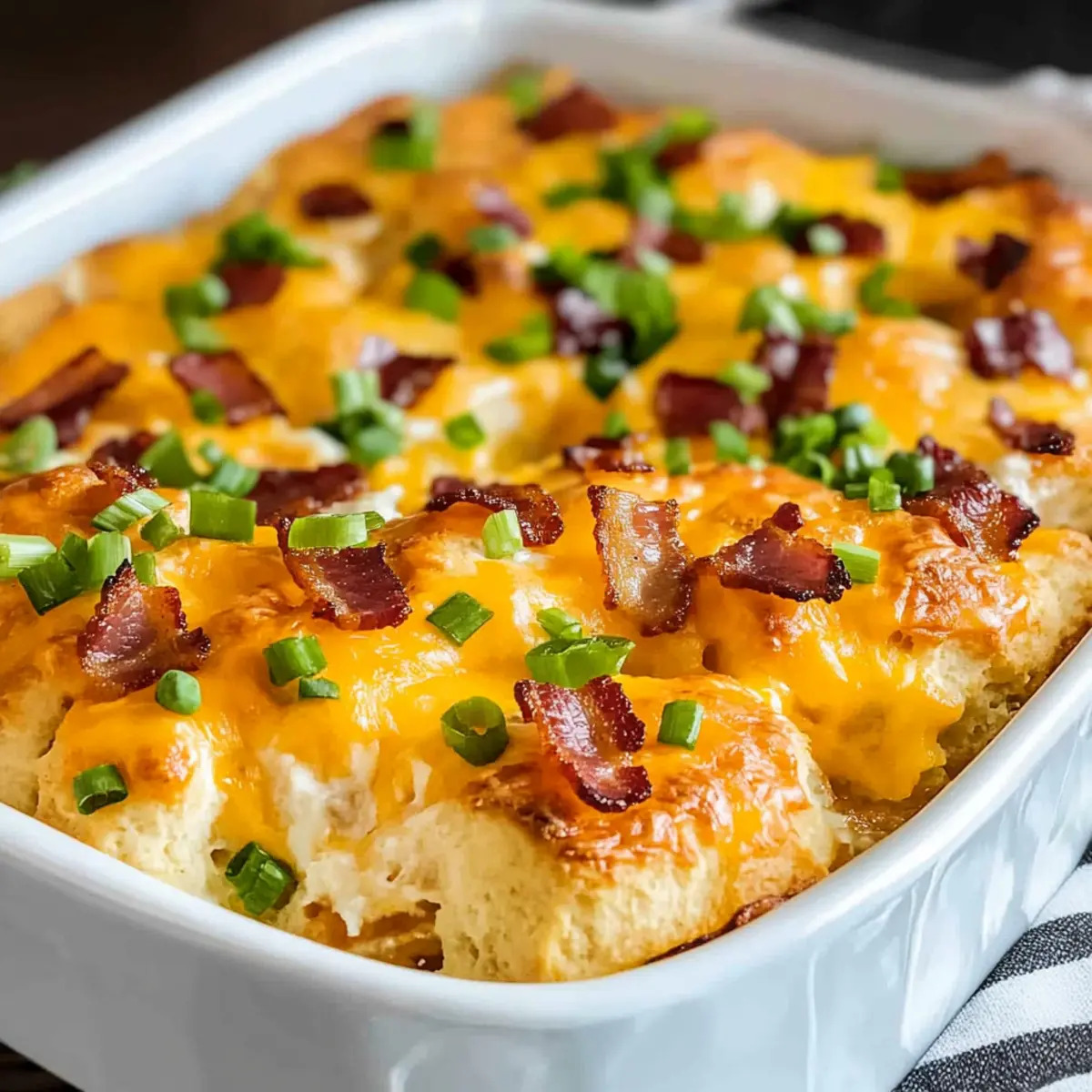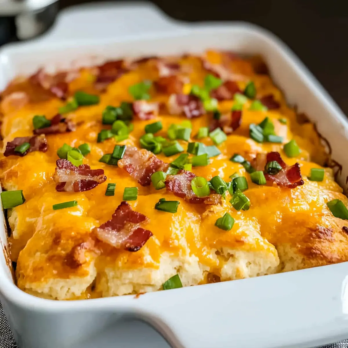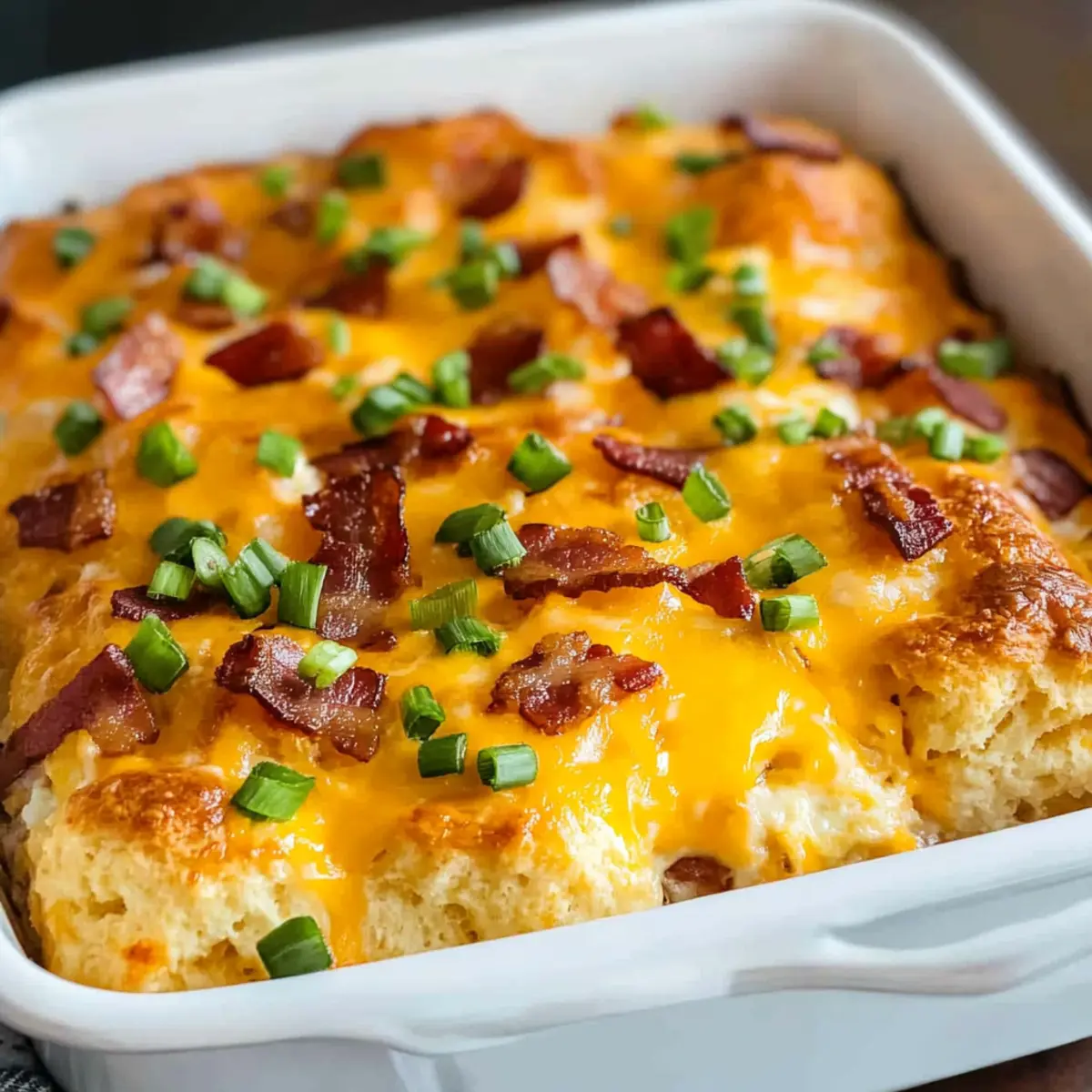 Jump to Recipe Print RecipeThe aroma wafting from the oven is like a morning hug, gently tugging you from the comfort of your dreams to the promise of a delightful breakfast. This Bacon and Egg Biscuit Casserole is my go-to when I want something simple yet satisfying to fuel the day. With just a handful of ingredients, this family-friendly recipe is a game changer, allowing you to prep it the night before and enjoy a stress-free morning. Imagine the buttery biscuits mingling with crispy bacon and fluffy eggs, creating a warm embrace for your taste buds. Plus, you can easily customize it with your favorite veggies or cheeses, making it not just a dish but an opportunity for creative brunching! So, are you ready to transform your mornings and impress your loved ones with this comforting casserole? Let’s dive into the recipe! Why is this Bacon and Egg Casserole a must-try? Simplicity, This recipe includes just a handful of ingredients, making it perfect for cooks of all levels. Make-Ahead Magic, Prepare it the night before for an easy, stress-free morning without sacrificing flavor. Family-Friendly, Everyone will love the combination of crispy bacon, fluffy eggs, and buttery biscuits, making it a hit with kids and adults alike! Versatility, Add your favorite veggies or cheeses for a personalized twist that suits your family’s tastes. For more ideas, check out Cheesy Broccoli Casserole or learn how to make Avocado Bacon Sandwich. Time-Saving, The baking time is minimal, leaving you with extra moments to enjoy your morning coffee. You won’t be able to resist the warm, inviting aroma wafting through your kitchen! Bacon and Egg Biscuit Casserole Ingredients For the Casserole • Large Eggs – Provide structure and protein to the casserole. • Half and Half Cream – Adds richness and creaminess; substitute with full-fat milk for a lighter version. • Cheddar Cheese (shredded) – Gives a savory flavor that complements the other ingredients; feel free to use any melting cheese for variation. • Bacon (cooked and chopped) – Adds a smoky, salty crunch; consider turkey bacon or vegetarian bacon for alternatives. • Green Onions (chopped) – Adds freshness and a mild onion flavor; substitute with finely diced onions if needed. • Refrigerated Biscuit Dough – Provides a flaky, comforting base; homemade biscuit dough can be a healthier option. • Salt & Pepper – Essential for seasoning to enhance overall flavor. Optional Add-Ins • Diced Vegetables – Add sautéed bell peppers or spinach for extra nutrition and flavor. • Different Cheeses – Experiment with feta or gouda for a unique twist on this Bacon and Egg Biscuit Casserole. • Cooked Sausage – Swap out bacon for cooked sausage if you’re looking for a different savory note. Step‑by‑Step Instructions for Bacon and Egg Biscuit Casserole Step 1: Preheat and Prepare Begin by preheating your oven to 350°F (175°C). While the oven warms up, take a 9×13 inch casserole dish and generously grease it with cooking spray or butter to prevent sticking. This will create a beautiful golden crust on your Bacon and Egg Biscuit Casserole. Step 2: Whisk the Egg Mixture In a large mixing bowl, crack in the eggs and pour in the half and half cream. Add a pinch of salt and pepper, then whisk everything together until well combined and slightly frothy. This mixture will create the fluffy base for your casserole, so ensure it’s thoroughly blended for a smooth texture. Step 3: Add the Ingredients Once the egg mixture is ready, stir in half of the chopped bacon, breaking up any large pieces, followed by the quartered biscuit dough. Gently fold in two chopped green onions, ensuring all ingredients are evenly distributed throughout. This step brings the flavors of the Bacon and Egg Biscuit Casserole together beautifully. Step 4: Transfer to the Casserole Dish Carefully pour the mixed ingredients into the greased casserole dish, spreading them out evenly with a spatula. Make sure the biscuit pieces are submerged in the egg mixture for even baking. If you’re prepping it the night before, cover the dish with plastic wrap and refrigerate at this stage to let flavors meld. Step 5: Bake the Casserole Remove the plastic wrap, if applicable, and place the casserole in your preheated oven. Bake for about 25 minutes, or until the center is set and the edges are lightly puffed. You’ll know it’s ready when the top is golden and a toothpick inserted in the center comes out clean, signaling a perfectly cooked Bacon and Egg Biscuit Casserole. Step 6: Add the Finishing Touches Once baked, carefully take the casserole out of the oven. Sprinkle the remaining bacon and shredded cheddar cheese on top, allowing it to melt into a beautiful, gooey layer. Return the dish to the oven and bake for an additional 5-7 minutes until the cheese is bubbly and golden brown, creating a delicious crust. Step 7: Garnish and Serve After the second baking, remove the casserole from the oven and let it cool slightly. Top it off with the remaining chopped green onions for a fresh pop of color and flavor. Your mouth-watering Bacon and Egg Biscuit Casserole is now ready to be sliced and served, perfect for a brunch gathering or a cozy family breakfast. How to Store and Freeze Bacon and Egg Biscuit Casserole Fridge: Store any leftovers in an airtight container for up to 3 days. Make sure to let it cool completely before sealing to maintain moisture. Freezer: Properly wrap the casserole in plastic wrap and then aluminum foil to prevent freezer burn. It can be frozen for up to 2 months. Reheating: To reheat, place the casserole in the oven at 350°F (175°C) for about 20-25 minutes. You can also warm individual servings in the microwave for a quicker option. Make-Ahead Tip: Consider assembling the Bacon and Egg Biscuit Casserole the night before and refrigerating it, which allows for easy baking the next morning. Expert Tips for Bacon and Egg Biscuit Casserole Uniform Dough 