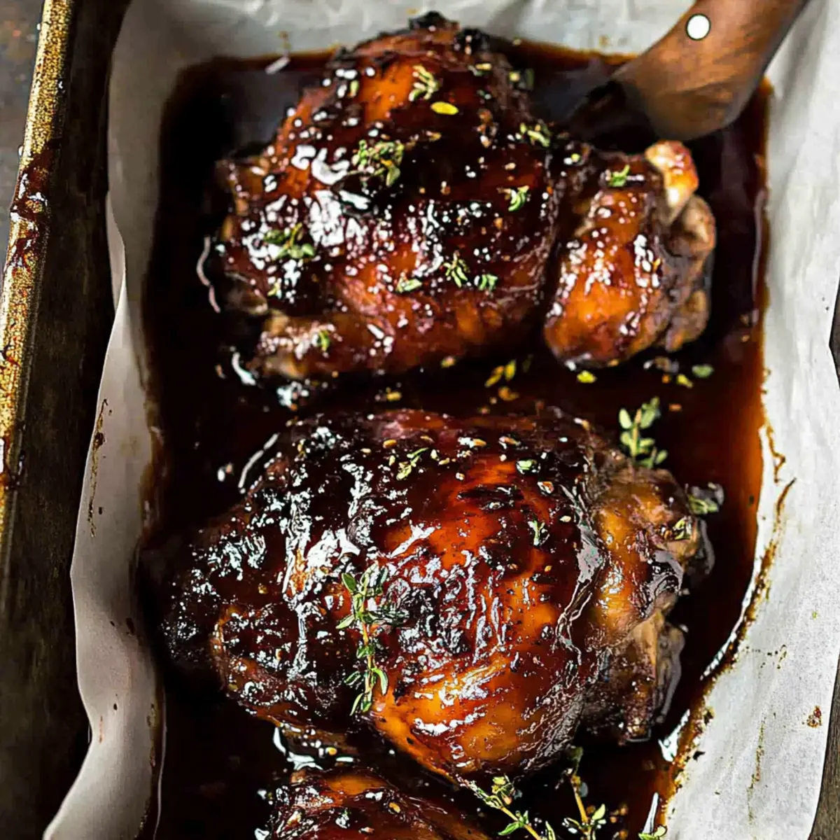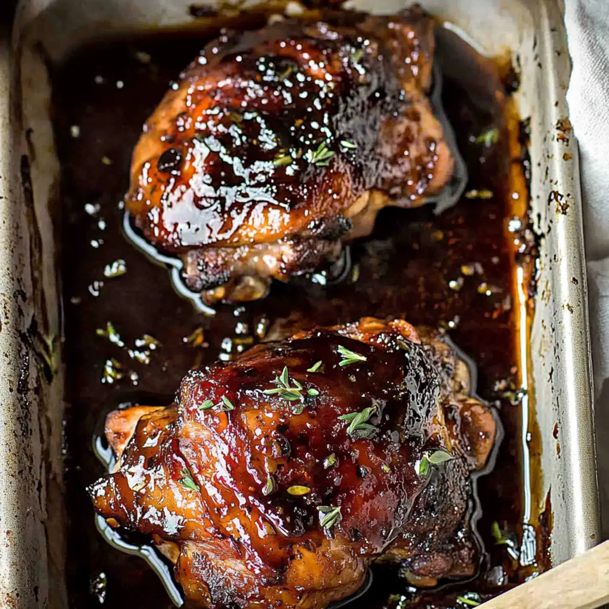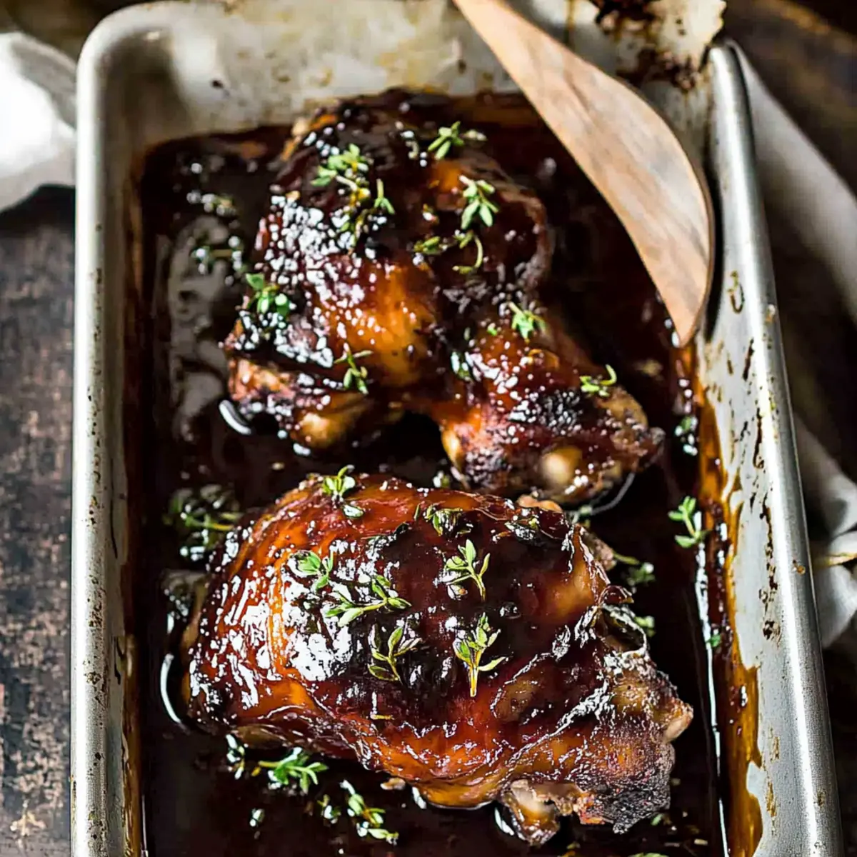 Jump to Recipe Print RecipeThe aroma of balsamic vinegar mixed with roasting chicken has a way of wrapping you in a comforting embrace, doesn’t it? That’s exactly how I feel when I whip up my Sticky Baked Balsamic Chicken. This recipe is a game-changer for busy weeknights or lazy Sundays—ready in just 55 minutes, it requires only 5 minutes of hands-on time! With its sweet and tangy glaze, this dish not only pleases the palate but also saves dinner with minimal effort. Packed with flavor and family-friendly, it’s perfect for those tired of the fast food routine. Plus, it reheats beautifully for leftovers that taste just as delightful. Are you ready to discover your new go-to weeknight dinner? What Makes This Chicken Recipe Irresistible? Ease of Preparation: This recipe takes just 5 minutes of hands-on time, making it an ideal choice for busy weeknights. Savory Sweet Balance: With a delicious mix of balsamic vinegar, honey, and garlic, every bite is a delightful dance of flavors that your family will adore. Versatile Serving Options: Perfect with rice or a refreshing salad, it’s easy to create a full meal that complements the rich flavors. Leftovers to Love: Not only does it taste amazing the first night, but reheating the chicken gives you a satisfying meal on busy days. Crowd-Pleasing Appeal: Your family will be begging for seconds, thanks to the sticky and caramelized glaze that elevates this dish above typical weeknight fare. Baked Balsamic Chicken Ingredients For the Chicken • Chicken thighs (1 kg / 2 lb) – This bone-in, skin-on option retains moisture, ensuring juicy results. For the Balsamic Glaze • Balsamic vinegar (1/4 cup / 65 ml) – Infuses tanginess, creating a rich depth of flavor in your baked balsamic chicken. • Soy sauce (2 1/2 tbsp / 50 ml) – Adds umami; opt for light soy sauce for a milder touch. • Honey (1/4 cup / 85 g / 65 ml) – Brings sweetness to balance the acidity, while thickening the sauce. • Brown sugar (1/4 cup / 45 g) – Enhances the glaze’s richness with an extra hint of sweetness. • Garlic (2 cloves, minced) – Aromatically elevates the sauce with its savory kick. This baked balsamic chicken dish is just a step away! Are you excited to experience the mouthwatering flavors? Step‑by‑Step Instructions for Baked Balsamic Chicken Step 1: Preheat the Oven Begin by preheating your oven to 180°C (350°F). While the oven warms up, prepare your baking dish by lining it with foil and parchment paper for easy cleanup. This groundwork ensures your baked balsamic chicken cooks evenly and retains its juicy flavor. Step 2: Prepare the Balsamic Glaze In a medium-sized bowl, mix together 1/4 cup of balsamic vinegar, 2 1/2 tablespoons of soy sauce, 1/4 cup of honey, 1/4 cup of brown sugar, and 2 minced garlic cloves. Stir the mixture until well combined, creating a sticky glaze that will enhance the savory goodness of the chicken during baking. Step 3: Arrange the Chicken Take 1 kg of chicken thighs and place them skin-side down in your prepared baking dish. Ensure the pieces are close, but not overcrowded. This allows the heat to circulate evenly, making your baked balsamic chicken perfectly tender and allowing the sauce to coat each piece. Step 4: Add the Glaze Carefully pour the luscious balsamic glaze over the chicken thighs, ensuring each piece is well coated. The glaze will bubble and caramelize as it bakes, creating a sticky, delicious covering that elevates the flavor of your chicken. Step 5: Bake the Chicken Slide the dish into your preheated oven and bake for 30 minutes. At this stage, your kitchen will fill with delightful smells as the chicken cooks. After 30 minutes, carefully turn the chicken thighs over, spooning some sauce over them to ensure they absorb all the flavors. Step 6: Finish Baking Continue to bake the chicken for another 20 minutes, keeping an eye on it to ensure it develops a beautiful caramelized glaze. You’ll know it’s done when the skin is golden and the juices run clear; this is the perfect sign of your sticky baked balsamic chicken being ready to shine. Step 7: Let It Rest Once baked, remove the dish from the oven and let the chicken rest for about 5 minutes. This resting period allows the juices to redistribute, ensuring each bite of your baked balsamic chicken is incredibly juicy and flavorful. Step 8: Serve and Enjoy Finally, drizzle any remaining thickened balsamic glaze over your chicken before serving. Pair it with rice or a fresh salad for a complete meal that will have your family asking for seconds! Make Ahead Options These Sticky Baked Balsamic Chicken thighs are perfect for meal prep enthusiasts! You can marinate the chicken in the balsamic glaze (balsamic vinegar, soy sauce, honey, brown sugar, and garlic) up to 24 hours in advance to enhance the flavors. Simply place the chicken in a sealed container with the glaze, refrigerate overnight, and it will be ready to bake when you are. If you prefer, you can also prep the sauce and store it separately for up to 3 days. When you’re ready to cook, just arrange the marinated chicken in a baking dish, pour the glaze over it, and bake according to the recipe instructions. This make-ahead approach not only saves you time but ensures a delicious, stress-free dinner on busy weeknights! Expert Tips for Baked Balsamic Chicken • Chicken Size Matters: Choose chicken thighs for juiciness; bone-in and skin-on pieces retain moisture better than boneless options. • Sauce Consistency: If the sauce isn’t thickening, simply remove the chicken after baking and reduce the sauce separately in a saucepan for the perfect glaze. • No Marinating Needed: Unlike other recipes, the balsamic glaze deeply flavors the chicken without the need for overnight marinating; it’s all infused during baking! • Overcrowding Caution: Ensure the chicken pieces are snug but not overlapping in the baking dish; this allows the sauce to reduce and creates the best baked balsamic