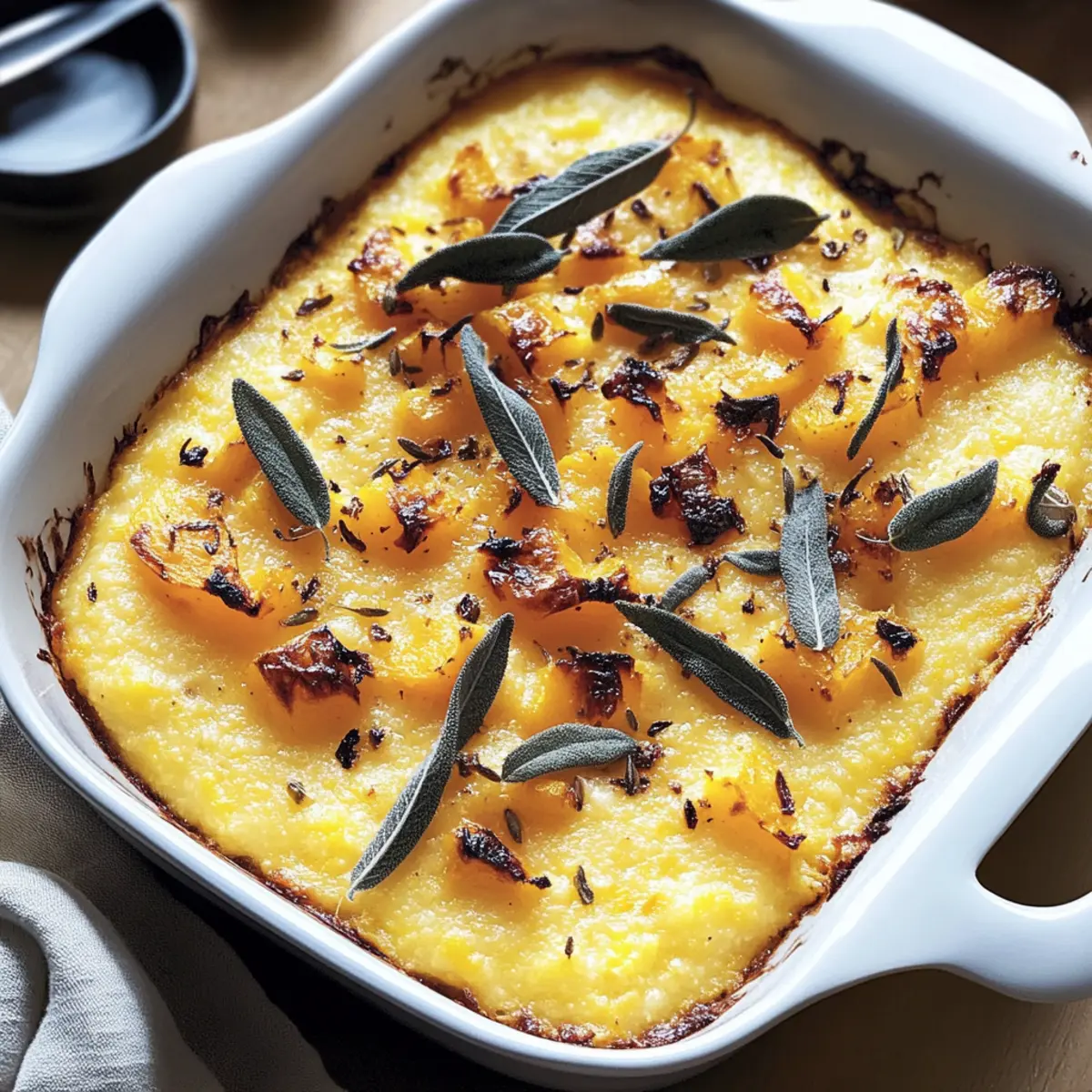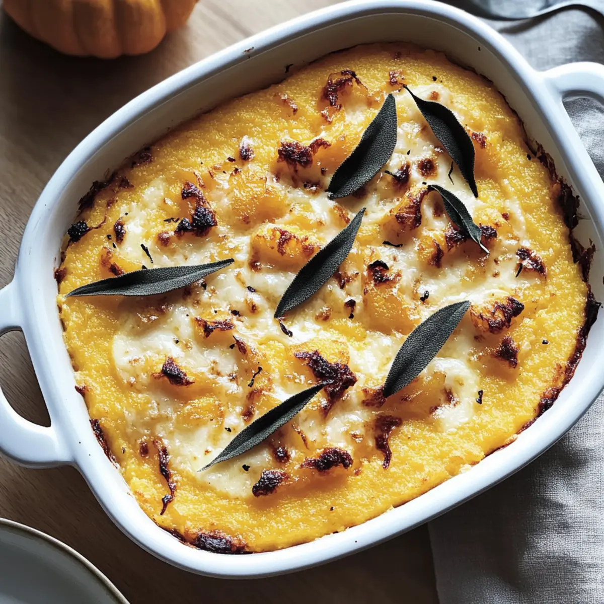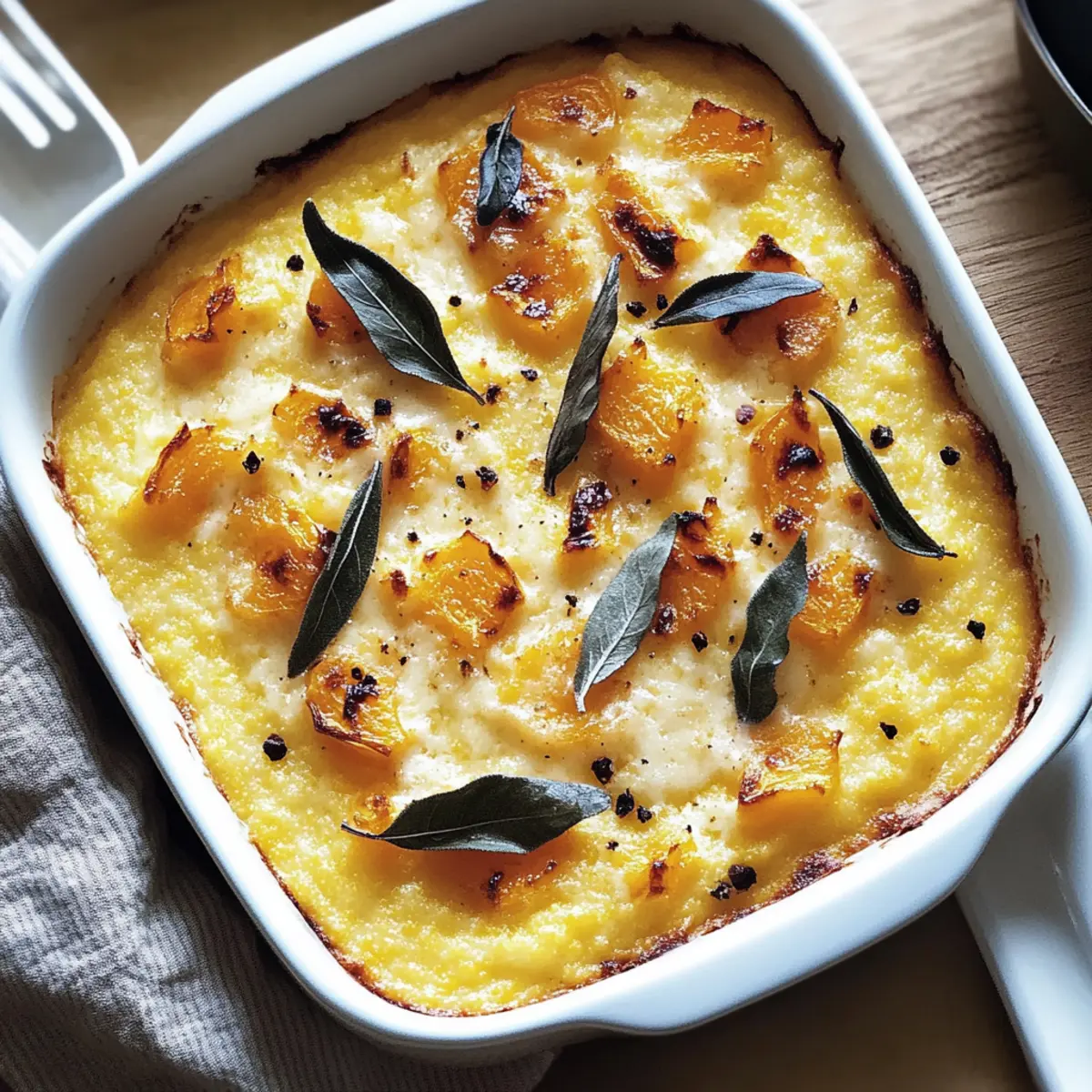 Jump to Recipe Print RecipeIt hit me while I was stirring the polenta on a chilly evening: comfort food doesn’t have to be complicated. Enter my Cheesy Baked Butternut Squash Polenta, a dish that combines creamy polenta with the natural sweetness of roasted butternut squash, all blanketed in glorious, melted cheese. This recipe is not just quick to whip up; it also has a make-ahead magic that transforms busy weeknights into effortless gourmet moments. Plus, it’s gluten-free when using the right polenta, making it a delightful option for everyone at the table. Ready to cozy up to a warm bowl of this goodness? Let’s dive into the delicious details! Why is Baked Butternut Squash Polenta irresistible? Comforting Flavors: This dish melds the sweet taste of roasted butternut squash with creamy polenta, creating a cozy, heartwarming meal perfect for chilly nights. Make-Ahead Magic: Prepare it in advance, so you can enjoy gourmet moments even on the busiest evenings. Just heat and serve! Versatile Variations: Swap out Fontina for Gruyère or a dairy-free cheese to meet any dietary needs, making it a crowd-pleaser for everyone at the table. Nutritious Indulgence: With good balance of carbohydrates and protein, enjoy a filling, satisfying meal that feels indulgent yet wholesome. Perfect Pairing: Serve this baked delight as a main dish or as a side to roasted meats or fresh salads for an unforgettable dining experience. For more comforting dishes, check out my Cheesy Baked Ziti or Oven Baked Lemon Garlic Salmon. Baked Butternut Squash Polenta Ingredients For the Polenta Base • Polenta – a creamy base that should be of high quality for the best texture. • Vegetable Broth or Water – enhances flavors when cooking the polenta; opt for broth for added depth. • Salt – adjust to taste; a little goes a long way in elevating the overall flavor. For the Butternut Squash • Butternut Squash – brings natural sweetness; roasting it intensifies the flavor to new heights. For the Cheese • Fontina Cheese – creates luscious, gooey pockets; swap with Gruyère for a unique twist. Enjoy crafting this delightful Baked Butternut Squash Polenta recipe with these carefully chosen ingredients! Step‑by‑Step Instructions for Cheesy Baked Butternut Squash Polenta Step 1: Preheat the Oven Begin by preheating your oven to 400°F (200°C). This will create the perfect environment for roasting your butternut squash, helping it caramelize beautifully. While the oven warms, gather your baking sheet and parchment paper for easy cleanup later. Step 2: Prepare the Butternut Squash Peel and cube the butternut squash into bite-sized pieces. Spread them evenly on the prepared baking sheet, ensuring they aren’t overcrowded. Roast the squash in the preheated oven for 25-30 minutes, or until they become tender and caramelized, stirring halfway through for even cooking and a lovely golden hue. Step 3: Cook the Polenta As the squash roasts, bring a pot of vegetable broth to a gentle boil over medium heat. Gradually whisk in the polenta, stirring consistently to prevent lumps from forming. Continue cooking for 10-15 minutes until the mixture thickens and becomes creamy. You’ll know it’s ready when it pulls away from the sides of the pot. Step 4: Combine the Ingredients Once the polenta is thickened, gently fold in the roasted butternut squash, reserving a few pieces for garnish later. Season the mixture with salt to taste, mixing well to ensure every spoonful of your Baked Butternut Squash Polenta is full of flavor. Step 5: Assemble the Dish Transfer the cheesy polenta mixture into a greased baking dish, smoothing it out evenly. Press chunks of Fontina cheese into the mixture, scattering them throughout to create delectable pockets of melted goodness. This step is crucial for that cheesy, comforting experience you desire! Step 6: Bake in the Oven Place the assembled dish in the preheated oven and bake for 20-25 minutes, or until the cheese is bubbly and golden. Keep an eye on it towards the end to achieve that perfect melted cheese texture while the edges turn a tantalizingly crisp. Step 7: Cool and Serve After baking, remove the Cheesy Baked Butternut Squash Polenta from the oven and allow it to cool slightly for about 5-10 minutes. This cooling period makes slicing and serving easier while still keeping the dish warm and inviting for your guests. Make Ahead Options These Cheesy Baked Butternut Squash Polenta dishes are perfect for busy home cooks looking to save time without sacrificing comfort. You can roast the butternut squash and prepare the polenta base up to 24 hours in advance, allowing you to assemble everything when you’re ready to enjoy. Simply refrigerate the roasted squash and cooked polenta in separate airtight containers. When you’re ready to bake, combine the ingredients, pressing in the Fontina cheese, and bake straight from the fridge—just add an extra 5 minutes to the baking time to ensure everything is heated through. This way, you’ll achieve the same deliciously creamy and cheesy results, making weeknight dinners feel like a gourmet affair! Expert Tips for Baked Butternut Squash Polenta Roasting Perfection: Ensure your butternut squash is evenly cut and spread out on the baking sheet for perfect caramelization and flavor enhancement. Polenta Consistency: Stir continuously while cooking the polenta to avoid lumps—this will result in the smooth, creamy texture essential for your Baked Butternut Squash Polenta. Cheese Choices: For an even creamier experience, try mixing a blend of cheeses; however, ensure that any substitute, like Gruyère, melts well for those gooey pockets of flavor. Easy Reheating: If your polenta thickens too much during storage, add a splash of broth or water when reheating to restore its creamy consistency. Make-Ahead Magic: Prepare the polenta and butternut squash in advance; combine and bake just before serving for a stress-free meal. Variations for Baked 