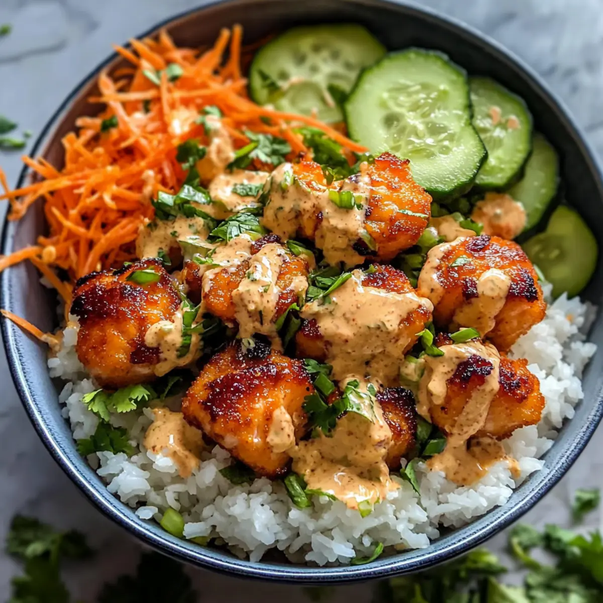 Once your salmon is ready, it’s time to build the Bang Bang Salmon Bowls. Start by dividing the cooked rice evenly among four bowls. Next, top each bowl with an equal portion of the crispy salmon cubes, followed by your choice of fresh vegetables like shredded carrots, cucumber, green onions, and cilantro.