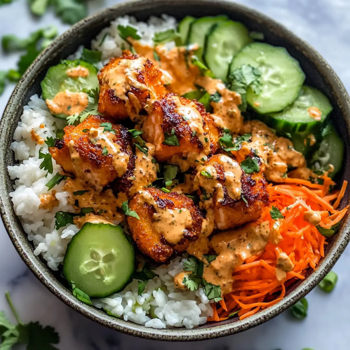 Delicious Bang Bang Salmon Bowls with crispy salmon and fresh veggies, drizzled with a sweet and spicy sauce.
