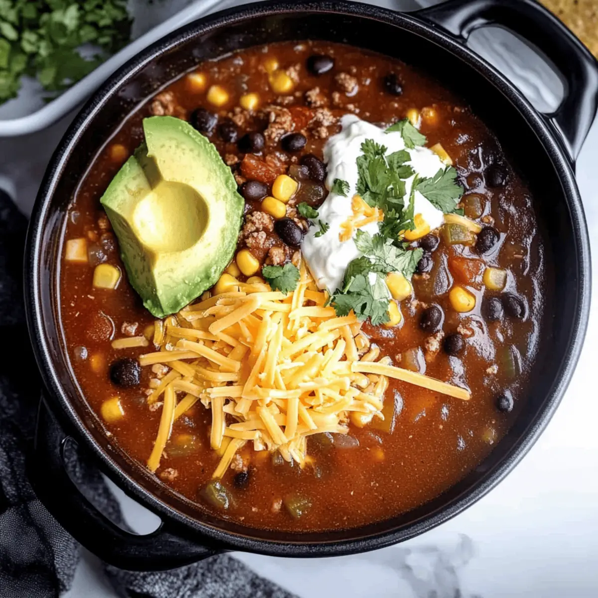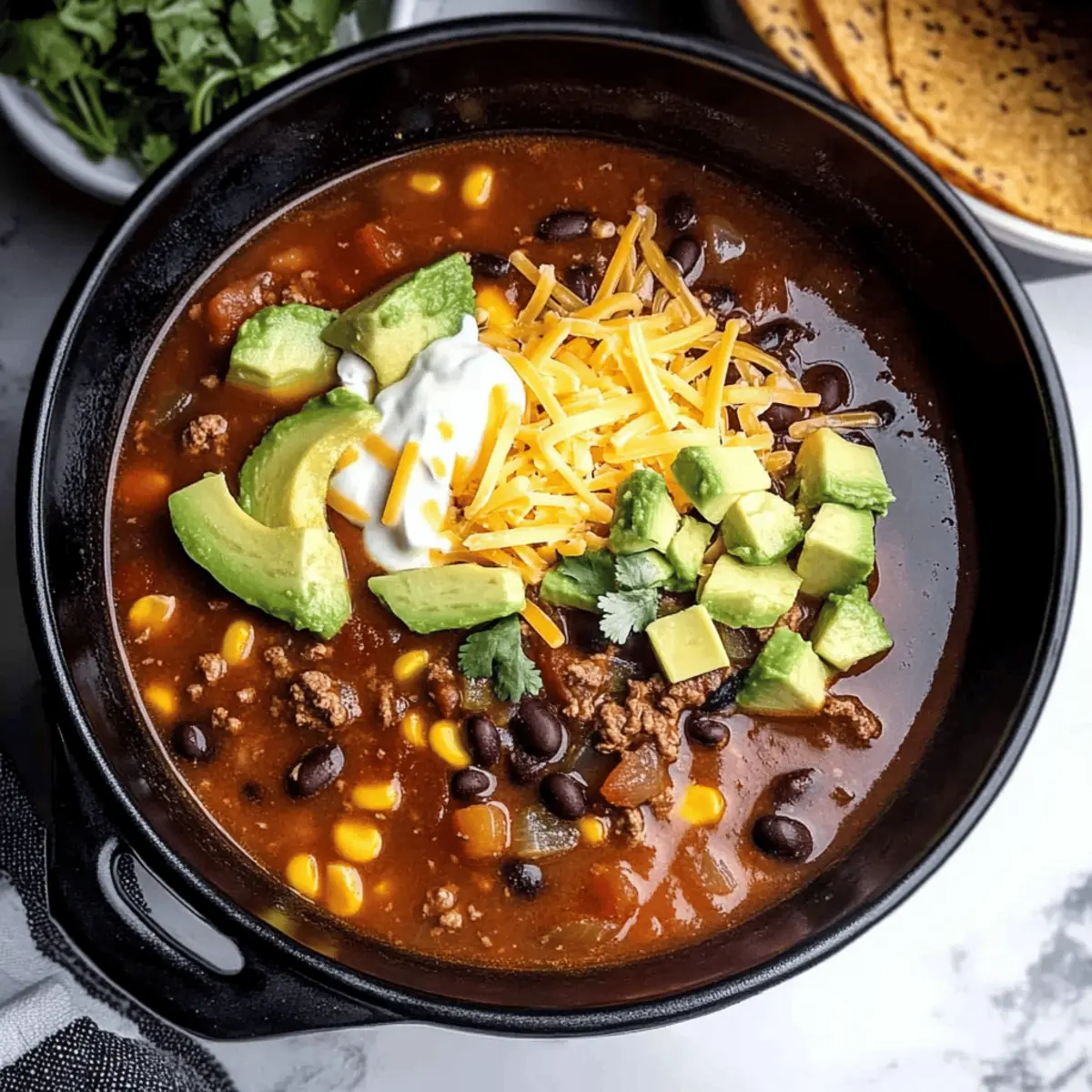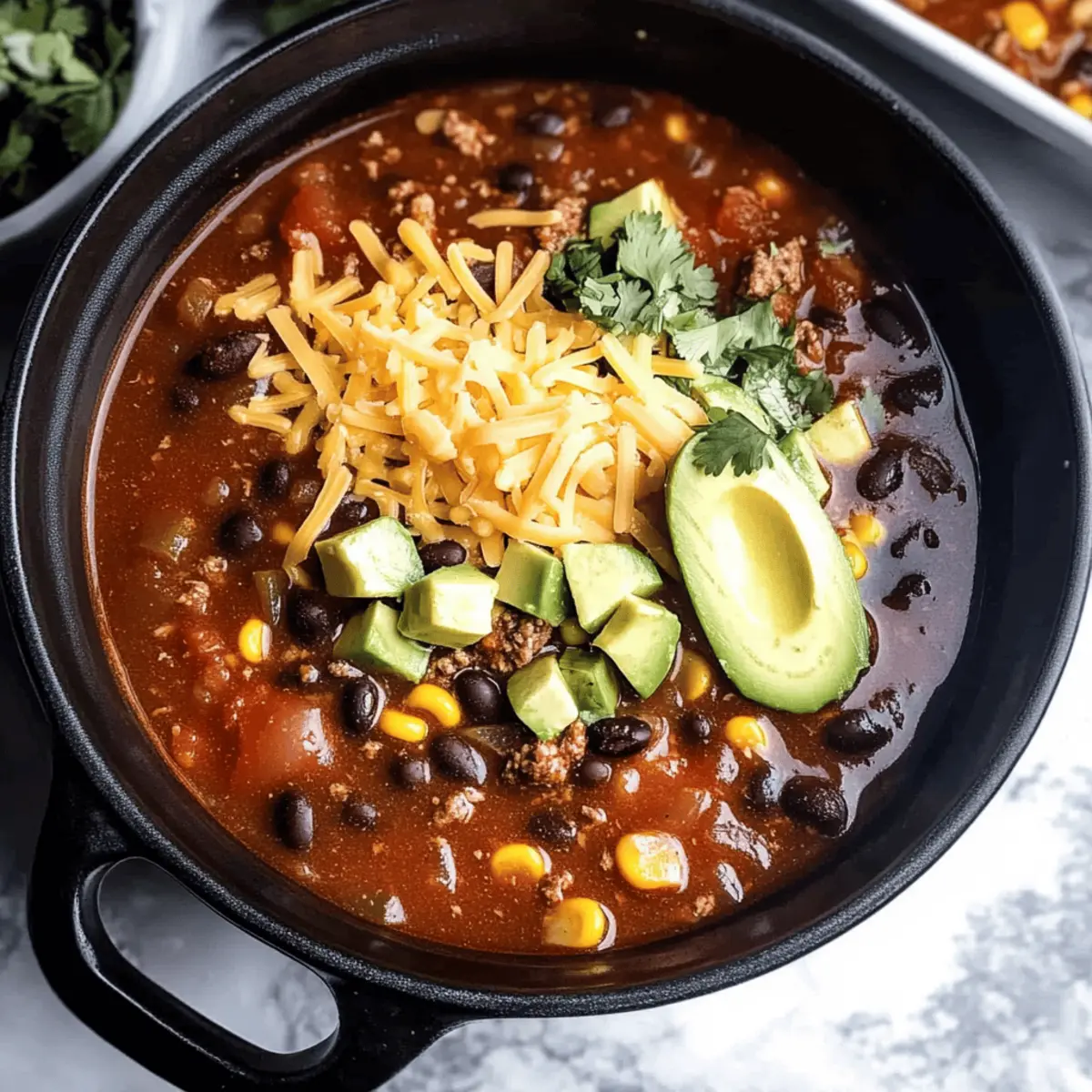Jump to Recipe Print RecipeOn a crisp evening, I craved something warm and satisfying—something that whispered of comfort while bursting with flavor. That’s when I stumbled upon my new favorite: Beef Taco Soup. With its rich, hearty texture and tantalizing taco-inspired flavors, this gluten-free one-pot gem is perfect for busy nights when you want a filling meal without the fuss. Packed with protein and fiber, it offers a wholesome upgrade from fast food, transforming classic ground beef tacos into a creamy, savory soup topped with your favorite fixings like avocado and cheese. In just 30 minutes, you’ll have a delicious dish that pleases both the family and your taste buds. Ready to give it a try? Let’s dive into this mouthwatering recipe! Why Is This Beef Taco Soup a Must-Try? Quick to Prepare: With only 30 minutes from start to finish, this dish fits perfectly into hectic weeknights. One-Pot Wonder: Say goodbye to pile-up in the kitchen! This hearty meal requires just one pot, making clean-up a breeze. Rich Flavor Profile: The combination of spices and fresh ingredients creates a warmth that echoes classic tacos, delighting your taste buds in every bite. Versatile Ingredients: Customize with your choice of toppings or substitute proteins based on your family’s preferences! Add beans or extra veggies for more nutrition. Family Favorite: This Beef Taco Soup is sure to impress everyone around the table. If you’re looking for other comforting favorites, check out my Beef Stroganoff Cozy for another crowd-pleaser! Beef Taco Soup Ingredients • Get ready to savor every bite! For the Soup Base Olive Oil – Adds richness and helps sauté the vegetables; feel free to swap with vegetable or canola oil if needed. Ground Beef – Provides the main protein and flavor base; for a leaner option, consider ground turkey or beef alternatives. Onion – Adds sweetness and depth of flavor; yellow or white onion brings out the best taste. Jalapeño Pepper – Adds heat and flavor; omit for a milder soup or replace with green bell pepper if preferred. Garlic – Enhances the flavor profile; freshly minced garlic has the best impact! Paprika – Adds a subtle smokiness and color; smoked paprika can lend a bolder flavor. Ground Cumin – Essential for taco flavor and earthy notes; you can use taco seasoning, adjusting salt levels as needed. Crushed Red Pepper – Offers extra heat (optional); adjust to your spice preference! Crushed Tomatoes – Forms the soup’s base, providing moisture; diced tomatoes can work in a pinch. Beef Broth – Adds depth; necessary for a hearty broth; chicken broth is a fine substitute. Salt & Black Pepper – Season to taste; opt for low-sodium options if desired. For the Extras Black Beans – Nutrient-rich and fiber-packed; other bean options include kidney or pinto beans based on personal taste. Frozen Corn – Adds sweetness and texture; fresh or canned corn makes a great alternative. Embrace the flavors of this hearty Beef Taco Soup, and let your kitchen come alive with the enticing aroma of taco-inspired goodness! Step‑by‑Step Instructions for Beef Taco Soup Step 1: Heat the Oil In a large pot or Dutch oven, heat 2 tablespoons of olive oil over medium heat until shimmering. This should take about 1-2 minutes. The warm oil will create a perfect environment for sautéing, helping to release the flavors of the vegetables while preparing for the hearty Beef Taco Soup. Step 2: Sauté the Vegetables Add 1 diced onion and 1 diced jalapeño pepper to the pot, stirring frequently. Sauté them for about 3-4 minutes, or until the onion becomes translucent and tender. You’ll see the vegetables soften, which will build the foundation of flavor in your soup. Step 3: Add Aromatics Stir in 3 minced garlic cloves, 1 tablespoon of paprika, 1 tablespoon of ground cumin, and crushed red pepper (optional) to the softened vegetables. Cook for 1 minute, stirring continuously to allow the spices to release their fragrant aromas, which will further enhance the delightful essence of your Beef Taco Soup. Step 4: Brown the Ground Beef Add 1 pound of ground beef to the pot, breaking it up with a wooden spoon. Cook for about 5-7 minutes, or until the beef is browned and fully cooked, stirring occasionally. The meat should be no longer pink and should begin to caramelize slightly at the edges, adding richness to your soup. Step 5: Combine the Base Ingredients Pour in one 28-ounce can of crushed tomatoes and 4 cups of beef broth. Season with 1 teaspoon of salt and ½ teaspoon of black pepper. Stir until combined, then bring the mixture to a gentle simmer, which should take about 5 minutes. This helps to meld all the bold flavors of the Beef Taco Soup together beautifully. Step 6: Add the Beans and Corn Stir in one 15-ounce can of black beans and 1 cup of frozen corn. Allow the soup to simmer for an additional 10-15 minutes over low heat, stirring occasionally, until heated through. The soup should be bubbling and thickening, showcasing a vibrant mix of ingredients that makes this meal truly hearty. Step 7: Adjust Seasoning and Serve Taste your Beef Taco Soup and adjust the seasoning if necessary, adding more salt and pepper to suit your palate. Once everything is well combined and deliciously fragrant, serve your soup hot, garnished with your favorite toppings like avocado and cheese for an extra touch. How to Store and Freeze Beef Taco Soup Fridge: Store leftover Beef Taco Soup in an airtight container for up to 3 days. Let the soup cool completely before sealing to maintain its freshness. Freezer: For longer storage, freeze portioned servings in freezer-safe containers for 4-6 months. Be sure to leave some space at the top for expansion. Reheating: Thaw overnight in the fridge before reheating on the stovetop over medium heat, or microwave in 1-minute intervals until hot. Stir well for even heating. Note: If you plan to freeze, it’s best to leave out any toppings until you’re r