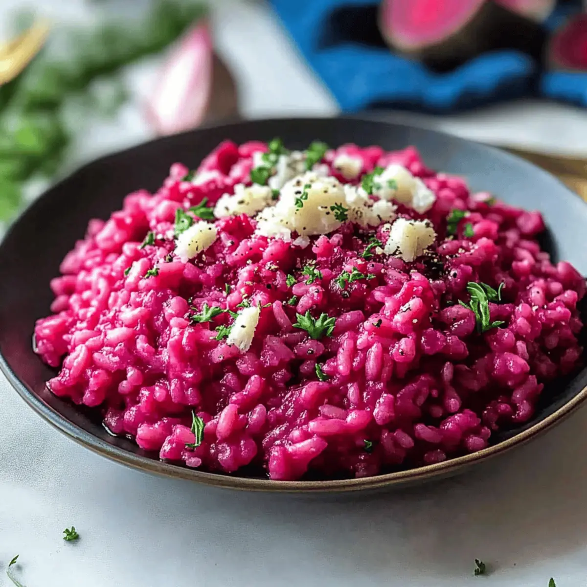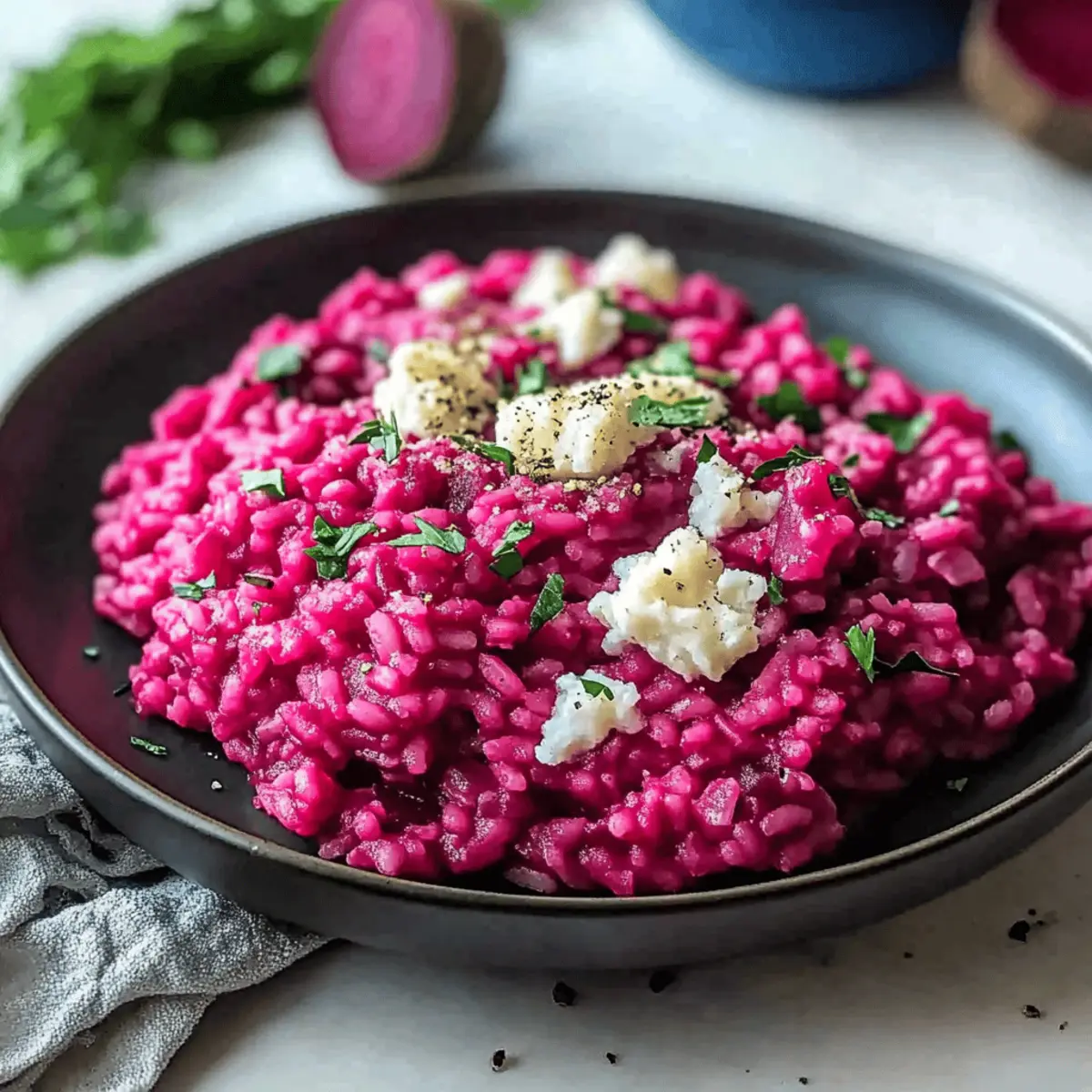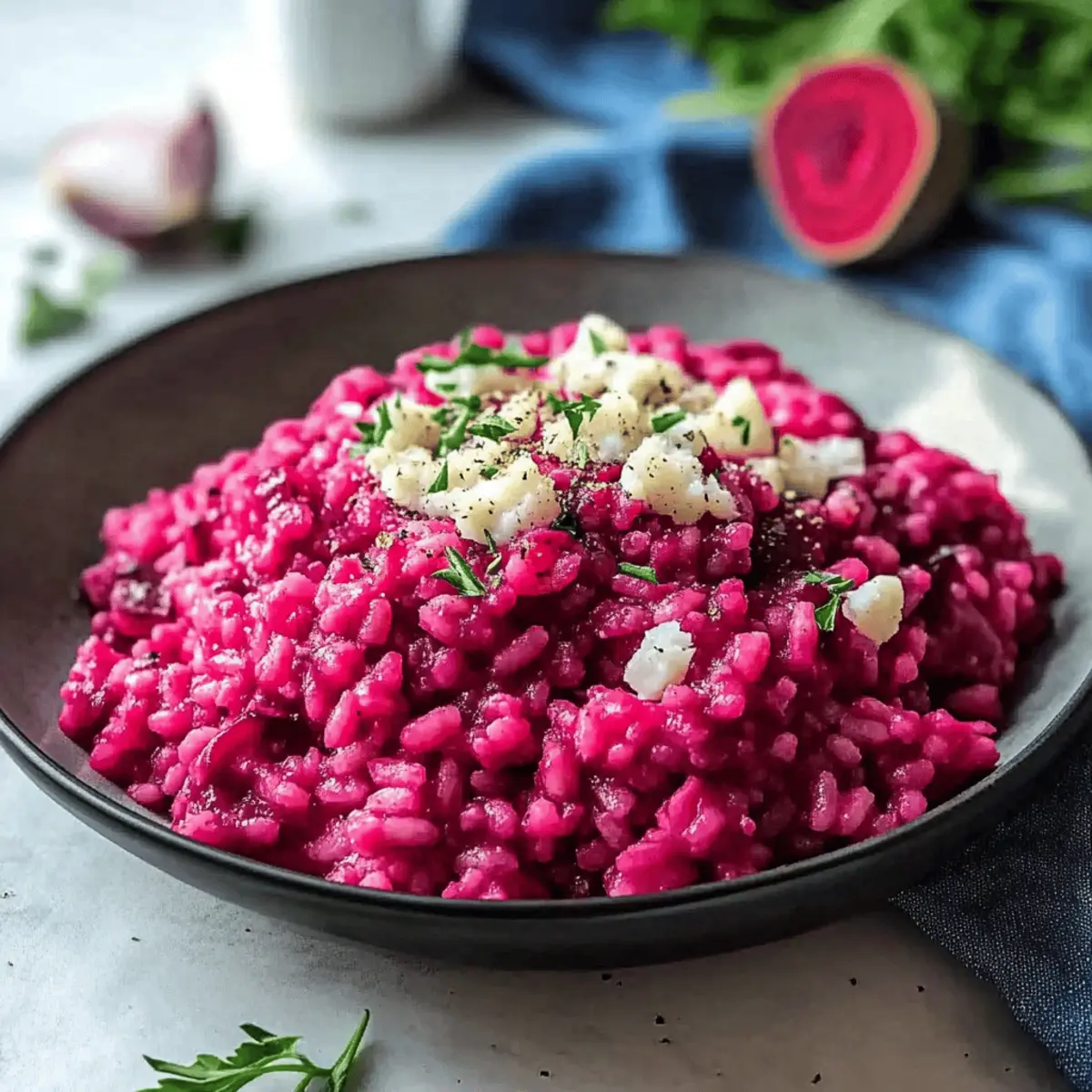 Jump to Recipe Print RecipeAs the leaves begin to turn and a crispness fills the air, my kitchen transforms into a cozy haven where vibrant colors take center stage. Enter my Creamy Vegan Beet Risotto, a dish that not only dazzles the eyes with its stunning deep pink hue but also warms the heart with its rich, earthy flavor. Perfectly embodying the spirit of fall, this Beet Risotto is simple to make and incredibly satisfying, making it an ideal side dish for any gathering, whether it’s an elegant dinner party or a festive Halloween celebration. Plus, with its vegan and gluten-free profile, it caters to a variety of dietary needs while guaranteeing deliciousness. Are you ready to bring a touch of autumn magic to your table? Why is this Beet Risotto special? Vibrant Colors: This Beet Risotto’s stunning deep pink hue not only adds flair to your plate but also brightens up any fall gathering, making it a real showstopper. Comforting Flavor: The rich, earthy sweetness of roasted beets pairs beautifully with creamy Arborio rice, creating a dish that’s truly satisfying. Easy to Make: With straightforward steps and minimal prep, even beginner cooks can master this elegant side. Diet-Friendly: Completely vegan and gluten-free, this dish opens the door for everyone to enjoy, making it a perfect crowd-pleaser. Versatile Option: Whether served as a side or a main dish, you can easily customize it with herbs or swap in roasted veggies, perfect for any palate. Elevate your dinner table and impress your guests with this delightful recipe, perfect for any occasion! Beet Risotto Ingredients For the Risotto • Medium Beets (2) – Provide vibrant color and sweetness to the dish; use pre-roasted or canned beets for a quicker option. • Arborio Rice (1½ cups) – Essential for that creamy risotto texture; don’t substitute with regular rice, as it won’t have the same feel. • Vegetable Broth (4 cups, warmed) – Adds depth and flavor; low-sodium broth is recommended for better seasoning control. • Onion (1 small, finely diced) – Contributes an aromatic base flavor; shallots can be a milder substitute if preferred. • Garlic (2 cloves, minced) – Enhances savory notes; feel free to add more for a stronger flavor profile. • Dry White Wine (½ cup) – Provides acidity and complexity; replace with extra broth or lemon juice for a non-alcoholic option. • Parmesan Cheese (½ cup, freshly grated, optional) – Brings creaminess to the risotto; omit for a fully vegan dish. • Olive Oil (2 tbsp) – Necessary for sautéing and flavor; neutral oils can work as alternatives. • Unsalted Butter (2 tbsp or vegan butter) – Adds creaminess; vegan butter is essential for a plant-based version. • Salt and Black Pepper – Key for enhancing all flavors; season to taste. For Garnish • Fresh Parsley or Microgreens – Offers an elegant color contrast and fresh flavor; a beautiful touch when serving your Beet Risotto. Step‑by‑Step Instructions for Creamy Vegan Beet Risotto Step 1: Roast the Beets Preheat your oven to 400°F (200°C). Wrap the medium beets in aluminum foil and place them on a baking sheet. Roast for 40-45 minutes until they are fork-tender. Once cool enough to handle, peel the beets and blend them with ¼ cup of warmed vegetable broth until smooth, creating a vibrant base for your Beet Risotto. Step 2: Sauté the Aromatics In a large skillet or saucepan, heat 2 tablespoons of olive oil and 2 tablespoons of unsalted butter over medium heat. Add the finely diced onion and sauté for 5-7 minutes until translucent and fragrant. Stir in the minced garlic, cooking for an additional 1-2 minutes until it becomes aromatic. This process will lay a flavorful foundation for your creamy vegan Beet Risotto. Step 3: Toast the Rice Add 1½ cups of Arborio rice to the skillet, stirring continuously for 2-3 minutes. You want the rice to become slightly translucent around the edges, which signals that it’s ready to absorb all the flavors. The toasting will enhance the nutty profile of the Arborio rice, which is essential for achieving the creamy texture of your finished Beet Risotto. Step 4: Deglaze with Wine Pour in ½ cup of dry white wine, stirring constantly for about 2 minutes. The wine will evaporate, leaving behind a rich essence that deepens the flavor of the risotto. This step is crucial as it adds a touch of acidity that beautifully balances the sweetness of the roasted beets. Step 5: Add the Broth Gradually add the warmed vegetable broth, one ladle at a time, stirring frequently. Allow each addition to be mostly absorbed before adding the next, which will take about 18-20 minutes. This steady stirring is key to achieving the creamy texture that makes Beet Risotto so comforting and luxurious. Step 6: Incorporate the Beets Once the rice is creamy and al dente, stir in the blended beets. Let the mixture gently heat for an additional 2-3 minutes, allowing the flavors to meld together beautifully. The bright pink hue from the beets will transform your risotto into a stunning visual centerpiece, perfect for impressing your guests. Step 7: Finish the Risotto If desired, fold in ½ cup of freshly grated Parmesan cheese for added creaminess, and season with salt and black pepper to taste. Let the risotto sit for a few minutes to thicken before serving. This resting period allows all the flavors to deepen and become even more harmonious in your delicious Beet Risotto. Step 8: Garnish and Serve Serve the creamy vegan Beet Risotto in bowls, garnished with fresh parsley or microgreens for a pop of color and freshness. This final touch elevates the dish visually and complements its rich flavor, making it a delightful addition to any dinner table or festive gathering. What to Serve with Beet Risotto As you prepare your delightful Beet Risotto, consider adding complementary dishes that enhance this vibrant centerpiece and create a memorable meal experience. Crispy Green Salad: A refreshing salad wi