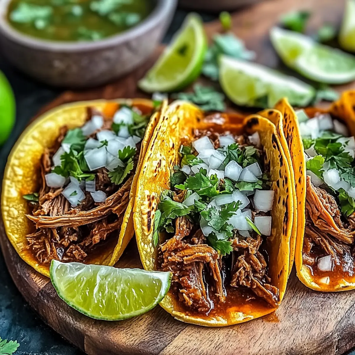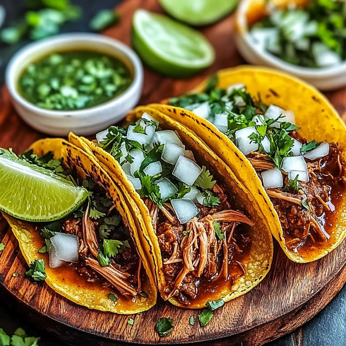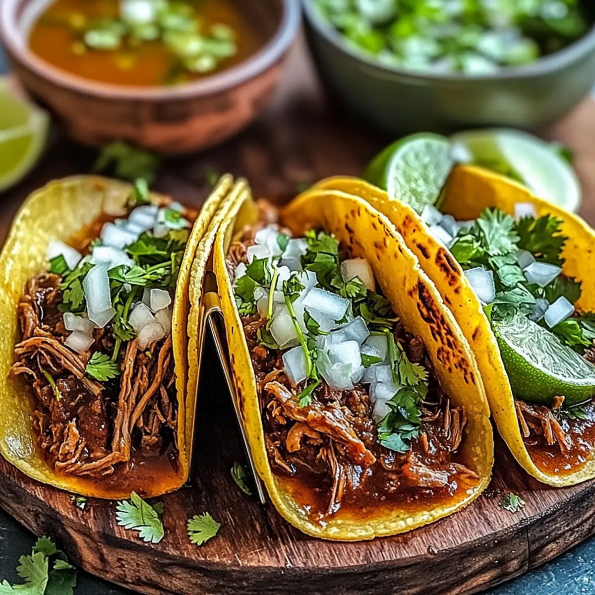 Jump to Recipe Print RecipeThe savory scent of slow-braised beef filled my kitchen, coaxing memories of vibrant street food markets in Mexico. Today, I’m excited to share my Easy Birria Tacos recipe, where tender meat meets a punch of smoky guajillo and ancho chiles, all wrapped in crispy corn tortillas. Not only are these tacos incredibly delicious, but they also come together easily, making them a go-to for cozy dinners or festive gatherings. Plus, there’s a gluten-free option for those who need it! I can’t help but smile at how simple it is to make such an impressive dish that will leave everyone asking for more. Ready to dive into this flavorful adventure with me? Why Are Birria Tacos So Special? Authentic Flavors: Each bite bursts with layers of flavor thanks to the slow-braising technique and rich spices. Mouthwatering Texture: The contrast of crispy tortillas with succulent beef creates a satisfying experience. Versatile Recipe: Perfect for any occasion, from casual taco nights to elegant gatherings. Easy to Customize: You can easily switch up the proteins or toppings, making them uniquely yours. Great for Meal Prep: Make a big batch ahead of time and enjoy leftovers that stay delicious for days! Experience these enchanting flavors and textures for yourself—your guests will be begging for your secrets, like how to make the ultimate taco dipping broth for a true Mexican feast! Birria Tacos Ingredients • Dive into the flavorful world of Birria Tacos with these essential ingredients! For the Beef • Beef Chuck Roast – Opt for a well-marbled cut for maximum tenderness in your tacos. • Salt and Black Pepper – Essential for seasoning, enhance your meat’s natural flavors! For the Broth • Dried Guajillo Peppers – These add critical smoky flavor; don’t skip toasting for the best results. • Dried Ancho Peppers – Toasted for the best aroma, these deepen the broth’s flavor profile. • Dried Cascabel Peppers – Use according to your heat preference, adding zing to your broth. • Onion – A flavorful base; yellow or white onions work wonders in this dish. • Garlic – Fresh cloves are crucial for much-needed vibrancy in your broth. • Ground Cumin – Adds earthy warmth; make sure to include for a classic taste! • Ground Ginger – A hint of spiciness; you can substitute with fresh ginger if desired. • Ground Cloves – Use sparingly for added depth to the broth. • Bay Leaves – Enhance flavor; remember to remove them before serving! • Dried Oregano – Mexican oregano is preferred for authenticity. • Beef Broth – A rich base for your sauce; homemade is the way to go for best results. • Apple Cider Vinegar – Balances the rich flavors of the beef beautifully. For Serving • Corn Tortillas – Perfect for serving; gluten-free options are also available for your guests! • Shredded Monterey Jack Cheese – Melts perfectly for tacos; Oaxaca or mozzarella make excellent substitutes. • Chopped Cilantro – Fresh garnish that adds a burst of flavor! • Chopped Onion – Enhances the texture and sweetness; red onion is a milder option. • Lime Wedges – The fresh juice brings brightness to every taco bite. Gather these ingredients and get ready to create a delicious adventure with your Birria Tacos! Step‑by‑Step Instructions for Birria Tacos Step 1: Pepper Prep In a dry skillet over medium heat, toast the guajillo, ancho, and cascabel peppers for 2-3 minutes until fragrant, stirring occasionally to avoid burning. Once toasted, transfer them to a bowl and cover with hot water, allowing them to soak for 20 minutes until softened and pliable. Step 2: Beef Searing Pat the beef chuck roast dry and season generously with salt and black pepper. In a Dutch oven over medium-high heat, sear the roast for 8-10 minutes, turning occasionally, until all sides are deeply browned. This step caramelizes the meat, creating a rich flavor that’s essential for your Birria Tacos. Step 3: Sauce Making Once your peppers are soaked, drain them and add them to a blender with onion, garlic, spices, apple cider vinegar, and beef broth. Blend on high until smooth and creamy, taking a moment to pause and taste for seasoning adjustments. This vibrant sauce will be the heart of your Birria Tacos. Step 4: Braising Pour the blended sauce over the seared beef in the Dutch oven. Cover the pot and reduce the heat to low, allowing it to simmer for 3-4 hours. Stir occasionally to prevent sticking, and your goal is tender beef that falls apart easily when tested with a fork. Step 5: Shred Beef After braising, carefully remove the beef from the Dutch oven and set aside to cool slightly. Strain the braising liquid through a fine-mesh sieve to create a silky broth, discarding any solids. Shred the beef with two forks and return it to the strained broth, mixing well so every piece is moistened. Step 6: Taco Assembly To assemble the Birria Tacos, briefly dip each corn tortilla into the flavorful broth, then fill with a generous amount of shredded beef and a sprinkle of cheese. Heat a griddle over medium-high and cook each taco for 2-3 minutes per side until crispy and the cheese is melted, ensuring the tortillas are golden brown. Step 7: Serve Serve your crispy Birria Tacos hot, topped with chopped onion and cilantro for freshness. Don’t forget to squeeze lime wedges over the tacos and provide a bowl of the rich dipping broth for an authentic experience that enhances the delicious flavors. Expert Tips for Birria Tacos Toast the Chiles: Always toast your dried chiles before soaking to elevate their flavors and enhance the richness of your Birria Tacos. Don’t Rush Braising: Allow a solid 3-4 hours of braising for the beef to become irresistibly tender; patience is key! Use the Right Tortillas: Opt for high-quality corn tortillas and don’t overcrowd the griddle while cooking; this helps achieve perfectly crispy edges. Taste as You Go: Continually taste your broth and adjust se