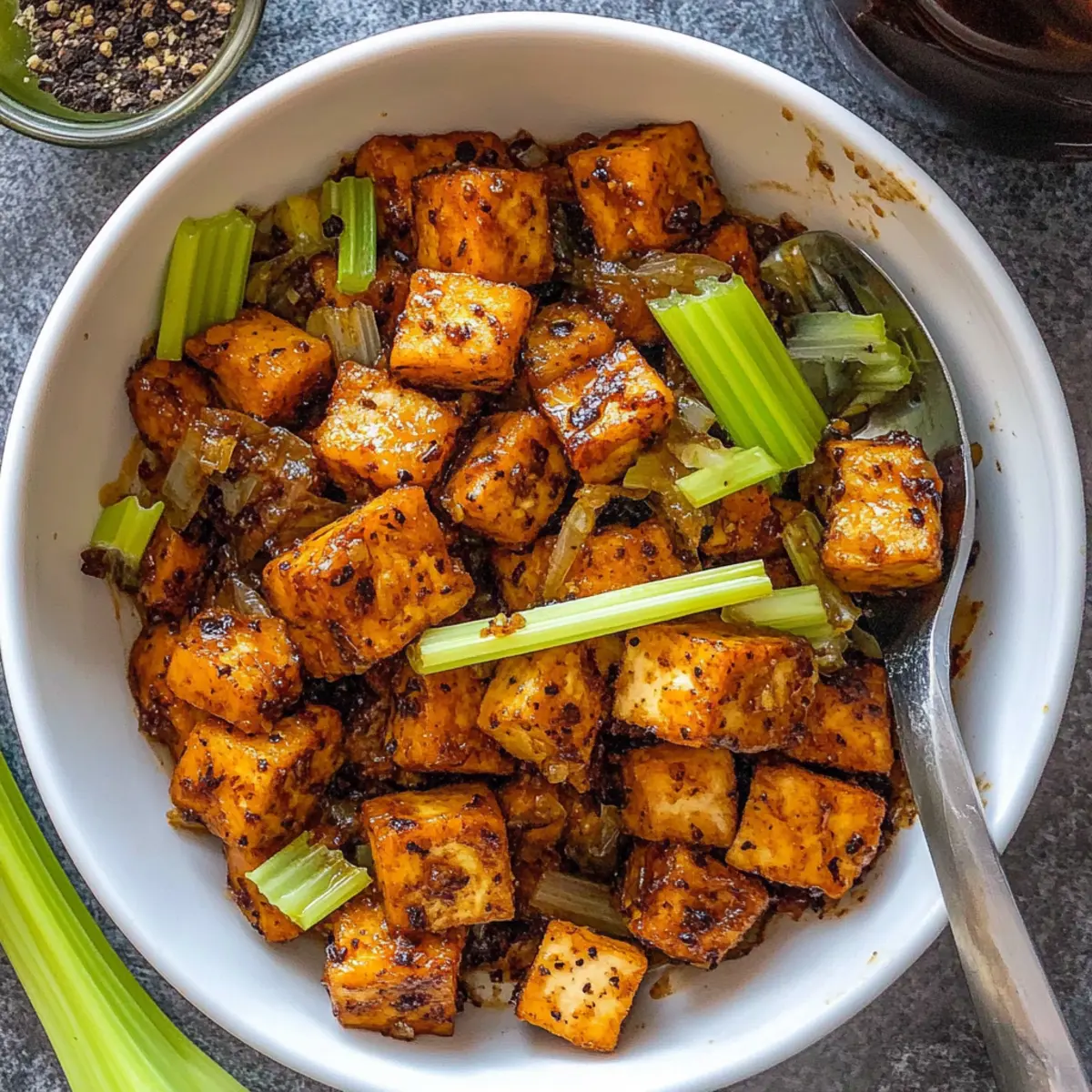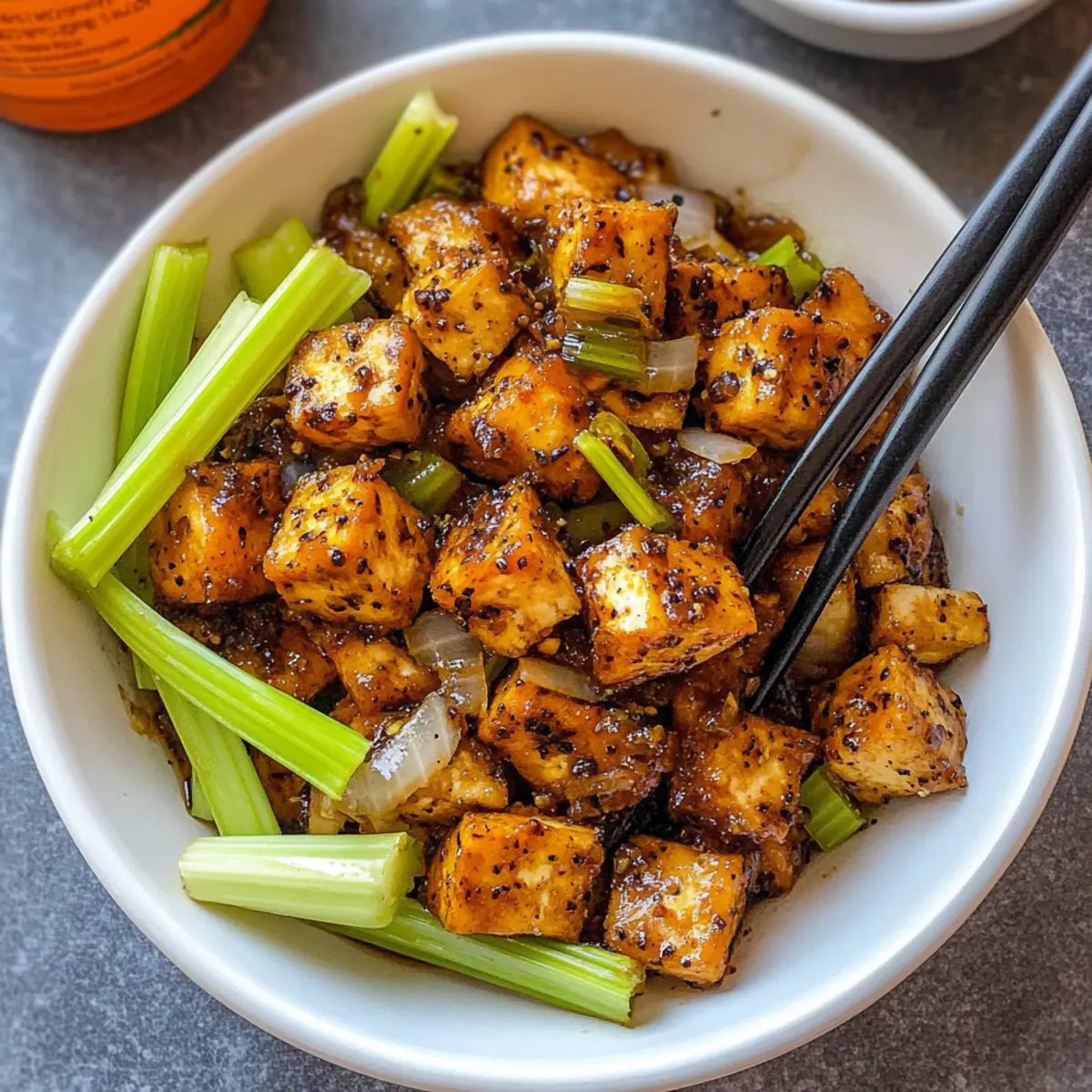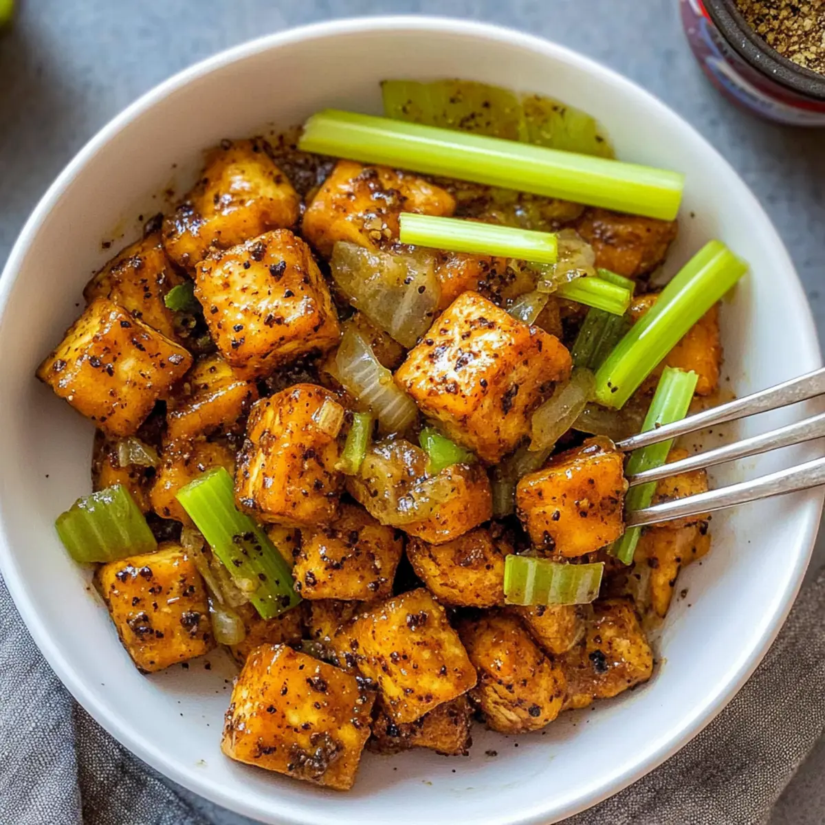 Jump to Recipe Print RecipeAs I stood over the sizzling pan, the enticing aroma of freshly toasted peppercorns filled the kitchen, instantly transporting me to my favorite Asian eatery. Today, I’m excited to share my take on Vegan Black Pepper Tofu, a quick recipe that balances crispy tofu with a fragrant savory sauce, all in under 30 minutes. Not only is this dish an effortless crowd-pleaser, but it also serves as a healthier alternative to fast food cravings, helping you whip up a delightful homemade meal anytime. Trust me, your tastebuds will thank you for this flavorful journey! Ready to dive into this vibrant dish and elevate your weeknight dinners? Why is This Tofu Recipe a Must-Try? Speedy Preparation: You can whip up this delicious dish in under 30 minutes, making it a perfect solution for busy weeknights. Crispy Delight: Each piece of tofu is coated to perfection, ensuring a satisfying crunch in every bite. Irresistible Flavor: The combination of freshly toasted peppercorns and a savory sauce mirrors a beloved takeout favorite, giving you that authentic Asian flair without the extra calories. Versatile Ingredients: Feel free to customize with your favorite veggies or substitute tofu for tempeh for a different texture. Try complementing this with a side of Mozzarella Pepperoni Croissant for a delightful dinner experience! Healthier Alternative: This recipe focuses on plant-based ingredients and minimal oil, providing you a guilt-free meal for those fast-food cravings. Crowd-Pleasing: It’s simple yet impressively tasty, ensuring everyone at the table will be asking for seconds! Black Pepper Tofu Ingredients For the Tofu Tofu – Use extra firm tofu, drained and pressed for an ideal crispy texture. Kosher Salt – Enhances the overall flavor; feel free to adjust according to your taste preferences. Cornstarch – Adds a crispy coating on the tofu; arrowroot starch is a great gluten-free substitute. Vegetable Oil – Essential for frying to achieve the desired crispiness; canola or sunflower oil works well if you need alternatives. For the Sauce Whole Peppercorns – Imparts authentic peppery flavor; freshly ground black pepper can serve as a substitute if necessary. Low-Sodium Soy Sauce – Brings that umami richness; use tamari for a gluten-free version. Fresh Cracked Black Pepper – Enhances the peppery flavor, making it a key ingredient in this Black Pepper Tofu dish. For the Vegetables Celery – Brings a delightful crunch; bell peppers can be swapped in for a sweeter taste. Onion – Adds depth to the dish; yellow onions are best, but shallots can be a good alternative. Garlic – Enhances savoriness; garlic powder can be used if fresh is out of reach. Ginger – Offers warmth and spice; fresh ginger is preferred, but powdered ginger can work in a pinch. Each ingredient in this Vegan Black Pepper Tofu dish is purposefully chosen to maximize flavor and texture, giving you an easy recipe that’s bound to become a staple in your home! Step‑by‑Step Instructions for Crispy Vegan Black Pepper Tofu Step 1: Prepare the Tofu Begin by cutting the extra firm tofu into 1-inch squares. Gently press the tofu to remove excess moisture and then season it with kosher salt and a generous coating of cornstarch. This step is crucial for achieving that delightful crispiness in your Vegan Black Pepper Tofu, so make sure each piece is evenly coated. Step 2: Fry the Tofu Heat a non-stick pan over medium-high heat and add enough vegetable oil to cover the bottom. Once the oil is shimmering, carefully add the tofu pieces in a single layer. Fry the tofu for about 8 to 10 minutes, or until they turn golden brown and crispy on all sides. Then, transfer the crispy tofu to a paper towel-lined plate to absorb any excess oil. Step 3: Toast the Peppercorns In the same pan used for frying, keep the residual oil and reduce to medium heat. Add the whole peppercorns and toast them for 1 to 2 minutes, stirring frequently until they become fragrant. This step enhances the peppery flavor of your Black Pepper Tofu, so keep an eye on them to prevent burning. Step 4: Sauté the Vegetables Now, add the sliced celery, chopped onion, minced garlic, and ginger to the pan with the toasted peppercorns. Sauté everything together for about 3 to 5 minutes, or until the celery is tender and the onion becomes translucent. The aromatics will create a beautiful base for your dish, filling your kitchen with enticing scents. Step 5: Combine the Sauce and Tofu Pour in the low-sodium soy sauce and gently add the reserved crispy tofu into the pan. Sprinkle fresh cracked black pepper over the mixture, then toss it all together, ensuring the tofu is well coated in the sauce. Heat everything through for an additional 2 to 3 minutes, allowing the flavors to meld beautifully in the Vegan Black Pepper Tofu. Step 6: Serve and Enjoy Once everything is heated through and well combined, plate your crispy Vegan Black Pepper Tofu immediately. This dish serves wonderfully with a side of steamed white rice or quinoa, and you can garnish it with green onions for an extra touch of freshness. Savor the delightful flavors of this homemade alternative to fast food! Make Ahead Options These Crispy Vegan Black Pepper Tofu bites are perfect for meal prep enthusiasts looking to save time during busy weeknights! You can marinate the tofu in salt and cornstarch, then store it in the fridge for up to 24 hours to allow flavors to infuse. Additionally, chop your vegetables a day in advance—celery, onion, garlic, and ginger can be prepped and refrigerated to maintain their freshness. When you’re ready to serve, simply fry the tofu for that perfect crispiness and sauté the prepped veggies before tossing it all together with the sauce for a quick finish. This ensures your Vegan Black Pepper Tofu is just as delicious while saving you precious time! Variations & Substitutions for Black Pepper Tofu Feel free to get creative and customize this dish to suit