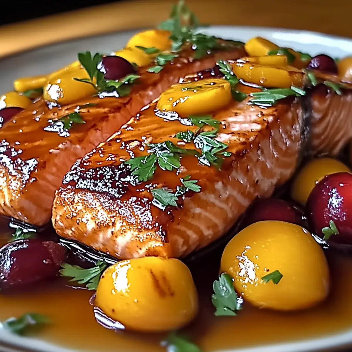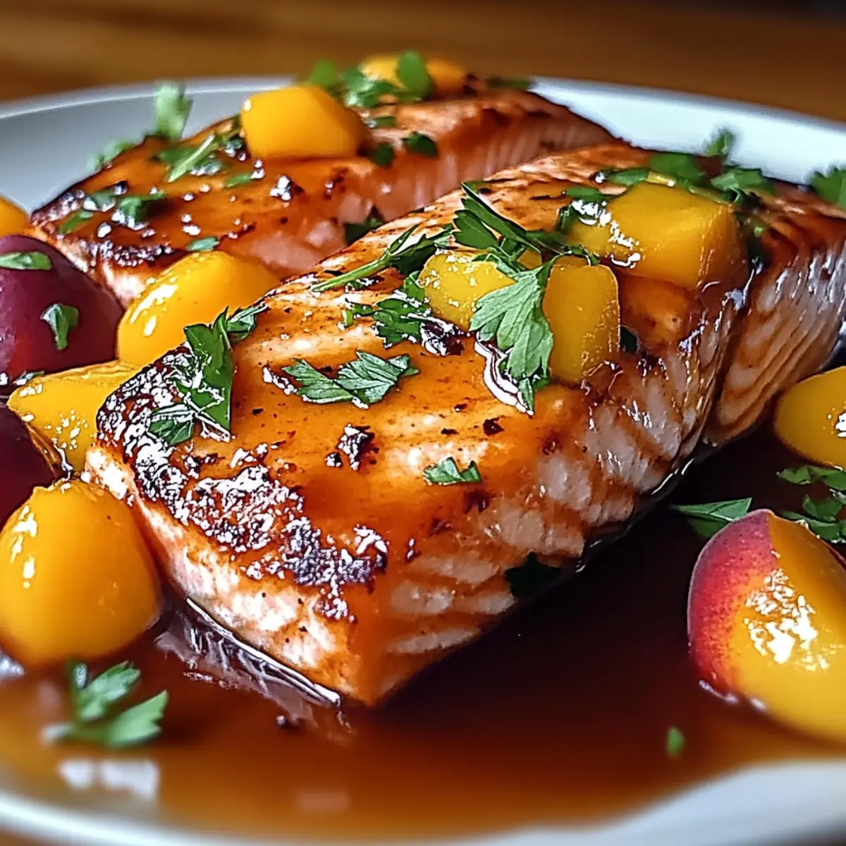 Jump to Recipe Print RecipeAs I pulled the roasted salmon from the oven, the incredible aroma of bourbon mingling with sweet peaches filled my kitchen, instantly lifting my spirits. This Bourbon Peach Roasted Salmon is not just delicious; it’s a game-changer for weeknight dinners! With minimal prep and a beautiful presentation, this dish transforms a simple salmon fillet into a healthy choice that feels like a culinary celebration. It’s perfect for busy home cooks who want to serve something impressive without the fuss. You’ll love how the rich, smoky bourbon combines with juicy peaches, creating a delightful balance of flavors that will have your family and friends raving. Are you excited to elevate your dinner routine with this recipe? Let’s dive in! Why is this Salmon Recipe a Must-Try? Simplicity: With just a handful of ingredients and straightforward steps, this Bourbon Peach Roasted Salmon is incredibly easy to prepare, making it perfect for busy weeknights. Flavor Explosion: The rich taste of bourbon beautifully complements the sweetness of peaches, delivering an unforgettable flavor experience that will impress even the pickiest eaters. Healthy Delight: Packed with lean protein and heart-healthy fats, this dish is not only delicious but also a nutritious choice for anyone looking to maintain a balanced diet. Versatile Options: Feel free to swap out ingredients, like using mango instead of peaches, or offering a family-friendly non-alcoholic version with apple juice or white wine. Crowd-Pleaser: Impress guests at gatherings or family dinners with a meal that looks gourmet yet is surprisingly simple to whip up. If you’re looking for more delightful seafood recipes, check out my Grilled Cod Roasted Tomatoes or Garlic Lemon Butter Salmon for more inspiration. Bourbon Peach Roasted Salmon Ingredients For the Marinade Salmon Fillets – Fresh salmon provides a tender, flaky texture perfect for this dish. Fresh Peaches – Adds a sweet and tangy element; for a twist, substitute with mango or pineapple. Bourbon – Infuses depth and richness; consider apple juice or white wine as a non-alcoholic alternative. Honey – Enhances sweetness and aids in caramelization for a glorious golden crust. Soy Sauce – Contributes umami flavor; use coconut aminos for a gluten-free option. Olive Oil – Keeps the salmon moist and ensures the marinade adheres nicely. Dijon Mustard – Provides a tangy kick that enriches the flavor profile of the dish. Garlic Powder – Adds a savory note to enhance the dish’s heartiness. Salt & Black Pepper – Essential for seasoning; adjust these to taste for the best results. For Garnishing Fresh Parsley – Offers a burst of color and freshness that livens up the dish beautifully. This Bourbon Peach Roasted Salmon is sure to become a favorite in your cooking repertoire, combining bright flavors and healthy ingredients in a way that’s both satisfying and effortless! Step‑by‑Step Instructions for Bourbon Peach Roasted Salmon Step 1: Preheat the Oven Start by preheating your oven to 400°F (200°C). Line a baking sheet with parchment paper for easy cleanup and to prevent sticking. As the oven warms up, this is the perfect time to prepare your marinade, ensuring everything stays organized and efficient in the kitchen. Step 2: Prepare the Marinade In a medium bowl, whisk together diced peaches, bourbon, honey, soy sauce, olive oil, Dijon mustard, garlic powder, salt, and pepper. Mix until everything is well-combined, letting the fragrant aroma entice you. This Bourbon Peach marinade will infuse the salmon with delightful sweet and smoky flavors, creating a rich experience. Step 3: Marinate the Salmon Take your salmon fillets and place them skin-side down on the parchment-lined baking sheet. Pour the marinade generously over the salmon, making sure each fillet is well-coated. Let the salmon marinate for at least 30 minutes; this allows the flavors to penetrate the fish and enhances the overall taste of your Bourbon Peach Roasted Salmon. Step 4: Roast the Salmon Once marinated, transfer the baking sheet to your preheated oven and roast the salmon for 15 to 20 minutes. Keep an eye on the salmon as it cooks; it’s done when it flakes easily with a fork and reaches an internal temperature of 145°F (63°C). The rich color and delicious aroma will make your kitchen feel like a gourmet restaurant. Step 5: Garnish and Serve After roasting, remove the salmon from the oven and let it rest for a few minutes. Sprinkle freshly chopped parsley over the top for a pop of color and added freshness. Serve your Bourbon Peach Roasted Salmon warm, ideally accompanied by your favorite side dishes like quinoa or a light salad, and watch everyone rave about the flavors. Expert Tips for Bourbon Peach Roasted Salmon Perfect Marinade: Ensure you marinate the salmon for at least 30 minutes for deep flavor infusion. Skipping this step can lead to bland fish. Check Temperature: Use a meat thermometer to check for doneness; salmon should reach an internal temperature of 145°F (63°C). Overcooking can dry it out, so keep an eye on it! Foil Trick: If you notice the salmon cooking too quickly, cover it with foil to retain moisture. This trick prevents dryness, ensuring a tender, flaky Bourbon Peach Roasted Salmon. Garnish Wisely: Always finish with freshly chopped parsley after roasting. It adds a vibrant touch, enhances visual appeal, and freshens up the flavor profile. Serve Smart: Pair the salmon with light sides like quinoa or roasted veggies to balance the richness of the dish. This turns it into a well-rounded meal. What to Serve with Bourbon Peach Roasted Salmon Imagine a dining table set for an intimate gathering, where each dish complements the sweet and smoky flavors of your salmon masterpiece. Creamy Garlic Mashed Potatoes: The rich, buttery potatoes add a comforting texture that balances the dish’s vibrant flavors. Lemon-Orzo Salad: A light, refreshing salad with zesty l