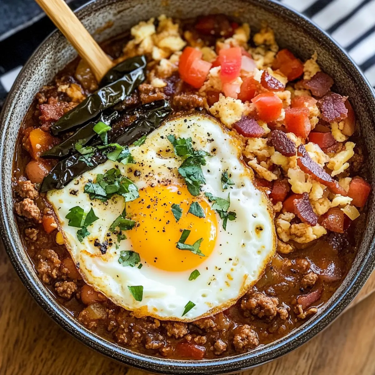 A delicious Breakfast Chili and Eggs that's easy to prepare and packed with flavor, perfect for a cozy morning.