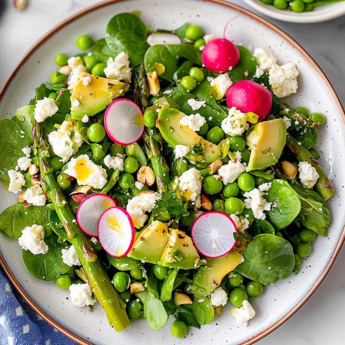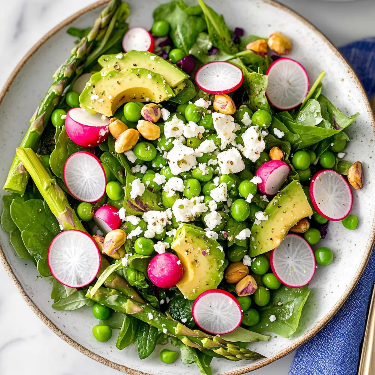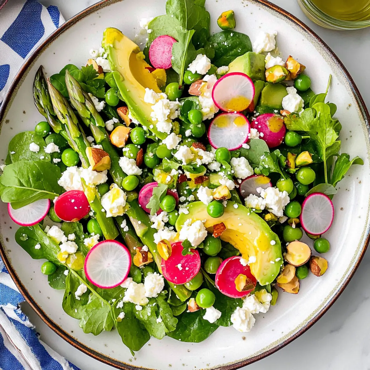 Jump to Recipe Print RecipeAs I took my first bite of this vibrant, fresh Spring Salad, I felt transported to a sunlit garden bursting with color. Highlighting seasonal produce, this dish features tender asparagus, sweet peas, and tangy feta, making it a delightful addition to any meal or a light stand-alone option. What I love most about this Bright Spring Salad is its quick prep time and the way it effortlessly showcases the best flavors of spring. Whether you’re aiming for a healthy dinner or a stunning side dish that will impress guests, this recipe ticks all the boxes. Curious about how to bring a burst of spring to your table? Let’s dive into the recipe! Why Is This Spring Salad a Must-Try? Vibrant Colors: This Bright Spring Salad is a feast for the eyes, combining fresh greens, peas, and asparagus to create a garden-worthy presentation. Quick Preparation: You’ll love how simple it is to whip up! In just a few minutes, you’ll have a delightful dish that enlivens your dining experience. Seasonal Ingredients: Featuring the best of spring produce, this salad is as fresh as it gets, perfect for those looking to embrace seasonal eating. Versatile Dish: Whether served on its own or alongside a hearty dish like Classic Macaroni Salad Flavor, this salad fits seamlessly into any meal plan. Nutrient-Dense: Packed with vitamins from fresh veggies and healthy fats from avocado and olive oil, it’s a meal you can feel good about! Crowd-Pleasing: Ideal for family gatherings or potlucks, this salad allows you to impress guests with minimum effort and maximum flavor. Bright Spring Salad Ingredients • Get ready to enjoy a burst of flavor! For the Salad Asparagus – tender parts, chopped into 1-inch pieces; they add a fresh crunch. Substitute with green beans if you need. Frozen Peas – ½ cup, thawed; these provide sweetness and color. Fresh peas work if available. Salad Greens – a few handfuls; forms a crisp base for the salad. Mixed baby greens create a lovely mix. Radishes – 2, thinly sliced; they add a peppery flavor and crunch. You can swap them for cucumber for a milder taste. Feta Cheese – ½ cup, crumbled; offers a creamy texture and tang. Goat cheese is a wonderful alternative. Avocado – ½, pitted and diced; brings creaminess to the salad. Replace with sunflower seeds for a nut-free option. Pistachios – ¼ cup, chopped and toasted; these add a delightful crunch. Almonds or walnuts can step in nicely. Roasted Chickpeas – ½ cup; they provide hearty protein. White beans also make a great substitute. Fresh Herbs – for garnish (basil, mint, and/or chives); enhances the salad’s flavor and freshness. Parsley works well as a swap. Sea Salt and Freshly Ground Pepper – for seasoning; adjust to your taste. For the Dressing Fresh Basil Leaves – ¼ cup, or mix with mint leaves; they provide a vibrant herbal flavor. Garlic Clove – 1 small; adds depth of flavor. Omit if you prefer a milder taste. Fresh Lemon Juice – 1 tablespoon; brightens the dressing. Lime juice can be a tasty alternative. Lemon Zest – ½ teaspoon; intensifies the lemon flavor. Orange zest can offer a different twist. White Wine Vinegar – 1 tablespoon; balances acidity in the dressing. Use apple cider vinegar as a substitute. Extra-Virgin Olive Oil – 2 tablespoons, plus more as desired; provides richness and helps emulsify the dressing. Avocado oil can be a milder option. Sea Salt – ¼ teaspoon; for flavoring, adjust based on your dietary needs. This Bright Spring Salad is the perfect way to embrace the vibrant flavors of the season! Step‑by‑Step Instructions for Bright Spring Salad Step 1: Bring Water to a Boil Start by bringing a large pot of salted water to a rolling boil over high heat. The salt will enhance the flavor of the asparagus, making it bright and tasty. Keep an eye on the water as it heats, ensuring it reaches that bubbly boil before moving on to the next step. Step 2: Blanch the Asparagus Once the water is boiling, add your chopped asparagus and blanch it for precisely 1 minute. This quick cook time will turn the asparagus vibrant green and tender. After a minute, immediately transfer the asparagus into an ice bath— a bowl filled with ice water—for another minute to stop the cooking process and preserve its color. Drain well. Step 3: Combine Vegetables In a mixing bowl, combine the blanched asparagus with the thawed peas. This mix will serve as one of the key components of your Bright Spring Salad, lending a lovely crunch and sweetness. Gently toss the vegetables together to ensure they’re evenly mixed, preparing them for the dressing. Step 4: Prepare the Dressing In a food processor, blend together the fresh basil leaves, garlic clove, lemon juice, lemon zest, white wine vinegar, olive oil, and sea salt. Blend until smooth, ensuring all flavors meld beautifully. Taste the dressing, adjusting seasoning if necessary to create the perfect zesty balance for your salad. Step 5: Dress the Asparagus and Peas Add half of the freshly made dressing to the asparagus and pea mixture. Gently toss to coat the vegetables evenly with the zesty dressing. This will infuse the Bright Spring Salad with flavor, setting the stage for the fresh ingredients that will be layered on later. Step 6: Arrange the Salad Base On a large platter, spread out your salad greens to form a crisp base for the salad. Choose a colorful mix of baby greens, laying them out in an even layer to create an inviting foundation for the Bright Spring Salad that’s both visually appealing and texturally delightful. Step 7: Layer the Ingredients Carefully layer the dressed asparagus and peas over the greens, followed by thinly sliced radishes, crumbled feta cheese, diced avocado, chopped pistachios, and roasted chickpeas. Each layer adds diversity to the salad, creating a vibrant medley of flavors and textures that will scream freshness. Step 8: Final Touches Drizzle the remaining dressing over the layered salad,