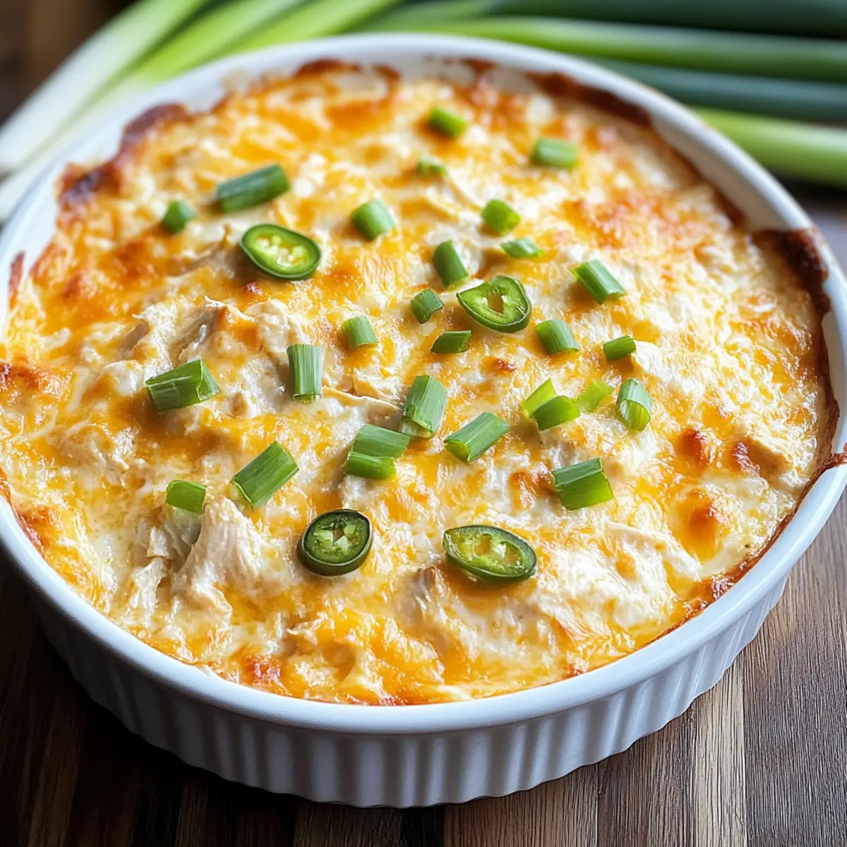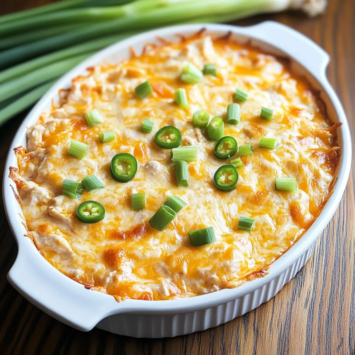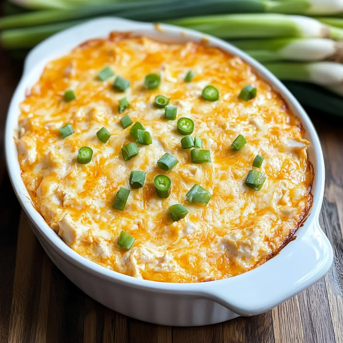 Jump to Recipe Print RecipeWhile gathering around the TV for game day, I overheard my friends debating the ultimate appetizer to serve. It was then that the idea for a Buffalo Rotisserie Chicken Dip took flight—an irresistible combination of tender chicken, creamy cheeses, and that iconic buffalo kick! This dip embodies comfort food at its best, easily throwing a delicious twist on the usual spread. Plus, with just 30 minutes to whip up, it’s a no-fuss crowd-pleaser that guarantees smiles and satisfaction. So, whether you’re hosting a big game, a cozy gathering, or simply craving something decadent, I promise this dip will elevate your menu effortlessly. Curious to dive into the recipe? Let’s get started! Why is this dip a must-try? Quick and Easy: This Buffalo Rotisserie Chicken Dip comes together in just 30 minutes, making it a fantastic choice for spontaneous gatherings and busy weeknights! Irresistible Flavor: The blend of creamy cheeses, savory chicken, and zesty buffalo sauce creates a taste that’s sure to have your guests coming back for more. Crowd-Pleasing Delight: There’s something for everyone—serve it with tortilla chips, celery sticks, or toasted bread, and watch it vanish in no time! Versatile Options: Feel free to customize: make it spicier with jalapeños or lighten it up with Greek yogurt. And if you love easy recipes, check out my Grilled Buffalo Chicken for another flavor explosion! Comfort Food Classic: With its origins in Buffalo wing culture, this dip adds a comforting twist to your appetizer selection, making your gatherings unforgettable. Buffalo Rotisserie Chicken Dip Ingredients For the Dip • Rotisserie Chicken – Provides tender protein; use white, dark, or a mix for flavor. • Cream Cheese – Adds creaminess and structure; ensure it’s softened for easy mixing. • Sour Cream – Contributes tanginess and richness, balancing the heat perfectly. • Ranch Dressing – Adds extra creaminess and flavor; choose your preferred brand. • Buffalo Wing Sauce – The key flavor component; opt for a quality brand like Frank’s RedHot. • Cheddar Cheese – Delivers a classic cheesy flavor and creates that gooey texture. • Blue Cheese – Offers a bold, tangy kick; can be omitted or swapped for more cheddar. • Garlic Powder – Enhances flavor with savory depth for an irresistible taste. • Onion Powder – Complements garlic and elevates the dip’s flavor profile. • Smoked Paprika – Adds subtle smokiness and extra depth to the overall taste. • Chopped Green Onions – Used for garnish, adding freshness and a pop of color. Optional Toppings • Extra Cheese – Sprinkle on top for an even more indulgent experience. • Jalapeños – For added spice; toss some in if you prefer a kick! Serving Options • Tortilla Chips – A classic pairing for scooping this delightful dip. • Celery Sticks – Crisp and refreshing, perfect for a lighter option. • Toasted Bread – Ideal for those wanting something warm and comforting. Step‑by‑Step Instructions for Buffalo Rotisserie Chicken Dip Step 1: Preheat the Oven Begin by preheating your oven to 375°F (190°C). This ensures that when your Buffalo Rotisserie Chicken Dip is ready, it will bake evenly and create that delectable, bubbly top. While the oven warms up, gather your ingredients and prepare your workspace for a seamless cooking experience. Step 2: Mix the Base In a large mixing bowl, combine softened cream cheese, sour cream, ranch dressing, and buffalo wing sauce. With a hand mixer or spatula, blend them together until the mixture is smooth and creamy, about 2-3 minutes. The vibrant orange hue from the buffalo sauce should be prominent, signaling a flavorful base ready to embrace the chicken. Step 3: Incorporate Chicken and Cheese Next, fold in the shredded rotisserie chicken, cheddar cheese, blue cheese (if using), garlic powder, onion powder, and smoked paprika. Stir everything together until evenly combined, ensuring that every bit of chicken is coated with the creamy mixture. The aroma of the spices and chicken will fill the air, making it even more enticing. Step 4: Transfer to Baking Dish Carefully transfer the dip mixture into a greased 8×8 inch baking dish. Use a spatula to spread it out evenly, smoothing the top. If you like an extra cheesy finish, this is the moment to sprinkle some additional cheddar or jalapeños on top for an extra kick of flavor. Step 5: Bake the Dip Place the baking dish in the preheated oven and bake uncovered for 20-25 minutes. You’ll know it’s ready when the dip is bubbly and the edges begin to turn a beautiful golden brown. Keep an eye on it during the last few minutes to achieve that perfect color and texture. Step 6: Cool and Garnish Once your Buffalo Rotisserie Chicken Dip is baked to perfection, remove it from the oven and let it cool for about 5 minutes. This resting time allows the flavors to meld. Just before serving, sprinkle chopped green onions on top for a fresh, colorful garnish that invites everyone to dig in. Buffalo Rotisserie Chicken Dip Variations Feel free to get creative with your Buffalo Rotisserie Chicken Dip! Each twist adds a unique flavor that will surely be a hit. Spicier Kick: Add diced jalapeños or a dash of cayenne pepper for a fiery touch! If you love heat, this is your chance to make it pop. Lightened Up: Swap out cream cheese for low-fat cream cheese and use Greek yogurt instead of sour cream. You’ll keep the creaminess with fewer calories! Meatless Delight: Substitute chicken with shredded jackfruit or chickpeas for a vegetarian-friendly version. Don’t worry, the flavor and texture will still be scrumptious. Crunchy Topping: Sprinkle panko breadcrumbs mixed with melted butter on top before baking to create a deliciously crispy finish. It adds an element of surprise with every bite! Slow Cooker Convenience: Combine all ingredients in a slow cooker and cook on low for 2-3 hours. This method allows the flav