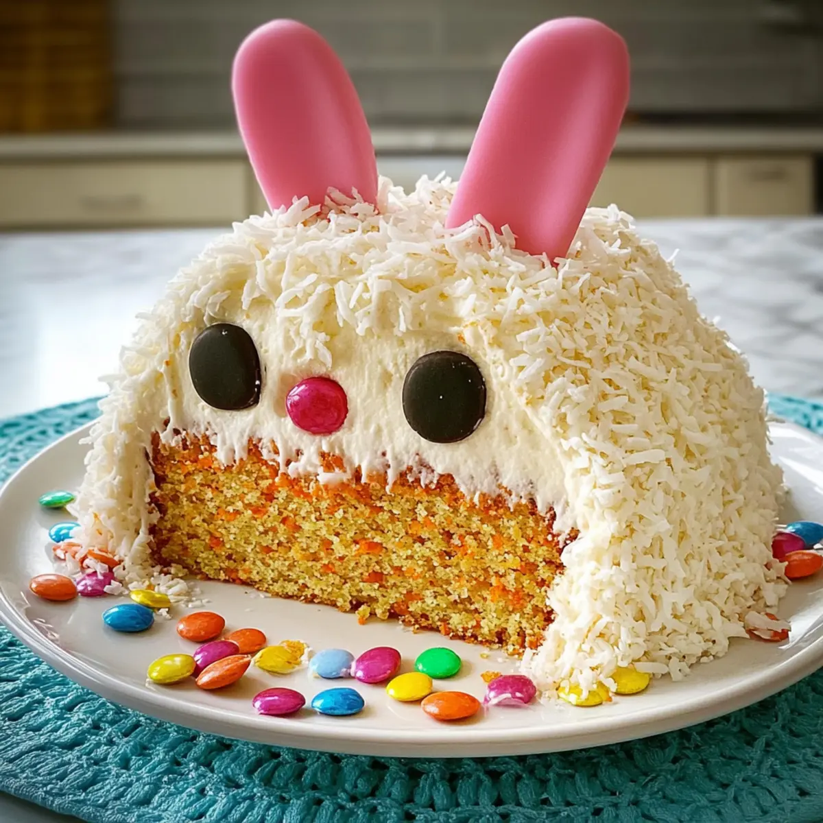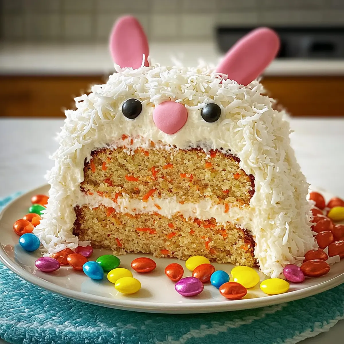 Jump to Recipe Print RecipeAs I stood in my kitchen, the aroma of warm spices wafting through the air, I found myself daydreaming about the perfect centerpiece for my upcoming Easter gathering. Enter the Bunny Cake—this delightfully playful dessert is not just about looks; it’s a fluffy carrot cake paired with creamy coconut frosting, making it an absolute crowd-pleaser! With its charming bunny shape and colorful decorations, it captivates guests of all ages while being incredibly easy to whip up. You can even customize it to fit dietary preferences, offering vegan or gluten-free options. This festive treat adds a joyful splash to your celebrations, allowing you to enjoy precious time with loved ones instead of stressing in the kitchen. Curious about how to create this cheerful cake that will surely make hearts leap with joy? Let’s hop right into the recipe! Why is Bunny Cake a Must-Try? Playful Design: This Bunny Cake not only tastes amazing but also brings a whimsical charm to your dessert table. Its adorable shape is sure to delight guests of all ages! Customizable Options: Whether you’re catering to dietary restrictions or personal preferences, you can easily create a gluten-free or vegan version without sacrificing flavor. Moist, Fluffy Cake: The secret lies in the freshly grated carrots and flavorful spices, creating a dense yet airy texture that everyone will love. Effortless Preparation: You’ll spend less time in the kitchen and more time enjoying the festivities, as this recipe is straightforward and quick to assemble. Unforgettable Taste: This festive treat combines the warm flavors of carrot cake with sweet coconut frosting, making it a delicious and memorable dessert choice that beats any store-bought option. For more delightful variations, check out my recipes for Oreo Cheesecake or Chocolate Cheesecake. Bunny Cake Ingredients • Create your own delightful Bunny Cake with these essentials! For the Batter • Cooking Spray – Prevents sticking to the pans for easy removal. • Light or Dark Brown Sugar – Adds moisture and depth of flavor to the cake. • Neutral Oil (Coconut or Canola) – Ensures the cake remains moist and has a tender texture. • Granulated Sugar – Can be replaced with a sugar alternative to lower the calorie count. • Large Eggs – Essential for structure; remember to bring them to room temperature. • Pure Vanilla Extract – Enhances the overall flavor profile of your Bunny Cake. • All-Purpose Flour – Provides structure; substitute with gluten-free flour for a gluten-free option. • Baking Powder – A key leavening agent to give your cake a light rise. • Baking Soda – Works alongside baking powder to enhance the cake’s tenderness. • Ground Cinnamon – Offers warmth and lovely aromatic flavor to the cake. • Ground Ginger – Introduces a hint of spice; adjust to your taste preference. • Ground Nutmeg – Optional, but adds an extra depth of flavor to the mix. • Kosher Salt – Balances the sweetness for a well-rounded flavor. • Grated Carrots – Adds moisture, sweetness, and flavor; freshly grated is best for texture. For the Frosting • Unsalted Butter (Room Temperature) – Forms the base for a creamy, delicious frosting. • Confectioners’ Sugar – Adds sweetness and helps achieve a smooth texture; adjust to taste. • Heavy Cream – Brings richness to the frosting; do not use low-fat alternatives. • More Vanilla Extract – For an extra boost of flavor in the frosting. • Kosher Salt – Enhances the sweetness and balances the flavors in the frosting. For the Decoration • Sweetened Shredded Coconut – Mimics that adorable bunny fur appearance. • Rice Krispies Treats – Sculpted to form the ears of your Bunny Cake. • Pink Sanding Sugar – For adding a cute decorative touch to the ears. • Jelly Beans – Perfect for little bunny eyes and a nose. • Green Food Coloring – Optional, for adding some lively decoration. With all these Bunny Cake ingredients, you’ll be well on your way to creating a festive masterpiece that will charm everyone at your Easter celebration! Step‑by‑Step Instructions for Bunny Cake Step 1: Prepare Batter Preheat your oven to 350°F (175°C) and grease two 9-inch round cake pans with cooking spray. In a large mixing bowl, whisk together both sugars, neutral oil, room temperature eggs, and vanilla extract until well combined and slightly frothy. Gently fold in the all-purpose flour, baking powder, baking soda, ground cinnamon, ground ginger, ground nutmeg (if using), kosher salt, and freshly grated carrots until the batter is smooth and homogenous. Step 2: Bake Divide the prepared cake batter evenly between the two greased pans, smoothing the tops for even baking. Place the pans in the preheated oven and bake for 25-30 minutes or until a toothpick inserted into the center comes out clean. Once baked, remove the pans from the oven and let them cool in the pans for about 10 minutes before carefully transferring the cakes to wire racks to cool completely. Step 3: Shape Cake Once the cakes are completely cooled, start by leveling the tops of both layers with a serrated knife to create a flat surface. To form the bunny ears, cut one of the cakes in half diagonally, creating two pieces. Place the whole cake layer on a serving platter and arrange the two cut halves on top to resemble bunny ears, securing them gently. Step 4: Frost In a mixing bowl, beat the room temperature unsalted butter until creamy and smooth. Gradually add confectioners’ sugar while mixing, then pour in the heavy cream, additional vanilla extract, and kosher salt. Beat the mixture until the frosting is fluffy and spreadable. Apply a thin crumb coat of frosting over the entire Bunny Cake, then chill it in the refrigerator for 30 minutes. Once set, frost the cake with a thicker layer of frosting to cover it completely. Step 5: Decorate To give your Bunny Cake its signature look, generously cover t