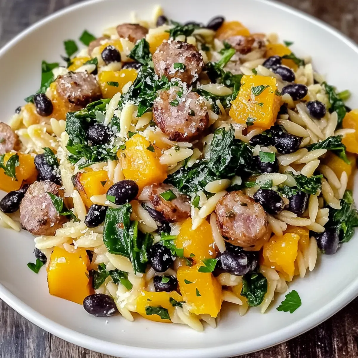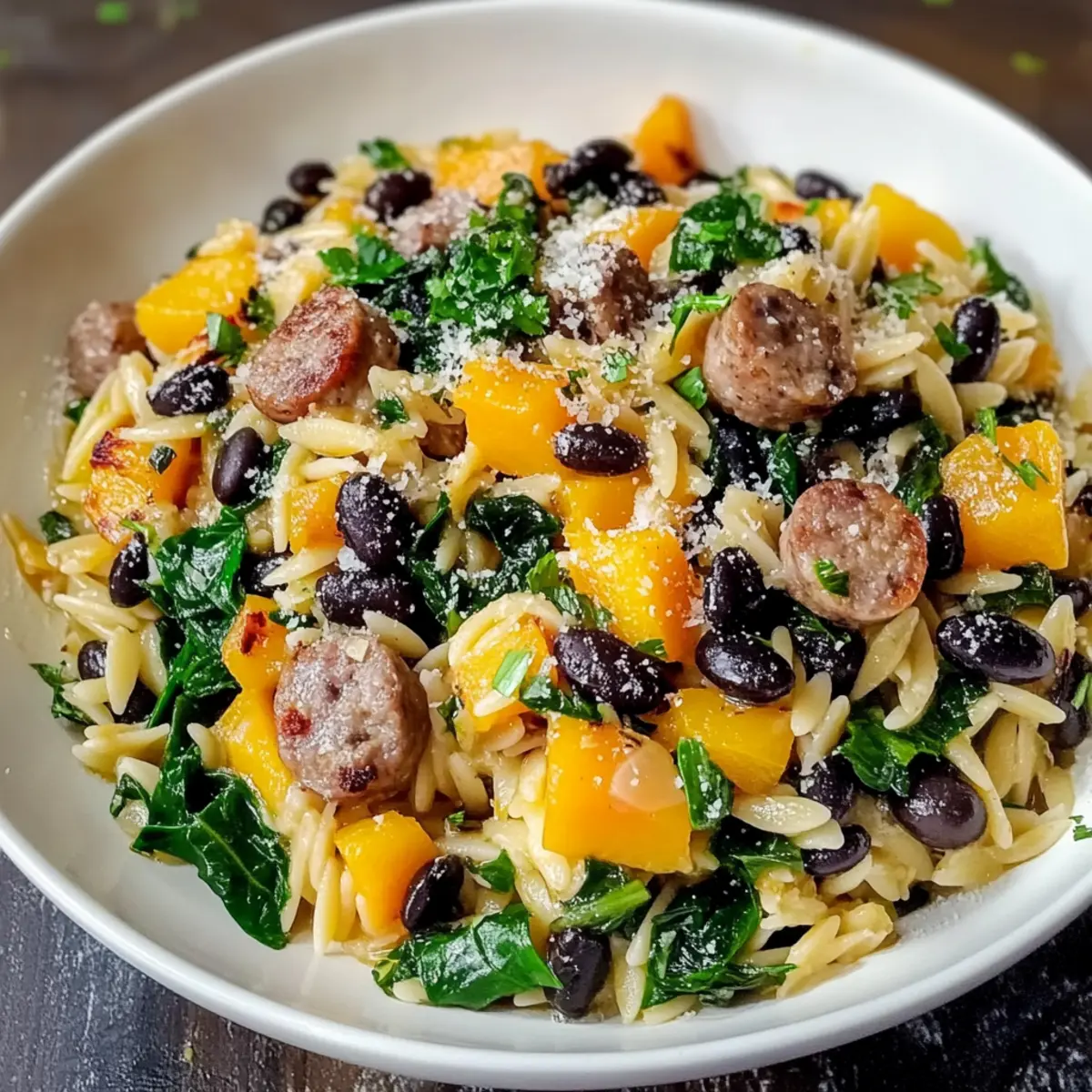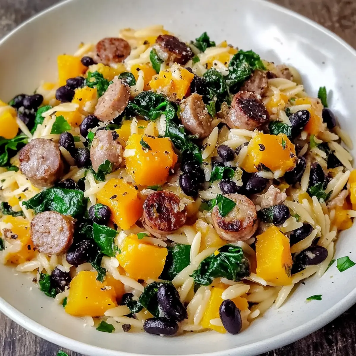 Jump to Recipe Print RecipeStepping into the kitchen, I can already smell the rich aroma of roasted butternut squash and savory sausage blending together—a sure sign that comfort food is on the menu. This Butternut Squash and Black Bean Orzo with Sausage and Spinach is my go-to recipe for cozy weeknight dinners, delivering not just warmth but a hearty dish packed with protein and flavor. In just about an hour, you can create a vibrant meal that delights both the eyes and the palate, whether you’re entertaining guests or simply treating yourself. With a few easy swaps, this recipe is easily adaptable for any dietary preference, making it a true crowd-pleaser. Curious about the perfect way to elevate your dinner game this season? Let’s dive into the comforting layers of flavors and textures that await you! Why will you love this dish? Comforting Flavors: This dish perfectly combines sweet roasted butternut squash with savory sausage, making each bite a cozy delight. Protein-Packed: With black beans and sausage, you’ll enjoy a meal that’s not just tasty but also high in protein, satisfying your hunger. Quick and Easy: In just over an hour, dinner is ready—a perfect solution for busy weeknights when you crave something hearty. Versatile Recipe: Whether you prefer vegetarian options or want to experiment with different veggies, this recipe is adaptable to suit any preference. Beautiful Presentation: The vibrant colors of spinach and squash make for a dish that’s as eye-catching as it is delicious, ideal for impressing guests or family. Perfect Meal Prep: Leftovers taste amazing too—store them for a quick lunch or dinner later in the week. Pair it with a side of Mediterranean Bean Salad for extra nutrition! Butternut Squash and Black Bean Orzo Ingredients For the Orzo: • Orzo Pasta – A nutty base that provides heartiness; can substitute with ditalini or fusilli, adjusting the cooking time. For the Main Ingredients: • Butternut Squash – Adds natural sweetness and depth; be sure to peel, seed, and dice it for even roasting. • Olive Oil – Enhances flavor during roasting; opt for extra virgin for richer taste. • Salt and Pepper – Essential for proper seasoning; feel free to adjust to your own taste. • Sausage (chicken or turkey) – Infuses savory richness and protein; try plant-based sausage for a delicious vegetarian option. • Onion – Brings sweetness and depth when sautéed; finely chop for even cooking. • Garlic – Introduces aromatic complexity; mince for optimal flavor release. • Ground Cumin – Offers warmth and earthiness; bloom in oil to enhance its flavor. • Black Beans – Provide creaminess and extra protein; don’t forget to drain and rinse them to cut sodium. • Fresh Spinach – Adds nutrients and a beautiful pop of green; wilt it into the dish for best results. • Parmesan Cheese – For a creamy, salty finish; nutritional yeast works as a dairy-free substitute. • Fresh Parsley (optional) – A lovely garnish that brightens the dish visually. • Lemon Juice – Brightens all flavors; freshly squeezed lemon juice is recommended for the best taste. Let the ingredients guide you in making your own comforting Butternut Squash and Black Bean Orzo with Sausage and Spinach dish! Step‑by‑Step Instructions for Butternut Squash and Black Bean Orzo with Sausage and Spinach Step 1: Preheat the Oven Begin by preheating your oven to 400°F (200°C). While the oven heats up, take a peeled, seeded, and diced butternut squash and toss it in a mixing bowl with 1 tablespoon of olive oil, along with salt and pepper. Spread the squash evenly on a baking sheet, making sure not to crowd the pieces, and roast for 25–30 minutes, or until they are tender and golden brown. Step 2: Cook the Orzo While the butternut squash is roasting, bring a large pot of salted water to a boil. Add the orzo pasta to the boiling water and cook according to the package instructions, typically around 8–10 minutes, until al dente. Once cooked, drain the orzo in a colander and set it aside while preparing the other ingredients. Step 3: Brown the Sausage In a large skillet, heat the remaining 2 tablespoons of olive oil over medium heat. Add your choice of sausage, breaking it into smaller pieces with a spatula. Cook for 5–7 minutes, stirring occasionally, until the sausage is thoroughly browned and cooked through, creating a delicious base for the Butternut Squash and Black Bean Orzo with Sausage and Spinach. Step 4: Sauté Onion and Garlic Next, add the finely chopped onion to the skillet with the sausage and sauté for about 3–4 minutes, or until the onion turns translucent and softens. Then, stir in the minced garlic and continue to sauté for an additional minute, allowing the aromatic flavors to blend beautifully with the sausage. Step 5: Add Spices and Veggies Sprinkle in the ground cumin, stirring it into the mixture for about one minute to bloom the spices. Next, fold in the drained and rinsed black beans and fresh spinach. Continue to stir until the spinach has fully wilted and the ingredients are well combined, adding both color and nutrition to your Butternut Squash and Black Bean Orzo with Sausage and Spinach. Step 6: Combine Ingredients Once the spinach is wilted, gently fold in the roasted butternut squash and the cooked orzo into the skillet. Add grated Parmesan cheese at this stage, stirring until everything is evenly mixed and the cheese has melted into the vibrant medley of flavors. The combination should present a harmonious blend of textures and tastes. Step 7: Finish with Lemon Juice To elevate the flavors of your dish, squeeze fresh lemon juice over the mixture. Taste and adjust seasoning with additional salt and pepper as desired, ensuring the savory richness shines. This final touch brightens the entire Butternut Squash and Black Bean Orzo with Sausage and Spinach, making it even more inviting. Step 8: Serve and Enjoy Now it’s time to bring y