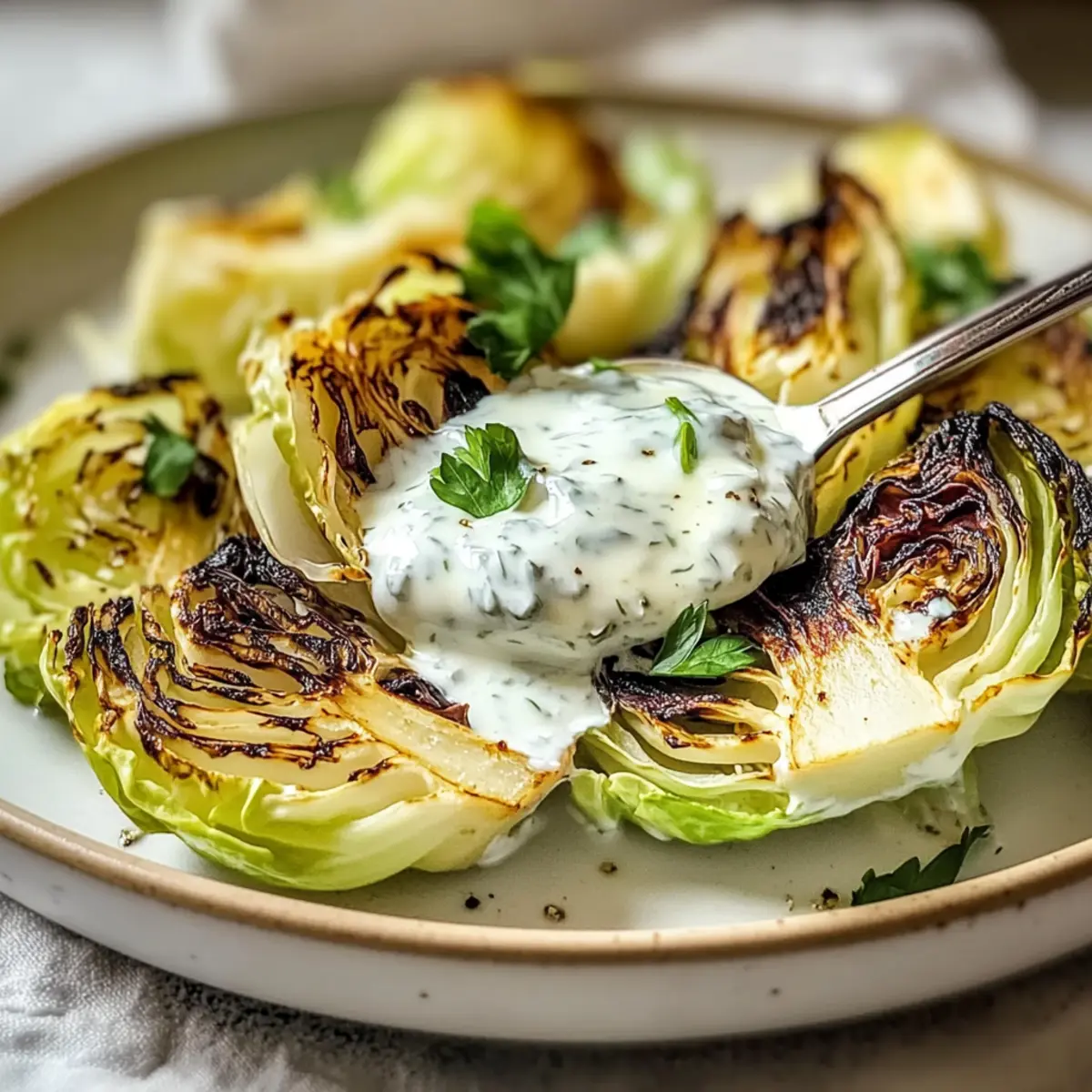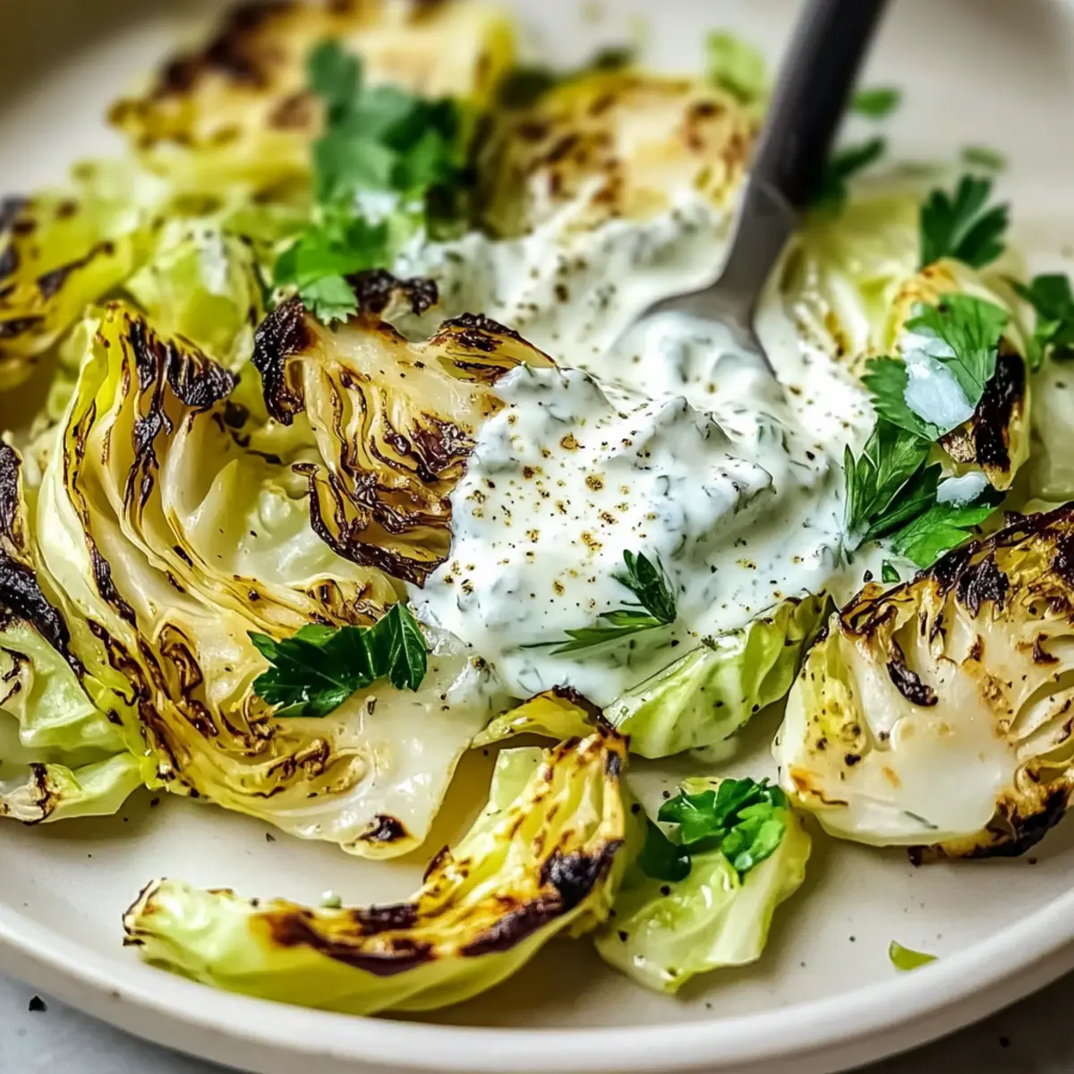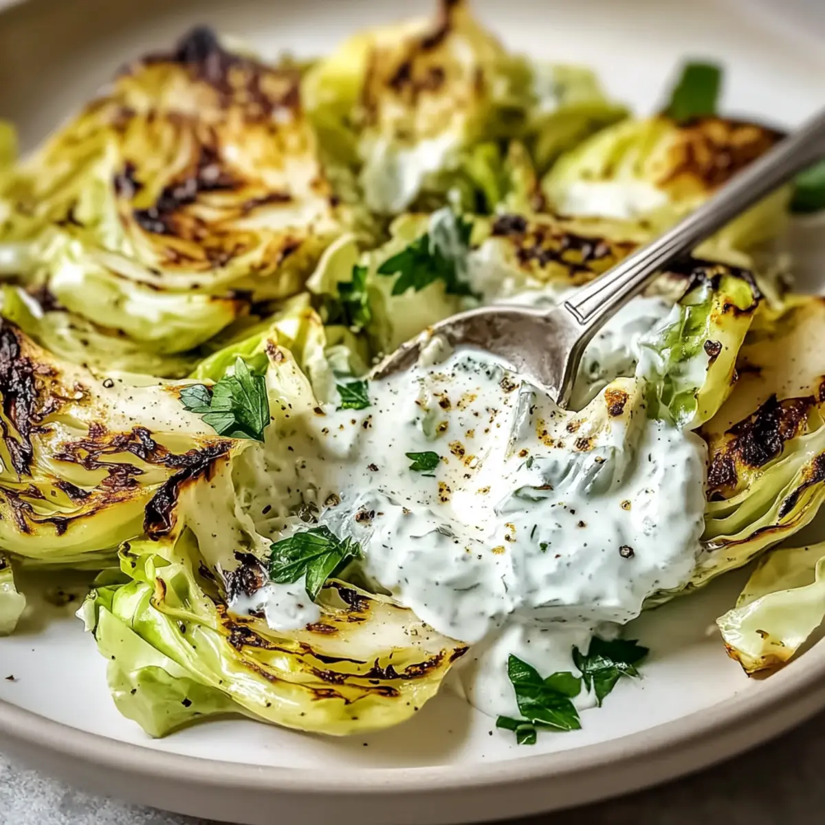 Jump to Recipe Print RecipeAs I stood in my kitchen, the scent of sizzling olive oil mixed with the sharpness of fresh garlic, I couldn’t help but feel a wave of excitement. This Refreshing Cabbage Salad with Yogurt Dressing brings a delightful crunch and zest, making it the perfect antidote to those busy weeknights when fast food looms temptingly. Not only is this salad a vibrant, crowd-pleasing addition to any meal, but it’s also a quick prep that can double as a convenient meal prep option for later. Imagine opening the fridge and discovering a colorful bowl of cabbage waiting for you, flavors melding beautifully as the hours pass. Whether you opt for napa, savoy, or even kale, each bite offers a satisfying experience that nourishes the body and soul. Ready to elevate your salad game? Let’s dive into this delicious recipe! Why Choose Cabbage Salad with Yogurt? Bright, Flavorful Ingredients: The combination of fresh cabbage and zesty yogurt dressing creates a delightful burst of flavor in every bite. Versatile and Fun: Experiment with different cabbage varieties, such as savoy or kale, for a unique twist. Each type brings its own character to the dish! Nutritious and Wholesome: Packed with fiber and healthy fats, this salad fits perfectly into any balanced diet, making it a guilt-free choice. Quick and Easy Prep: With minimal cooking and a simple dressing, you’ll have a refreshing salad ready in no time – perfect for those hectic evenings! Meal Prep Friendly: Enjoy this dish throughout the week; it stores well in the fridge, allowing the flavors to develop beautifully. You’ll be inspired to pair it with other favorites like a Strawberry Spinach Salad or a light Orzo Pasta Salad for a complete meal! Cabbage Salad with Yogurt Ingredients For the Salad • Cabbage – The star of the show, providing a crunchy base; experiment with napa or savoy for unique flavors. • Olive Oil – Adds a rich, smooth texture; for a mild taste, substitute with avocado oil or grapeseed oil. • Garlic – This aromatic gem infuses the dish with depth; adjust according to how garlicky you like it. For the Yogurt Dressing • Yogurt – The creamy, tangy base of the dressing; you can choose dairy-free options like cashew cream or coconut yogurt for a lighter touch. • Lemon Juice – Brightens up the dressing beautifully; always opt for fresh juice to maximize flavor. • Salt and Pepper – Essential for seasoning; balance to your preference for a well-rounded taste. Optional Add-ins • Fresh Herbs – Such as parsley or cilantro, to enhance freshness and visual appeal. • Nuts or Seeds – Sliced almonds or sunflower seeds can add a delightful crunch and nutritional boost. • Radishes or Scallions – For an extra pop of color and crispness that complements the cabbage salad with yogurt. Step‑by‑Step Instructions for Cabbage Salad with Yogurt Step 1: Heat the Oil Begin by heating a generous amount of olive oil in a cast iron skillet over medium heat. Allow it to heat until it shimmers slightly—this usually takes about 2-3 minutes. You want the oil hot enough to get a nice char on the cabbage wedges. This initial step sets the stage for the smoky flavor that will enhance your Cabbage Salad with Yogurt. Step 2: Prepare the Cabbage While the oil heats, cut a head of cabbage in half. Reserve one half for another meal, and take the remaining half to slice it into four wedges. The wedges should be thick enough to hold up during cooking. Visually, they should look sturdy and ready to be charred. Set them aside as you prepare to cook. Step 3: Cook the Cabbage Wedges Place the cabbage wedges flat-side down into the hot skillet, seasoning them generously with salt. Leave them undisturbed for 6-7 minutes, allowing them to cook until the flat side is beautifully charred and caramelized. During this time, you should see a lovely golden-brown color developing, which indicates they are cooking just right for your Cabbage Salad with Yogurt. Step 4: Flip and Char the Other Side Carefully flip the cabbage wedges using tongs to ensure you don’t lose any char. Cook the other side for another 6-7 minutes. By the end, the wedges should be tender yet crispy, showcasing blackened edges that add depth to the dish. Keep an eye on them to avoid burning, but that attractive char is crucial for flavor. Step 5: Mix the Yogurt Dressing While the cabbage is charing, grab a mixing bowl and prepare your yogurt dressing. Combine fresh lemon juice, minced garlic, yogurt, and a pinch of salt and pepper. Each ingredient plays its role; the tangy yogurt brightens the dish while the fresh garlic adds a delightful kick. Whisk everything together until smooth and creamy, creating a luscious dressing for your Cabbage Salad with Yogurt. Step 6: Adjust the Dressing’s Consistency Check the consistency of the dressing; if it seems too thick, gradually whisk in a little water until it reaches your desired creaminess. The dressing should be spreadable yet pourable, ready to coat the cabbage nicely. This step ensures that each bite of your Cabbage Salad with Yogurt is flavorful and satisfying. Step 7: Combine and Serve Once the cabbage is cooked to your liking, remove the wedges from the skillet. Season them to taste with salt and drizzle your prepared yogurt dressing generously over the top. If desired, garnish with fresh herbs like parsley or cilantro for added flavor and a pop of color. Serve your Cabbage Salad with Yogurt warm or allow it to cool before enjoying it as a refreshing side dish! What to Serve with Refreshing Cabbage Salad with Yogurt Dressing This vibrant salad bursts with freshness and inviting crunch, making it a delightful centerpiece for any meal. Grilled Chicken: Tender, juicy grilled chicken adds protein and complements the smoky flavors of cabbage without overpowering it. Quinoa Pilaf: A fluffy quinoa pilaf with herbs and toasted nuts provides a complementary nutty flavor and a hearty texture. Crispy Roast