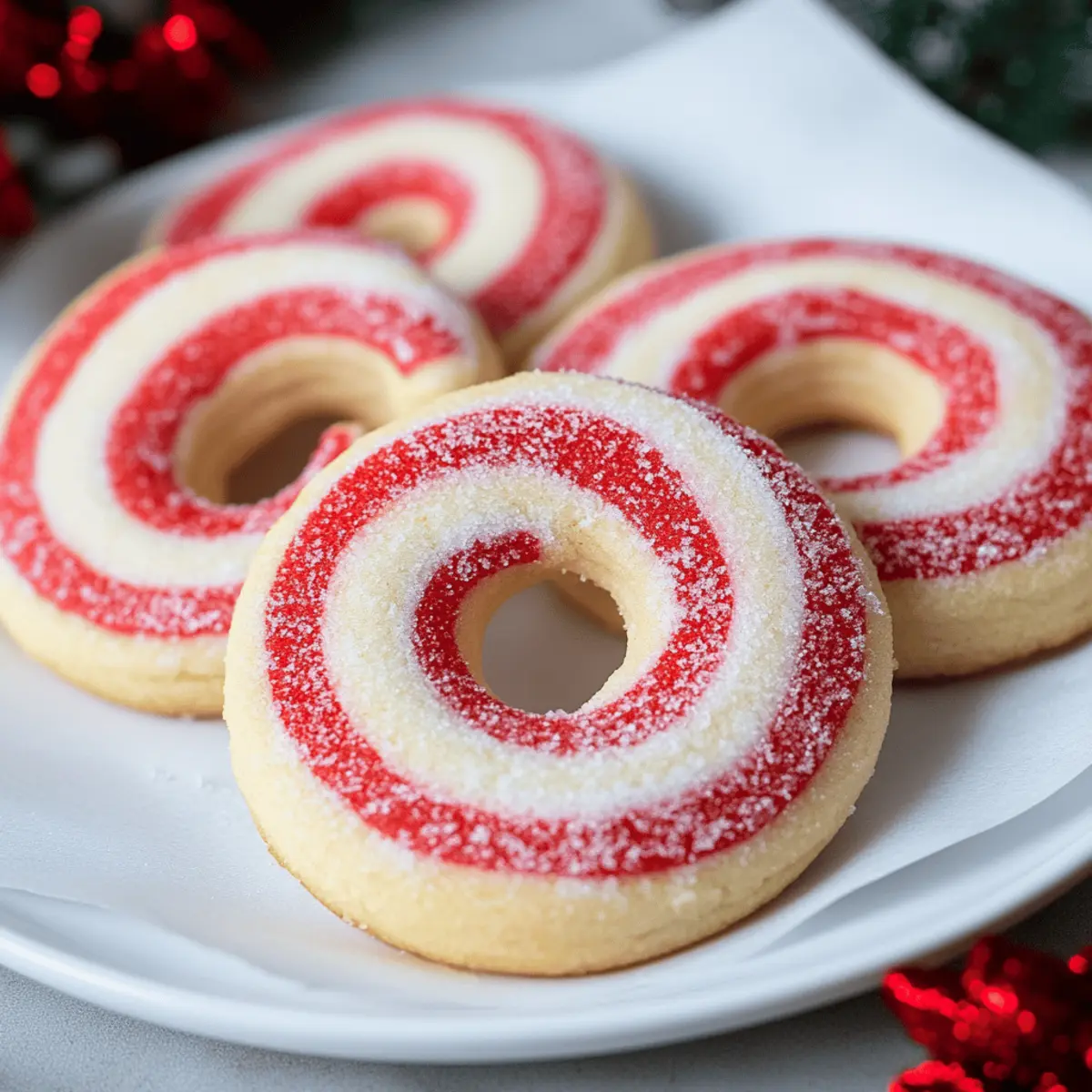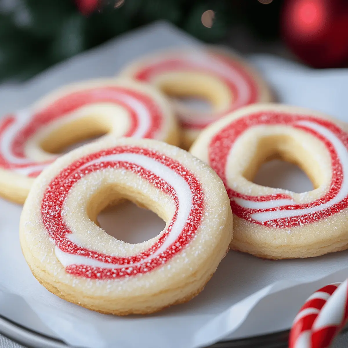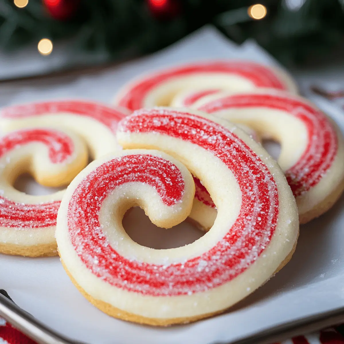 Jump to Recipe Print RecipeAs I stood in my kitchen surrounded by the comforting scents of the holidays, the vibrant red and white swirls of Candy Cane Cookies came to mind. They not only fill my heart with nostalgia but also allow me to share pure joy with friends and family. With their buttery vanilla dough and refreshing peppermint essence, these festive cookies are truly the perfect addition to any cookie exchange or holiday gathering. Plus, they’re delightfully easy to make, whether you’re a baking pro or just starting to explore your culinary prowess. Imagine the smiles on your loved ones’ faces as they indulge in these whimsical treats—where sweet meets minty in every bite! Curious about how to recreate this holiday magic? Let’s dive into the recipe! Why are Candy Cane Cookies a Must-Bake? Festive Appeal: The vibrant colors and whimsical shapes make these cookies a show-stopping addition to any holiday spread. Easily Customizable: Feel free to adjust the peppermint flavor or even experiment with different food colors for unique variations. Family-Friendly Fun: Baking together creates lasting memories, especially when shaping those adorable candy canes! Gift-Worthy Treats: Pack them in mason jars to share the holiday cheer or for cookie exchanges that will impress friends! Simple Steps: With easy instructions and basic ingredients, this recipe is perfect for bakers of all levels. Don’t miss out on another delightful treat, explore our Chocolate Chip Cookies recipe for more baking joy! Candy Cane Cookies Ingredients • Discover the perfect ingredients to create these holiday delights! For the Dough Unsalted Butter – Provides richness and acts as the fat for the cookie dough; margarine is a suitable dairy-free substitute. Powdered Sugar – Sweetens the cookies and offers a light texture; granulated sugar can work but may change the texture. Large Egg – Binds all ingredients together and adds moisture; a flax egg is a great vegan alternative. Vanilla Extract – Enhances flavor with sweet notes; almond extract can be used to mix things up. Peppermint Extract – Delivers the distinctive minty flavor that defines these Candy Cane Cookies; use more vanilla for a milder taste. All-Purpose Flour – The main structure-building ingredient; gluten-free blends can be used for those with dietary restrictions. Salt – Balances the sweetness and enhances overall flavor; feel free to use sea salt or kosher salt. For the Color Red Food Coloring (gel preferred) – Adds a festive pop to half the dough, perfect for that candy cane look; liquid coloring can be used cautiously as it may affect dough consistency. Gather these essentials, and let the holiday baking begin! Step‑by‑Step Instructions for Candy Cane Cookies Step 1: Prep Oven Begin by preheating your oven to 375°F (190°C). While the oven warms up, line your baking sheets with parchment paper to prevent sticking and to ensure easy cleanup later. The parchment paper will also help your Candy Cane Cookies bake evenly, giving them a beautiful, lightly golden bottom. Step 2: Cream Butter and Sugar In a large mixing bowl, combine softened unsalted butter and powdered sugar. Using an electric mixer, beat the mixture on medium speed for about 3–4 minutes until it becomes light and fluffy. This step is vital as it incorporates air into the mixture, creating a soft, tender texture in your Candy Cane Cookies. Step 3: Add Egg & Extracts Next, add in one large egg, along with vanilla extract and peppermint extract. Blend it all together until the mixture is smooth and well incorporated. The peppermint extract is key in giving those delightful holiday vibes to your Candy Cane Cookies, filling your kitchen with a festive aroma. Step 4: Mix Dry Ingredients Gradually add the all-purpose flour and salt into the wet mixture, stirring on low speed just until the dough forms. The dough should be soft and cohesive, not sticky. Be careful not to overmix, as this can lead to tough cookies. If it looks crumbly, a splash of milk can help bring it together. Step 5: Divide and Dye Once your dough is ready, divide it in half. Take one portion and add red food coloring; knead it gently until the color is evenly dispersed. This will create the vibrant, festive effect typical of Candy Cane Cookies. Keep the other portion plain for that classic candy cane look. Step 6: Shape Cookies On a lightly floured surface, take a teaspoon of each colored dough and roll them into 4-inch ropes. Twist the two ropes together to create a strand, then gently bend the ends to form a candy cane shape. The twisting process beautifully combines the flavors and colors, making each cookie unique. Step 7: Bake Place your shaped cookies on the prepared baking sheets, spacing them out to allow for spreading. Bake in the preheated oven for about 8–10 minutes, or until the bottoms are lightly golden. Keep an eye on them, as you want to achieve that perfect golden hue without overbaking. Allow them to cool on the pan for 5 minutes before transferring to a cooling rack. What to Serve with Candy Cane Cookies As you enjoy the sweet minty goodness of these festive treats, why not elevate your holiday meal with delightful pairings that create a memorable experience? Hot Cocoa: The rich, creamy flavor of hot cocoa beautifully complements the peppermint in each cookie, creating a cozy, warming treat on cold winter nights. Milk: A classic pairing, a cold glass of milk balances the sweetness of Candy Cane Cookies and enhances the nostalgic feeling of childhood that comes with every bite. Ice Cream: Peppermint or vanilla ice cream adds a chilly, creamy texture that contrasts with the buttery cookie, making for an indulgent holiday dessert. Fruit Salad: A refreshing fruit salad with berries and citrus can provide a bright, tangy contrast to the sugary cookies, adding a burst of freshness to your festive spread. Cheese Platter: Include creamy brie or sharp cheddar with crackers for a 