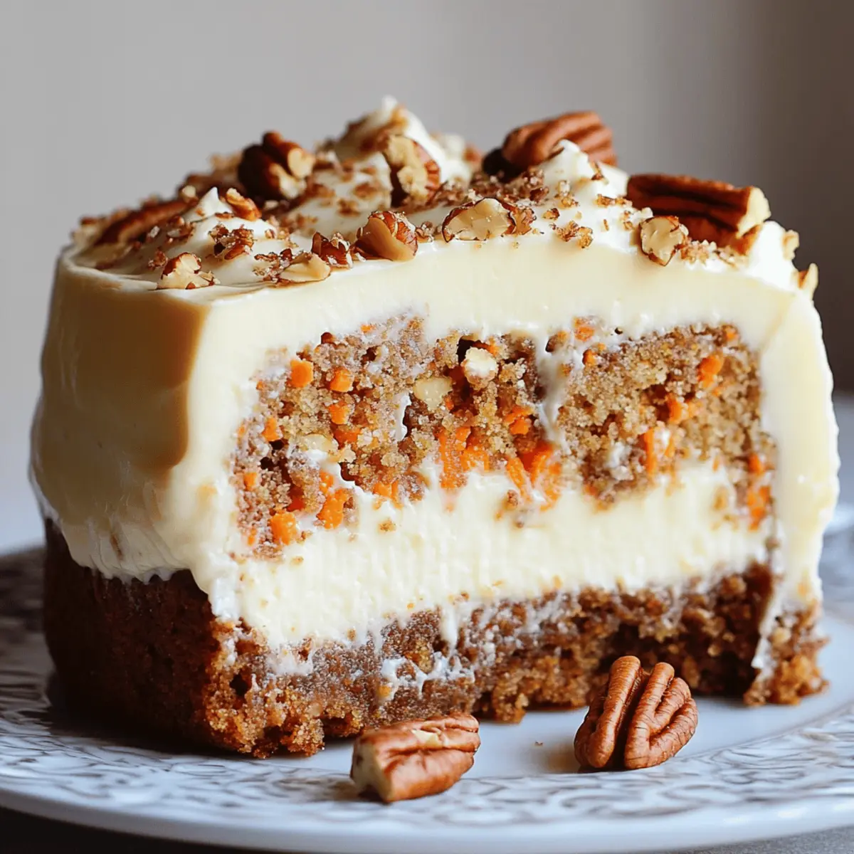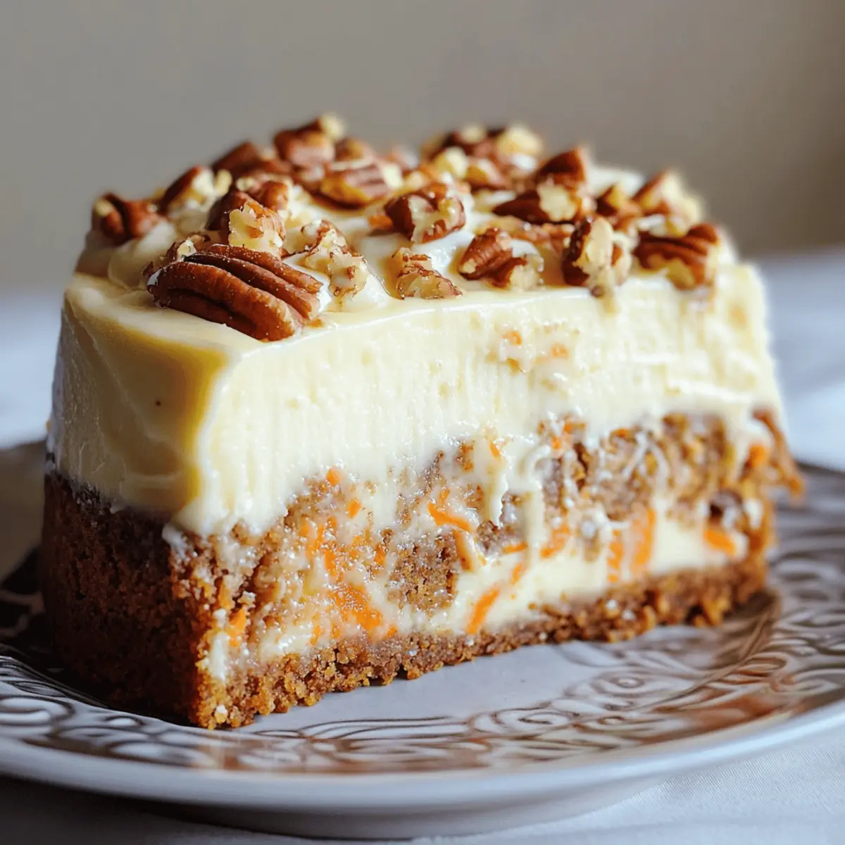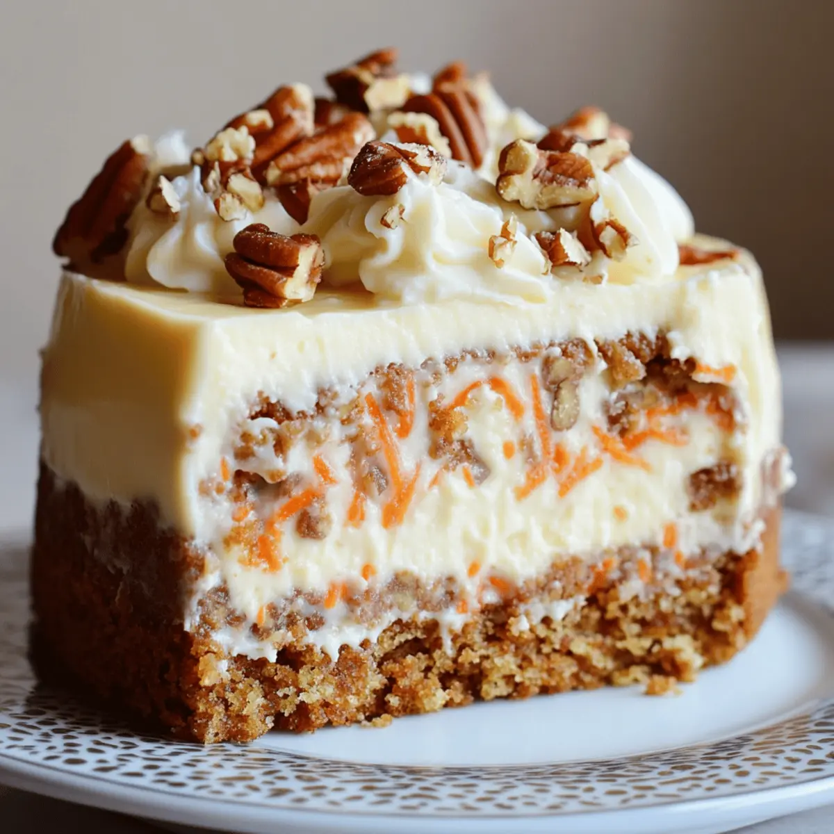 Jump to Recipe Print RecipeAs I stood in my kitchen, the scent of spices mingling with the sweet aroma of freshly grated carrots filled the air, transporting me to sun-drenched spring gatherings. This Creamy Carrot Cake Cheesecake is not just a dessert; it’s a celebration on a plate, combining the rich, tangy flavors of cheesecake with the moist warmth of spiced carrot cake. Topped with smooth cream cheese frosting and crunchy pecans, this delightful treat is perfect for Easter and all spring festivities. Not only is it surprisingly easy to whip up, but its stunning presentation makes it a guaranteed crowd-pleaser, leaving everyone asking for seconds. Are you ready to impress your friends and family with this show-stopping dessert? Why is this dessert a must-try? Unforgettable Flavor: The blend of creamy cheesecake and spiced carrot cake creates a harmonious taste that dances on your palate. Show-Stopping Presentation: With its luscious cream cheese frosting and pecan garnish, this dessert looks as stunning as it tastes. Simple to Make: Even if you’re a beginner, this recipe uses straightforward techniques that guarantee success. Versatile Delight: Perfect for Easter gatherings or any spring celebration, it’s adaptable for gluten-free diets or nut-free preferences. Want to try something different? Check out my Creamy 3-Ingredient Cheesecake for a quick treat! Crowd Pleaser: Expect rave reviews as this decadent cheesecake secures a place at the heart of your gatherings, making it a treasured favorite. Carrot Cake Cheesecake Ingredients For the Cheesecake Layer • Cream Cheese – Provides creaminess and tanginess; full-fat gives the best texture. • Granulated Sugar – Sweetens the cheesecake; brown sugar can lend additional flavor depth. • Eggs – Binds and sets the ingredients; make sure they are at room temperature for even mixing. • Vanilla Extract – Adds depth of flavor; opt for pure vanilla extract for the best taste. For the Carrot Cake Layer • Carrots – The star flavor; freshly grated carrots yield optimal taste and texture. • All-Purpose Flour – Adds structure; use a gluten-free flour blend for a gluten-free option. • Baking Powder – Helps the cake rise; ensure freshness for effective leavening. • Cinnamon – Provides warmth and spice; freshly ground cinnamon enhances the flavor. • Nutmeg – Adds a fragrant spice; fresh nutmeg makes a noticeable difference. For the Topping • Cream Cheese Frosting – Adds smoothness and richness on top; a must-have for this cheesecake. • Pecans – Offers a crunchy texture; can be omitted or replaced with walnuts if desired. Dive into making the delightful Carrot Cake Cheesecake, and watch as it becomes the star of your spring gatherings! Step‑by‑Step Instructions for Carrot Cake Cheesecake Step 1: Preheat and Prepare the Pan Begin your journey by preheating the oven to 325°F (163°C). Meanwhile, prepare a 9-inch springform pan by lining the bottom with parchment paper and greasing the sides with non-stick spray or butter. This ensures easy removal of your Carrot Cake Cheesecake later. Set the pan aside while you prepare the cake batter. Step 2: Mix the Carrot Cake Batter In a large mixing bowl, combine your dry ingredients: all-purpose flour, baking powder, cinnamon, and nutmeg. In another bowl, mix the wet ingredients: freshly grated carrots, eggs, and vanilla extract, stirring until well blended. Gradually fold the wet mixture into the dry ingredients until just combined. The batter should be thick yet moist; set it aside for the cheesecake layer. Step 3: Prepare the Cheesecake Batter In a separate bowl, beat together the cream cheese and granulated sugar using an electric mixer on medium speed until smooth and creamy, about 3 minutes. Incorporate the eggs one at a time, mixing well after each addition. Finally, add the vanilla extract and mix until fully combined. The cheesecake batter should be velvety and free of lumps, ready to layer. Step 4: Layer the Batters Now it’s time to create the beautiful layers. Start by spooning dollops of the carrot cake batter into the prepared springform pan. Alternate with dollops of the cheesecake batter, ensuring a marbled effect by gently swirling a knife through both layers. This technique creates the stunning visual contrast that makes the Carrot Cake Cheesecake so appealing. Step 5: Bake the Cheesecake Cover the pan loosely with aluminum foil to prevent over-browning, then place it into the preheated oven. Bake for 50–60 minutes, checking for doneness when the edges are set but the center has a slight jiggle. This slight jiggle indicates the cheesecake will firm up as it cools, ensuring a perfect texture for your decadent dessert. Step 6: Cool Gradually Once baked, turn off the oven and leave the cheesecake inside with the door slightly ajar for about 1 hour. This gradual cooling helps prevent cracks from forming. After an hour, remove the cheesecake from the oven and let it cool at room temperature before refrigerating it for at least 4 hours or overnight to set fully. Step 7: Frost and Serve Once the Carrot Cake Cheesecake has cooled and set, it’s time to add the finishing touch! Spread a generous layer of cream cheese frosting over the top, ensuring even coverage. Sprinkle with chopped pecans for added crunch and flavor. Finally, slice this beautiful dessert and share it with loved ones, reveling in the delightful blend of flavors! Carrot Cake Cheesecake Variations Feel free to sprinkle your own twist onto this delightful dessert, elevating it to meet your taste and dietary needs! Nut-Free: Omit the pecans entirely or swap them for sunflower seeds for a crunchy, nut-free alternative. Gluten-Free: Substitute all-purpose flour with a gluten-free flour blend to cater to those avoiding gluten. It bakes beautifully! Tropical Twist: Add crushed pineapple to the carrot cake batter for a tropical flavor burst that brightens the dish. It pairs wonderfully with