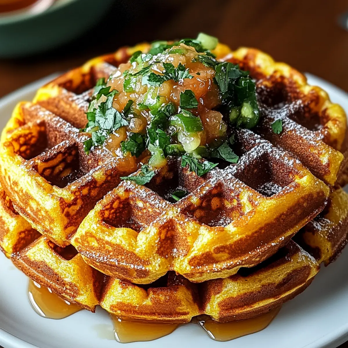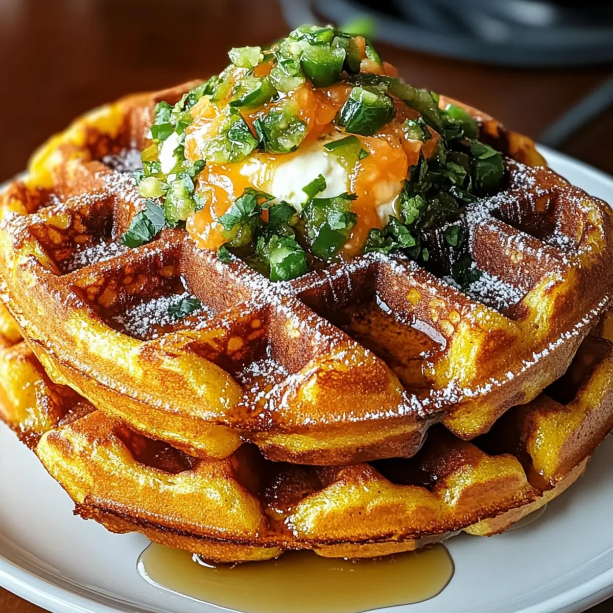 Jump to Recipe Print RecipeStanding in my kitchen, I watched the golden batter sizzle and pop as it met the waffle iron, excitement bubbling within me. Today, I’m sharing my latest culinary adventure: Cheddar Jalapeño Cornbread Waffles. These delightful waffles blend the heartiness of classic Southern cornbread with a playful twist, featuring crispy edges and a fluffy interior, with just the right kick of jalapeño spice. Perfect for brunch, as a savory side, or even as a quick dinner option, they’re a fantastic way to elevate your comfort food game. Plus, they can easily be made gluten-free and dairy-free, making them accessible for everyone at the table. Are you ready for a breakfast that does more than just fuel your day? Let’s dive into this fun and flavorful recipe! Why are Cheddar Jalapeño Waffles a Must-Try? Unique Flavor Fusion: The marriage of hearty cornbread and the cozy aesthetic of waffles creates a dish that’s both familiar and exciting. Crispy and Fluffy: With their golden edges and soft interiors, these waffles deliver a delightful textural contrast in every bite. Spicy Kick: The jalapeño adds just the right amount of heat, transforming ordinary brunch into an unforgettable experience. Versatile Serving Options: Enjoy them with savory toppings like fried eggs or sweet drizzles of honey, making them perfect for any palate. Adaptable for All Diets: With easy substitutions, you can whip up gluten-free and dairy-free versions, ensuring everyone can savor these delicious waffles! For more delightful brunch ideas, check out my savory breakfast recipes. Cheddar Jalapeño Cornbread Waffles Ingredients • Dive into the flavorful world of Cheddar Jalapeño Cornbread Waffles with these essential ingredients! For the Waffles Cornmeal – Provides structure and a nutty, sweet flavor; essential for that classic cornbread taste. All-Purpose Flour – Adds fluffiness and structure; easily replace with gluten-free flour for a gluten-free option. Baking Powder – Acts as a leavening agent to ensure your waffles rise beautifully. Baking Soda – Enhances leavening, especially when combined with buttermilk. Salt – Balances the flavors, making each bite irresistible. Buttermilk – Creates tenderness and a slight tang; for dairy-free, use milk mixed with vinegar. Eggs – Provides moisture and binds the ingredients beautifully. Cheddar Cheese – Adds richness and a melty texture; swap for dairy-free cheese for lactose-free delight. Jalapeños – Infuses your waffles with the perfect spicy kick; fresh for heat, or pickled for tanginess. Step‑by‑Step Instructions for Cheddar Jalapeño Cornbread Waffles Step 1: Preheat the Waffle Maker Begin by preheating your waffle maker to medium-high heat. Lightly grease the cooking surface with cooking spray or melted butter to ensure the waffles release easily. This initial step is crucial for achieving that golden-brown crispiness on the outside of your Cheddar Jalapeño Cornbread Waffles. Step 2: Whisk the Dry Ingredients In a large bowl, combine the cornmeal, all-purpose flour, baking powder, baking soda, and salt. Use a whisk to blend these dry ingredients thoroughly, ensuring that there are no lumps. This mixture is the foundation of your cornbread waffles, providing structure and flavor. Step 3: Mix the Wet Ingredients In a separate bowl, whisk together the buttermilk, eggs, and melted butter until the mixture is smooth and well-combined. The wet ingredients add moisture and richness to your batter. This step is essential to ensure your Cheddar Jalapeño Cornbread Waffles have a tender and fluffy texture. Step 4: Combine Wet and Dry Mixtures Gently pour the wet ingredients into the bowl with the dry mixture. Using a spatula, fold the batter together until just combined—avoid overmixing for the best texture. The batter should be slightly lumpy; this will help keep your waffles light and fluffy. Step 5: Add Cheese and Jalapeños Carefully fold in the shredded cheddar cheese and diced jalapeños into the batter. This step infuses the waffles with a delightful cheesy flavor and the spicy warmth of jalapeños, creating an irresistible blend. Make sure they are evenly distributed throughout the batter for consistent flavor in each bite. Step 6: Cook the Waffles Spoon an appropriate amount of batter onto the preheated waffle maker. Close the lid and cook for 4 to 6 minutes, or until the waffles are golden brown and crispy. Check for doneness by opening the waffle maker; golden edges and a steaming sound indicate they’re ready to be removed! Step 7: Keep Waffles Warm Once cooked, transfer your delicious Cheddar Jalapeño Cornbread Waffles to a cooling rack or a warm oven set to 200°F (95°C). This keeps them crispy while you finish cooking the rest of the batter. Avoid stacking to maintain that lovely crunch. Step 8: Serve and Enjoy Serve your Cheddar Jalapeño Cornbread Waffles hot with your favorite toppings like salsa, honey, or fried eggs. The combination of flavors and textures makes for a perfect brunch delight that’s ready to impress family and friends. Cheddar Jalapeño Cornbread Waffles Variations Feel free to get creative and make these Cheddar Jalapeño Cornbread Waffles your own with these delightful twists! Pepper Jack: Swap cheddar cheese for pepper jack for a spicier punch. This variation elevates the heat, making each bite even more exciting. Fresh Corn: Add fresh corn kernels for bursts of sweetness and a delightful pop of texture. It enhances the cornbread charm and gives a fresh summer essence. Green Onions: Substitute jalapeños with green onions for a milder flavor profile. They still bring a lovely oniony freshness without the heat. Herb Infusion: Add a handful of chopped herbs like cilantro or chives to the batter. This fresh twist brightens up the flavors and offers a delightful aromatic experience. Savory Cheese Blend: Mix in other cheeses, such as gouda or feta, for a flavorful surprise. The creaminess of