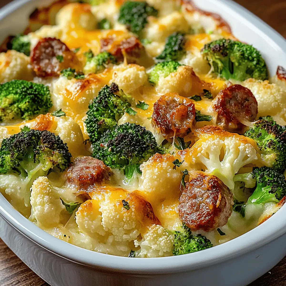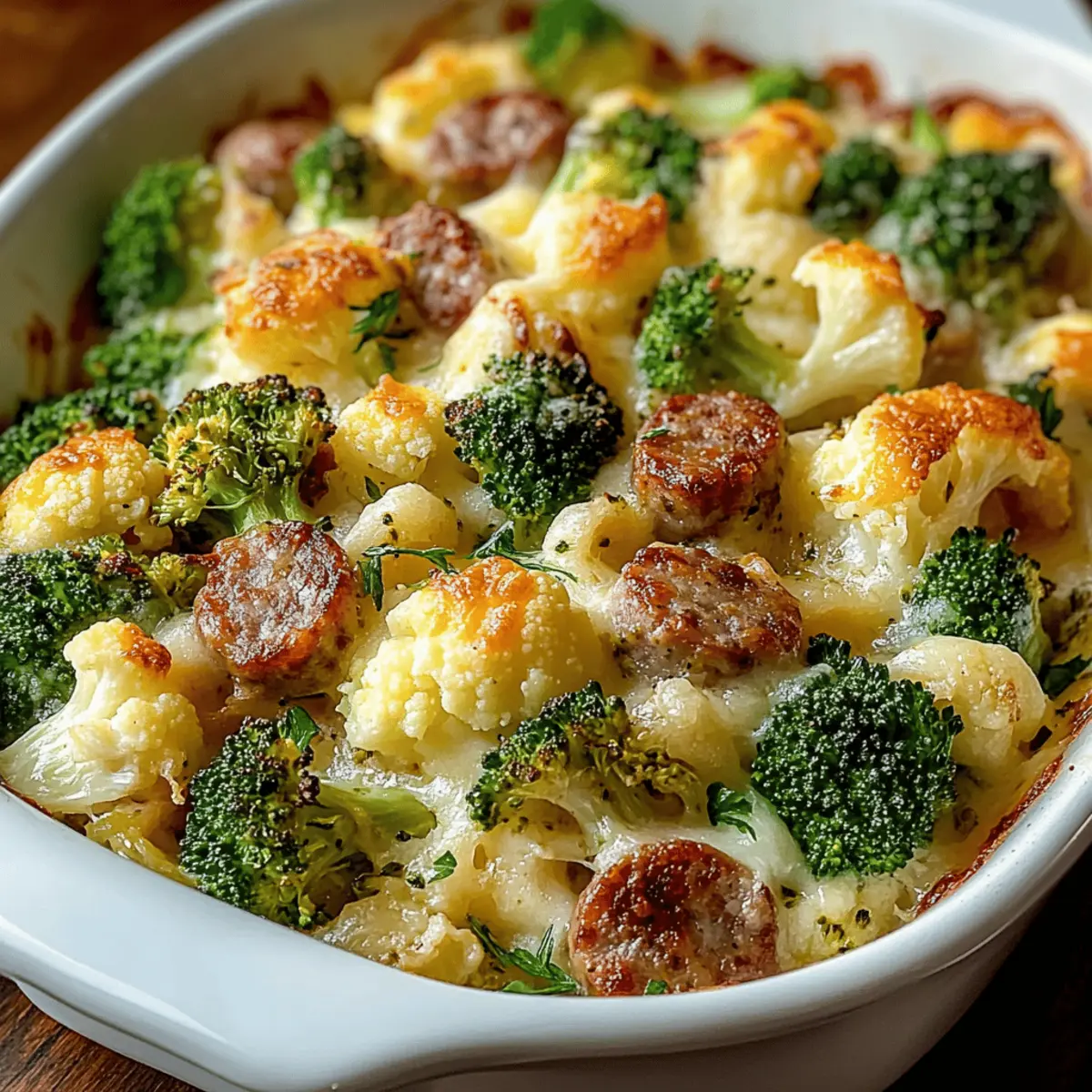 Jump to Recipe Print RecipeI still recall the first time I whipped up a Cheesy Broccoli, Sausage, and Cauliflower Casserole—it was a chilly evening, and the thought of a warm, cozy meal was simply irresistible. This recipe has quickly become a favorite in my kitchen, combining hearty Italian sausage with vibrant veggies enveloped in a creamy sauce that warms both the belly and the heart. Not only is this casserole a comforting crowd-pleaser, perfect for family dinners or potluck gatherings, but it also offers the bonus of being easily customizable—swap in your favorite veggies or cheese to make it your own. So, are you ready to dive into a bowl of cheesy goodness that’ll have everyone asking for seconds? Let’s get cooking! Why is this casserole a must-try? Comforting Delight: This Cheesy Broccoli, Sausage, and Cauliflower Casserole will envelop you in warm, comforting flavors that remind you of home. Easy to Customize: Swap out veggies or cheeses to match your cravings; every bite can be a new experience! Crowd-Pleasing Goodness: It’s the kind of dish that gets everyone at the table reaching for seconds—perfect for family nights or potlucks. Creamy & Hearty: The luscious, creamy sauce combined with tender veggies and savory sausage creates a rich flavor that’s downright addictive. Time-Saving Meal: Prepare ahead of time and bake when you’re ready—dinner’s ready without the last-minute rush! This casserole is sure to impress, similar to other favorites like Cheesy Hamburger Potato or Cheesy Broccoli Casserole. Don’t miss out on this flavorful gem! Cheesy Broccoli, Sausage, and Cauliflower Casserole Ingredients For the Casserole Italian Sausage – Provides a savory, meaty backbone and depth of flavor; substitute chicken sausage for a lighter option. Cauliflower – Adds a tender-crisp texture that absorbs the creamy sauce beautifully; no notable substitutions required. Broccoli – Offers a fresh, slightly bitter contrast that brightens the dish; substitute with green beans or asparagus if desired. Heavy Cream – Works with cheese to create a velvety sauce that coats the vegetables; substitute half-and-half for a lighter version. Cheddar Cheese – Melts into the sauce for a classic cheesy flavor; substitute Monterey Jack for a milder taste. Parmesan Cheese – Forms a golden, crispy crust on top; no notable substitutions. Butter – Used to sauté vegetables and add richness; you can use olive oil as a dairy-free alternative. Garlic – Infuses the dish with aromatic depth; fresh garlic preferred, minced garlic from a jar is a quick alternative. Salt & Black Pepper – Enhances overall flavor; adjust according to taste. Red Pepper Flakes – Adds a gentle warmth; omit for a milder casserole or add more for extra spice. Nutmeg – Provides a warm undertone enhancing the creamy sauce; can be omitted if undesired. Bread Crumbs – Creates a buttery, crunchy topping; substitute gluten-free bread crumbs for a gluten-free option. Fresh Parsley – Used for garnish to add color and brightness; substitute with chives or green onions. Step‑by‑Step Instructions for Cheesy Broccoli, Sausage and Cauliflower Casserole Step 1: Preheat the Oven Start by preheating your oven to 375°F (190°C). This will ensure a perfect baking temperature for our Cheesy Broccoli, Sausage, and Cauliflower Casserole, allowing it to come out golden and bubbly. While the oven warms up, gather your ingredients and grease a 9×13-inch baking dish for easy cleanup. Step 2: Brown the Sausage In a large skillet over medium heat, add the Italian sausage and cook, breaking it apart with a spatula, until browned and fully cooked—about 6-8 minutes. Once browned, remove the sausage from the skillet, draining any excess fat, and set it aside. This step builds a rich flavor base for our casserole. Step 3: Sauté the Garlic In the same skillet, melt 2 tablespoons of butter over medium heat. Add minced garlic to the melted butter, sautéing for about 1 minute until fragrant but not browned. The aromatic garlic will infuse the dish with depth, making our Cheesy Broccoli, Sausage, and Cauliflower Casserole truly delightful. Step 4: Cook the Vegetables Next, add the chopped cauliflower and broccoli to the skillet, stirring well to coat. Sauté the vegetables for about 5-7 minutes until softened and they begin to gain a bit of color. This step not only enhances their flavor but also prepares them to soak up the creamy sauce later on. Step 5: Make the Creamy Sauce Pour in the heavy cream, then season with salt, black pepper, red pepper flakes, and nutmeg. Stir well to combine all the ingredients, letting the mixture simmer gently for 3-4 minutes. This creamy sauce will envelop our hearty vegetables and sausage, creating that luscious texture we love in a casserole. Step 6: Add the Cheese Reduce the heat and gradually add shredded cheddar cheese to the simmering mixture, stirring continuously until the cheese is fully melted and incorporated—about 2-3 minutes. This step is essential as it ties together all the elements in our Cheesy Broccoli, Sausage, and Cauliflower Casserole, creating a deliciously cheesy experience. Step 7: Incorporate the Sausage Fold the browned sausage back into the cheesy vegetable mixture, ensuring it’s evenly distributed throughout. This step guarantees each bite is packed with savory sausage flavor, enhancing the casserole’s overall heartiness and making it a wonderful comfort dish. Step 8: Transfer to Baking Dish Carefully pour the mixture into the greased 9×13-inch baking dish, spreading it evenly. Top it generously with grated Parmesan cheese and a sprinkle of bread crumbs, which will form a perfectly crispy topping while baking. This layer adds a delightful crunch that contrasts beautifully with the creamy filling. Step 9: Bake the Casserole Place the baking dish in the preheated oven and bake for 20-25 minutes, or until the top is golden brown and the edges are bubbly. Keep a