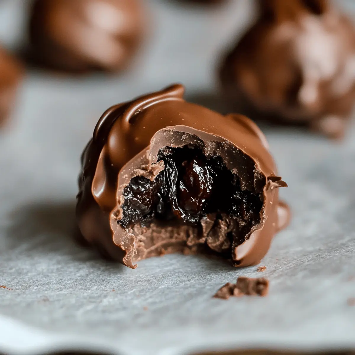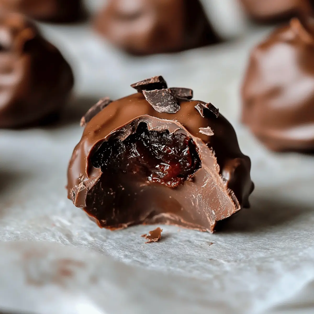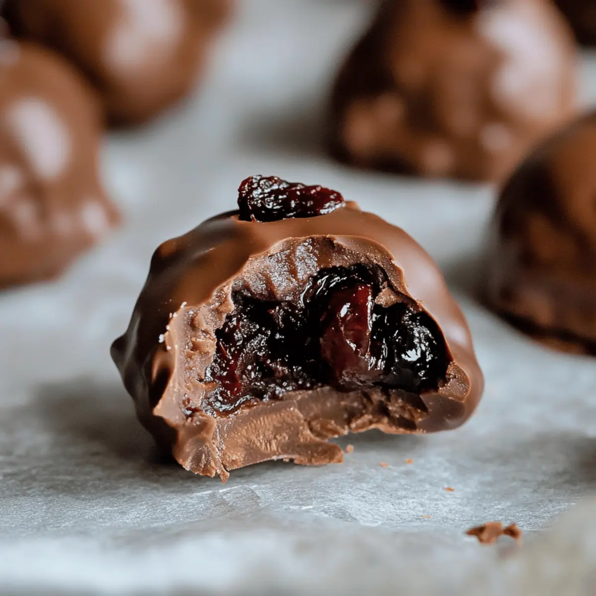 Jump to Recipe Print RecipeYou know that moment when you’re about to take a bite of something that looks and smells divine, and all your worries begin to fade? That’s exactly how you’ll feel with these Cherry Bourbon Chocolate Truffles. Combining luscious chocolate with the delightful tartness of dried cherries and a splash of bourbon, this recipe transforms simple ingredients into exquisite bites that are perfect for sharing—especially on Valentine’s Day. Not only are they a breeze to whip up, but these gluten-free treats also make an impressive handmade gift that any chocolate lover would cherish. Curious about how to create your own melt-in-your-mouth indulgence? Let’s dive into the sweetness of these truffles! Why are these truffles irresistible? Decadent Flavor: Each Cherry Bourbon Chocolate Truffle bursts with a perfect fusion of rich chocolate and tart cherries, enhanced by a warming splash of bourbon. Easily Made at Home: No advanced skills are needed; just follow simple steps to impress friends and family. Gluten-Free Delight: Enjoy these treats without worrying about gluten, making them suitable for various dietary needs. Great for Gifting: Perfect for anyone who loves chocolate, these truffles make an elegant gift for Valentine’s Day or any occasion. If you’re looking for more sweet ideas, try out Yogurt Chocolate Chip or a delightful Bake Chocolate Cheesecake. Customizable Touch: Adjust the recipe with different nuts or chocolate types to fit your taste buds! Cherry Bourbon Chocolate Truffles Ingredients For the Truffle Mixture • Dried Cherries – Adds sweetness and texture; you can substitute with raisins or dried blueberries for variation. • Bourbon – Introduces depth and a warming flavor; omit if you prefer a non-alcoholic version. • Heavy Cream – Provides richness and helps set the chocolate; full-fat coconut milk works for a dairy-free option. • Salted Butter – Enhances flavor and texture; ghee is a great dairy-free alternative, or you can omit it if needed. • Milk Chocolate – For a sweet truffle filling; dark or semi-sweet chocolate can be used for a richer flavor. For the Coating • Dark Chocolate – Used for coating, adds a contrasting flavor; melt carefully to avoid scorching during the process. Feel free to create your own Cherry Bourbon Chocolate Truffles! These indulgent treats are sure to impress your loved ones, especially on Valentine’s Day. Step‑by‑Step Instructions for Cherry Bourbon Chocolate Truffles Step 1: Soak Cherries In a small bowl, combine 1/4 cup of chopped dried cherries with a splash of bourbon. Allow them to soak for about 30 minutes, which will help the cherries absorb the bourbon’s rich flavor. You’ll know they are ready when they’re plump and fragrant. Step 2: Heat Cream Set up a double boiler on your stovetop and gently heat heavy cream (or coconut milk) until it’s hot but not boiling; this should take about 5-7 minutes. Stir occasionally and keep an eye on it. Once done, you should see steam rising but no bubbles popping on the surface. Step 3: Melt Chocolate Add 6 ounces of milk chocolate and 2 tablespoons of salted butter to the hot cream. Stir the mixture continuously until both the chocolate and butter are fully melted and combined, which should take about 2-3 minutes. You’re looking for a silky texture and a smooth, glossy finish. Step 4: Combine Ingredients Remove the bowl from heat and fold in the bourbon-soaked cherries into the chocolate mixture. Let the mixture cool to room temperature, about 15-20 minutes, until it thickens slightly but remains pourable. This is the filling for your Cherry Bourbon Chocolate Truffles. Step 5: Form Truffles Using a small cookie dough scoop, portion out the chocolate mixture and place each scoop onto a lined baking sheet. Once shaped, refrigerate them for at least 2-3 hours, or until they are firm enough to handle without losing their shape. Step 6: Prepare Coating While the truffles are chilling, prepare the coating by melting 8 ounces of dark chocolate in a double boiler or microwave. If using the microwave, heat it in 30-second intervals, stirring each time until fully melted and smooth. This should take about 1-2 minutes total. Step 7: Coat Truffles Once the truffle centers are firm, dip each one into the melted dark chocolate using a fork or dipping tool. Allow any excess chocolate to drip off before placing them back onto the lined baking sheet. Optionally, you can press a dried cherry onto the top for added decoration. Step 8: Chill Again Return the coated truffles to the refrigerator and let them chill for at least 6 hours before serving. This final chilling time allows the chocolate to set properly, resulting in beautifully glossy Cherry Bourbon Chocolate Truffles that are ready to indulge! Make Ahead Options These Cherry Bourbon Chocolate Truffles are perfect for busy home cooks looking to save time! You can prepare the truffle mixture up to 24 hours in advance by following steps 1 to 4 and then refrigerate it in an airtight container. This allows the flavors to meld beautifully while keeping the truffles just as delicious when finished. Then, when you’re ready to complete the recipe, simply scoop and chill them (step 5) for about 2-3 hours, followed by coating them in melted dark chocolate (steps 6 and 7). By prepping ahead, you’ll have gourmet truffles ready to impress, with minimal effort just before serving—ideal for those hectic evenings or special occasions! Expert Tips for Cherry Bourbon Chocolate Truffles Soak Carefully: Avoid over-soaking the dried cherries to prevent an overpowering bourbon flavor; 30 minutes is ideal. Chill Time Matters: Don’t rush the chilling process after shaping the truffles; this ensures they hold their shape when coated. Chocolate Melting: Melt chocolate in smaller batches to maintain smoothness; refrigerate leftover chocolate for future use. Texture Check: If the chocolate mixture is too thin whi