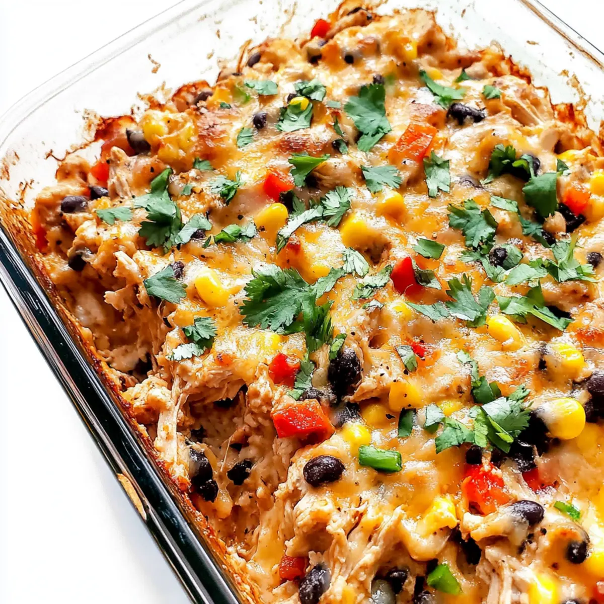 Jump to Recipe Print RecipeAs I stood in my kitchen, the rich, savory aroma of spices filled the air, instantly transporting me to a cozy Mexican taqueria. This Easy Gluten-Free Chicken Burrito Casserole manages to marry comfort and health, making it a weeknight hero for those of us craving something satisfying without the guilt of fast food. Packed with hearty chicken, fiber-rich black beans, and wholesome brown rice, it’s a dish that not only delights the taste buds but also fuels our bodies. The best part? It comes together in no time, allowing you to savor that first bite more quickly. So grab your favorite casserole dish and get ready to whip up a meal that promises to be a hit with the whole family—what toppings will you choose to make it your own? Why Is This Casserole a Game Changer? Easy Preparation: This delicious Chicken Burrito Casserole comes together effortlessly, perfect for busy weeknights when time is of the essence. Flavor-Packed: Each bite bursts with savory goodness from the blend of spices, chicken, and gooey cheese, offering a delightful twist on traditional burritos. Healthy Ingredients: The use of black beans, brown rice, and lean chicken ensures a hearty meal that’s also rich in nutrients, keeping your family satisfied without the fast-food guilt. Versatile Toppings: Make it your own! Top it off with fresh cilantro, creamy avocado, or zesty salsa, perfect for customizing to your family’s tastes. Leftover Friendly: Enjoy the goodness for days! Store leftovers effortlessly, and enjoy a quick meal that’s just as delectable on the second day—as seen in my Hawaiian Chicken Salad! Chicken Burrito Casserole Ingredients For the Base Finely Diced Onion – Adds aroma and sweetness to the base. Substitute with shallots for a milder taste. Diced Red Bell Pepper – Provides color and sweetness. Any color bell pepper can be used for similar sweetness. Uncooked Parboiled Long-Grain Brown Rice (or Long Grain White Rice) – The starch forms the casserole base and contributes to texture. White rice can shorten baking time. Fajita Seasoning – Adds robust flavor. Use homemade seasoning or substitute with taco seasoning. Cayenne Pepper (optional) – Adds heat and spice. Omit if a milder flavor is preferred. Frozen Corn Kernels – Adds sweetness and texture. Substitute with fresh corn when in season. Low Sodium Black Beans – Provides protein and fiber. Any canned beans can be used after rinsing. Shredded Chicken – The main protein source. Use rotisserie chicken for quick prep or cook and shred your own. Reduced Sodium Chicken Broth – Keeps the casserole moist. Vegetable broth can be used as an alternative for a vegetarian version. Mild Green Chiles – Adds subtle heat and flavor. Omit if a mild casserole is desired. Olive Oil – Helps to blend flavors. Can be replaced with cooking spray or omitted for a lower-fat option. Tomato Paste – Contributes to depth of flavor and moisture. Substitute with salsa for added flavor. For the Topping Shredded Monterey Jack Cheese – Provides creaminess and richness. Substitute with cheddar or a dairy-free cheese for a lactose-free option. This Chicken Burrito Casserole is not only easy to prepare but also packed with flavors that your family will love! Step‑by‑Step Instructions for Easy Gluten-Free Chicken Burrito Casserole Step 1: Preheat the Oven Begin by preheating your oven to 400°F (200°C). As the temperature rises, it creates the perfect environment for your Easy Gluten-Free Chicken Burrito Casserole to bake evenly and develop delightful flavors. Step 2: Combine the Base Ingredients In a large baking dish, combine the finely diced onion, diced red bell pepper, uncooked parboiled brown rice, fajita seasoning, and optional cayenne pepper. Stir these ingredients well until everything is evenly mixed, creating a colorful and aromatic base for your casserole. Step 3: Mix the Wet Ingredients In a separate bowl, whisk together the reduced sodium chicken broth, mild green chiles, tomato paste, and olive oil until fully combined. Pour this mixture into the baking dish over the rice and veggies, ensuring that each grain is coated with the flavorful liquid. Step 4: Add the Protein and Beans Next, fold in the shredded chicken, low sodium black beans, and frozen corn kernels into the mixture. Stir thoroughly to ensure that all the hearty ingredients are well combined, creating a protein-packed filling for your Chicken Burrito Casserole. Step 5: Bake the Casserole Cover the baking dish tightly with aluminum foil and place it in the preheated oven. Bake for 65-70 minutes, checking occasionally to ensure the liquid is fully absorbed and the rice is tender. You’ll know it’s done when the mixture is bubbly and the rice is soft. Step 6: Add the Cheese Topping Carefully remove the foil and sprinkle the shredded Monterey Jack cheese evenly over the top of the casserole. Return it to the oven for an additional 5-10 minutes, or until the cheese is melted and golden brown, creating a deliciously gooey finish. Step 7: Cool and Serve Once baked to perfection, take the casserole out of the oven and let it cool slightly for about 5 minutes. Serve your Easy Gluten-Free Chicken Burrito Casserole warm, garnished with desired toppings such as fresh cilantro, sliced green onion, zesty salsa, and creamy avocado for a personalized touch. Expert Tips for Chicken Burrito Casserole Check Liquid Level: Ensure all liquid is absorbed before serving to avoid a soupy casserole and achieve that perfect texture. Use Parboiled Rice: Stick with parboiled rice for the best results; if using white rice, remember to check for doneness sooner to prevent mushiness. Monitor Cooking Time: When using leftover cooked chicken, skip the long bake time—just mix and heat through to keep your casserole juicy. Customize Your Spice: Adjust the cayenne pepper according to your family’s taste; start with a little and add more if your crowd loves a spicy kick in thi