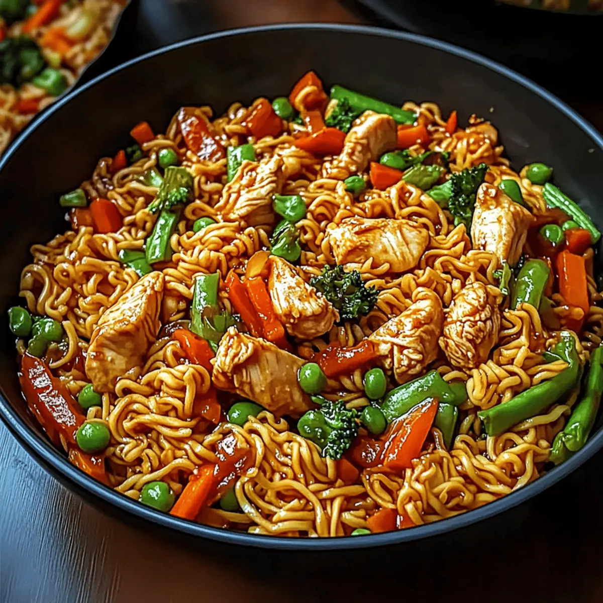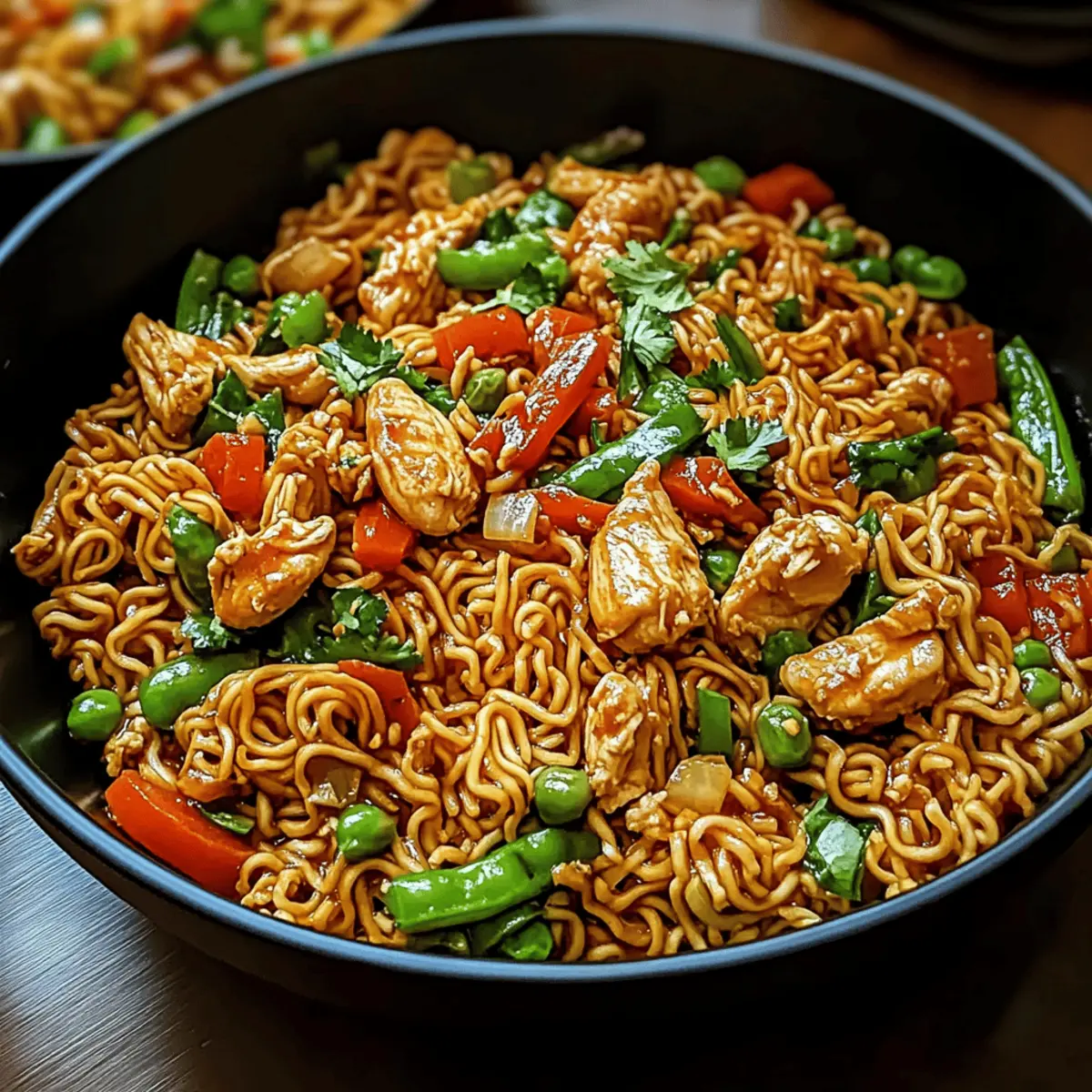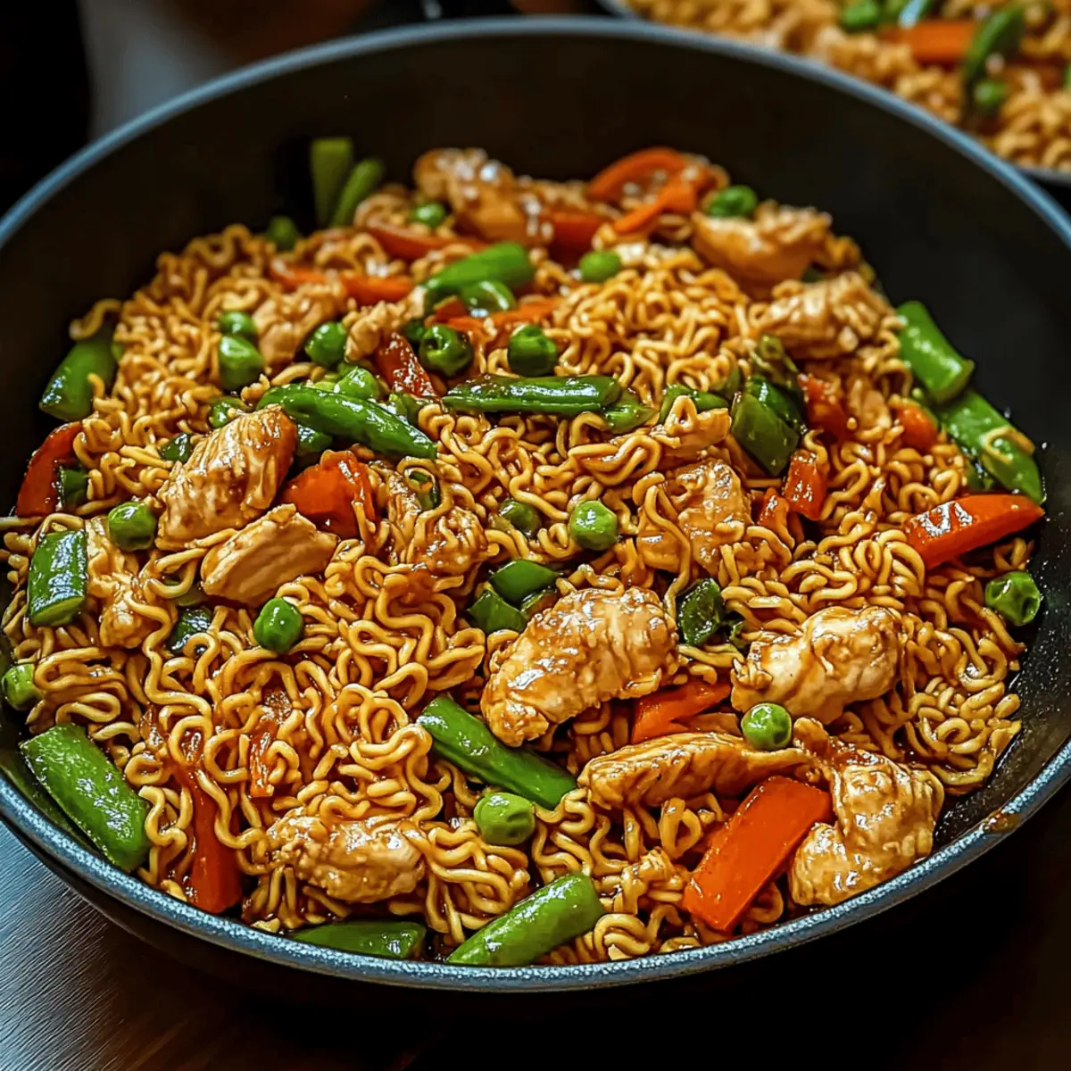 Jump to Recipe Print RecipeAs the aromas of sizzling garlic and fresh ginger fill my kitchen, it feels like a warm hug on a busy night. Enter my Quick and Easy Chicken Ramen Stir Fry, a delightful fusion of flavors perfect for anyone who craves a homemade meal without the fuss. In less than 30 minutes, you can whip up a dish that’s not only customizable to suit your family’s tastes but also brimming with nourishing ingredients. Juicy chicken, crisp vegetables, and ramen noodles create a satisfying bowl that everyone will love. Whether you prefer a spicy kick or a milder touch, this recipe allows endless variations to keep things exciting. How would you personalize your stir-fry? Let’s dive in! Why is this Chicken Ramen Stir Fry special? Quick preparation: With just 30 minutes, you can enjoy a homemade meal that’s perfect for busy weeknights. Customizable flavors: Tailor it to your family’s preferences by swapping proteins and veggies; the possibilities are endless! Nourishing ingredients: Packed with protein and vitamins, this dish fuels your body and satisfies your palate. Comforting texture: The combination of tender chicken, crisp vegetables, and chewy ramen noodles creates a delightful medley in each bite. Crowd-pleaser: Whether it’s a family dinner or gathering with friends, everyone will be coming back for seconds of this flavorful dish! If you’re in search of more quick, satisfying meals, check out my Hawaiian Chicken Salad or Sticky Chicken Rice. Chicken Ramen Stir Fry Ingredients For the Noodles • Ramen Noodles – The base of this dish provides structure and comfort; remember to discard the seasoning packets for a fresher flavor. For the Protein • Boneless, Skinless Chicken Thighs – A tender and flavorful main protein source; feel free to substitute with chicken breast, turkey, beef, shrimp, or tofu for a vegetarian version. For the Vegetables • Red Bell Pepper – Adds vibrant color and sweetness; you can swap it out with yellow or green peppers for variety. • Snap Peas – They offer a fresh crunch; consider using broccoli or bok choy as other tasty alternatives. • Carrot – This brings a lovely sweetness and crunch; zucchini or other vegetables can also work beautifully. For the Aromatics • Garlic – A key ingredient that enhances flavor; minced garlic adds depth to the dish. • Ginger – This aromatic root adds a zesty kick; fresh ginger is preferred for its strong flavor. • Green Onions – These bring a fresh touch; remember to use the white parts when cooking and save the green parts for garnishing. For the Sauce • Soy Sauce – This adds saltiness and depth; a low-sodium version can keep your meal lighter without sacrificing taste. • Oyster Sauce – A great umami enhancer; you can omit this for a vegetarian option if desired. • Sesame Oil – Adds richness and nutty flavor; feel free to substitute with another oil if that’s what you have on hand. • Sugar – Balances the saltiness of the soy sauce; honey or maple syrup can be delightful alternatives. • White Pepper – Provides a mild heat; if you don’t have it, black pepper can work as a substitute. Take this quick and tasty Chicken Ramen Stir Fry on a culinary adventure by mixing and matching your favorite ingredients! Step‑by‑Step Instructions for Chicken Ramen Stir Fry Step 1: Boil the Noodles Start by bringing a large pot of water to boil over high heat. Once the water reaches a rolling boil, add the ramen noodles and cook them for about 2 minutes—just until slightly undercooked. This prevents sogginess later. Once done, drain the noodles and set them aside while you prepare the rest of your Chicken Ramen Stir Fry. Step 2: Prepare the Sauce In a mixing bowl, whisk together soy sauce, oyster sauce, sesame oil, sugar, and white pepper until the sugar dissolves. This flavorful blend will be your stir-fry sauce, enhancing the Chicken Ramen Stir Fry with umami richness. Set the bowl aside, as you will add this sauce to your stir-fry later. Step 3: Cook the Chicken Heat 1 tablespoon of vegetable oil in a large wok or skillet over high heat until shimmering. Add the boneless, skinless chicken thighs, cooking for about 5–6 minutes until they are golden brown and fully cooked. Stir frequently to ensure even cooking. Once done, remove the chicken from the pan and keep it warm while you sauté the vegetables. Step 4: Stir-Fry the Vegetables In the same hot pan, add the remaining tablespoon of vegetable oil. Toss in the sliced red bell pepper, snap peas, and carrot, stir-frying for 2–3 minutes until they are crisp-tender. Take a moment to appreciate the colorful vibrancy in the pan as the vegetables start to soften—this will bring exciting texture to your Chicken Ramen Stir Fry. Step 5: Add Aromatics Now, add minced garlic, grated ginger, and the white parts of the green onions to the pan. Stir-fry these aromatics for about 30 seconds, allowing their fragrant flavors to envelop the vegetables. You’ll notice a lovely aroma fill your kitchen—this is the magic that brings your Chicken Ramen Stir Fry to life. Step 6: Combine Everything Return the cooked chicken to the pan with the sautéed vegetables. Then, gently add the reserved ramen noodles and your prepared sauce, stirring well to combine all ingredients. Stir-fry everything together over medium-high heat for an additional 2–3 minutes, ensuring everything is heated through and the noodles are coated in the savory sauce. Step 7: Garnish and Serve Once everything is hot and well-mixed, remove the pan from the heat. Transfer your delicious Chicken Ramen Stir Fry to serving bowls and garnish with the green parts of the green onions for a fresh touch. Serve hot, and let everyone dig into this flavorful fusion dish that’s bound to satisfy even the busiest weeknight cravings! Chicken Ramen Stir Fry Variations Feel free to get creative with your Chicken Ramen Stir Fry and make it your own! Each option invites you to
