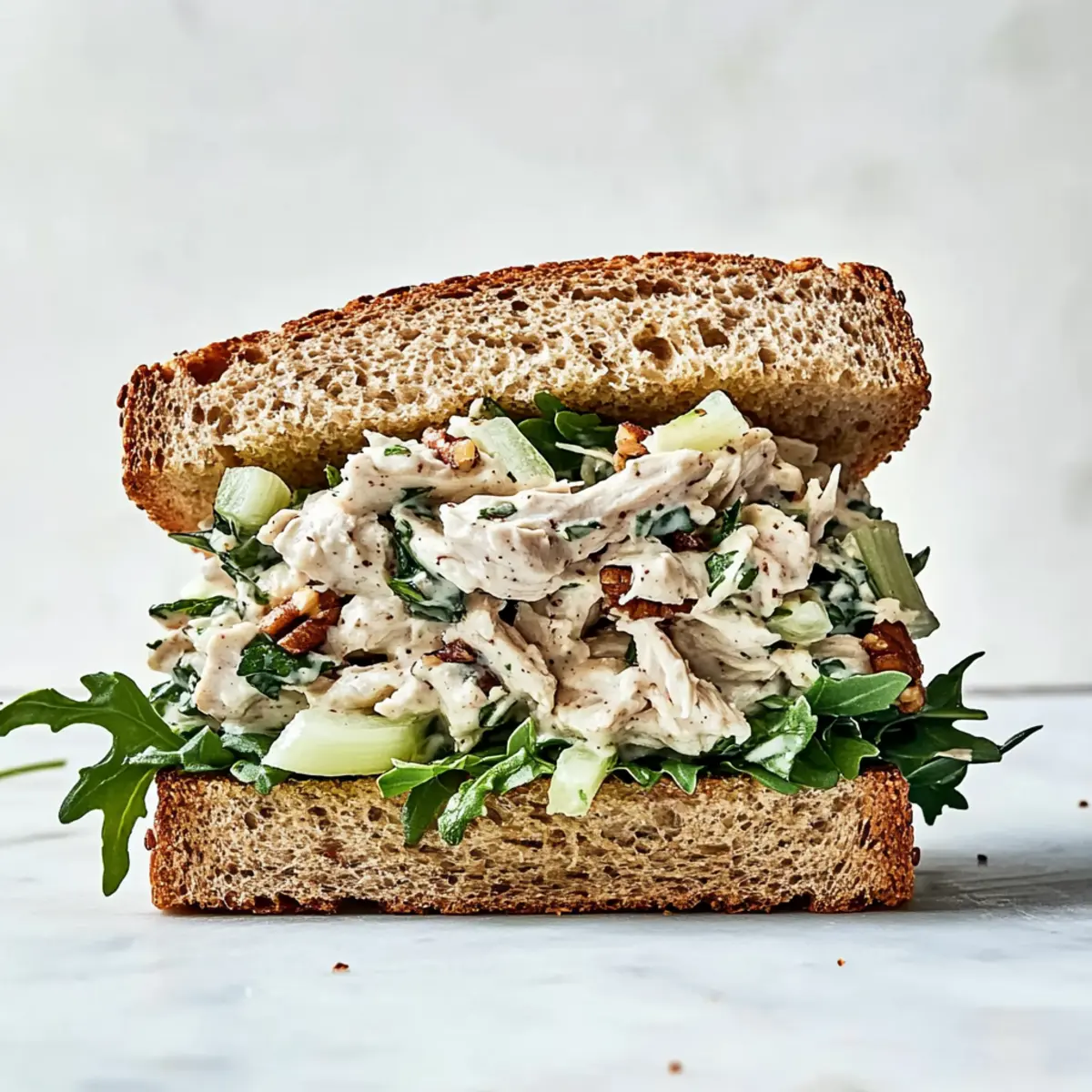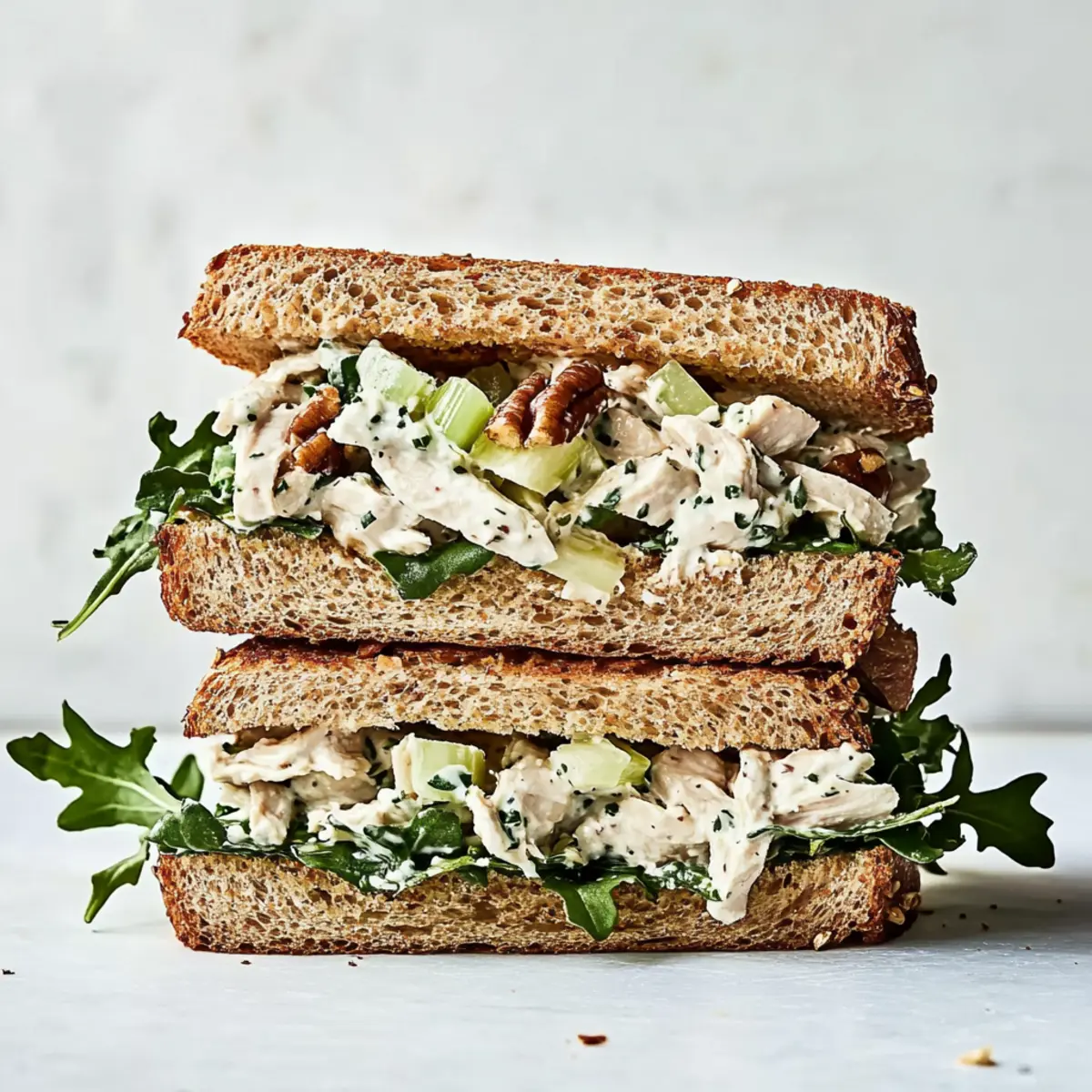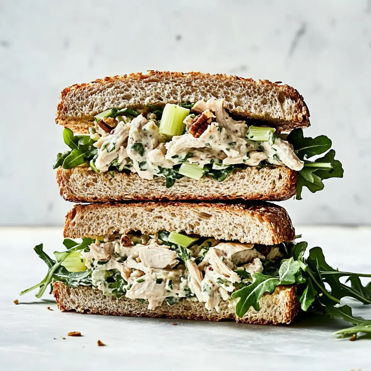 Jump to Recipe Print RecipeThe aroma of freshly chopped herbs and moist chicken fills my kitchen, evoking memories of sunny picnics and warm gatherings. If you’re searching for a go-to chicken salad recipe that is as easy to make as it is delicious, you’ve landed in the right spot! This vibrant dish combines tender shredded chicken with zesty mayonnaise and crisp veggies, creating a satisfying blend perfect for hearty sandwiches or refreshing salads. Not only is it high in protein and incredibly customizable, but it’s also a quick fix that keeps me away from fast food temptations. Whether you’re preparing a simple lunch or hosting a delightful brunch, this chicken salad will surely impress. Ready to dive into the recipe that will elevate your homemade meal game? Let’s get started! Why Is This Chicken Salad So Irresistible? Simplicity: This recipe requires minimal prep time, making it a breeze to whip up on busy days. Customizable: Switch up ingredients to suit your taste. Add walnuts, grapes, or even swap the mayo for Greek yogurt! Hearty Meal: With protein-rich chicken and a satisfying crunch, it’s perfect for lunches or as a light dinner. Versatile Serving Options: Enjoy it in a sandwich, on a bed of greens, or in lettuce wraps for a fresh twist. Don’t miss our refreshing Hawaiian Chicken Salad or the zingy Buffalo Chicken Salad for a flavor adventure! Crowd-Pleasing Flavor: Each bite offers a delicious explosion of creamy, savory goodness, guaranteed to satisfy everyone at the table. Chicken Salad Recipe Ingredients For the Chicken Base • Cooked Chicken – Essential protein base; store-bought rotisserie chicken is a convenient option that saves time. For the Creamy Mixture • Mayonnaise – Adds creaminess and moisture; for a healthier alternative, consider Greek yogurt. • Dijon Mustard – Provides a tangy flavor kick; substitute with yellow mustard if needed. For Freshness and Crunch • Celery – Adds crunch and freshness; dice finely for better texture in your chicken salad recipe. • Lemon Juice and Zest – Brightens the flavors; using fresh lemons will enhance the overall taste. • Pecans – Optional, for additional crunch; can be omitted for nut allergies. • Parsley – Fresh herb for a burst of flavor; substitute with dill for a different aroma. For Serving • Baby Arugula – Optional garnish for serving; lettuce or spinach can also be used. • Whole Wheat/Oatmeal Bread – Base for sandwiches; feel free to use any bread of your choice for versatility. Step‑by‑Step Instructions for Chicken Salad Recipe Step 1: Prepare Chicken Begin by cooking your chicken—poaching is a great method, or you can opt for a store-bought rotisserie chicken for ease. Once cooked, allow the chicken to cool completely for about 15 minutes; this prevents a soggy chicken salad. Shred the cooled chicken into bite-sized pieces using two forks or your hands, ensuring you have a tender base for your chicken salad recipe. Step 2: Cut Vegetables While the chicken is cooling, take the time to finely dice your celery and chop the fresh parsley. Aim for small, even pieces for a better texture in the chicken salad. The celery adds that delightful crunch, while the parsley provides freshness. Set the chopped vegetables aside, ready to combine them with the other ingredients shortly. Step 3: Mix Ingredients In a large mixing bowl, combine the shredded chicken, mayonnaise, and Dijon mustard. Add a dash of salt and pepper to taste, then fold in the diced celery, optional pecans, chopped parsley, lemon zest, and lemon juice. Use a spatula to gently stir everything together until well combined, ensuring each ingredient is evenly distributed for rich flavor in your chicken salad recipe. Step 4: Assemble Sandwiches Take four slices of your chosen bread and evenly divide the chicken salad mixture onto them, spreading it all the way to the edges for maximum flavor. Top each portion with a generous handful of baby arugula or your preferred greens. Cap each sandwich with the remaining slices of bread, pressing down gently to ensure they hold together nicely. Step 5: Serve Finally, cut each sandwich in half—diagonal slices offer a pretty presentation! Optionally, serve your chicken salad sandwiches with a side of fresh fruit salad or on a bed of crisp lettuce for a light, refreshing meal. This chicken salad is sure to delight, whether at lunch or as part of a cozy brunch spread! Expert Tips for Chicken Salad Cool Chicken First: Always ensure the chicken is thoroughly cooled before mixing; this helps prevent a soggy chicken salad. Season to Taste: Don’t be afraid to adjust the seasoning! Fresh herbs can enhance flavors, so taste as you go. Texture Matters: Dice celery finely for maximum crunch and better integration into your chicken salad recipe. Add Sweetness: For a delightful twist, mix in grapes or dried cranberries for a burst of sweetness. Leftover Storage: Store any leftover chicken salad in an airtight container in the fridge for up to 3-5 days. What to Serve with Moist & Flavorful Chicken Salad for Sandwiches Elevate your meal experience with these delicious pairings that will perfectly complement your delightful chicken salad. Crispy Potato Chips: The salty crunch of potato chips provides a satisfying contrast to the creamy chicken salad. Enjoy them on the side for a delightful textural combination. Fresh Fruit Salad: A medley of seasonal fruits adds a burst of sweetness, balancing the savory flavors. Think juicy strawberries, refreshing melons, and tangy citrus to brighten every bite. Vegetable Crudités: Crisp, raw veggies such as carrots and bell peppers make a refreshing addition. They offer a nice crunch and can be dipped into leftover mayo or hummus for extra flavor. Whole Grain Crackers: These pair beautifully for a snack or appetizer, providing a hearty crunch that makes every bite of chicken salad feel indulgent. They’re perfect for scooping! Classic Coleslaw: A cris