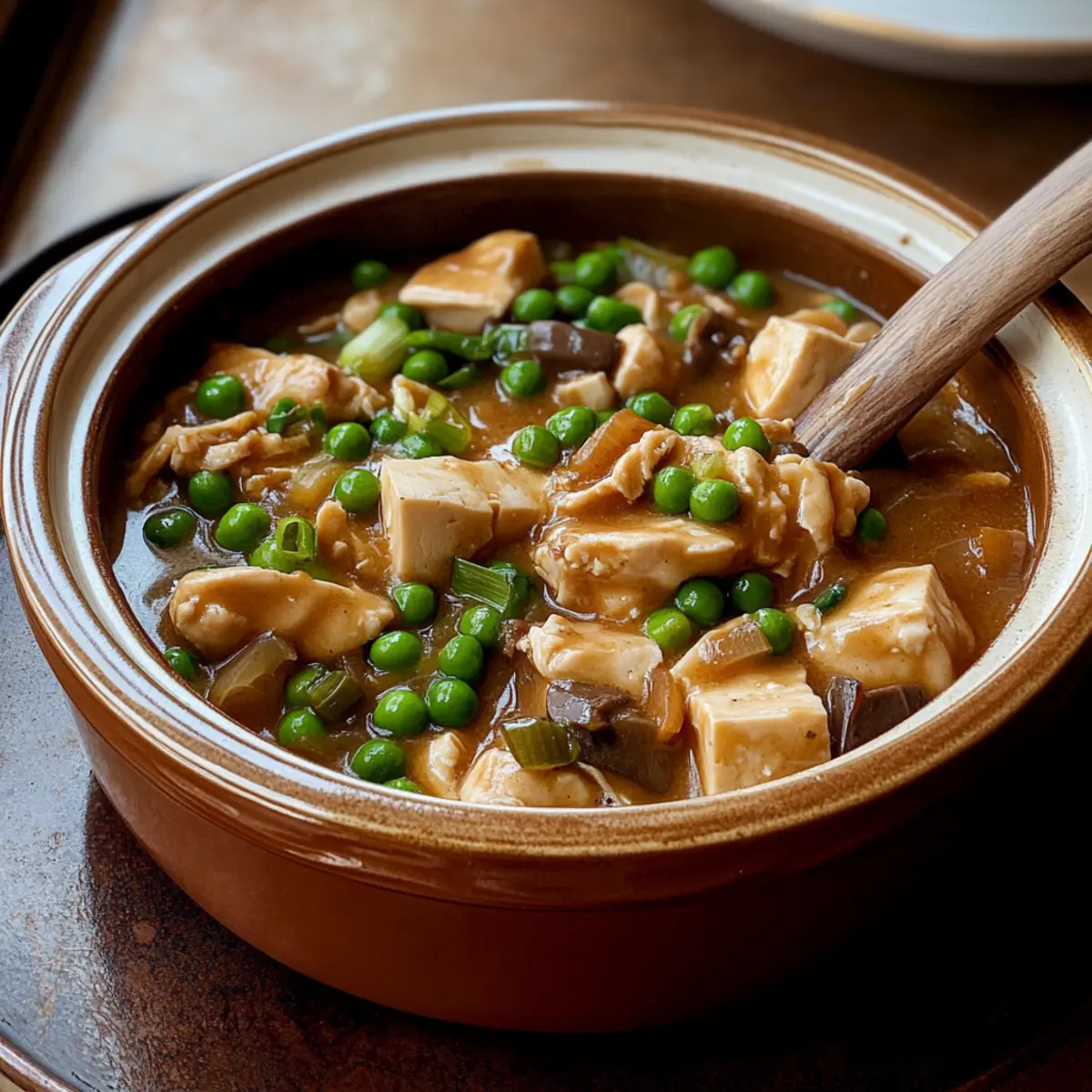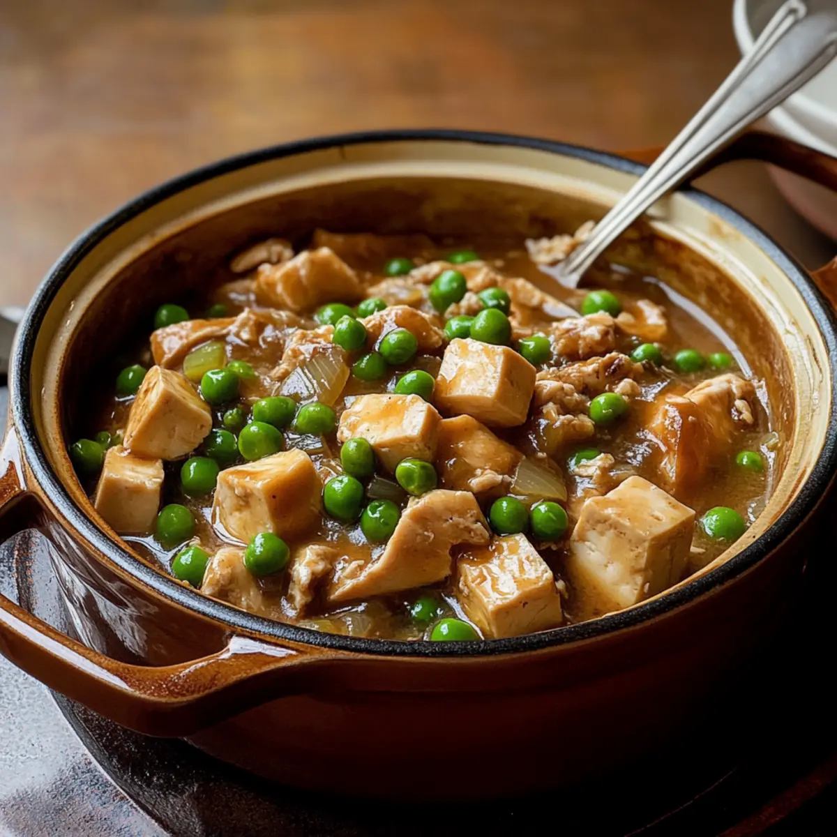 Jump to Recipe Print RecipeWalking into my kitchen, a wave of comforting aromas unfolds, enticing me with the promise of a delicious meal. This Comforting Chicken & Soft Tofu Casserole is a gem from Chinese cuisine, perfect for cozy nights and quick family dinners. The magic lies in the silky texture of soft tofu mingling harmoniously with tender chicken and a savory sauce that’ll warm your soul. Best of all, it’s a breeze to whip up in just one pot—whether you choose a clay pot or a Dutch oven, you’ll find this dish becomes a delightful centerpiece on your table. Not only does it come together quickly, but it’s also incredibly versatile, allowing for easy adaptations like adding dried salted fish for a flavor boost. Want to dive into this heartwarming recipe that’s a favorite among home chefs? Let’s get cooking! What makes this casserole so comforting? Comforting, the Chicken & Soft Tofu Casserole is the ultimate dish to wrap you in warmth. Versatile, you can easily adjust the ingredients to suit your taste—try adding some colorful bell peppers or a hint of dried salted fish for added flavor! Quick to prepare, it takes just a short time from prep to plate, making it perfect for weeknight dinners. Flavor-packed, the combination of savory sauces and tender chicken pairs beautifully with the silky tofu, creating a satisfying harmony that keeps you coming back for more. Serve it on a bed of rice or with a light cucumber salad for an inviting meal your family will adore! Chicken & Soft Tofu Casserole Ingredients For the Chicken • Diced Boneless Skinless Chicken Thighs – This hearty protein adds moisture; feel free to substitute with chicken breast or leave it out for a vegetarian dish. • Water – Essential for marinating and tenderizing the chicken. For the Sauce • Cornstarch – Thickens the sauce beautifully; arrowroot or tapioca starch works as a perfect substitute. • Vegetable Oil – A neutral oil for cooking; can be swapped with canola or grapeseed oil. • Oyster Sauce – Brings umami and deep flavors, or use soy sauce for a vegetarian alternative. • Chicken Stock – Serves as a rich sauce base; replace with vegetable broth if making a vegetarian version. • Light Soy Sauce – Adds necessary saltiness; tamari is a great gluten-free replacement. • Dark Soy Sauce – Enhances color and depth; using this is optional but highly recommended. • Sugar – Balances out flavors perfectly; honey can replace it or simply omit for low-sugar diets. • Sesame Oil – Infuses a nutty flavor; consider omitting if there are allergy concerns. For the Aromatics • Ginger – Introduces a warming spice; fresh ginger is preferred, but you can use ground ginger in a pinch. • Scallions – Adds freshness and crunch; use both white and green parts for best flavor. • Garlic – Essential for a fragrant base; garlic powder can substitute if fresh isn’t on hand. • Shaoxing Wine – Elevates the dish’s flavor; a dry sherry can be a substitute or omit for a non-alcoholic version. For the Vegetables • Dried Shiitake Mushrooms – Adds rich umami flavor; feel free to use fresh mushrooms if necessary. • Hot Water – Important for soaking the mushrooms and assembling the dish. • Soft Tofu – The star of this recipe, brings a silky texture; silken tofu can be used instead. • Frozen Peas – Offers a burst of sweetness and color; fresh peas can also work well. For Seasoning • Salt – Elevates flavors; adjust according to taste. Step‑by‑Step Instructions for Chicken & Soft Tofu Casserole Step 1: Marinate Chicken In a bowl, combine diced boneless skinless chicken thighs with water, cornstarch, vegetable oil, and oyster sauce. Mix well to coat the chicken evenly, ensuring it’s tender and flavorful. Let it marinate for at least 15 minutes to allow the flavors to meld while you prepare the other ingredients. Step 2: Prepare Mushrooms Rinse the dried shiitake mushrooms under cold water, then soak them in hot water for at least 2 hours (or overnight for best results). Once softened, slice the mushrooms thinly, ensuring they’re ready to add a rich umami flavor to your Chicken & Soft Tofu Casserole. Step 3: Cube Tofu Carefully cut the soft tofu into ¾ inch cubes and lay them gently on a plate. This preparation helps maintain their delicate texture for the casserole and ensures they will absorb the delicious flavors of the sauce without breaking apart during cooking. Step 4: Create Sauce In a separate bowl, whisk together the chicken stock, sugar, oyster sauce, light soy sauce, dark soy sauce, and sesame oil until fully combined. This sauce will form the flavorful base of your Chicken & Soft Tofu Casserole, enhancing the overall dish with deep savory notes. Step 5: Stir-Fry Chicken Heat a non-stick wok over medium-high heat and add a splash of vegetable oil. Once hot, stir-fry the marinated chicken for about 1 minute, or until it’s opaque and starts to brown lightly. Remove the chicken from the wok and set it aside to keep it juicy and tender. Step 6: Cook Aromatics In the same wok, add a bit more vegetable oil and toss in grated ginger and the white parts of scallions. Sauté for 1 minute until fragrant, then add minced garlic, stirring constantly to prevent burning. This will build a foundational aromatic profile for the casserole. Step 7: Add Mushrooms and Sauce Increase the heat to high and add the soaked shiitake mushrooms along with Shaoxing wine. Stir-fry for 1 minute, then pour in the sauce mixture and add the cornstarch slurry to thicken the sauce. Stir continuously until the sauce is bubbling and becomes glossy, about 2-3 minutes. Step 8: Combine Tofu and Chicken Gently fold the drained soft tofu cubes and the stir-fried chicken into the bubbling sauce. Mix carefully to coat the tofu and chicken without breaking the tofu. Heat them together for a few minutes, allowing them to absorb the collective flavors of the Chicken & Soft Tofu Casserole. Step