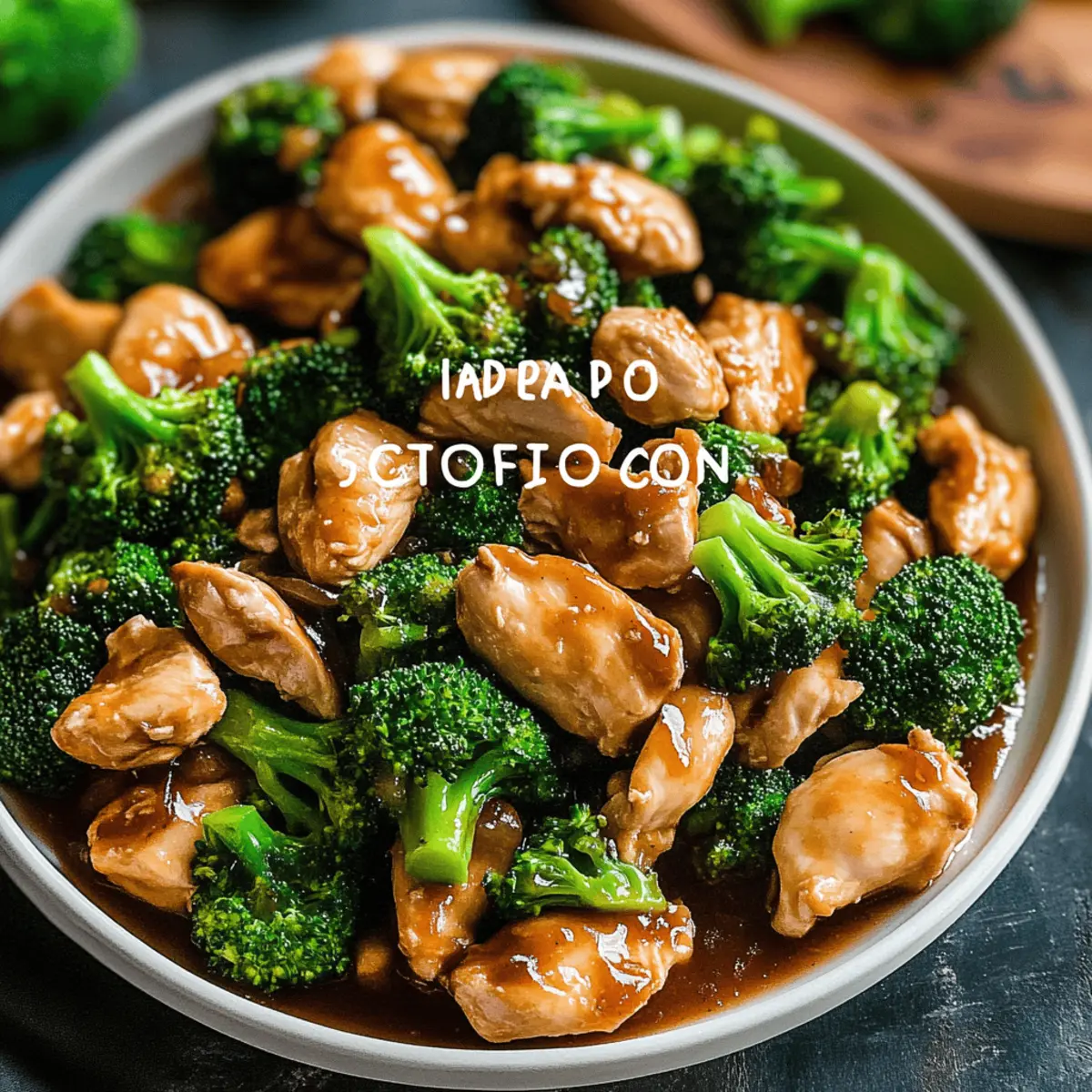 Jump to Recipe Print RecipeAs I was chopping bright green broccoli the other day, the vibrant color took me back to countless meals shared with family, where the aroma of stir-fry would have everyone gathering around the table. This Healthy Chinese Chicken and Broccoli Recipe captures that nostalgic essence perfectly. It’s not just a quick, nutritious dish—it’s a celebration of flavors that can easily fit into your busy weeknight routine. In just a matter of minutes, you can whip up a colorful, satisfying meal that offers wholesome ingredients without sacrificing taste. Plus, with options to swap in your favorite proteins and veggies, you can make this dish uniquely yours. Ready to bring a burst of flavor back to your kitchen? Let’s dive into the details! Why Choose This Healthy Stir-Fry? Flavorful, the zesty combination of garlic and ginger elevates the dish, turning simple chicken and broccoli into a culinary delight. Versatile, you can easily swap proteins or add in your favorite veggies like bell peppers or carrots, making it adaptable to your tastes. Nutrient-Packed, this meal is loaded with vitamins and protein, catering to health-conscious folks seeking a delicious option. Quick Cooking, taking just 20 minutes from prep to plate, it’s perfect for hectic weeknights. For more delicious and healthy meal ideas, check out my Crunchy Broccoli Salad and Hawaiian Chicken Salad recipes that are equally satisfying! Chinese Chicken and Broccoli Ingredients For the Chicken Chicken Breast – The primary protein source; choose skinless for a healthier option. Soy Sauce – Adds a rich umami flavor for authentic taste; opt for low-sodium for a lighter version. Cornstarch – Helps thicken the sauce for a smooth texture; can be swapped with arrowroot powder if needed. Garlic – Fresh garlic enhances flavor significantly; it’s more potent than powdered forms. Ginger – Fresh ginger provides warmth and depth to the dish; don’t substitute with ground ginger for the best aroma. For the Vegetables Broccoli – A nutrient powerhouse that adds crunch; both fresh and frozen work well. Optional Vegetables – Consider adding colorful bell peppers or vibrant carrots to boost nutrition and visual appeal! For Stir-Frying Vegetable Oil – Ideal for frying; replace with sesame oil for a richer flavor experience. This Chinese Chicken and Broccoli recipe not only delivers on taste but also allows for easy substitutions, ensuring you can cater it to your family’s preferences! Step‑by‑Step Instructions for Chinese Chicken and Broccoli Recipe Step 1: Prep the Ingredients Begin by preparing your ingredients for the Chinese Chicken and Broccoli recipe. Cut the chicken breast into bite-sized pieces, aiming for uniform pieces for even cooking. Chop the broccoli into florets and ensure you have them ready to go. Mince fresh garlic and ginger, as these aromatic ingredients will elevate your dish’s flavor. Step 2: Marinate Chicken In a mixing bowl, combine the chopped chicken, soy sauce, cornstarch, minced garlic, and ginger. Toss everything together until the chicken is well-coated in the marinade. Let the mixture sit for 10-15 minutes to allow the flavors to meld and penetrate the meat, resulting in tender, flavorful chicken when cooked. Step 3: Cook Chicken Heat a large pan or wok over medium-high heat and add a tablespoon of vegetable oil. Once the oil is hot and shimmering, add the marinated chicken in a single layer. Stir-fry the chicken for about 5-7 minutes, or until it turns golden brown and is cooked through. Make sure to stir frequently to achieve even cooking and avoid burning. Step 4: Add Broccoli With the chicken fully cooked, add the chopped broccoli to the pan. Immediately splash in a small amount of water; this will create steam to help cook the broccoli without losing its vibrant color. Stir-fry everything together for an additional 3-5 minutes, until the broccoli is bright green, tender yet still crisp, and all ingredients are well combined. Step 5: Finish the Sauce Taste the stir-fry and adjust the seasoning as necessary—add more soy sauce if you desire a saltier flavor. Ensure the sauce reaches your desired thickness, adding a bit more cornstarch mixed with water if needed for a velvety finish. Once everything is well combined, remove the pan from the heat, and your Chinese Chicken and Broccoli is ready to be served warm over steamed rice. Chinese Chicken and Broccoli Recipe Variations Feel free to get creative with this dish and make it your own! Each twist offers a new adventure in flavor and texture. Protein Swap: Substitute chicken with beef, shrimp, or tofu for a delightful twist on the classic. Extra Veggies: Add bell peppers, carrots, or snow peas for an extra crunch and boost of nutrition. Spicy Kick: Sprinkle in red pepper flakes or a drizzle of chili oil to fire up the flavor just before serving. Lean Option: Use skinless turkey breast instead of chicken to cut calories while keeping it hearty and satisfying. Creamy Addition: Stir in a spoonful of almond or peanut butter for a unique, creamy flavor that complements the savory sauce. Garlic Lovers: Enhance the aroma using roasted garlic instead of fresh; it adds a subtle sweetness that elevates the entire dish. Zesty Notes: Add a splash of citrus—like lemon or lime juice—just before serving for a bright, fresh finish that balances out the savory elements. For more delicious recipe ideas, consider trying my Sticky Chicken Rice for a fun take on flavors or whip up some Cheesy Chicken Enchiladas for a comforting meal your family will love! How to Store and Freeze Chinese Chicken and Broccoli Fridge: Store leftovers in an airtight container for up to 3 days. Reheat on the stovetop or in the microwave until heated through, ensuring the chicken remains juicy. Freezer: If freezing, place cooled portions in freezer-safe bags, removing as much air as possible. Enjoy within 2-3 months for best flavor and texture. Reheati