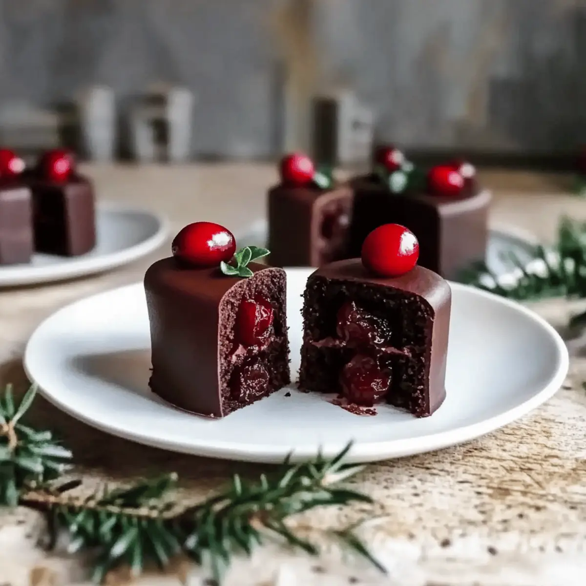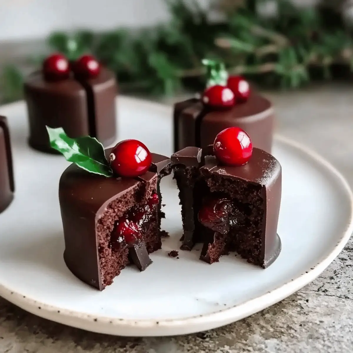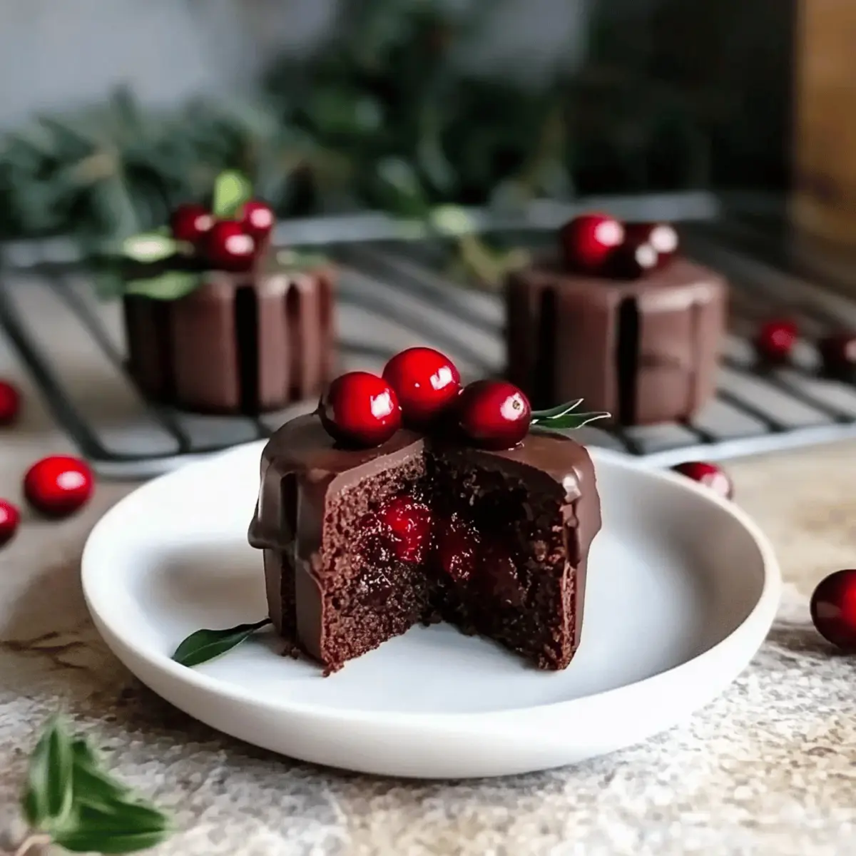 Jump to Recipe Print RecipeThe smell of sweet, tart cranberries mixed with rich chocolate brings back memories of the holiday season, when the kitchen buzzed with warmth and cheer. I’m excited to share my recipe for Vegan Chocolate Cranberry Mini Cakes—a perfect balance of festive flavors that will enchant your guests and family. Not only are these delightful mini cakes vegan, gluten-free, and nut-free, but they’re also a breeze to whip up, allowing you to spend more time enjoying the company of loved ones. Each bite offers a moist, tender crumb paired with a luscious cranberry chia jam that adds a whimsical touch to festive gatherings. Whether it’s a holiday party or a cozy family night, these mini cakes are bound to steal the spotlight. Ready to create something truly special? Let’s dive in! Why Choose These Mini Cakes? Irresistible Flavor Combination: The rich chocolate and tangy cranberry unite to create a taste sensation that’s perfect for any holiday gathering. Easy to Make: With simple ingredients and a straightforward process, these mini cakes are accessible for bakers of all skill levels. Diet-Friendly: As a vegan, gluten-free, and nut-free treat, they cater to various dietary needs, ensuring everyone can enjoy a slice! Festive Presentation: Beautifully stacked and drizzled with ganache, they make for a stunning centerpiece at your holiday table. Make Ahead Simplicity: You can bake them in advance and assemble later, allowing you to enjoy stress-free festivities. Pair them with a scoop of vegan ice cream or whipped coconut cream for an extra touch of indulgence! Chocolate Cranberry Christmas Mini Cakes Ingredients For the Cake Batter Quinoa Flour – Provides gluten-free structure; can be substituted with amaranth or a gluten-free flour blend. Brown Rice Flour – Contributes to a tender texture; can be replaced with other gluten-free options if necessary. Aquafaba – Acts as an egg replacer for moisture; use flax eggs for a different texture if preferred. Maple Syrup – Adds natural sweetness and moisture; agave nectar works as a liquid sweetener substitute. Rice Milk – Ensures the right moisture level; can be swapped with almond milk or your favorite plant-based milk. For the Chia Jam Filling Fresh or Frozen Cranberries – Used for the chia jam; dried cranberries aren’t suitable here. Chia Seeds – Thickens the chia jam; can be omitted if using cranberry puree instead. For the Ganache Topping Dark Chocolate – Provides a rich layer on top; ensure it’s vegan to match dietary needs. Vanilla Extract – Enhances the overall flavor; opt for pure vanilla for the best taste. Salt – Balances the sweetness and enhances flavors. These Chocolate Cranberry Christmas Mini Cakes are a joyful treat that promises to brighten any holiday celebration! Step‑by‑Step Instructions for Chocolate Cranberry Christmas Mini Cakes Step 1: Prepare Cake Batter In a large mixing bowl, combine 1 cup quinoa flour, 1 cup brown rice flour, and a pinch of salt. In another bowl, whisk together 1 cup of aquafaba until frothy, then blend in 1/2 cup maple syrup and 1/2 cup rice milk. Mix until well combined and smooth, ensuring there are no lumps in your batter for the Chocolate Cranberry Christmas Mini Cakes. Step 2: Combine Mixtures Carefully pour the wet ingredients into the dry flour mixture, stirring gently until just incorporated. Avoid overmixing to maintain a light texture in your Chocolate Cranberry Christmas Mini Cakes. The batter should be slightly thick but pourable, with no visible traces of dry flour. Step 3: Bake Preheat your oven to 350°F (175°C) and prepare a square baking pan by lining it with parchment paper. Pour the batter into the pan, spreading it evenly. Bake for approximately 30 minutes or until a toothpick inserted in the center comes out clean. Allow your mini cakes to rise beautifully in the oven. Step 4: Cool and Cut Once baked, remove the pan from the oven and let it cool completely on a wire rack. After about 30 minutes, carefully turn the cake out onto the rack and cut out 2-inch rounds using a cookie cutter. These rounds will be the delightful layers of your Chocolate Cranberry Christmas Mini Cakes. Step 5: Make Chia Jam If not prepared beforehand, place 2 cups of fresh or frozen cranberries in a saucepan over medium heat. Add 1/4 cup of water and 3 tablespoons of chia seeds. Cook for about 10 minutes until the mixture thickens and the cranberries burst. Stir occasionally to prevent sticking. This fruity chia jam will be the perfect filling between your mini cakes. Step 6: Assemble Take one cake round and generously spread a layer of cranberry chia jam on top. Place a second cake round on top to create a delightful sandwich. Repeat with all rounds to stack your Chocolate Cranberry Christmas Mini Cakes, ensuring that the jam is evenly distributed for a burst of flavor in each bite. Step 7: Prepare Ganache In a microwave-safe bowl, melt 1 cup of dark chocolate in 30-second intervals until smooth, stirring in between to avoid burning. Once melted, pour the ganache generously over the stacked mini cakes, allowing it to flow down the sides. This glossy layer will add an elegant finish to your Chocolate Cranberry Christmas Mini Cakes. Step 8: Let it Set After assembling and glazing the mini cakes, place them in the refrigerator for at least 20 minutes. This step will help the ganache to set properly, ensuring every bite is deliciously rich and delightful. Once set, your Chocolate Cranberry Christmas Mini Cakes are ready to impress! Expert Tips for Chocolate Cranberry Christmas Mini Cakes • Use Room Temperature Ingredients: Ensure all your wet ingredients, like aquafaba and rice milk, are at room temperature for a smoother batter. • Whip Aquafaba Well: For fluffier mini cakes, whip aquafaba until it forms soft peaks. This adds airiness to your Chocolate Cranberry Christmas Mini Cakes. • Avoid Overmixing: When combining wet and dry ingredients, mix just 