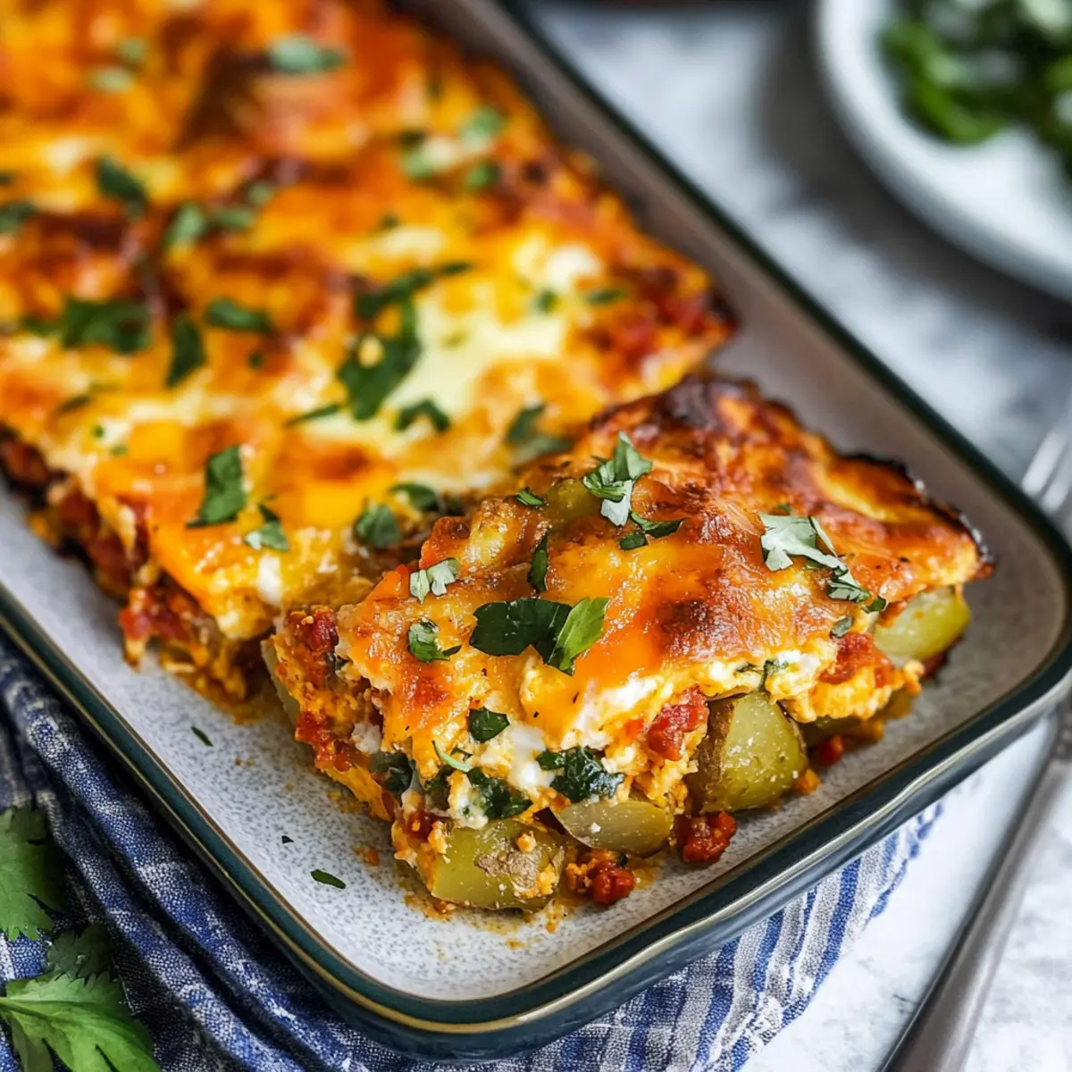 Once baked to perfection, remove the casserole from the oven and let it cool for about 5-10 minutes. This cooling time allows the casserole to set, making it easier to cut into squares. Garnish with fresh chopped cilantro, and serve alongside sliced avocado and chunky salsa for a delightful and flavorful brunch experience with friends and family!