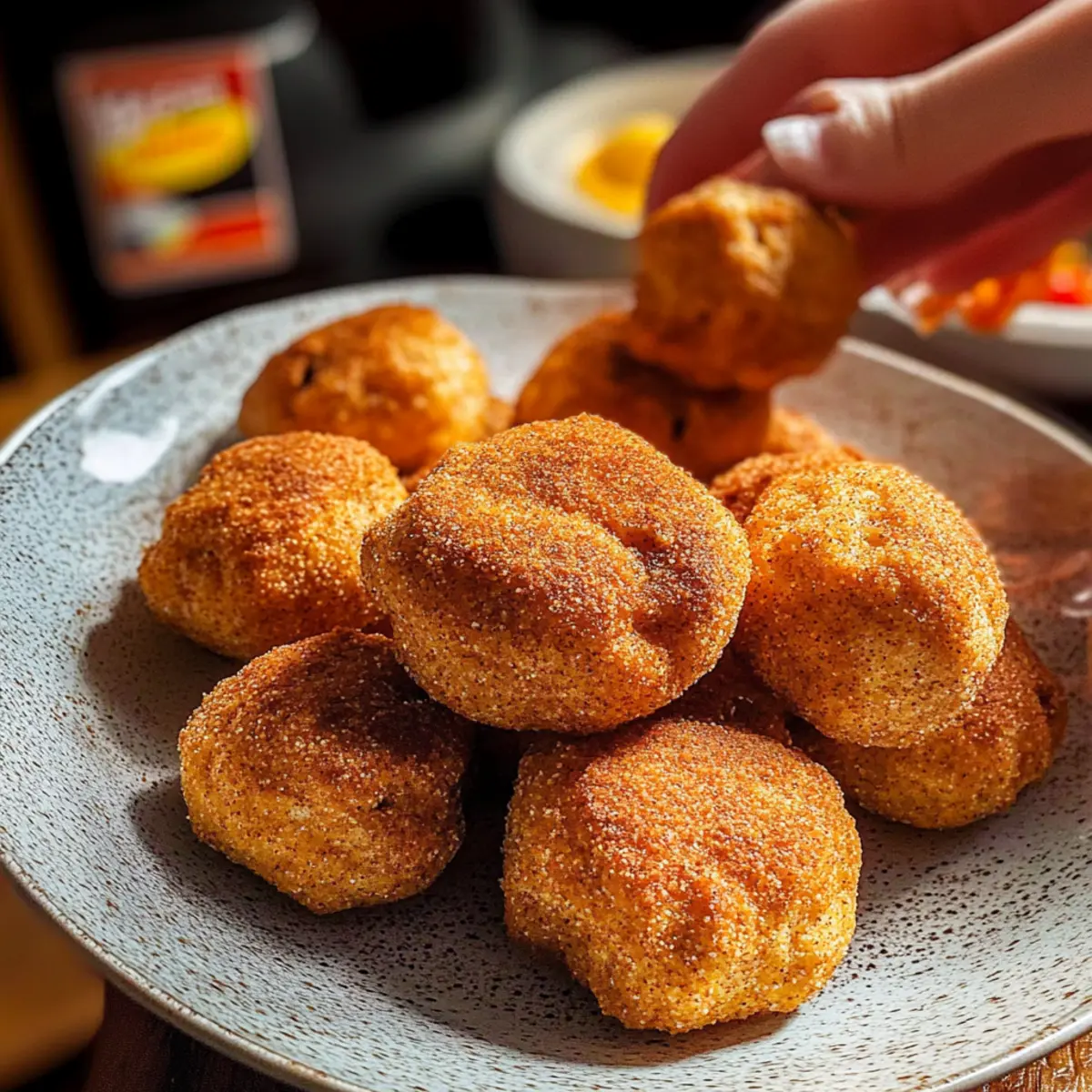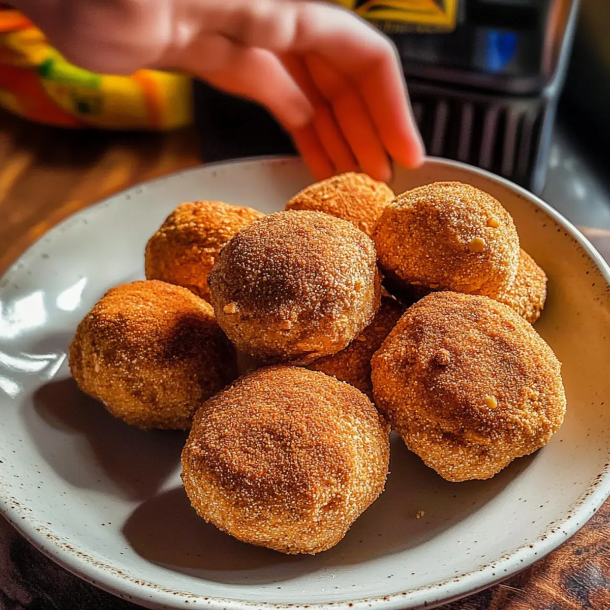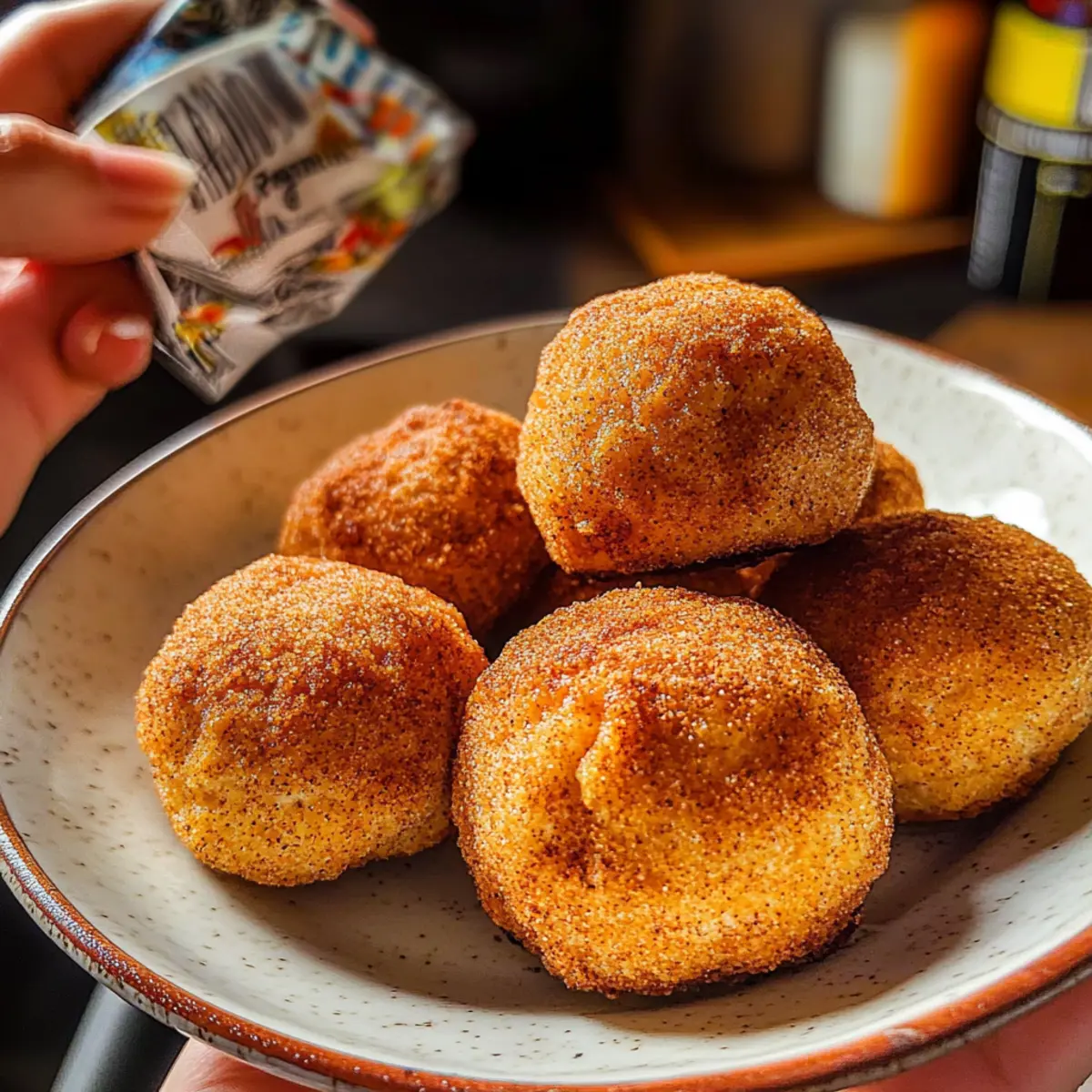 Jump to Recipe Print RecipeYou won’t believe how easy it is to turn snack cravings into something delightful and nutritious! These Sweet & Spicy Churro Protein Pretzel Bites are a game-changer—combining the satisfying crunch of pretzels with a kick of cinnamon and a hint of spice. Made with high-protein Crisp Power Protein Pretzels, this recipe is quick to whip up and perfect for both post-workout fuel or as an inviting treat at your next gathering. Imagine indulging in a snack that’s gluten-free, sugar-free, and packed with protein, all while feeling like you’ve just ventured into a gourmet bakery. What’s not to love? Are you ready to explore this unique blend of flavors? Why Choose These Pretzel Bites? Healthy Snacking Made Easy: These Sweet & Spicy Churro Protein Pretzel Bites are the perfect solution for those craving something delicious without the guilt. High-Protein Treat: With added protein from Crisp Power Protein Pretzels, they provide a wholesome energy boost post-workout, similar to Chocolate Banana Protein shakes. Gluten-Free Goodness: Using paleo or almond flour means everyone can enjoy them, even those with dietary restrictions. Unique Flavor Fusion: The delightful mix of cinnamon and a hint of spice makes each bite an adventure, turning snack time into something special. Fun Variations: Experiment with flavors like Chocolate Cinnamon or Tropical Mango & Coconut to keep things fresh and exciting. Crowd-Pleasing Snack: Whether you’re hosting friends or satisfying family cravings, these bites are a surefire way to impress without endless prep! Churro Protein Pretzel Bites Ingredients For the Dough • Paleo All-Purpose Flour (or Almond Flour) – Provides structure and a gluten-free base; regular flour can be used if gluten isn’t a concern. • Crisp Power Protein Pretzels (Cinnamon Crunch & Flamin’ Crunch) – Adds crunch and protein to the recipe; feel free to substitute with any high-protein pretzel variety. • Baking Powder – Acts as a leavening agent for a perfect fluffiness in the bites. • Granulated Monk Fruit Sweetener – A natural zero-calorie sweetener that adds delightful sweetness; can be swapped with stevia or erythritol if needed. • Vanilla Extract – Enhances the overall flavor; choose pure vanilla for the best taste. • Kosher Salt – Balances sweetness while enhancing the overall flavor profile. • Plain Greek Yogurt – Adds moisture and protein; for a non-dairy option, substitute with dairy-free yogurt. • Egg – Acts as a binder for the ingredients; use flaxseed meal as an egg substitute for a vegan version. For the Pretzel Wash • Water – Used to create a shiny pretzel finish when brushed on the bites. For the Coating • Brown Granulated Monk Fruit – Provides a sweet coating; can be replaced with brown sugar or coconut sugar if preferred. • Cinnamon – Infuses warmth and enhances the churro flavor in your bites. These Sweet & Spicy Churro Protein Pretzel Bites deliver a delightful combination of taste and nutrition, making them a perfect high-protein snack! Step‑by‑Step Instructions for Churro Protein Pretzel Bites Step 1: Preheat Your Oven Begin by preheating your oven to 375°F (190°C). This ensures a perfectly baked texture for your Churro Protein Pretzel Bites. While the oven warms, gather your mixing bowls and prepare your baking sheet by lining it with parchment paper for easy cleanup later. Step 2: Mix the Dough In a large mixing bowl, combine the paleo flour, crushed Crisp Power Protein Pretzels, baking powder, monk fruit sweetener, salt, vanilla extract, Greek yogurt, and beaten egg. Stir the ingredients together until a cohesive dough forms, which should take about 2-3 minutes. Look for a smooth consistency that holds together well. Step 3: Knead and Shape Transfer the dough onto a lightly floured surface. Knead it gently for about 1-2 minutes to bring it together further, then cut the dough into small, bite-sized pieces—aim for uniform sizes to ensure even cooking. Your Churro Protein Pretzel Bites should be roughly the size of a golf ball or smaller. Step 4: Prepare the Pretzel Wash For a shiny finish, prepare the pretzel wash by mixing water with a small amount of baking soda in a separate bowl. Use a pastry brush to coat each bite, ensuring they are evenly covered with the wash. This step is crucial for achieving that signature pretzel glaze on your bites. Step 5: Bake the Bites Place the coated bites on the prepared baking sheet, spacing them out to allow for expansion. Bake them in the preheated oven for 12-13 minutes, or until they are golden brown. Keep an eye on them towards the end; they should have a slight sheen and a firm exterior. Step 6: Coat in Sweet Cinnamon Once baked, remove the Churro Protein Pretzel Bites from the oven and let them cool for a minute. In a mixing bowl, combine the brown monk fruit and cinnamon to create a sweet coating. Generously toss the warm bites in this mixture while they are still slightly warm, ensuring they are all coated well and ready to enjoy. Storage Tips for Churro Protein Pretzel Bites Room Temperature: Store your Churro Protein Pretzel Bites in an airtight container at room temperature for up to 3 days to maintain their delightful crunch and flavor. Fridge: For longer freshness, refrigerate the bites in an airtight container for up to a week. They may lose some crunch but will still be delicious. Freezer: Freeze leftovers in an airtight container for up to 3 months. To enjoy, thaw at room temperature and warm briefly in the oven to restore crunch. Reheating: Reheat in a preheated oven at 350°F (175°C) for about 5 minutes to revive that freshly baked texture before serving. Make Ahead Options These Sweet & Spicy Churro Protein Pretzel Bites are perfect for meal prep, saving you time on busy weeknights! You can prepare the dough and shape the bites up to 24 hours in advance; just wrap them tightly in plastic wrap and refrigerate to prevent drying o