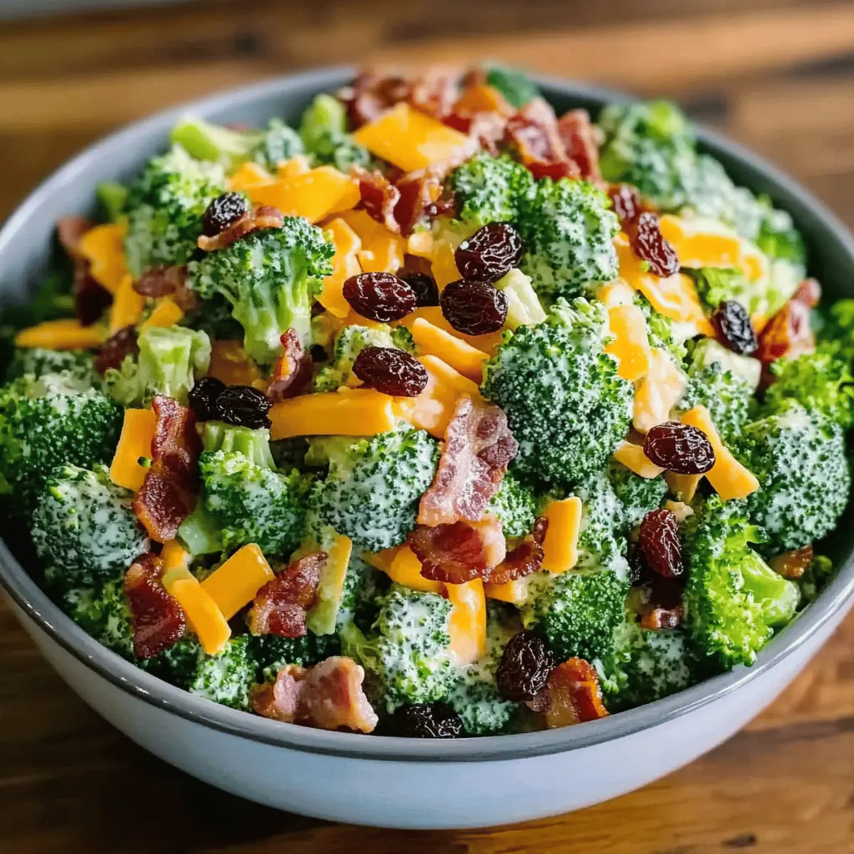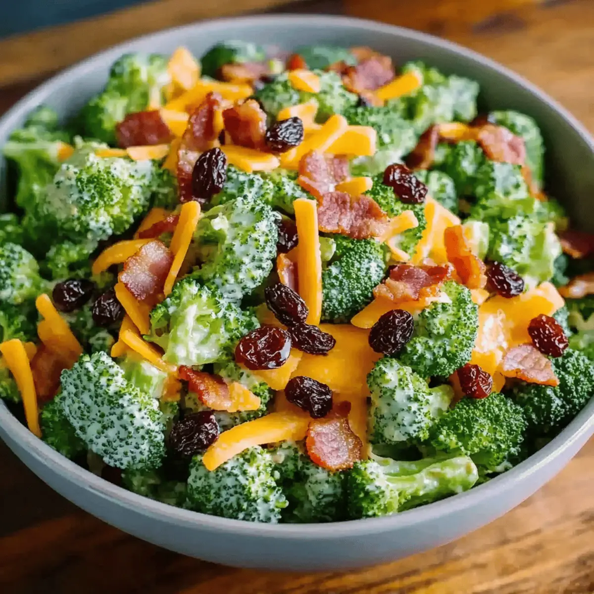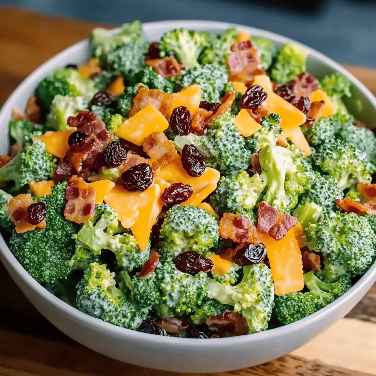 Discover the Classic Broccoli Bacon Salad with Raisins and Cheddar Cheese, a delightful side that blends crunchy broccoli, savory bacon, and sweet raisins.