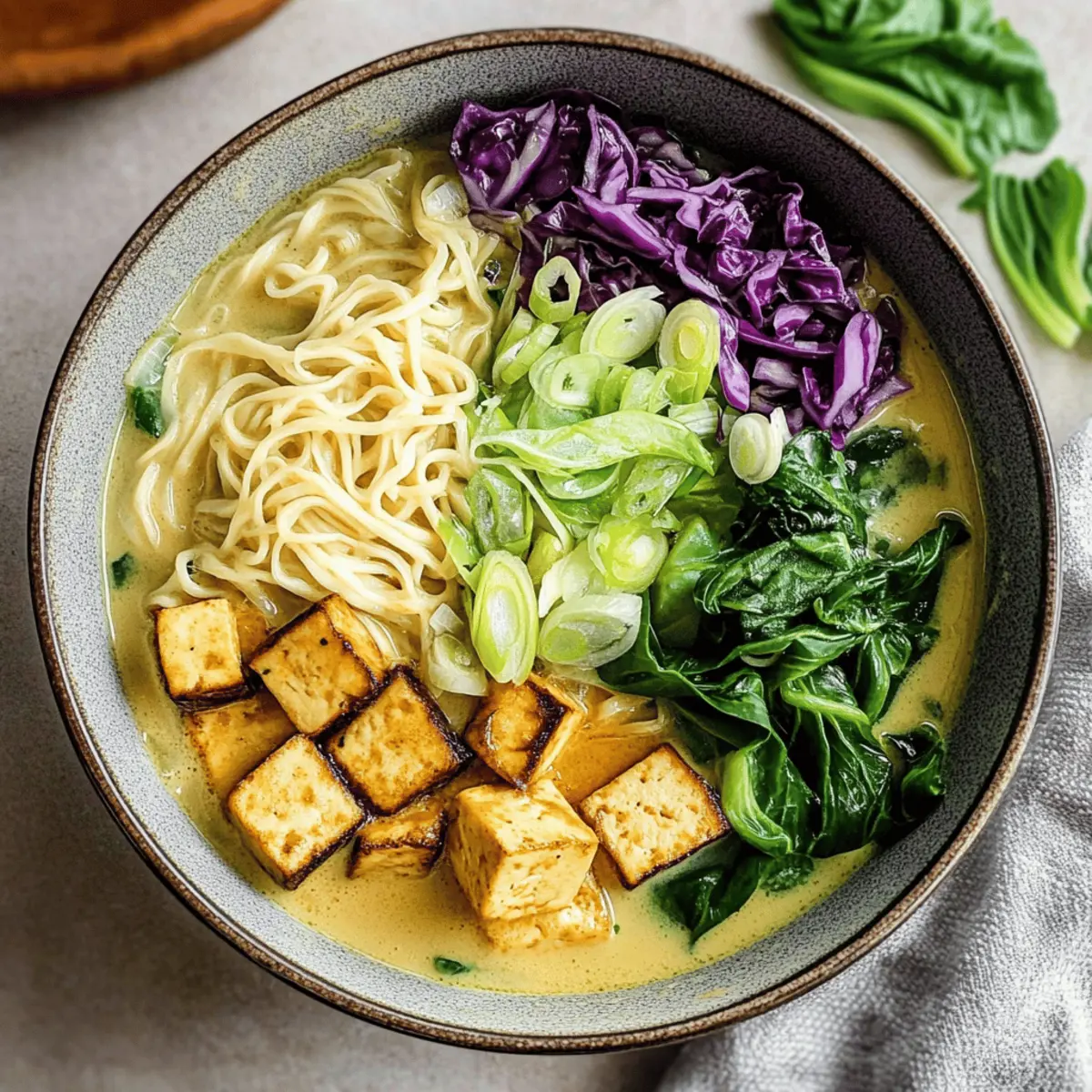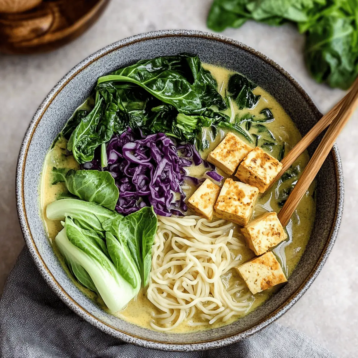Jump to Recipe Print RecipeAs I stirred the fragrant mix of garlic and ginger, I couldn’t help but smile. The vibrant colors of my kitchen filled with warmth, and the promise of a delicious meal hung in the air. This is why I adore making Coconut Curry Ramen; it’s the ultimate comfort food that embraces the soul with its creamy, rich flavors. Perfect for those busy weeknights, this quick and easy recipe comes together in just 25 minutes, offering a delightful escape from takeout temptations. Not only does it quell your hunger, but it also allows for endless creativity—toss in your favorite vegetables or proteins that you have on hand! Ready to whip up a bowl of this comforting goodness? Let’s dive into the recipe and discover the deliciousness awaiting you! Why is Coconut Curry Ramen a Must-Try? Creamy, indulgent flavors envelop your senses with every spoonful, making it an ideal dish for any foodie. Quick and easy to make, you’ll have this comforting bowl ready in just 25 minutes—perfect for hectic weeknights! Versatile ingredients mean you can customize it with whatever veggies or protein you have on hand. Plus, it gives traditional ramen a delightful twist by blending in the warmth of coconut curry. Looking for something sweet to complement this savory dish? Try our delicious Pineapple Coconut Milkshake for a refreshing treat! Coconut Curry Ramen Ingredients For the Soup • Vegetable Oil – Adds fat for sautéing ingredients and enhancing flavor; substitute with coconut oil for a richer taste. • Extra Firm Tofu – Provides protein and texture; can replace with chickpeas for a different protein source. • Shallot/Onion – Adds sweetness and depth; substitute with leeks if preferred. • Garlic – Enhances aroma and flavor; fresh garlic is recommended; dried can be used in a pinch. • Fresh Ginger – Adds warmth and spice; ground ginger can be used if fresh is unavailable, but adjust quantity to taste. • Shiitake Mushrooms – Contributes umami and texture; substitute with button mushrooms if preferred. • Green Curry Paste – Provides a vibrant base flavor; adjust quantity for spice level. • Coconut Milk – Adds creaminess and richness; light coconut milk or any non-dairy milk can be used as alternatives. • Vegetable Broth – Creates the soup base; can use homemade or store-bought; substitute with water for a lighter option. • Fish Sauce – Adds umami; can substitute with soy sauce or omit for a vegetarian version. • Lime Juice – Offers acidity and brightness; lemon juice can be an alternative. • Dry Ramen Noodles – The base of the dish; any noodle type can work, but cooking time may vary. • Bok Choy – Adds freshness and crunch; can replace with spinach or kale for a different green. • Shredded Purple Cabbage – Provides color and texture; omit or replace with regular cabbage if desired. Step‑by‑Step Instructions for Coconut Curry Ramen Step 1: Heat the Oil Begin by heating 2 tablespoons of vegetable oil in a large pot over medium heat. Allow the oil to shimmer—this usually takes about 1–2 minutes. This step is essential for building the flavor base of your Coconut Curry Ramen, creating an inviting aroma that fills your kitchen. Step 2: Sauté the Aromatics Add the diced shallots or onions to the pot and sauté for about 3–4 minutes until they become soft and translucent. Stir them occasionally to prevent sticking. Once golden, toss in minced garlic and freshly grated ginger, cooking for another minute until fragrant, bringing forth a delightful savory scent. Step 3: Cook the Mushrooms Incorporate the sliced shiitake mushrooms into the pot, stirring them in for approximately 4–5 minutes until they are tender and have released their moisture. The mushrooms should appear darkened and juicy at this point, enhancing the umami flavor of your Coconut Curry Ramen. Step 4: Add Curry Paste Stir in 3 tablespoons of green curry paste and let it cook for 1–2 minutes while stirring continuously. This step allows the paste to bloom its flavors, transforming your mixture into a vivid and aromatic base, perfect for the creamy broth to follow. Step 5: Pour in the Liquids Carefully pour in 1 can of coconut milk and 3 cups of vegetable broth, followed by 1 tablespoon of fish sauce and the juice of one lime. Bring the mixture to a gentle boil over medium-high heat while stirring occasionally, ensuring all flavors meld beautifully together in your Coconut Curry Ramen. Step 6: Cook the Noodles Add in your dry ramen noodles and let them simmer in the broth for about 4–5 minutes, or until they are just tender. Stir them gently to prevent sticking, and watch as they absorb the vibrant broth, adding to the comforting textures of your dish. Step 7: Add Greens Once the noodles are cooked to your liking, stir in the chopped bok choy and shredded purple cabbage. Cook for an additional minute to allow the greens to wilt and infuse their freshness into the Coconut Curry Ramen, resulting in a balanced and colorful bowl. Step 8: Serve and Garnish Ladle the hot Coconut Curry Ramen into bowls and serve immediately. Feel free to top with fresh herbs, chili flakes, or lime wedges for an extra burst of flavor. Each bowl should be vibrant, inviting, and ready to bring warmth and comfort to your evening! Coconut Curry Ramen Variations Feel free to sprinkle your creativity into the recipe and explore delightful twists on this comforting dish! Dairy-Free: Replace coconut milk with almond or cashew milk for a lighter version, keeping the creaminess. Spicy Kick: Add sliced fresh chili peppers or a dash of sriracha to your broth for an exciting heat level. Different Greens: Swap bok choy with collard greens or Swiss chard for a unique texture and flavor. Both greens hold up beautifully in the broth, adding nutritious bang! Tender Chicken: For a non-vegetarian version, substitute the tofu with shredded chicken, cooked separately, and tossed in at the end. This adds a