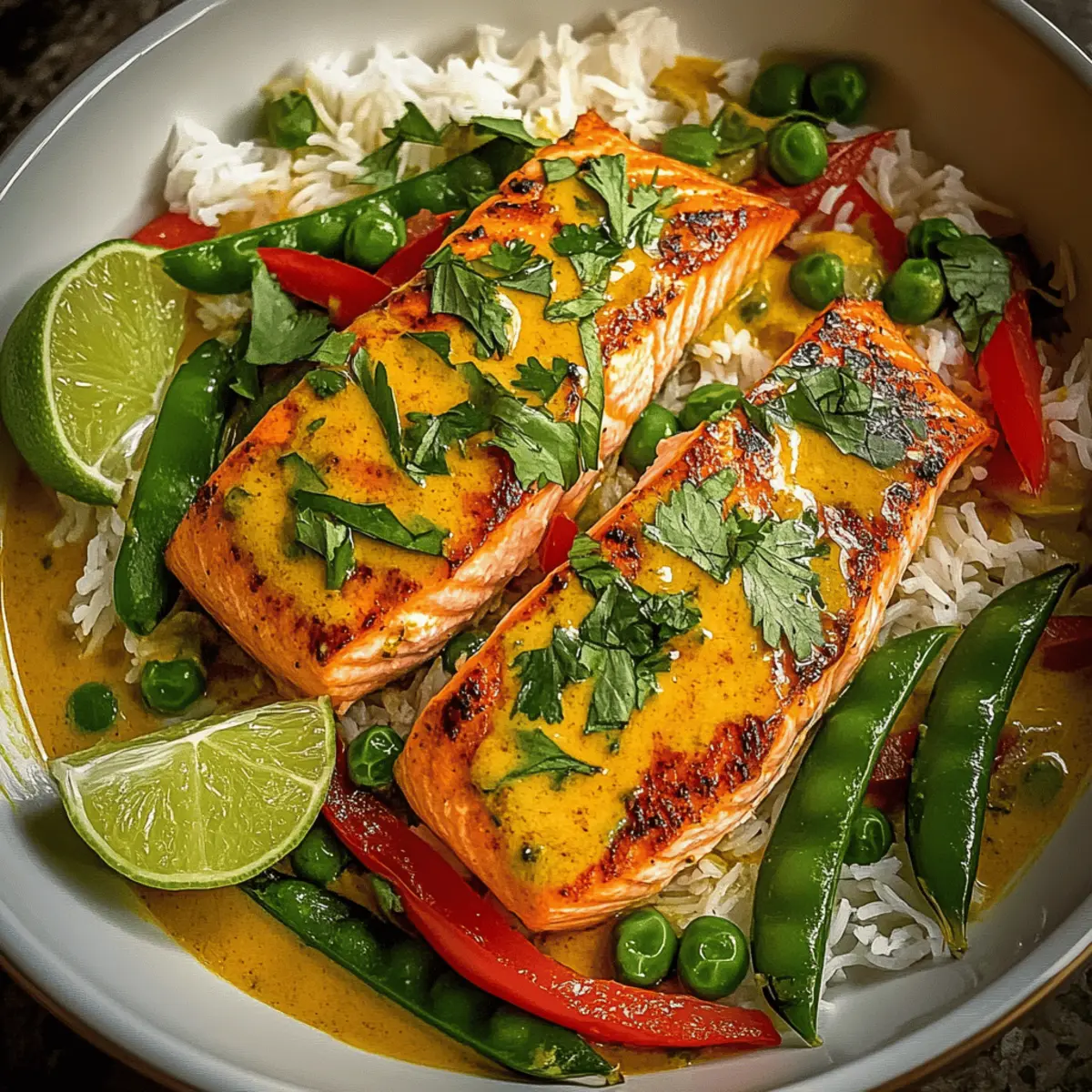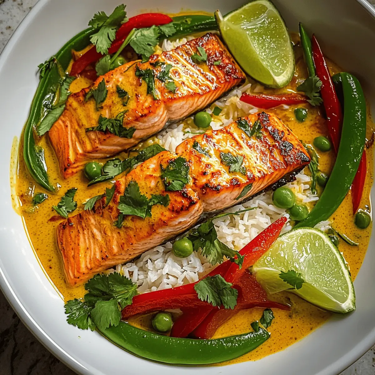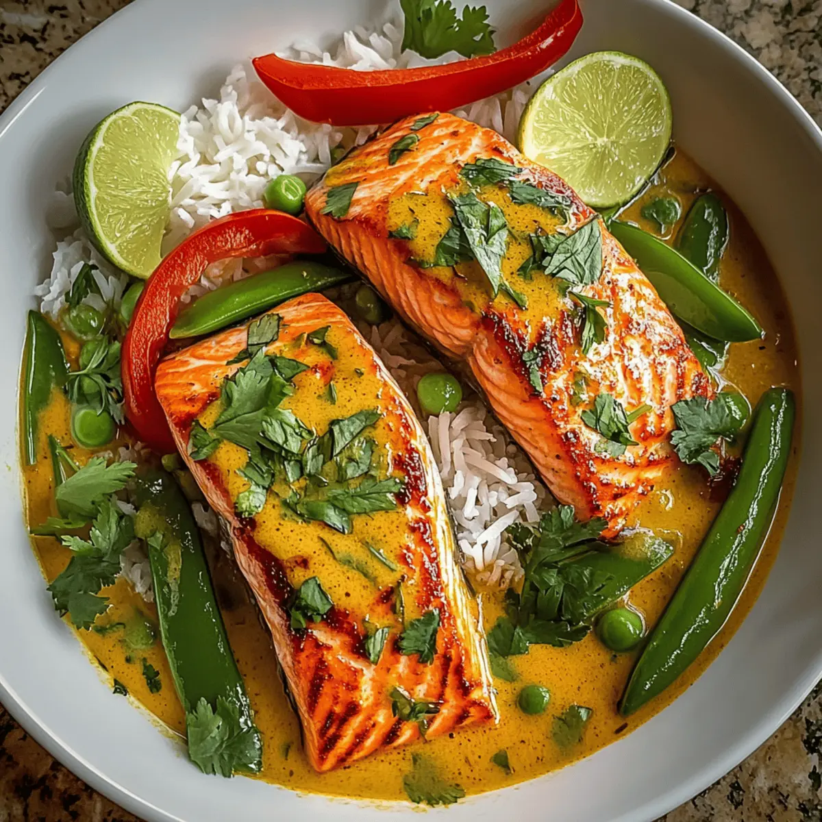 Jump to Recipe Print Recipe“Have you ever craved a meal that transports you straight to the tropics without stepping out of your kitchen? My Coconut Curry Salmon ticks that box and more! This mouthwatering dish combines tender, golden-seared salmon fillets with a luscious coconut curry sauce that sings with vibrant spices, fresh ginger, and aromatic garlic. Ready in just 35 minutes, it’s an ideal solution for busy weeknights when you still want to enjoy a healthy meal that’s not just your average quick dinner. The gentle heat from the red curry paste balances beautifully with creamy coconut milk for a comforting dish that’s beginner-friendly. Curious about how to whip up this exotic taste sensation in your own home? Let’s dive in!” Why is Coconut Curry Salmon a Must-Try? Flavor Explosion: This dish is a symphony of tastes, blending the rich flavors of coconut milk with the aromatic spice from red curry paste. Quick & Easy: Ready in just 35 minutes, it’s perfect for busy weeknights when you want a meal that’s both healthy and satisfying. Beginner-Friendly: Even novice cooks can master this recipe with simple steps and readily available ingredients. Versatile Enjoyment: Serve it over jasmine or basmati rice to soak up the delicious sauce, making it a crowd-pleaser at dinner parties or family meals. Nutritionally Balanced: With approximately 450 calories per serving, it offers a light, nourishing option that doesn’t skimp on flavor. If you’re looking for something sweet and satisfying to complement your meal, consider making some Coconut Bliss Balls for dessert! Coconut Curry Salmon Ingredients For the Salmon • Salmon Fillets – A rich, omega-3 source that absorbs the flavors of the coconut curry beautifully. • Olive Oil – Ideal for searing salmon and adding a touch of healthy fat to the dish. • Salt and Pepper – Essential seasonings that enhance the salmon’s natural flavor. For the Curry Sauce • Onion – An aromatic base to add sweetness and depth to your coconut curry. • Garlic – Provides a pungent flavor that elevates the sauce significantly. • Fresh Ginger – Adds a spicy freshness that brightens the overall profile of the dish. • Red Curry Paste – The heart of the dish; delivers bold, vibrant flavors (substitute with green or yellow curry paste if desired). • Coconut Milk – Creates a creamy texture that softens the heat and enhances richness. • Fish Sauce – Adds an umami punch to balance the sweetness; can be replaced with soy sauce for a vegetarian option. • Brown Sugar – Harmonizes overall flavors; adjust based on your sweetness preference. • Lime Juice – Brightens up the dish right before serving for an extra zing. For the Veggies • Red Bell Pepper – Brings color and natural sweetness; feel free to swap with other bell pepper varieties. • Sugar Snap Peas – Offers a crunchy texture and fresh flavor; replace with any favorite seasonal vegetable if you prefer. • Fresh Cilantro – A fragrant herb garnish that adds color and an extra layer of flavor; can be omitted if desired. For Serving • Lime Wedges – Squeeze over your dish for an extra pop of citrus brightness. With these simple ingredients, you’re well on your way to making a delightful Coconut Curry Salmon that will brighten up your dinner table! Step‑by‑Step Instructions for Coconut Curry Salmon Step 1: Season the Salmon Start by seasoning the salmon fillets generously with salt and pepper on both sides. This ensures that the flavors penetrate the fish during cooking. Set the seasoned salmon aside while you prepare your skillet, making sure it’s ready for a perfect sear when the time comes. Step 2: Sear the Salmon In a large skillet, heat 2 tablespoons of olive oil over medium-high heat. Once the oil is shimmering, carefully place the salmon fillets skin-side down in the skillet. Sear the salmon for about 3–4 minutes or until the skin is crispy and golden. Flip the fillets and cook for another 3–4 minutes until the salmon is opaque and flakes easily with a fork. Then, transfer the salmon to a plate and keep warm. Step 3: Sauté the Aromatics In the same skillet, add the chopped onion and sauté for 3–4 minutes until it becomes translucent and fragrant. Stir occasionally to prevent sticking and ensure even cooking. The remaining oil and salmon drippings will enhance the flavor, creating a delicious aromatic base for your Coconut Curry Salmon. Step 4: Add Garlic and Ginger Next, add the minced garlic and grated fresh ginger to the skillet with the onions. Sauté for an additional minute, stirring continuously until the mixture is fragrant. The garlic should start turning a light golden color, releasing a rich aroma that will elevate your curry sauce beautifully. Step 5: Stir in Curry Paste Now it’s time to incorporate the red curry paste into your sautéed mixture. Stir it in and cook for about 1 minute until it’s well combined and the spices release their essential oils. This step is crucial for ensuring the bold flavors of the curry fully develop in your Coconut Curry Salmon. Step 6: Pour in the Coconut Milk Slowly pour in the coconut milk, followed by fish sauce and brown sugar. Stir until everything is well integrated, bringing the mixture to a gentle simmer over medium heat. Take a moment to enjoy the creamy texture and enticing aroma as the sauce begins to bubble. Step 7: Add Veggies Add the sliced red bell pepper and sugar snap peas to the simmering coconut curry sauce. Cook for 4–5 minutes, stirring occasionally, until the veggies are tender but still crisp. Their vibrant colors and freshness will enhance both the taste and visual appeal of your Coconut Curry Salmon. Step 8: Reheat the Salmon Return the seared salmon fillets to the skillet, spooning the luscious curry sauce over them. Allow the salmon to simmer gently for another 2–3 minutes, just until heated through. This step ensures the flavors meld beautifully while keepi