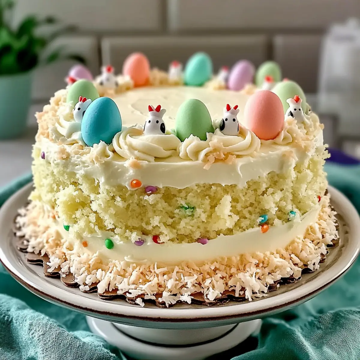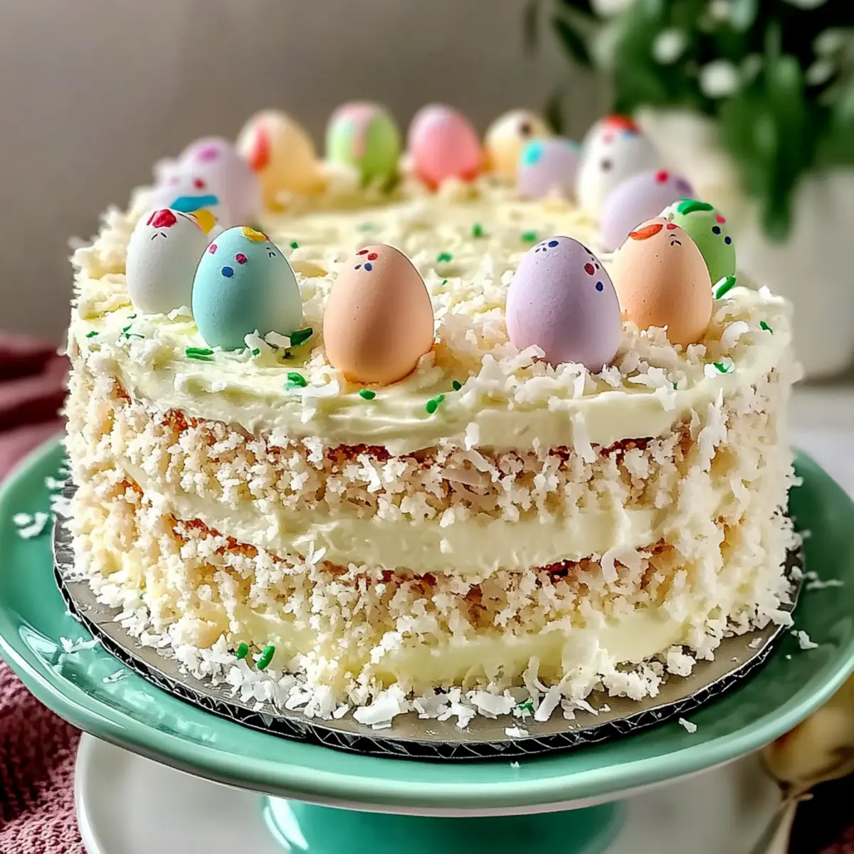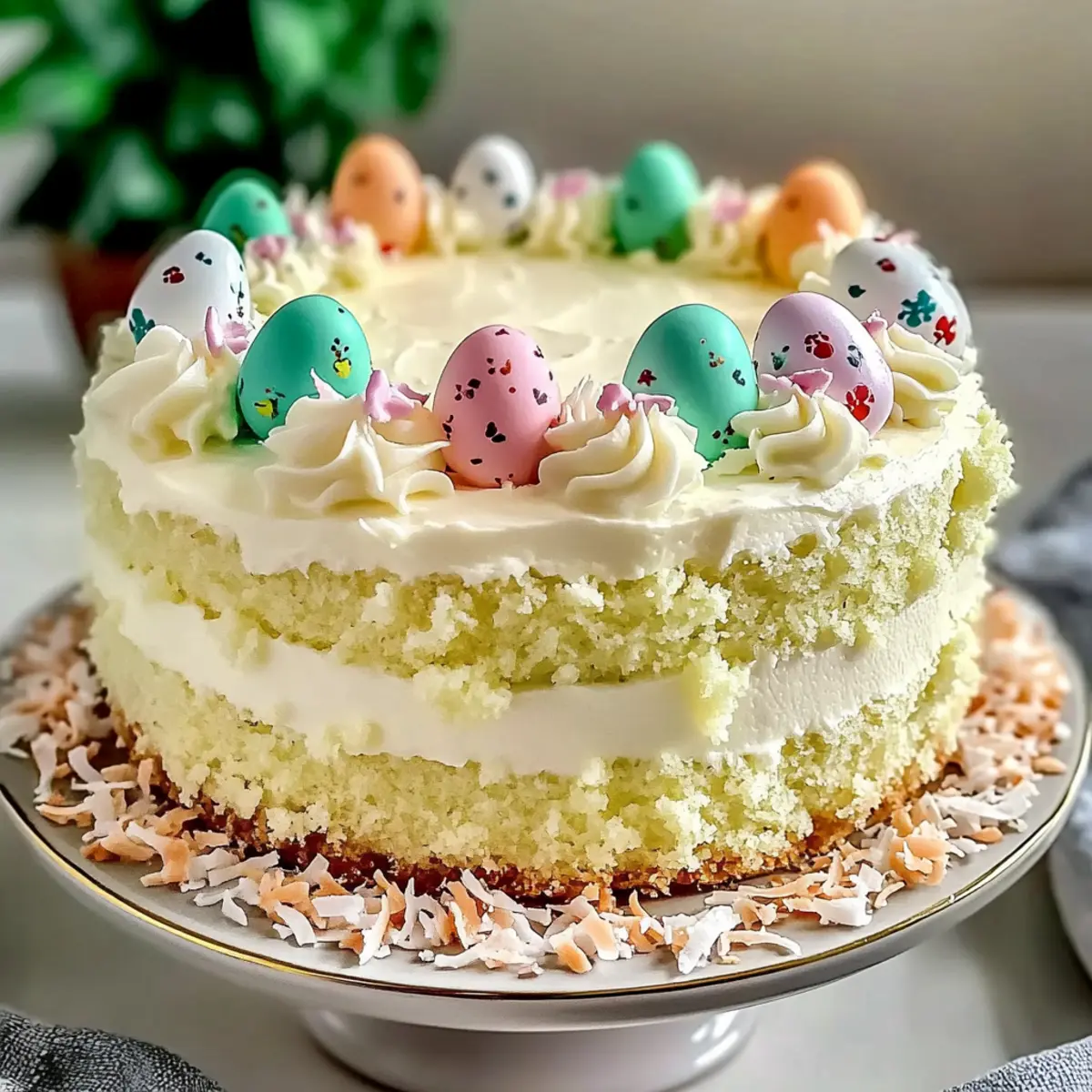 Jump to Recipe Print RecipeAs the days grow warmer and the blooms begin to burst into color, there’s a sense of renewal in the air. What better way to welcome the Easter season than with a delightful Easy Coconut Easter Cake? This cake, with its light, tender crumb and just the right hint of coconut, will become a family favorite at your spring gatherings. Topped with a luscious mascarpone frosting and sprinkled with vibrant robin egg candies, it’s not just a treat for the taste buds but also a stunning centerpiece on your table. Best of all, it’s quick to prepare, allowing you to enjoy the art of baking without spending all day in the kitchen. Are you ready to immerse yourself in this delightful baking adventure? Why is this Coconut Cake So Special? Family-Friendly Delight: This Easy Coconut Easter Cake brings everyone together, making it the perfect dessert for spring celebrations. Fluffy Texture: With its light, airy crumb and creamy mascarpone frosting, each slice melts in your mouth. Visual Appeal: Decorated with colorful robin egg candies and dyed coconut, it becomes the showstopper of any gathering. Quick and Easy: Enjoy baking without the fuss; this cake comes together quickly, ensuring you spend less time in the kitchen. Versatile Treat: Change up the extracts or decorations to keep this recipe fresh for all occasions, as seen in our Baked Oreo Cheesecake or Ingredient Cheesecake Bake. Coconut Easter Cake Ingredients For the Cake • Butter – Adds richness and moisture to the cake; Kerrygold is recommended for flavor. • Sugar – Sweetens and contributes to a tender texture; no substitution suggested. • Salt – Enhances flavors and balances sweetness; no substitution suggested. • Baking Powder – Provides leavening for the cake; ensure freshness for best results. • Vanilla Extract – Adds depth of flavor; can substitute with almond extract for variation. • Coconut Extract – Enhances the coconut flavor; no substitution suggested. • Eggs – Provide structure and moisture; use room temperature eggs for even mixing. • Egg Yolks – Enrich the cake’s texture; no substitution suggested. • Flour – Forms the structure of the cake; King Arthur all-purpose is recommended. • Milk – Moistens the batter and activates the baking powder; whole milk is ideal. For the Frosting • Mascarpone – Creates a rich frosting with a creamy texture; substitute with cream cheese for a tangier taste. • Powdered Sugar – Sweetens and thickens the frosting; ensure to sift to remove lumps. For the Decoration • Sweetened Flaked Coconut – Used for decoration; Baker’s brand preferred for best results. • Green Food Coloring – Used to dye coconut for decoration; use cautiously for desired color. • Robin Egg Candy – Decorative topping that adds color and sweetness; substitute with other candy if unavailable. Indulge in this delectable Coconut Easter Cake, perfect for making lasting memories with friends and family this spring! Step‑by‑Step Instructions for Easy Coconut Easter Cake Step 1: Preheat the Oven Begin by preheating your oven to 350°F (175°C). While it heats, prepare two 9-inch round cake pans by lining the bottoms with parchment paper and greasing the sides with butter. This ensures easy removal later. Set the prepared pans aside as you move on to the batter. Step 2: Cream Butter and Sugar In a large mixing bowl, use a mixer to cream together 1 cup of softened butter and 2 cups of sugar on medium speed for about 5 minutes. The mixture should become pale and fluffy, showing that it’s well combined. Take a moment to savor that creamy texture as you get ready to add the eggs. Step 3: Add Eggs Now, gradually beat in 4 large eggs, one at a time, ensuring each egg is fully incorporated before adding the next. After all the whole eggs are mixed in, add 2 egg yolks and continue mixing until the batter is smooth and uniform in appearance. This step adds richness and enhances your Coconut Easter Cake’s texture. Step 4: Combine Dry Ingredients In a separate bowl, whisk together 3 cups of all-purpose flour, 1 tablespoon of baking powder, and 1 teaspoon of salt. This creates a lump-free dry mixture, which is key for the cake’s fluffy texture. Once mixed, you’ll alternate adding this dry mixture to your batter with 1 cup of whole milk until just combined—don’t overmix! Step 5: Add Flavorings Gently stir in 1 tablespoon each of vanilla and coconut extracts into the batter. The fragrance will be heavenly! Make sure to incorporate these flavors evenly throughout without vigorous mixing to preserve the lightness of your batter. Your Coconut Easter Cake is nearly ready for the oven. Step 6: Bake the Cake Divide the batter evenly between the prepared cake pans. Place them in your preheated oven and bake for 25–30 minutes. Keep an eye on them; they’re done when a toothpick inserted into the center comes out clean or with a few moist crumbs. Step 7: Cool the Cakes Once baked, remove the pans from the oven and let them cool for about 10 minutes on a wire rack. Then, carefully turn the cakes out of the pans onto the racks to cool completely. Cooling properly is crucial before frosting, as it prevents the mascarpone frosting from melting. Step 8: Prepare the Frosting While the cakes cool, make the frosting. In a mixing bowl, whip together 8 oz of mascarpone cheese and ½ cup of softened butter until combined. Gradually mix in 3 cups of sifted powdered sugar and 1 teaspoon of vanilla extract until smooth and creamy. This delicious frosting will be the perfect complement to your Coconut Easter Cake! Step 9: Frost the Cake Once the cake layers have cooled completely, place one layer on a serving plate. Spread a generous amount of frosting on top before stacking the second layer. Frost the top and sides of the entire cake, smoothing it out with a spatula to create a beautiful finish. Step 10: Chill the Cake Chill the frosted cake in the refrigerator for at 