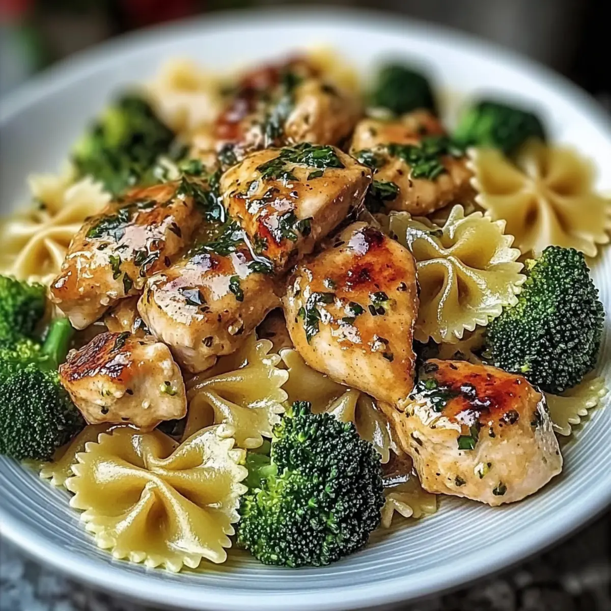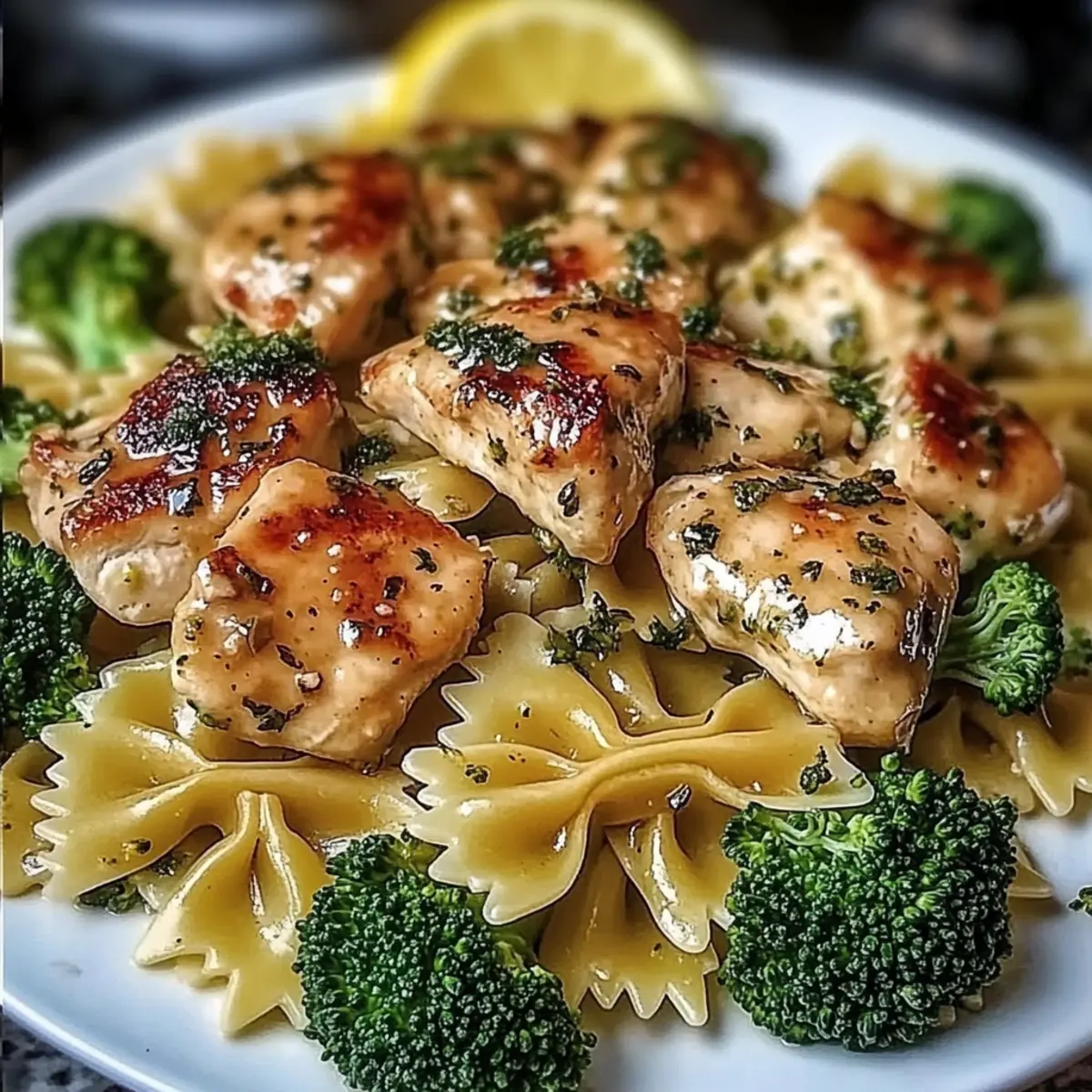 Jump to Recipe Print RecipeAs I stood in my kitchen, a joyful chaos of pots and pans surrounding me, I realized that the best meals often come together in the simplest moments. Today, I’m excited to share my Cowboy Butter Lemon Bowtie Chicken with Broccoli—a dish that transforms a busy weeknight into a family feast. With tender chicken, vibrant broccoli, and bowtie pasta dressed in a creamy, zesty sauce, this recipe strikes the perfect balance between comfort and quick prep. Plus, it’s a wonderful way to sneak in some veggies that even the kids will love. What’s not to adore about a creamy chicken dish that feels like a warm hug? Ready to dive into the deliciousness? Let’s get cooking! Why is this chicken recipe a must-try? Comforting and Creamy: This Cowboy Butter Lemon Bowtie Chicken is an embrace of flavor, with rich creaminess that guarantees smiles around the dinner table. Quick Preparation: In just 30 minutes, you can have a delightful family meal ready, perfect for busy weeknights that still deserve something special. Versatile Ingredients: Feel free to swap vegetables with options like bell peppers or zucchini to keep things fresh and exciting. Kid-Approved: Packed with flavors that even the pickiest eaters will enjoy, this dish turns broccoli into a delicious highlight instead of a dreaded side. Crowd-Pleaser: Whether it’s a family dinner or a small gathering, everyone will love this comforting dish, making it a fantastic choice for various occasions. Hearty Yet Light: Balance is key here, as this meal feels indulgent without being overly heavy, allowing for seconds without regret. Plus, for an extra treat, check out my Hawaiian Chicken Salad for a tropical twist on a comforting classic! Cowboy Butter Lemon Bowtie Chicken Ingredients • Dive into the flavors of this comforting dish! For the Chicken Chicken breasts – Boneless and skinless, cut into bite-sized pieces for easy eating. Cajun seasoning – 1 tsp for a touch of spice; feel free to adjust based on your heat tolerance. Garlic powder – 1/2 tsp to enhance the savory depth of the chicken. Smoked paprika – 1/2 tsp adds a delicious smokiness to the mix. Salt & Black pepper – To taste; essential for bringing out the flavors. For the Pasta and Vegetables Bowtie pasta – 12 oz; use gluten-free pasta if desired for a lighter alternative. Broccoli florets – 2 cups, packed with nutrients; consider veggies like zucchini or bell peppers for variations. For the Sauce Unsalted butter – 6 tbsp to create that creamy richness everyone loves. Olive oil – 2 tbsp for sautéing the chicken beautifully. Dijon mustard – 1 tsp brings a tangy twist to the sauce. Lemon juice and zest – From 1 lemon, crucial for the dish’s zesty brightness. Fresh parsley & chives – 2 tbsp parsley and 1 tbsp chives for that fresh garnish. Parmesan cheese – 1/2 cup grated for flavor; extra for topping if desired. For the Optional Kick Red pepper flakes – 1/2 tsp (optional) for an added zing. For the Finishing Touch Reserved pasta water – 1/2 cup to adjust sauce consistency for that perfect creamy texture. Now that you have all the ingredients for your Cowboy Butter Lemon Bowtie Chicken, let’s keep the excitement going as we prepare this comforting, creamy delight! Step‑by‑Step Instructions for Cowboy Butter Lemon Bowtie Chicken Step 1: Cook Pasta & Broccoli In a large pot, bring salted water to a rolling boil. Add 12 oz of bowtie pasta and cook until al dente, about 8-10 minutes. In the final 3 minutes of cooking, add 2 cups of broccoli florets to the pot. Once done, reserve 1/2 cup of pasta water, drain the pasta and broccoli, and set aside to lock in that vibrant green color. Step 2: Season Chicken In a medium bowl, take your bite-sized chicken pieces and toss them with 1 tsp of Cajun seasoning, 1/2 tsp of garlic powder, 1/2 tsp of smoked paprika, salt, and black pepper to taste. Make sure each piece is evenly coated. This blend will infuse your Cowboy Butter Lemon Bowtie Chicken with delicious flavor right from the start. Step 3: Cook Chicken Heat 2 tbsp of olive oil in a large skillet over medium-high heat. Once hot, add the seasoned chicken pieces in a single layer and sauté for about 6-7 minutes, or until they are golden brown and cooked through. Use a spatula to flip the pieces for even cooking. Remove the chicken from the skillet and set aside, keeping it warm. Step 4: Make Sauce In the same skillet, lower the heat to medium, and melt 6 tbsp of unsalted butter. Once melted, add minced garlic (if using) and sauté for about 30 seconds until fragrant. Then stir in 1/2 tsp of red pepper flakes (if you like some heat), 1 tsp of Dijon mustard, the lemon juice, and zest from 1 lemon. Add in 2 tbsp of chopped parsley and 1 tbsp of chives, seasoning the sauce with salt and pepper. Step 5: Combine Everything Return the cooked bowtie pasta, broccoli, and reserved chicken to the skillet. Toss everything together gently, allowing each piece to be coated in the creamy sauce. Slowly add the reserved pasta water as needed to achieve your desired sauce consistency. Lastly, stir in 1/2 cup of grated Parmesan cheese until melted and creamy, integrating it fully into the Cowboy Butter Lemon Bowtie Chicken. Step 6: Serve Dish up your Cowboy Butter Lemon Bowtie Chicken warm, garnishing with extra grated Parmesan if desired, a sprinkle of fresh parsley, and a squeeze of lemon juice. The final result features vibrant colors and rich flavors, making it an inviting centerpiece for your family dinner table. Cowboy Butter Lemon Bowtie Chicken Variations Feel free to explore these variations to make the Cowboy Butter Lemon Bowtie Chicken your own and savor every bite! Vegetable Boost: Add spinach or bell peppers for additional color and nutrition. Sauté them along with the chicken for a delicious twist! Gluten-Free: Swap the bowtie pasta for your favorite gluten-free pasta. Enjoy the same creamy goodness without the gluten! Low-Calorie 