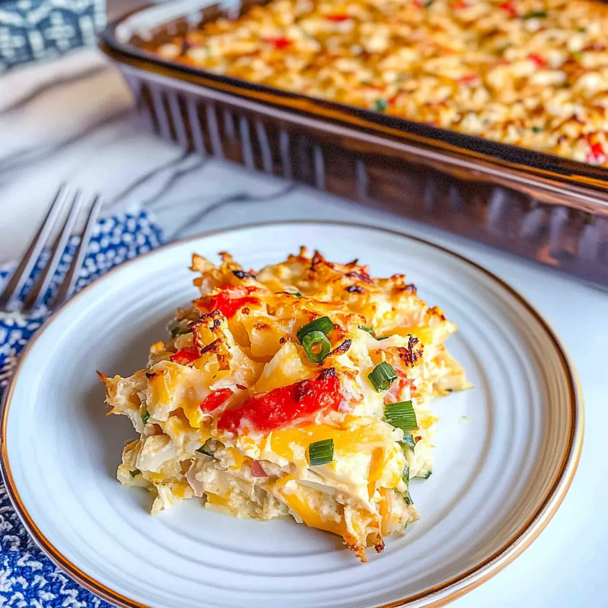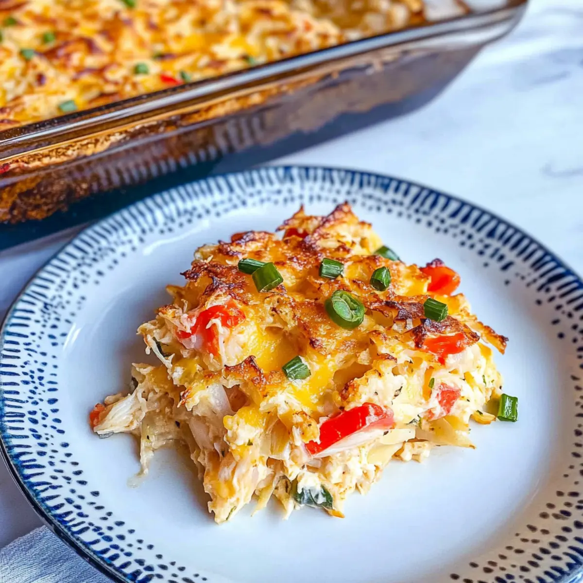 Jump to Recipe Print RecipeAs I stood in my kitchen, inhaling the savory aroma of melting cheese and tender crab, a wave of warmth swept over me—just like those cherished evenings spent at the local buffet. This Easy Cheesy Crab Casserole is my go-to comfort food, effortlessly merging nostalgia with convenience. It’s not just about the sumptuous crab meat or the creamy, cheesy goodness; it’s also a versatile dish well-suited for quick weeknight dinners or hosted brunches. What truly sets this casserole apart is how easily it adapts to your pantry’s offerings, allowing you to create variations that suit your taste. Whether you are a passionate home chef or just craving something hearty, this recipe will have you reaching for those seconds. Curious to uncover the secrets behind this delightful mix? Let’s dive in! Why is this Crab Casserole a Must-Try? Warmth and Comfort: This casserole brings the cozy vibes of a family dinner straight to your table, perfect for any occasion. Creamy Layers: The luscious blend of crab, cheese, and sour cream creates a mouthwatering richness that’s truly irresistible. Quick Preparation: With just a handful of ingredients, whip this dish up in no time, making it ideal for busy weeknights! Versatile Options: Feel free to customize it with ingredients you have on hand, whether subbing with Greek yogurt or different cheeses. Crowd-Pleasing Delight: Whether you’re hosting a brunch or a casual dinner, this dish will quickly become a favorite among your family and friends, just like my Loaded Broccoli Casserole and Cheesy Broccoli Casserole. Crab Casserole Ingredients For the Casserole Mayonnaise – Adds creaminess and moisture; substitute with Greek yogurt for a lighter option. Sour Cream – Provides tanginess and richness; can replace with additional mayonnaise or cream cheese. Lemon Zest – Enhances flavor with a fresh citrus note; use lime zest or omit if undesired. Cheddar Cheese – Offers classic cheesy flavor and melty texture; substitute with Colby, pepper jack, or mozzarella. Green Onions – Adds mild onion flavor and color; chives or diced parsley can be used instead. Celery (optional) – Adds crunch and freshness; omit if unwanted or replace with bell peppers. Imitation Crab Meat – The main protein that gives the dish its seafood essence; real crab meat or chopped crab sticks can be used. Step‑by‑Step Instructions for Easy Cheesy Crab Casserole Step 1: Preheat and Prepare Baking Dish Begin by preheating your oven to 375°F (190°C). While it heats, take an 8×8 baking dish and generously grease it with cooking spray or butter. This will ensure your Easy Cheesy Crab Casserole slides out effortlessly once baked. Set the dish aside as you prepare the other ingredients. Step 2: Prepare the Crab Meat If using imitation crab sticks, chop them into small, bite-sized pieces. If you have chunk or flake crab meat, gently break half of it into smaller bits for better distribution. This ensures a delightful bite of crab in your casserole. Set the prepared crab meat aside to be mixed in with the other ingredients. Step 3: Mix the Ingredients In a large mixing bowl, combine the chopped crab meat, mayonnaise, sour cream, lemon zest, diced green onions, and celery if you’re using it. Stir in ¾ cup of shredded cheddar cheese, mixing until everything is well-coated and the ingredients are evenly distributed. The creamy texture will be enticing as you blend it all together. Step 4: Transfer Mixture and Add Topping Carefully spoon the crab mixture into your greased baking dish, spreading it out evenly with a spatula. This ensures that your Easy Cheesy Crab Casserole bakes uniformly. Once level, sprinkle the reserved cheddar cheese and any remaining green onions over the top for a beautiful finish that will melt into a golden crust. Step 5: Bake to Perfection Place the baking dish in the preheated oven and bake for 25 to 30 minutes. Keep an eye on it; you want the casserole to be warmed through and the cheese on top to turn a lovely golden brown. For an extra touch, broil for 1-2 minutes at the end to achieve a bubbly, crispy top. Step 6: Serve and Savor Once your Easy Cheesy Crab Casserole is out of the oven, let it sit for a few minutes to cool slightly. This will make serving easier and allow the flavors to meld beautifully. Cut into squares, serve hot, and watch it become a favorite among your family and friends as they dive into the comforting richness! How to Store and Freeze Crab Casserole Fridge: Store leftover Crab Casserole in an airtight container for up to 3 days. This keeps it fresh and ready for a quick reheat later! Freezer: For longer storage, freeze the casserole before baking it. Wrap it tightly in plastic wrap followed by aluminum foil, and it will keep for up to 2 months. Reheating: When ready to enjoy, thaw overnight in the fridge. Reheat in the microwave for 30-45 seconds or bake at 350°F (175°C) until heated through, about 20-25 minutes. Covering: Always cover the dish while reheating to retain moisture and prevent the top from browning too quickly. Make Ahead Options These Easy Cheesy Crab Casseroles are perfect for meal prep enthusiasts looking to save time! You can prepare the entire crab mixture up to 24 hours in advance by combining the crab meat, mayonnaise, sour cream, lemon zest, green onions, and cheese in a large mixing bowl. Just cover it tightly and refrigerate to maintain freshness. When you’re ready to serve, simply transfer the mixture to your greased baking dish, sprinkle with the reserved cheese, and bake at 375°F (190°C) for 25 to 30 minutes. This not only allows the flavors to meld beautifully but ensures you enjoy restaurant-quality results with minimal effort on busy weeknights! What to Serve with Easy Cheesy Crab Casserole? Imagine a delightful spread that perfectly complements the rich and creamy flavors of your crab casserole. Simple Green Salad: A fresh mix of greens dressed lightly balances th