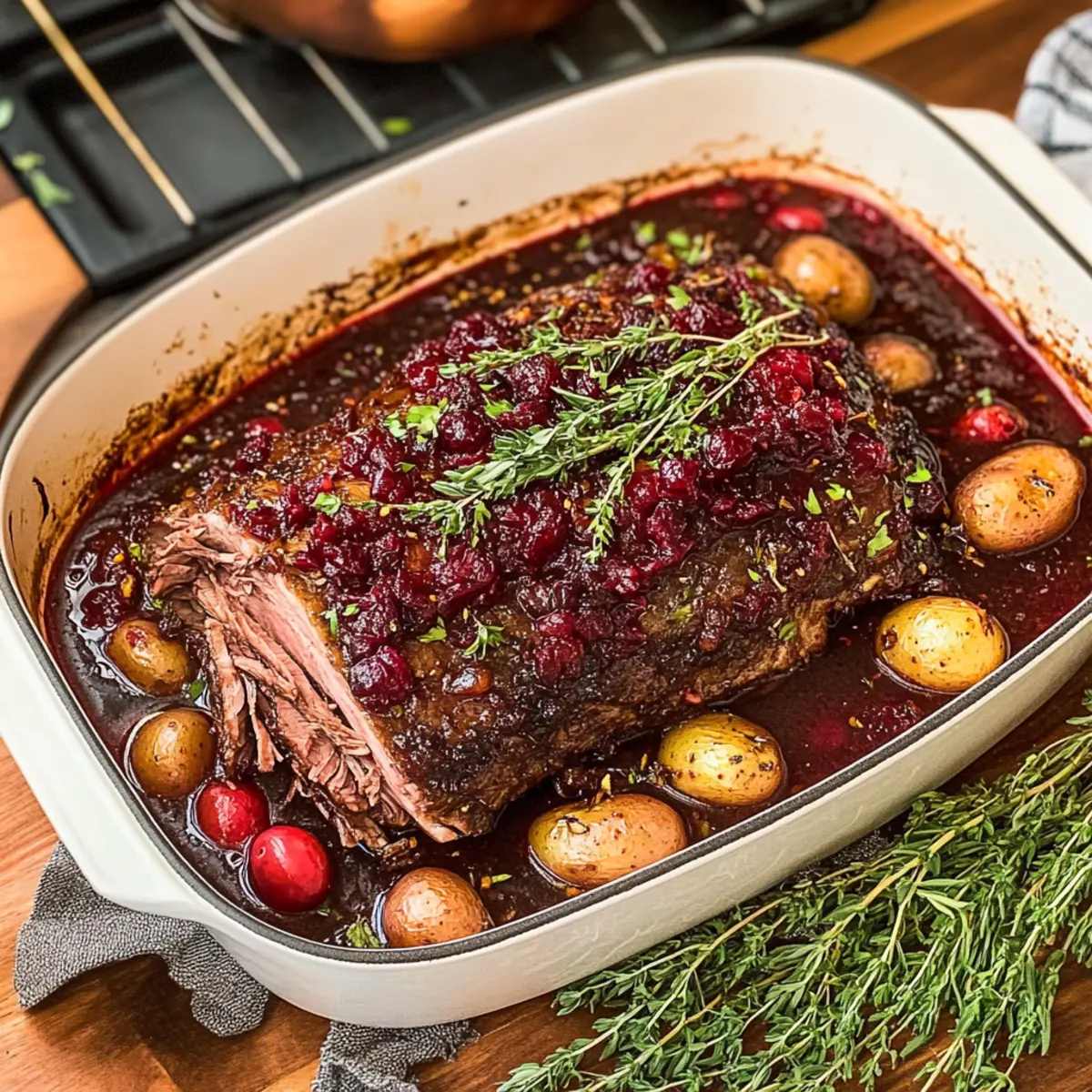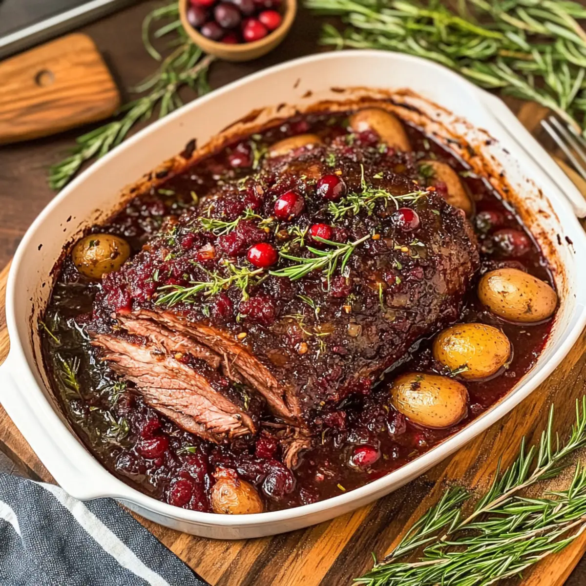 Jump to Recipe Print RecipeAs I stood in my kitchen, the tantalizing scent of roasting meat mingled with the sweet hint of cranberries and spices, I couldn’t help but smile. This Cranberry Holiday Beef Brisket transforms an ordinary gathering into a festive feast, effortlessly combining the savory depth of brisket with the delightful tang of cranberry sauce and a splash of Guinness. Surprisingly simple to prepare, it’s the perfect centerpiece for all your holiday celebrations. Imagine the joy on your loved ones’ faces as they savor that tender meat, enveloped in a rich, comforting sauce, all while filling your home with warmth and festive cheer. Whether you’re hosting a cozy family dinner or a lively holiday party, this dish promises to impress and satisfy. Ready to create something memorable this season? Let’s dive into this delicious recipe together! Why is this Beef Brisket a Must-Try? Simplicity at its finest: This recipe features easy-to-follow steps, making it accessible even for novice cooks. Flavor Explosion: The marriage of savory brisket with sweet cranberry and rich Guinness creates a luxurious taste that will delight everyone at your table. Festive Appeal: Perfect for holiday gatherings, this dish not only shines on the plate but also fills your home with the inviting aromas of comfort. Variety Versatility: Feel free to substitute the Guinness with beef broth or add root vegetables for a fresh twist. Try serving it alongside garlic butter fondant potatoes for a complete meal! Crowd Favorite: Whether it’s a cozy family dinner or a festive party, this Cranberry Holiday Beef Brisket will be a guaranteed hit that leaves everyone asking for seconds. Cranberry Holiday Beef Brisket Ingredients For the Brisket Brisket (3 ½ pounds, flat cut) – The star of the dish, stays juicy and slices beautifully. Olive oil (1 tablespoon) – Helps seasoning adhere and adds richness to the meat. Salt (1 teaspoon) – Essential for enhancing the flavor of the brisket. Black pepper (1 teaspoon) – Adds a mild spice note to balance the richness. Dried thyme (1 teaspoon) – Offers a lovely herbal depth to the seasoning mix. Dried rosemary (1 teaspoon) – Contributes a warm and aromatic flavor. Garlic powder (1 teaspoon) – Introduces a savory complexity; fresh garlic is used in the sauce. Onion powder (1 teaspoon) – Enhances the overall flavor profile of the dish. For the Sauce Yellow onion (1) – Aromatic base for the sauce; half diced and half sliced for texture. Garlic (5 cloves, minced) – Infuses the sauce with strong, aromatic flavor. Shallot (1, diced) – Adds a subtle sweetness that enriches the sauce. Cranberry jelly (14 ounces) – Creates a sweet and tangy sauce that perfectly balances the meat’s richness. Worcestershire sauce (1 tablespoon) – Introduces umami depth for extra flavor. Guinness (½ cup) – Deepens the flavor; can be substituted with beef broth for a non-alcoholic option. For Cooking Red potatoes (1 pound, petite) – Cooked alongside brisket, they absorb flavors and add heartiness. Dried cranberries (1 cup) – Adds a chewy texture and festive color to the dish. Fresh rosemary (3 sprigs) – Enhances aroma and freshness during cooking. Fresh thyme (3 sprigs) – Complements the herbaceous notes of the dish. This Cranberry Holiday Beef Brisket is set to be the star of your festive feast, combining convenience and mouthwatering flavors beautifully! Step‑by‑Step Instructions for Cranberry Holiday Beef Brisket Step 1: Prep the Brisket Remove the brisket from the refrigerator 30 minutes prior to cooking, allowing it to reach room temperature. Coat the brisket with olive oil, ensuring an even layer surrounds the meat. Generously season with salt, black pepper, dried thyme, and rosemary, pressing the spices into the surface. This will enhance the flavor of your Cranberry Holiday Beef Brisket and prepare it for a juicy roast. Step 2: Make the Sauce In a medium saucepan, heat 1 tablespoon of olive oil over medium heat. Add the diced yellow onion, diced shallot, and minced garlic, sautéing for about 5 minutes until they are soft and fragrant. Incorporate the cranberry jelly, Worcestershire sauce, and Guinness into the mixture, stirring well. Allow the sauce to simmer for approximately 10 minutes, thickening slightly and blending the flavors together beautifully. Step 3: Assemble the Dish Preheat your oven to 250°F (120°C). In a large roasting pan, pour half of the prepared sauce, spreading it evenly across the bottom. Layer the sliced onions on top, followed by the trimmed brisket, fat-side down. Pour the remaining sauce over the brisket, ensuring it’s fully coated. Arrange the red potatoes and dried cranberries around the brisket, followed by sprigs of fresh rosemary and thyme for added aroma. Step 4: Cook the Brisket Cover the roasting pan tightly with aluminum foil to trap moisture. Place the pan in the preheated oven and let the brisket roast for approximately 4 hours. Check for doneness towards the end; the meat should be fork-tender and infused with the rich flavors of the sauce. The low and slow cooking method results in a succulent and flavorful Cranberry Holiday Beef Brisket. Step 5: Finish and Serve Once the cooking time is complete, carefully remove the brisket from the oven, lifting the foil to avoid steam burns. Allow the meat to rest for 30 minutes before slicing; this step locks in the juices for maximum tenderness. Serve your beautifully sliced brisket with the roasted potatoes and a generous spoonful of the pan sauce drizzled over each portion, creating a comforting and festive feast awaits. Expert Tips for Cranberry Holiday Beef Brisket Resting is Key: Always allow the brisket to rest for at least 30 minutes after cooking to retain moisture and enhance its tenderness. Slice Like a Pro: Slice the brisket against the grain for the most tender bites and to maximize flavor absorption from the sauce. Use a Deep Pan: A high-sided roastin