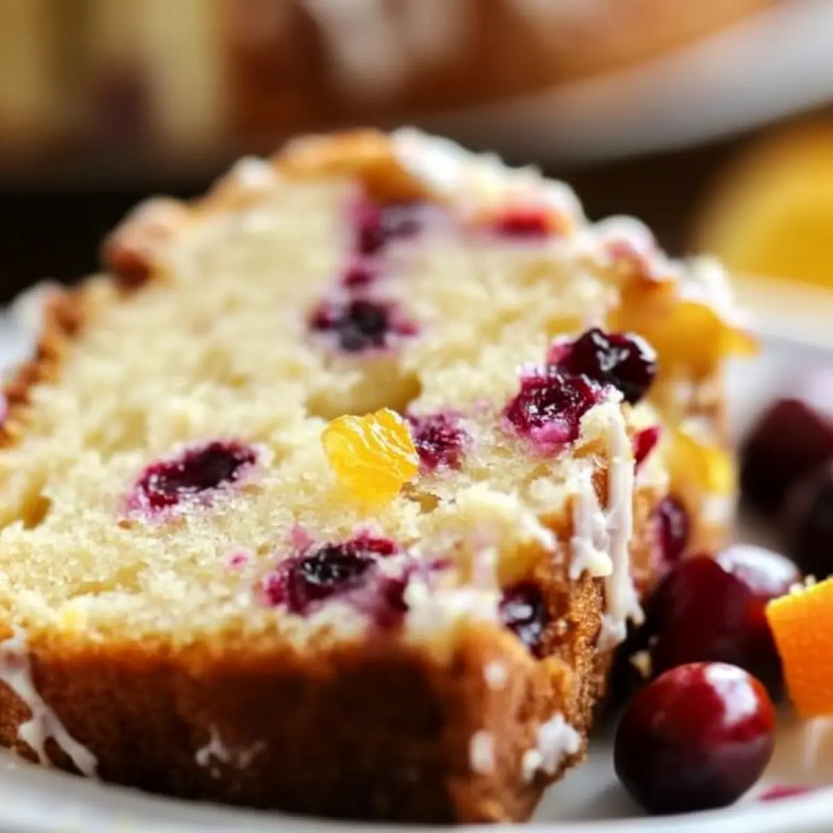 Jump to Recipe Print RecipeAs the scent of oranges dances through my kitchen, I’m reminded of the joy that comes from baking during the holiday season. This Moist Cranberry Orange Pound Cake is not just a recipe; it’s a slice of comfort that brings back memories of festive gatherings and cozy brunches. With its tart cranberries paired perfectly with bright orange zest, this cake strikes a delightful balance between sweetness and a tangy twist. The best part? It’s incredibly easy to whip up and makes for a fabulous make-ahead treat that can be shared at gatherings or gifted to loved ones. Ready to impress your friends and family with a holiday classic that’s sure to melt hearts? Let’s dive into creating this festive delight together! Why Is This Pound Cake a Must-Bake? Moisture, Each slice of this Cranberry Orange Pound Cake boasts a wonderfully moist texture that is impossible to resist. Flavorful bursts of tart cranberries paired with zesty orange elevate your holiday dessert table. Easy preparation means you don’t need to be a culinary expert—anyone can impress with this treat. Make-ahead quality allows for stress-free entertaining; simply bake in advance. Plus, it’s a perfect gift option during the holiday season, sure to delight friends and family. Whether enjoyed solo or with a scoop of vanilla ice cream, this cake promises to become a festive favorite! Cranberry Orange Pound Cake Ingredients For the Cake • Butter – Provides richness and moisture; can be substituted with margarine or non-dairy butter. • Sugar – Sweetens the cake and contributes to its structure; brown sugar can be used for a deeper flavor. • Orange Zest – Adds fresh citrus flavor and aromatic quality; use lemon zest as an alternative for a different citrus note. • Eggs – Binds the ingredients together and adds moisture; aquafaba can be used as a vegan alternative. • Vanilla Extract – Enhances overall flavor; leave out if preferred for a more pronounced citrus taste. • Buttermilk – Provides tenderness to the cake; mix regular milk with a bit of vinegar for a buttermilk substitute. • Fresh Cranberries – Offers tartness and texture; frozen cranberries can also be used without adjusting cooking time. • Flour – Acts as the structure for the cake; all-purpose flour is preferred, or a 1:1 gluten-free blend can be used. • Baking Powder – Leavens the cake, making it rise; ensure it’s fresh for best results. • Salt – Balances sweetness and enhances flavor; a small pinch is usually sufficient. For the Glaze • Powdered Sugar – For making the glaze; can be replaced with a sugar alternative for a low-calorie version. • Orange Juice – Used in the glaze for flavor and consistency; substitute with lemon juice for a different taste. • Milk – Adds moisture to the glaze; use any milk variety, including plant-based, depending on preference. This Cranberry Orange Pound Cake is a treat that’s sure to brighten any holiday gathering! Step‑by‑Step Instructions for Cranberry Orange Pound Cake Step 1: Preheat the Oven Begin by preheating your oven to 350°F (175°C). This is a crucial first step for ensuring that your Cranberry Orange Pound Cake bakes evenly, creating that delightful rise you’re looking for. While the oven warms up, gather all your ingredients and equipment, including mixing bowls, a whisk, and loaf pans. Step 2: Cream Butter and Sugar In a large mixing bowl, combine the softened butter, sugar, and orange zest. Using a hand or stand mixer set on medium speed, beat the mixture for 3-5 minutes until it transforms into a light and fluffy consistency. This process incorporates air, which makes your cake tender and moist. You’ll notice the color lightening up as you mix. Step 3: Add Eggs Once your butter and sugar mixture is ready, crack in the eggs one at a time. After adding each egg, continue to mix for about a minute until fully combined. This step is essential for binding the ingredients together, ensuring a lovely texture in your Cranberry Orange Pound Cake. The mixture should look smooth and creamy. Step 4: Incorporate Vanilla Next, stir in the vanilla extract, blending it into the batter until just combined. This addition enhances the overall flavor profile of the cake. The aroma of the vanilla will complement the fresh orange zest, creating a warm and inviting scent in your kitchen. Step 5: Mix Dry Ingredients In a separate bowl, whisk together the flour, baking powder, and salt. This combination of dry ingredients is crucial for the structure of your cake. By ensuring they are mixed beforehand, you’ll avoid lumps and create a better rise when you mix them with the wet ingredients. Step 6: Combine Wet and Dry Ingredients Gradually add the dry mixture to the wet ingredients, alternating with the buttermilk. Start with the dry ingredients, mix just until combined, and then add some buttermilk. Repeat this process until everything is incorporated. Be careful not to over-mix; you want your Cranberry Orange Pound Cake to remain light and airy. Step 7: Fold in Cranberries Gently fold in the fresh cranberries until they are evenly distributed throughout the batter. This step adds lovely bursts of tartness in every bite of your cake, enhancing the flavor and texture. Use a spatula to mix softly to maintain the airy quality of the batter. Step 8: Prepare the Pans Grease and flour two 9×5 or three 8×4 loaf pans. This ensures easy removal of the cakes after baking and prevents sticking. Once greased, fill each pan about 2/3 full with the batter. You’ll want to leave space for the cakes to rise beautifully in the oven. Step 9: Bake the Cakes Place your filled pans in the preheated oven and bake for 55-60 minutes. Keep an eye on them, and as the time approaches, check for doneness by inserting a toothpick into the center. If it comes out clean, your Cranberry Orange Pound Cake is ready; if not, give it a few more minutes. Step 10: Cool and Glaze After