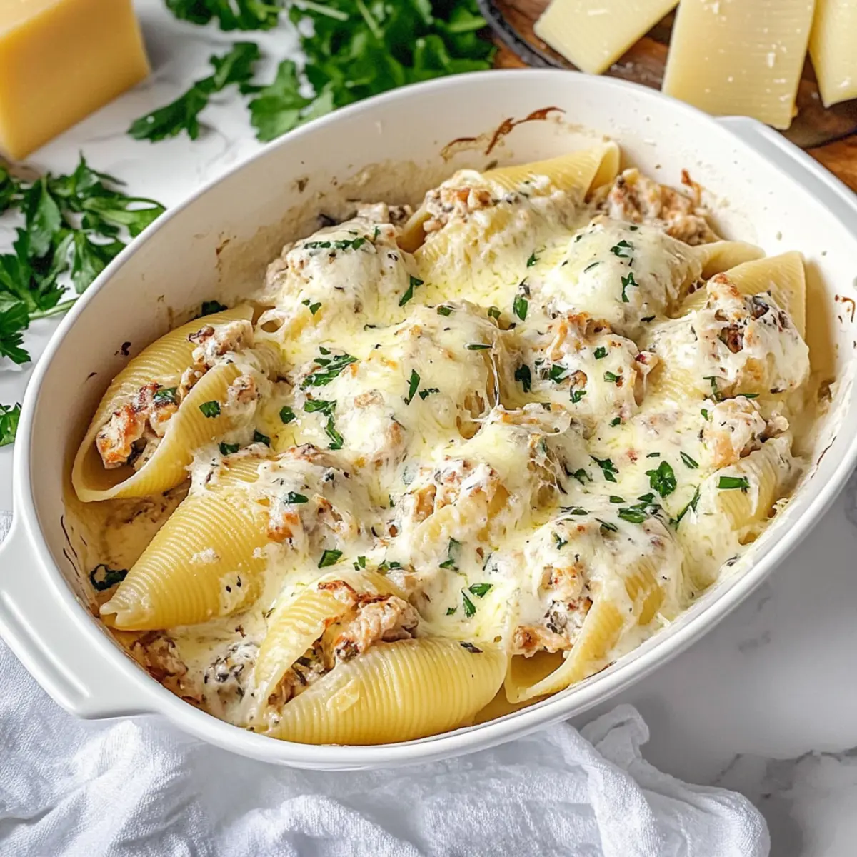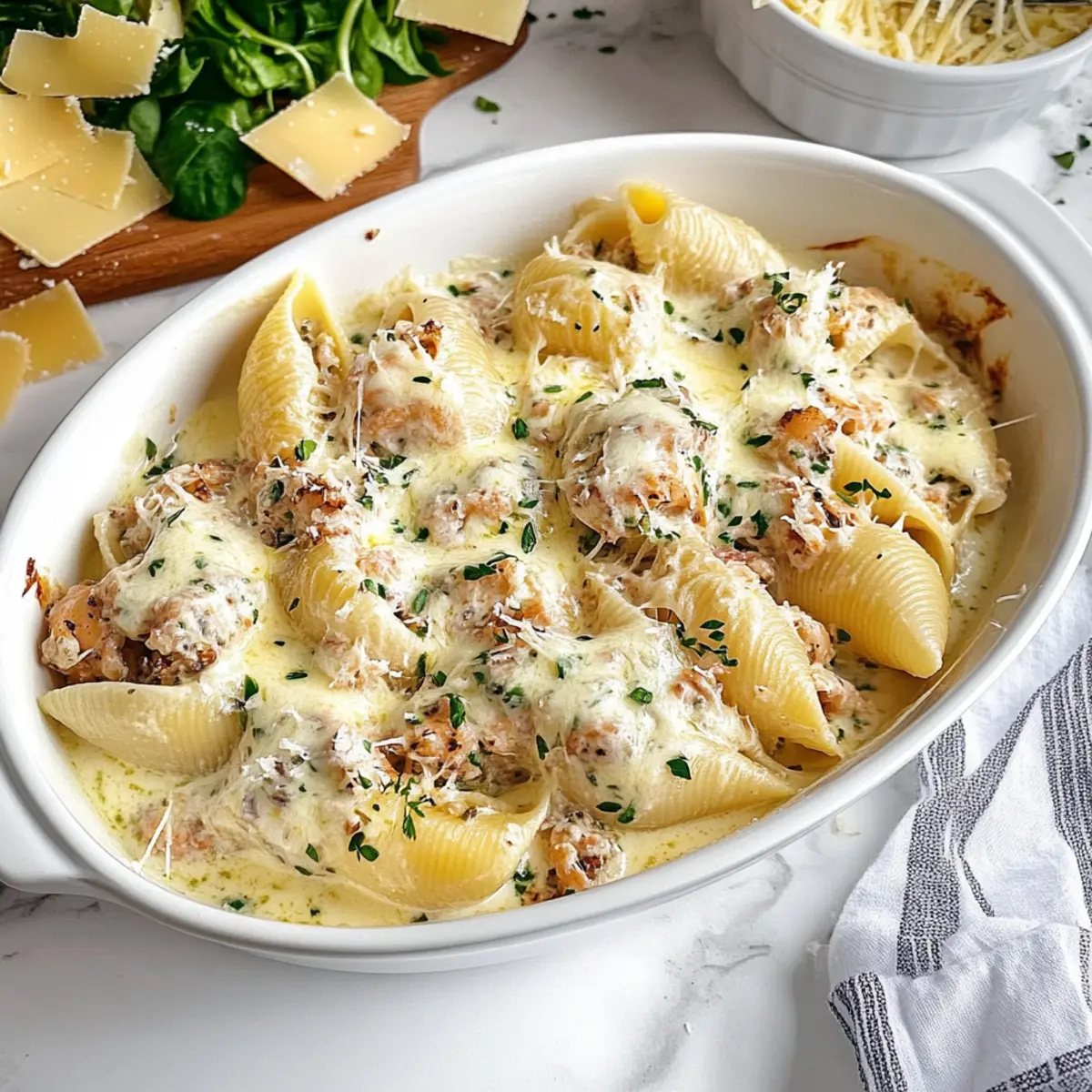 Jump to Recipe Print RecipeAs I stood over the simmering pot, the tantalizing aroma of seafood filled the air, transporting me straight to a cozy waterfront bistro. That’s when I realized how much I missed making my own meals, especially these Creamy Seafood Stuffed Shells. This dish showcases tender pasta embraced by a smooth sherry cream sauce, all harmonizing with a delightful medley of seafood. Not only is it a luxurious option for entertaining, but it’s also wonderfully easy to whip up for a comforting weeknight dinner. Plus, with its flexible filling options, everyone can customize their perfect bite. Are you ready to dive into a delicious seafood adventure with me? Why Are These Stuffed Shells So Special? Creative Customization: Feel free to mix and match seafood options, from succulent shrimp to sweet crab, making each batch uniquely yours. Rich and Luscious: The sherry cream sauce adds an indulgent touch, leaving you wanting more with every bite. Easy Prep: No need to be a gourmet chef; this recipe requires just basic skills to create an impressive dish. Perfect for Any Occasion: Whether it’s a cozy weeknight dinner or an elegant gathering, these Creamy Seafood Stuffed Shells will wow your guests. Make Ahead Option: Prepare your shells in advance, store them in the fridge, and simply bake when ready—saving you time for what really matters! If you’re in the mood for more creative meal ideas, check out our delicious Cheesy Chicken Enchiladas or perhaps a rich Cheesy Broccoli Casserole. Creamy Seafood Stuffed Shells Ingredients For the Pasta Jumbo Shells – Perfectly shaped to hold the delicious filling; medium shells can be a substitute if needed. For the Cream Sauce Unsalted Butter – Adds a rich depth to the sauce; olive oil can replace it for a lighter version. Flour – Thickens the cream sauce for a luscious consistency; cornstarch works as a great gluten-free alternative. Skim Milk & Half and Half – Creates the creamy texture; consider whole milk or heavy cream for a richer flavor. White Pepper – Provides a subtle kick; black pepper is an acceptable substitute if you don’t have white. Coarse Sea Salt – Essential for enhancing flavors throughout; no noteworthy substitutions here. Egg Yolks – Helps to thicken and emulsify the sauce; feel free to omit for a lighter approach. Dry Sherry – Elevates the flavor profile of the cream sauce; you can use apple cider or white wine if sherry is unavailable. Worcestershire Sauce – Adds a tangy flavor to the filling; for a different twist, soy sauce can be utilized. For the Filling Mushrooms – Introduce umami and texture; spinach or zucchini can substitute for a veggie option. White Onion – Adds sweetness and depth; shallots can be used for a milder flavor alternative. Cooked Seafood (1 lb) – The star of the dish; feel free to mix shrimp, crab, and scallops or your favorite seafood combo. Flat Parsley – Enhances freshness and color; fresh dill or chives provide another flavorful option. For Topping Fresh Parmesan Cheese – Melts beautifully over the dish, adding flavor; a blend of mozzarella and cheddar will also work nicely. These Creamy Seafood Stuffed Shells not only promise a delicious meal but the flexibility in ingredients lets you tailor them to your tastes! Step‑by‑Step Instructions for Creamy Seafood Stuffed Shells Step 1: Preheat and Prepare Begin by preheating your oven to 350°F (175°C). While it heats, lightly coat a 9×13-inch baking dish with cooking spray to prevent sticking. This step sets the stage for the Creamy Seafood Stuffed Shells to bake perfectly, ensuring a delightful golden finish. Step 2: Cook the Shells In a large pot of boiling, salted water, cook the jumbo shells according to package instructions, but reduce the cooking time by one minute to ensure they remain firm. Once done, drain the shells and set them aside on a clean kitchen towel, allowing them to cool slightly while you prepare the filling. Step 3: Sauté Vegetables In a medium saucepan, melt 2 tablespoons of unsalted butter over medium heat. Add diced white onion and sliced mushrooms, sautéing until the vegetables become tender and aromatic—about 5 minutes. Once they’re fragrant and softened, remove the pan from heat and set the mixture aside to cool. Step 4: Make the Roux In the same saucepan, add an additional tablespoon of butter and heat over medium-low. Whisk in 2 tablespoons of flour, stirring constantly for about 2 minutes until smooth and bubbly. This roux serves as the base for your creamy sauce, ensuring it’s thick and luxurious. Step 5: Create the Cream Sauce Gradually pour in 1 cup of skim milk and 1 cup of half-and-half, whisking continuously until the mixture is fully combined and slightly thickened. Cook on medium heat for 5 minutes until it begins to simmer gently, then season with white pepper and salt to enhance the flavors in your Creamy Seafood Stuffed Shells. Step 6: Thicken the Sauce In a small bowl, temper the egg yolks by whisking in a few spoonfuls of the hot cream sauce. Once mixed well, stir this combination back into the saucepan, removing it from heat. This thickening step will give your sauce a rich, velvety texture, perfect for enveloping the stuffed shells. Step 7: Combine the Filling In a large mixing bowl, combine the cooled sautéed vegetables, cooked seafood, fresh parsley, and about half of the prepared cream sauce. Gently stir until all ingredients are well coated. This filling will provide a delicious contrast to the tender pasta shells in your Creamy Seafood Stuffed Shells. Step 8: Stuff the Shells Carefully take each jumbo shell and fill it generously with the seafood mixture using a spoon. Place the stuffed shells in the prepared baking dish, ensuring they are snugly arranged. The filling should be visible but not overflowing; this keeps the dish tidy during baking. Step 9: Assemble and Bake Once all shells are stuffed, pour the remaining cream sauce over them, e