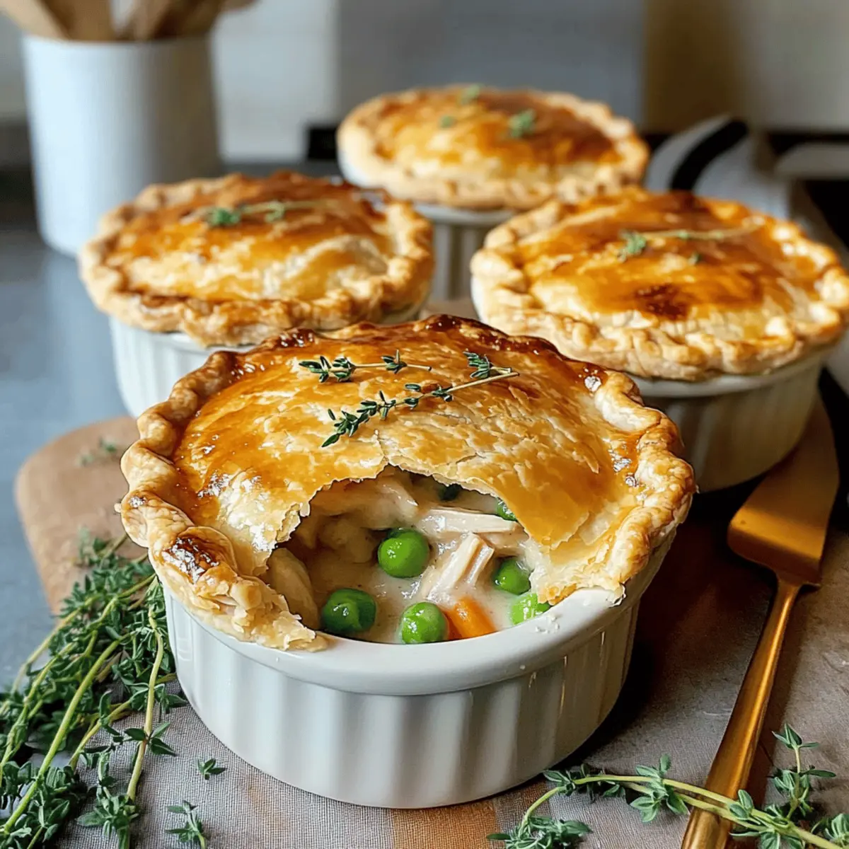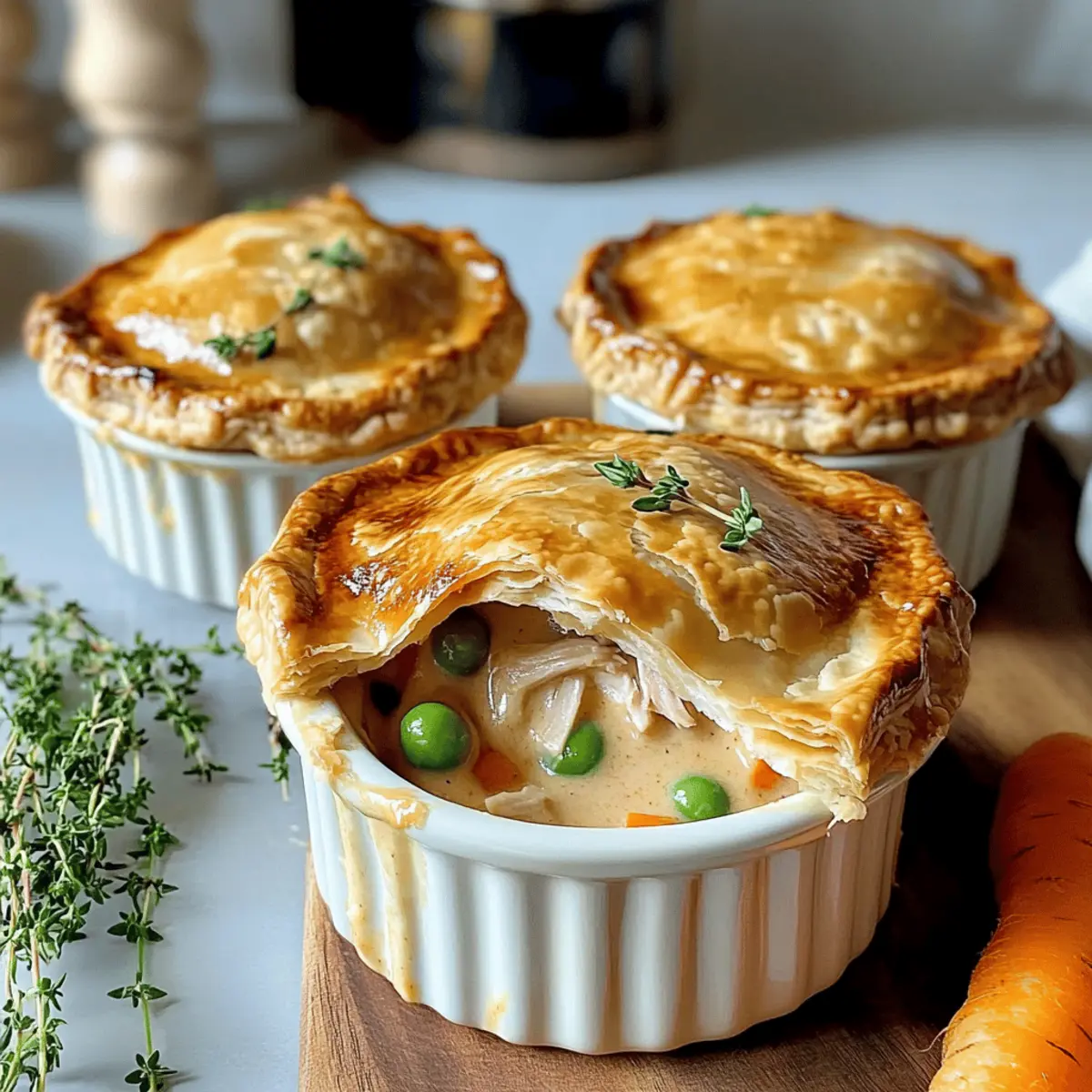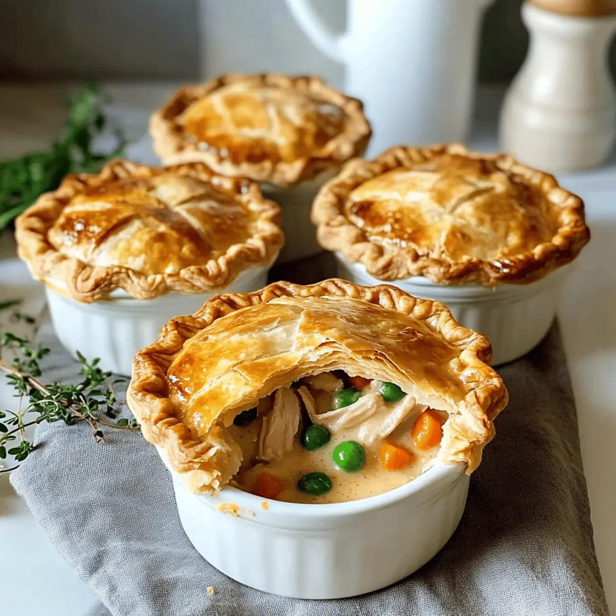 Jump to Recipe Print RecipeAs the first snowflakes of winter begin to dance outside my window, I can’t help but crave the cozy comfort of Creamy Turkey Pot Mini Pies. These little delights bring a wave of nostalgia, serving as the perfect vehicle for leftover turkey, making them a fantastic addition to any festive gathering or simple family dinner. Not only are they incredibly quick to whip up, but they also deliver an irresistible blend of textures—golden, flaky crusts hugging a rich, creamy filling. You’ll find that these mini pies are endlessly versatile; whether you’re using turkey, chicken, or even sautéed veggies, they adapt perfectly to your needs. So, how about we roll up our sleeves and create some kitchen magic together? Your taste buds are in for a delightful surprise! Why Are Creamy Turkey Pot Mini Pies Amazing? Comforting Tradition: These mini pies offer a heartwarming twist on classic comfort food, ideal for cozy nights in. Versatile Options: Whether you’re using leftover turkey, chicken, or going for a veggie-packed version, the adaptability of this recipe ensures everyone is satisfied. Quick Preparation: Best of all, they come together in no time—perfect for those busy weeknights or last-minute gatherings. Mouthwatering Aroma: Picture the delightful scent wafting through your kitchen as they bake; it’s sure to draw a crowd! If you’re a fan of creamy dishes, be sure to check out our Cheesy Chicken Enchiladas for another crowd-pleaser. Creamy Turkey Pot Mini Pies Ingredients For the Crust • Mini Pie Crust – Provides structure and flakiness; you can use store-bought for convenience. For the Filling • Cooked Turkey – This is the main protein that adds heartiness; leftover chicken or beef can be substituted. • Carrots – For a touch of sweetness and vibrant color; feel free to use peas or sweet corn as alternates. • Peas – Adds a pop of freshness and color; you could swap with any green veggie like green beans. • Heavy Cream – This ingredient creates a rich, comforting texture; low-fat cream works well for a lighter version. • Butter – Enhances flavor and helps achieve a flaky crust; margarine can be used if preferred. • Onion – Provides an aromatic base that boosts flavor; shallots can be a milder alternative. • Herbs (Thyme, Parsley) – Add freshness and depth to the dish; experiment with other herbs like rosemary for variety. • Salt & Pepper – Essential for seasoning; adjust according to your taste preferences. Step‑by‑Step Instructions for Creamy Turkey Pot Mini Pies Step 1: Prepare the Filling In a medium skillet, melt 2 tablespoons of butter over medium heat. Sauté 1 diced onion and 1 cup of diced carrots for about 5 minutes, until tender. Stir in 2 cups of shredded cooked turkey and 1 cup of peas, then pour in 1 cup of heavy cream and add fresh thyme and parsley. Season generously with salt and pepper, allowing the mixture to simmer for an additional 2-3 minutes. Remove from heat and let cool slightly to avoid soggy crusts. Step 2: Crust Formation While the filling cools, preheat your oven to 350°F (175°C). Roll out your prepared mini pie crust on a lightly floured surface. Use a round cutter to cut out circles, ensuring they’re large enough to fit your mini pie dishes or muffin tins. Carefully line each dish with the crusts, pressing gently against the sides to create a snug fit. Set them aside as you assemble the pies. Step 3: Assemble Pies Once the Turkey mixture is cooled, spoon about 2 tablespoons of the filling into each crust, being careful not to overfill to prevent spillage during baking. Leave a small border around the edges. This step ensures your Creamy Turkey Pot Mini Pies will bake beautifully without messy edges. Step 4: Top Crust Take another round of pie crust and place it over the filled mini pies, gently crimping the edges to seal securely. Cut a small “X” in the top of each pie to allow steam to escape while baking. This helps the filling cook evenly and keeps your crust golden and flaky. Step 5: Bake Place the assembled mini pies on a baking sheet to catch any drips. Bake in the preheated oven for 30 minutes or until the tops are golden brown and flaky. You’ll know they’re ready when the crusts are beautifully browned and the filling is bubbling at the edges. Step 6: Serve Allow your Creamy Turkey Pot Mini Pies to cool for about 5 minutes before serving. This will help the filling set slightly and make them easier to handle. Garnish with a sprinkle of fresh herbs, and prepare for the cozy warmth and flavors that these delightful mini pies provide! Storage Tips for Creamy Turkey Pot Mini Pies Room Temperature: Enjoy your freshly baked mini pies right away for the best flavor and texture; they’re best consumed within 2 hours of baking. Fridge: Store any leftover Creamy Turkey Pot Mini Pies in an airtight container in the refrigerator for up to 3 days. Reheat in the oven to maintain the flaky crust. Freezer: Unbaked mini pies can be frozen for up to a month; wrap each pie tightly in plastic wrap and foil. Bake directly from frozen, adding an extra 10-15 minutes to the cooking time. Reheating: To reheat baked mini pies, place them in a preheated oven at 350°F (175°C) for about 15-20 minutes, until heated through and the crust is crisp again. Make Ahead Options These Creamy Turkey Pot Mini Pies are a fantastic option for meal prep, saving you valuable time during busy weekdays! You can prepare the filling up to 24 hours in advance by making it and refrigerating it in an airtight container; this allows the flavors to deepen while preventing a soggy crust. The mini pie crusts can also be rolled out and shaped into their containers, ready to be filled just before baking. When it’s time to serve, simply fill the prepared crusts with the chilled turkey mixture, top with the second round of crust, and bake. With these make-ahead steps, you’ll enjoy cozy, delicious mini pies that are ju