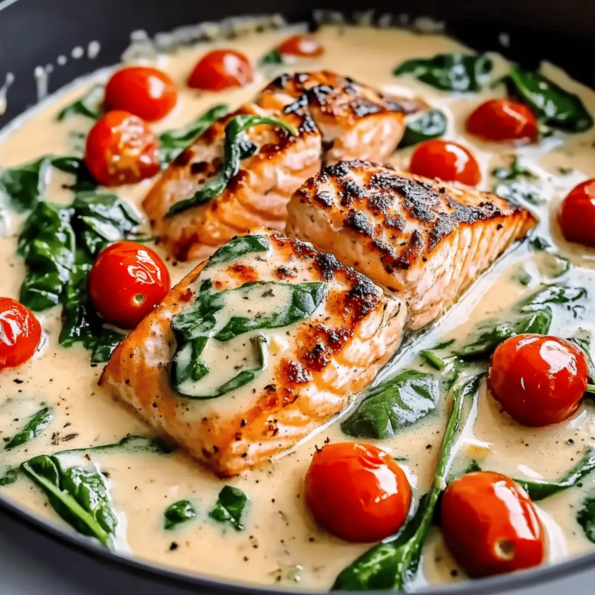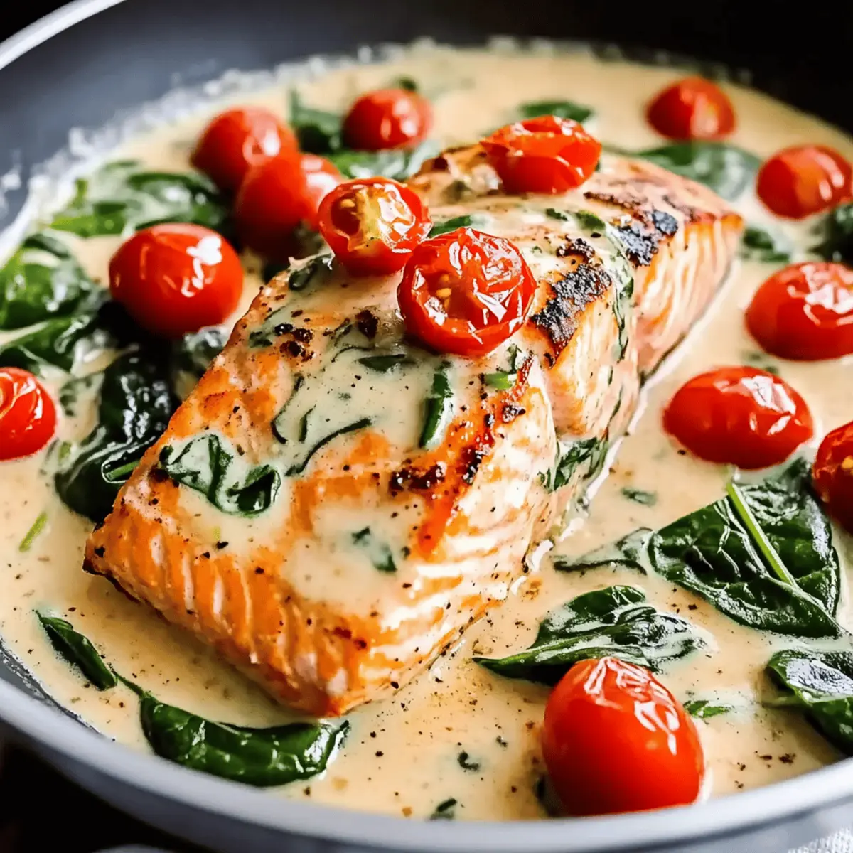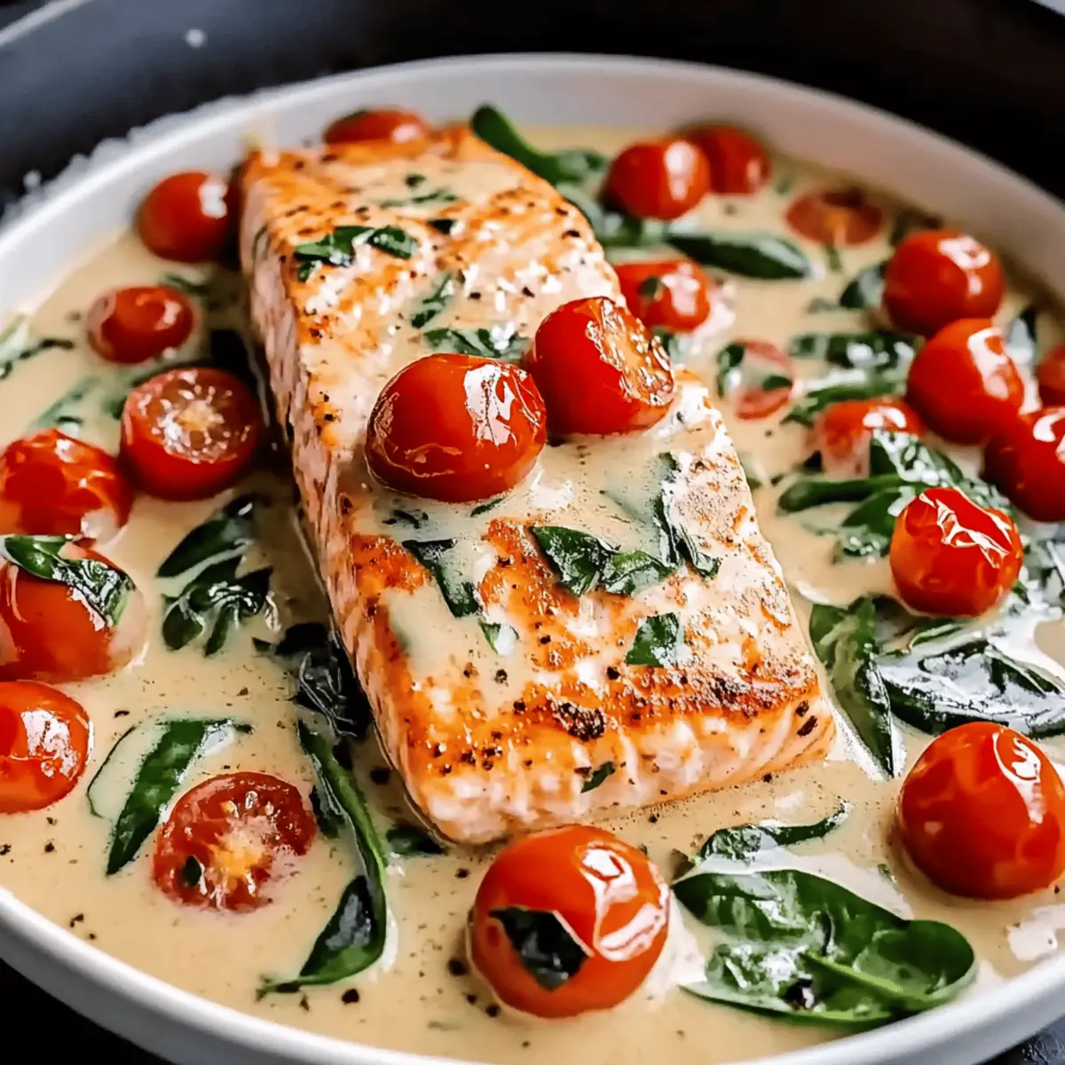 Jump to Recipe Print RecipeAs I stood at my kitchen counter, the aroma of sautéed garlic wafting through the air, I couldn’t help but feel a wave of excitement for my next culinary adventure. Today, I’m sharing my go-to recipe for Creamy Tuscan Salmon—an effortless dish that combines succulent salmon with vibrant veggies and a decadent, creamy sauce. This family-friendly recipe not only comes together in under 30 minutes but is also a healthy, feel-good meal that tastes like it belongs in a fine dining restaurant. The blend of flavors is so delightful that even the pickiest of eaters will have trouble resisting a second helping. Ready to take your dinner routine to a new level of deliciousness? Let’s dive into the savory world of Creamy Tuscan Salmon! Why Is Creamy Tuscan Salmon So Irresistible? Flavor Explosion: The creamy sauce, enriched with garlic and Parmesan, delivers an irresistible taste that lingers on your palate. Quick Prep Time: Whip up this dish in under 30 minutes, making it the perfect solution for busy weeknights or spontaneous dinner parties. Nutrient-Rich Ingredients: Bursting with fresh spinach and tomatoes, this recipe is as healthy as it is indulgent, offering essential vitamins with every bite. Customizable: Feel free to adapt the recipe with ingredients like whole wheat pasta or add a dash of lemon zest for a zingy twist! Family-Friendly: Even the pickiest eaters in your household won’t be able to resist this creamy delight, ensuring everyone leaves the table satisfied. Check out Garlic Butter Salmon for another delicious twist on salmon that your family will adore! Creamy Tuscan Salmon Ingredients For the Salmon Salmon fillets – Fresh, high-quality salmon enhances flavor and texture. For the Sauce Olive oil – Cooking fat for flavor and moisture; butter works as a substitute. Garlic (minced) – Adds aromatic depth; use garlic powder if fresh isn’t available. Cherry tomatoes (halved) – Offers sweetness and acidity; diced regular tomatoes can be used instead. Fresh spinach – Adds vibrant color and nutrients; frozen spinach is a good alternative if fresh isn’t on hand. Heavy cream – Creates that signature creamy sauce; coconut cream is a dairy-free option. Chicken broth – Provides moisture and additional flavor; vegetable broth can make it vegetarian-friendly. Grated Parmesan cheese – Contributes a rich, umami flavor; nutritional yeast serves as a dairy-free alternative. Italian seasoning – Provides a blend of herbal notes; create a mix using dried basil, oregano, and thyme in a pinch. Salt and pepper – Essential for enhancing flavor; adjust according to your taste preference. For Garnish Fresh basil – Adds freshness and a pop of color; you can omit if it’s not available. Now that you have all the ingredients for the Creamy Tuscan Salmon, let’s make a meal that will impress your family and friends while being quick and nutritious! Step‑by‑Step Instructions for Creamy Tuscan Salmon Step 1: Prep Ingredients Begin by gathering all your ingredients for the Creamy Tuscan Salmon. This includes fresh salmon fillets, garlic, cherry tomatoes, spinach, heavy cream, chicken broth, Parmesan cheese, and your seasonings. Wash and dry the spinach and tomatoes, and mince the garlic. Having everything ready will streamline your cooking process and ensure a delightful meal with minimal fuss. Step 2: Heat Pan In a large skillet, heat 2 tablespoons of olive oil over medium-high heat. Allow the oil to shimmer, indicating that it’s hot enough to begin cooking. This typically takes about 2 minutes. A properly heated pan will give your salmon that beautiful golden crust while keeping it tender and juicy inside, setting the stage for your Creamy Tuscan Salmon. Step 3: Cook Salmon Carefully place the seasoned salmon fillets into the skillet skin-side down. Cook for approximately 4-5 minutes until the underside is golden brown. Gently flip the fillets and cook for another 4-5 minutes. They should flake easily with a fork and reach an internal temperature of 145°F (63°C). Once cooked through, transfer the salmon to a plate and cover it with foil to keep warm. Step 4: Sauté Garlic and Tomatoes In the same skillet, reduce the heat to medium and add minced garlic. Sauté for about 1 minute until fragrant, being careful not to burn it. Then, add the halved cherry tomatoes, cooking for 2-3 minutes until they soften and burst slightly, releasing their juices. This will infuse the skillet with amazing flavor, enhancing the sauce for your Creamy Tuscan Salmon. Step 5: Add Spinach Stir in the fresh spinach and cook for an additional 2 minutes until wilted. The vibrant green leaves will cook down and play a key role in balancing the richness of the creamy sauce. Mix everything well to combine the garlic and tomatoes with the spinach, creating a colorful base for your dish. Step 6: Make the Sauce Pour in 1 cup of heavy cream and 1/2 cup of chicken broth, stirring the mixture together. Then, add 1/3 cup of grated Parmesan cheese and the Italian seasoning. Allow the sauce to simmer for about 3-4 minutes, stirring occasionally, until it thickens slightly and becomes creamy. This rich sauce is a highlight of the Creamy Tuscan Salmon, bringing together all the ingredients harmoniously. Step 7: Combine Ingredients Return the cooked salmon to the skillet, spooning the luscious sauce over each fillet. Let it simmer for an additional 2-3 minutes to warm through and let the flavors meld together. This final step elevates the dish, ensuring each bite is generously coated in creamy goodness and packed with flavor. Step 8: Serve and Garnish Remove the skillet from heat and plate your Creamy Tuscan Salmon. Garnish with freshly chopped basil for a pop of color and freshness. This delightful dish can be served warm alongside rice, pasta, or roasted vegetables. Enjoy the comforting and indulgent flavors that are sure to please everyone at the table! What to Serve with Creamy