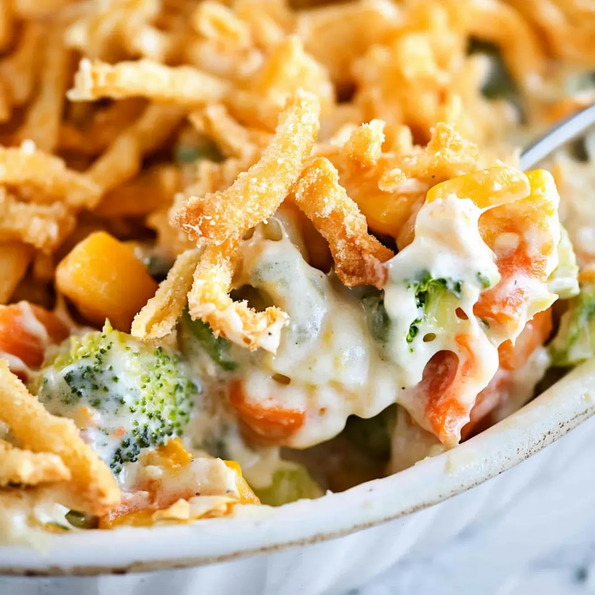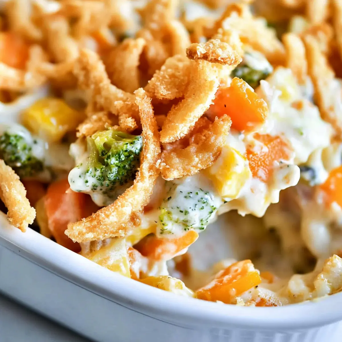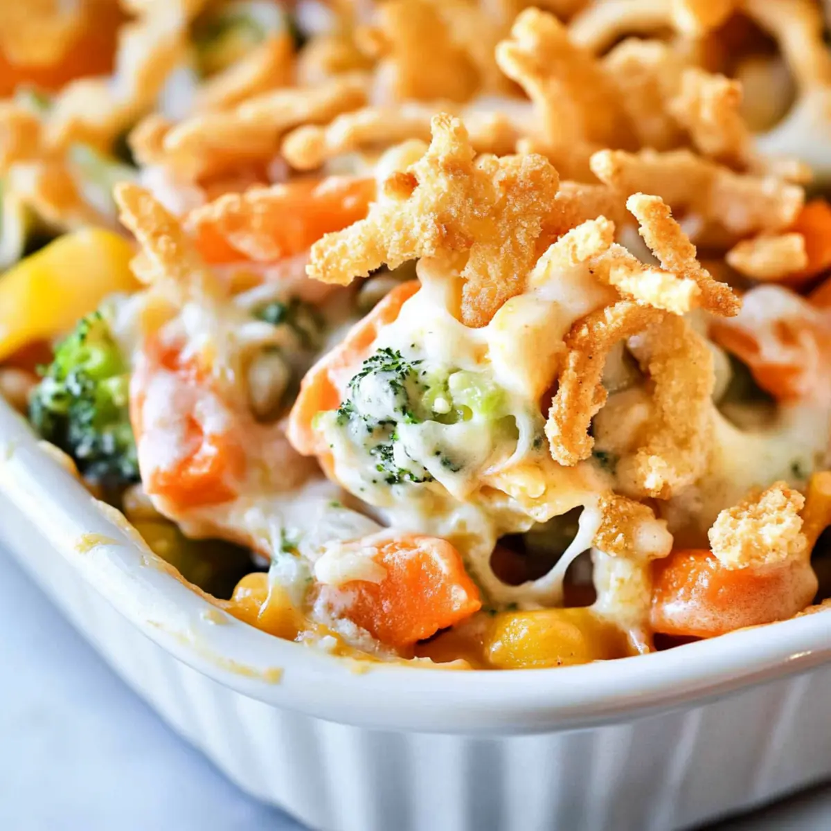 Jump to Recipe Print RecipeAs the holidays approach, I’m reminded of the comforting aromas that drift from the kitchen, filling every nook with warmth and cheer. One dish that never fails to bring smiles and hearty appetites to the table is my Creamy Vegetable Casserole. This vegetarian-friendly delight beautifully combines tender vegetables with a luscious cheese sauce and a satisfying crunch from crispy fried onions. Not only is it a breeze to prepare, but it also makes a fantastic side dish for holiday feasts or family gatherings. Your loved ones won’t even realize they’re indulging in a veggie-packed treat! Are you ready to elevate your cooking and impress your guests with this creamy classic? Let’s dive in! Why is this casserole a must-try? Comforting, creamy goodness: This Creamy Vegetable Casserole envelops vibrant vegetables in a rich cheese sauce that feels like a warm hug on your plate. Versatile variations: You can easily swap veggies or cheeses to cater to dietary needs, keeping it exciting for every meal. Crowd-pleaser: Perfect for gatherings, this dish will appeal to both veggie lovers and skeptics alike, making it a hit at any holiday table. Make-ahead convenience: You can prep it a day in advance, saving you time and stress when it’s time to serve your guests. Easy steps: With straightforward instructions, it’s a breeze to whip up, allowing even novice cooks to shine. Elevate your dinner game with this delightful casserole that pairs wonderfully with main courses and can stand alone as a vegetarian option. Creamy Vegetable Casserole Ingredients For the Casserole Mixed Vegetables (24 oz) – Provides bulk and nutrition; opt for frozen or 8 cups of fresh, cooked veggies for texture. Butter (¼ cup) – Adds richness and serves as the base for the cream sauce. Flour (2 tablespoons) – Thickens the cream sauce for a smooth consistency. Minced Onion (1 teaspoon) – Introduces aromatic flavor; can be fresh or dehydrated for convenience. Milk (1 cup) – Creates the creaminess of the sauce; whole or low-fat milk works beautifully here. Salt (½ teaspoon) – Enhances flavor; adjust to your personal taste preferences. Pepper (¼ teaspoon) – Adds a touch of sharpness; increase for a spicier kick. Cream Cheese (4 oz, softened) – Contributes to the creamy texture; Neufchatel can be a lighter substitute. Shredded Cheddar Cheese (4 oz) – Adds cheesiness and flavor; feel free to swap with your favorite cheese variety. For the Topping French Fried Onions (½ cup) – Provides a satisfying crunchy topping; crushed crackers could serve as a tasty alternative. Not only does this Creamy Vegetable Casserole shine as a comforting side dish, but it also offers flexibility with ingredient swaps, ensuring it pleases everyone’s palate. Step‑by‑Step Instructions for Creamy Vegetable Casserole Step 1: Preheat Oven Begin by preheating your oven to 350°F (175°C). This ensures that your Creamy Vegetable Casserole bakes evenly while developing that enticing golden crust. Make sure your oven rack is positioned in the center of the oven for optimal heat distribution. Step 2: Prepare Vegetables Cook your mixed vegetables according to package instructions until they are tender, which usually takes about 5-7 minutes for frozen veggies. Drain any excess water and pour them into a greased 9-inch pie pan, spreading them evenly to create a solid base for your casserole. Step 3: Make the Cream Sauce In a medium saucepan over medium-low heat, melt ¼ cup of butter and add 2 tablespoons of flour along with 1 teaspoon of minced onion. Whisk continuously until the mixture turns lightly golden, about 3 minutes. This forms a roux, the key to a creamy sauce without lumps. Step 4: Add Liquid Ingredients Gradually pour in 1 cup of milk while whisking to ensure smoothness, followed by ½ teaspoon of salt and ¼ teaspoon of pepper. Continue cooking this mixture while stirring, until it thickens and bubbles gently, which should take about 4-5 minutes, creating a luscious sauce. Step 5: Combine Cream Cheese Once your cream sauce has thickened, lower the heat and stir in 4 ounces of softened cream cheese. Mix until fully incorporated and smooth. This creamy base will envelop the vegetables, giving the casserole its delightful richness. Step 6: Assemble the Casserole Carefully pour the creamy sauce over the cooked vegetables in the pie pan. Using a spatula, gently mix everything together until the vegetables are evenly coated in the smooth, rich sauce. This will ensure every bite of your Creamy Vegetable Casserole is bursting with flavor. Step 7: Add Cheese Topping Sprinkle 4 ounces of shredded cheddar cheese over the top of your casserole, allowing it to blanket the creamy mixture. The cheese will melt and create a deliciously gooey texture, enhancing the flavor of this comforting dish. Step 8: Bake the Casserole Place the assembled casserole in the preheated oven and bake for 25 minutes. You’ll know it’s done when the cheese is melted and bubbly, and the edges start to turn a light golden brown, filling your kitchen with a wonderful aroma. Step 9: Finish with Fried Onions After 25 minutes, remove the casserole from the oven and sprinkle ½ cup of French fried onions evenly on top. Return it to the oven for an additional 5 minutes, until the onions are crispy and golden, adding a satisfying crunch to your Creamy Vegetable Casserole. Step 10: Let It Rest Once baked, allow the casserole to cool for a few minutes before serving. This rest period will help the layers set slightly, enhancing the presentation and making it easier to serve. Enjoy this delightful dish alongside your favorite holiday mains! Creamy Vegetable Casserole Variations Feel free to put your personal spin on this delightful casserole, bringing out your creativity in the kitchen. Seasonal Veggies: Substitute mixed vegetables with fresh seasonal options like zucchini, bell peppers, or spinach for added flavor and nutrition. Using 
