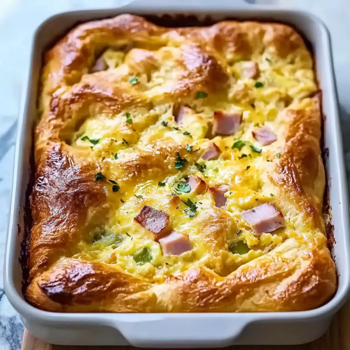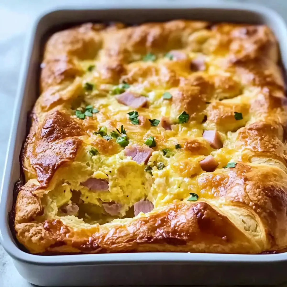 Jump to Recipe Print RecipeThere’s something magical about waking up to the warm aroma of a freshly baked breakfast casserole. My Tasty Crescent Roll Breakfast Casserole envelops a delicious blend of creamy eggs, savory ham, and lively jalapeños, all tucked within a flaky crescent crust. This dish is perfect for those busy weekend mornings when time is short but hearty meals are still a must. With an easy prep and the option to make it ahead of time, this casserole is a crowd-pleaser that’s sure to keep your loved ones satisfied until lunch. What’s your favorite way to start the day? Why Is This Casserole a Must-Make? Simplicity in Preparation: Just a few simple steps make it easy for anyone, even novice cooks, to whip up this breakfast delight. Make-Ahead Convenience: Prepare it the night before and pop it in the oven on busy mornings, giving you more time to enjoy your coffee. Flavor Explosion: The combination of creamy cheese, savory ham, and a kick of jalapeño makes every bite a burst of flavor. Crowd-Pleasing Appeal: Perfect for family brunches or gatherings, this dish doesn’t just fill plates; it fills hearts! Textural Variety: Enjoy the contrast of flaky crescent crust with a fluffy, cheesy interior, making it a satisfying start to your day. Elevate your breakfast game with this tasty dish, and if you’re looking for more delicious mornings, check out Bagel Breakfast Sliders for another crowd-pleaser! Crescent Roll Breakfast Casserole Ingredients For the Filling Cream Cheese – Adds richness and creaminess to the filling; using cream cheese offers the best texture. Large Eggs – Forms the custard base that binds the dish; make sure to use fresh eggs for optimal flavor. Whole Milk – Creates a creamy custard texture; you can swap this out with half-and-half or non-dairy milk for a dairy-free option. Diced Ham – Provides protein and savory flavor; feel free to substitute it with cooked bacon or sausage for different tastes. Jalapeño – Adds a spicy kick; omit or replace it with bell pepper for a milder flavor profile. Freeze-Dried Parsley – Offers a mild herbal flavor and color; fresh parsley can be substituted if you prefer. Ground Pepper – Enhances flavor; freshly ground pepper elevates the dish. For the Crust Crescent Roll Dough – Forms the flaky base of the casserole; you can pick any brand, but Pillsbury is highly recommended for its reliability. For the Cheesy Goodness Shredded Cheese (Cheddar or Mexican Blend) – Provides a melty, cheesy texture; any melting cheese works exceptionally well for this crescent roll breakfast casserole. For Seasoning Sea Salt – Balances flavors perfectly; use kosher salt for better results in cooking. With these ingredients, you’re ready to create a heartwarming, satisfying breakfast that will be the talk of the table. Enjoy your culinary adventure! Step‑by‑Step Instructions for Crescent Roll Breakfast Casserole Step 1: Preheat and Prepare the Dish Begin by preheating your oven to 375°F (190°C) and generously butter a 9×13 inch baking dish. This ensures that your Tasty Crescent Roll Breakfast Casserole won’t stick during baking. As the oven heats, take the opportunity to gather all your ingredients, keeping your workspace organized for a smooth cooking experience. Step 2: Mix the Egg Filling In a large mixing bowl, beat together 6 large eggs with 1 cup of whole milk until the mixture is frothy and well combined. Season your egg blend with a pinch of sea salt and freshly ground pepper for enhanced flavor. Fold in 1 cup of shredded cheese, 1 cup of diced ham, 1 finely diced jalapeño, and 1 tablespoon of freeze-dried parsley to create a creamy, savory filling that will be the star of your casserole. Step 3: Prepare the Crescent Rolls Open and unroll the crescent roll dough onto a clean surface. Spread about ½ teaspoon of cream cheese onto the wide end of each triangle, then carefully roll them up tightly from the wide end to the point, placing each roll seam-side down in your buttered baking dish. This flaky base is essential for your Crescent Roll Breakfast Casserole, so ensure they fit snugly in the dish without overcrowding. Step 4: Pour the Egg Mixture Once all the crescent rolls are in the baking dish, evenly pour the egg mixture over the top, ensuring that it seeps between the rolls for complete flavor distribution. You want to cover the rolls entirely but avoid overfilling to prevent any spillage while baking. With the filling now layered on top, the deliciousness is about to come to life! Step 5: Bake to Perfection Place the dish in the preheated oven and bake for 30-40 minutes, or until the top is golden brown and the casserole is set with a slight jiggle in the center. Keep an eye on it as it bakes, and you’ll know it’s ready when you see a delightful golden crust forming on top—this signaling that your Crescent Roll Breakfast Casserole is nearly complete. Step 6: Rest and Serve Once baked to perfection, remove the casserole from the oven and let it rest for about 5 minutes. This resting period is crucial for easy slicing and helps the casserole firm up slightly. As it cools, the aromas from the hearty ingredients will fill your kitchen, inviting everyone to the table. Slice and serve warm, allowing each person to indulge in this comforting breakfast delight. Storage Tips for Crescent Roll Breakfast Casserole Fridge: Store leftovers in an airtight container for up to 4 days. Allow the casserole to cool completely before sealing to maintain its freshness. Freezer: Wrap portions tightly in plastic wrap or aluminum foil, then place in a freezer-safe bag or container. They can be frozen for up to 2 months. Reheating: For best results, reheat slices in the oven at 350°F (175°C) for about 15-20 minutes, or microwave for a quick warm-up, ensuring the center is heated through. Make-Ahead: For busy mornings, you can prepare the Crescent Roll Breakfast Casserole the night before, cover it with plastic 