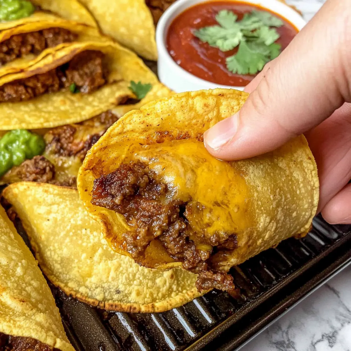 Jump to Recipe Print RecipeAs I rummage through my pantry, I’m greeted by the familiar scents of cumin and chili powder, instantly transporting me to my favorite taco joint. Enter Crispy Baked Beef Tacos, a delightful take on a classic that brings the bold flavors of Tex-Mex right to your dinner table. This recipe is a lifesaver for busy weeknights, ready to serve in just 35 minutes with only six ingredients! Not only is it an effortless crowd-pleaser, but it’s packed with protein and guarantees a crispy exterior that’s hard to resist. Each bite offers a satisfying crunch and a melty cheese filling, perfect for dipping in salsa, queso, or guacamole. Who’s ready to transform taco night into a fun, flavorful tradition? Why are Crispy Baked Beef Tacos a game-changer? Simplicity at Its Best: Just six ingredients make meal prep a breeze. Unforgettable Flavor: The taco seasoning and enchilada sauce blend beautifully for a punchy taste. Healthier Option: Enjoy the crispy texture without the guilt of frying! Perfect for Any Gathering: Whether it’s a family dinner or a taco night with friends, these tacos are always a hit. Quick to Make: In only 35 minutes, you can whip up these delicious tacos, freeing up your evening for more fun! Pair them with a refreshing side of Apple Cranberry Coleslaw or indulge in some zesty Oven Baked Lemon Garlic Salmon for a complete meal that everyone will love! Crispy Baked Beef Tacos Ingredients For the Beef Filling Lean Ground Beef – Provides essential protein and savory flavor; ground turkey or chicken can be used for a lighter option. Taco Seasoning – Offers a spiced flavor profile; feel free to make your own with cumin, chili powder, and garlic powder. Red Enchilada Sauce – Moistens the filling while adding a tangy kick; green enchilada sauce can be swapped for a different taste. For the Tacos Oaxaca Cheese (or Mexican cheese/Monterey Jack) – This cheese adds creaminess and that perfect gooey melt; if you prefer a sharper flavor, cheddar works great too. Corn Tortillas – Provides the crispy shell; remember to warm them to avoid cracking! Olive Oil – Helps to achieve that delectable crispiness in the oven; any light cooking oil can be used, or omit entirely for a non-fried option. These Crispy Baked Beef Tacos are not only easy to prepare but also deliver a delightful crunch that’ll have your family asking for seconds! Step‑by‑Step Instructions for Crispy Baked Beef Tacos Step 1: Preheat the Oven Begin by preheating your oven to 450°F (232°C) to ensure it’s hot enough for that perfect crunch. This step is crucial for achieving the crispy exterior you’ll love in these Crispy Baked Beef Tacos. While the oven preheats, gather your ingredients and prepare to assemble your filling. Step 2: Brown the Beef In a large skillet over medium-high heat, add the lean ground beef, breaking it apart with a wooden spoon. Cook for about 5-7 minutes until browned and no longer pink; this is when the delicious aroma fills your kitchen! Stir in the taco seasoning and red enchilada sauce, allowing it to simmer for 2-3 minutes until the flavors meld. Remove from heat once combined. Step 3: Prepare the Tortillas To ensure your corn tortillas are pliable and easy to fold, wrap them in a damp paper towel and microwave for 30-60 seconds. This step prevents cracking and breaking while assembling your Crispy Baked Beef Tacos. Keep an eye on them! They should be warm and soft. Step 4: Brush with Olive Oil Carefully lay the warmed tortillas flat on a clean surface and brush one side of each with a thin layer of olive oil. This oiled side will face down on the baking sheet, helping to create the crispy texture we love in baked tacos. Make sure to evenly coat so every taco has that golden finish! Step 5: Assemble the Tacos On the un-oiled side of each tortilla, sprinkle about 2 tablespoons of cheese, followed by ¼ cup of the beef mixture, and then another 2 tablespoons of cheese. Carefully fold the tortilla in half over the filling, pressing gently to secure it closed. The cheese will help to hold everything together as they bake! Step 6: Bake the Tacos Arrange the assembled tacos in a single layer on a nonstick or ceramic baking sheet, taking care not to overcrowd them. Bake in your preheated oven for 16 minutes, or until they are golden brown and crispy. You’ll know they’re ready when the cheese is bubbling out, and the edges have that delightful crunch. Step 7: Cool and Serve Once baked, remove the Crispy Baked Beef Tacos from the oven and let them cool for about 3 minutes before serving. This cooling time allows the flavors to settle and makes them easier to handle. Pair with your favorite salsa, guacamole, or sour cream for a delicious dip! Storage Tips for Crispy Baked Beef Tacos Fridge: Store cooked tacos in an airtight container for up to 3 days. Let them cool completely before sealing to maintain texture and flavor. Freezer: To freeze, assemble tacos without oil, place them on a baking sheet, and freeze for 1 hour. Transfer to a freezer-safe bag for up to 3 months. Reheating: For the crispiest results, reheat tacos in the oven at 400°F for 10-12 minutes until heated through and crisp. Enjoy your deliciously flavorful Crispy Baked Beef Tacos! What to Serve with Crispy Baked Beef Tacos Transform your taco night into a delightful feast with these tasty pairings that complement each crunchy bite. Apple Cranberry Coleslaw: This fresh and zesty slaw adds a crisp texture and a sweet-tangy balance to the savory tacos. Guacamole: Smooth and creamy, guacamole is a must-have dip that enhances every bite with a burst of richness. Mexican Rice: Fluffy and flavorful, this dish adds a satisfying element, soaking up any leftover salsa or sauce. Black Bean Salad: Packed with protein and fiber, this refreshing salad offers a hearty contrast to the crunchy tacos. Corn on the Cob: Grilled or boiled, it provides a sweet pop of flavor that pairs beautifully with the s