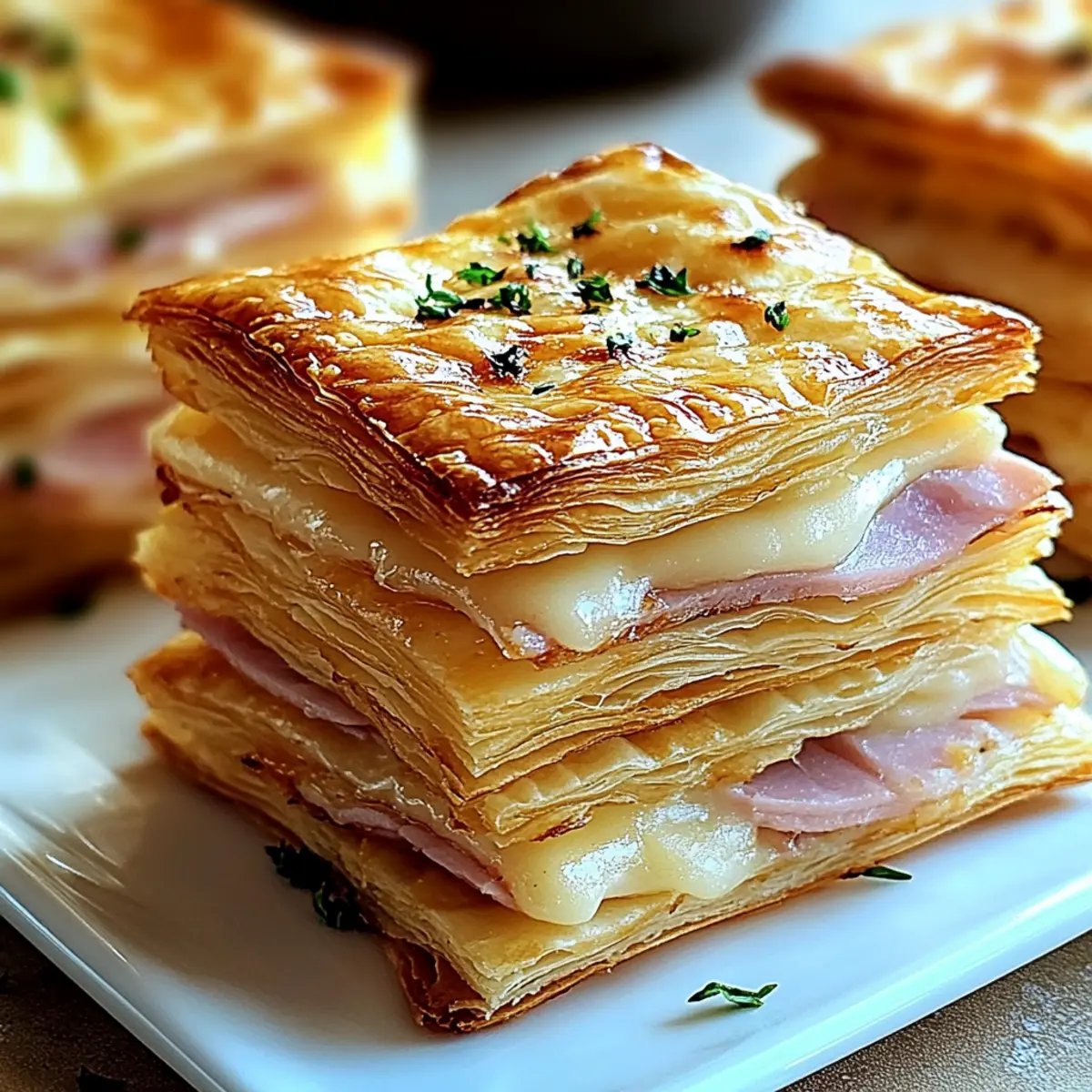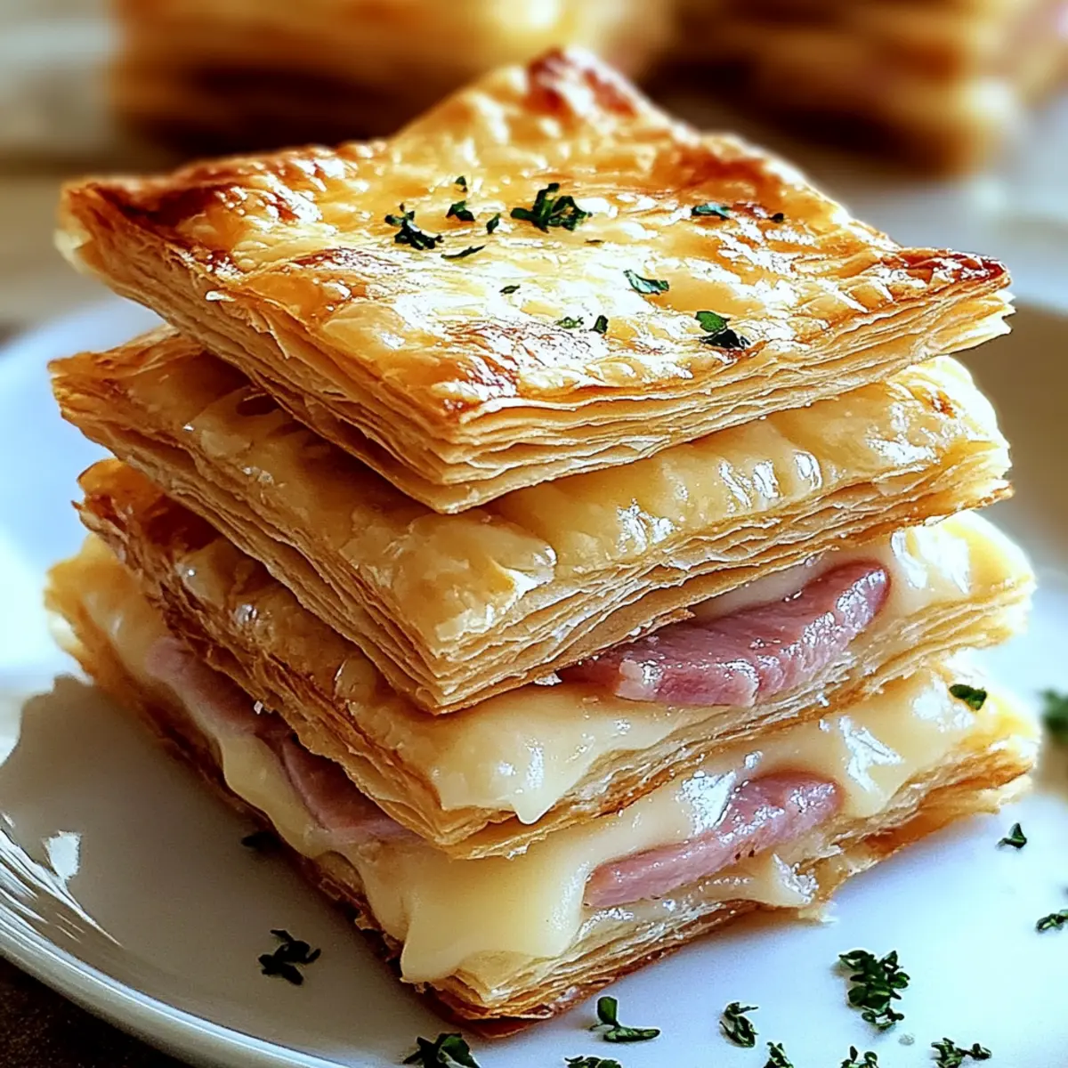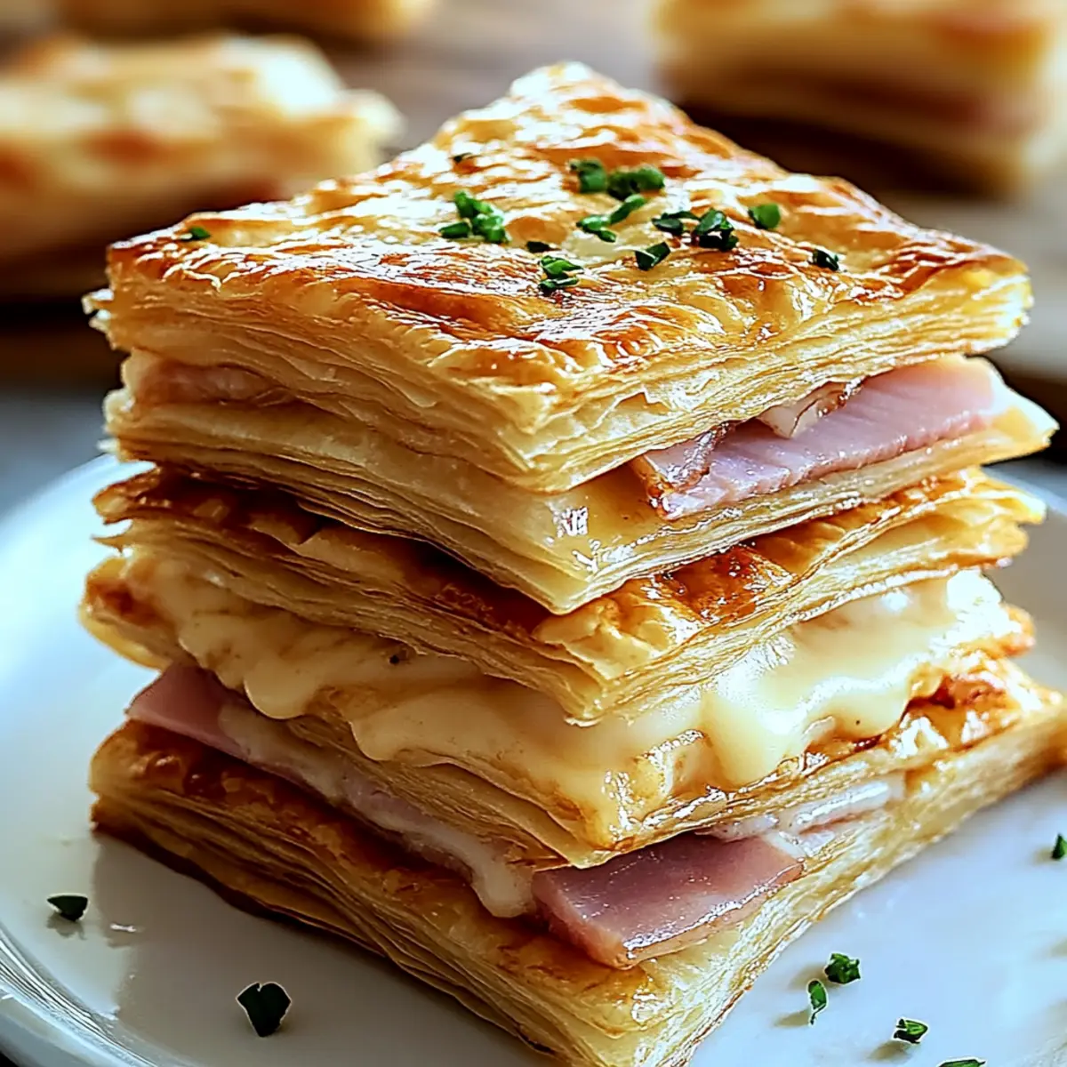 Jump to Recipe Print RecipeAs I flipped through my go-to cookbook, a delightful aroma whisked me away to a cozy cafe where the simplest ingredients create magic. That’s how I stumbled upon these Crispy Ham & Cheese Puff Pastry Stacks—each bite embodies savory bliss wrapped in flaky perfection. Whether you’re hosting a brunch or just craving a treat, this recipe offers a quick and delicious appetizer that promises to impress with minimal fuss. The beauty of these stacks lies not only in their ease of preparation but also in their versatility; swap out ham for turkey, or try a medley of cheeses for a unique twist! Ready to transform your gatherings with a touch of homemade magic? Let’s dive into this irresistible recipe together! Why are These Puff Pastry Stacks Irresistible? Crispy Layers: The flaky puff pastry creates a delightful crunch, while each bite reveals a warm, cheesy goodness. Versatile Options: Customize with turkey or your favorite cheese, allowing for endless flavor combinations. Perfect for Any Occasion: Whether it’s a casual snack or a fancy brunch, these stacks will always impress! Quick and Easy: With just a few simple ingredients and minimal prep, you can whip these up in no time. Crowd-Pleasing Treat: Everyone will love these bites—serve warm with a side of mustard or one of your favorite dipping sauces, and watch them disappear! Crispy Ham & Cheese Puff Pastry Ingredients For the Puff Pastry Stacks • Puff Pastry Sheets – Provides the flaky, buttery layers; fresh is best for optimal texture. • Sliced Ham – Adds a savory element; substitute with turkey for a leaner choice. • Shredded Cheese – Creates a gooey filling; cheddar or Swiss are classic, while gouda or pepper jack adds a twist. • Egg (for Egg Wash) – Enhances browning and gives a beautiful sheen; a plant-based milk can be used for a vegan alternative. Feel free to customize your crispy ham & cheese puff pastry stacks for a personal touch! Step‑by‑Step Instructions for Crispy Ham & Cheese Puff Pastry Stacks Step 1: Preheat the Oven Begin by preheating your oven to 400°F (200°C). While the oven warms up, line a large baking sheet with parchment paper to prevent sticking and make clean-up easier. This initial step sets the stage for achieving that perfect golden crust on your Crispy Ham & Cheese Puff Pastry Stacks. Step 2: Prepare the Puff Pastry On a lightly floured surface, roll out your puff pastry sheets with a rolling pin to increase their size slightly. Aim for an even thickness that ensures flakiness once baked. This step is important for building the delightful layers in your stacks, and fresh puff pastry will yield the best results. Step 3: Cut the Pastry Squares Using a sharp knife or pastry cutter, slice the rolled puff pastry into 4-inch squares. This size is ideal for stacking your ingredients without overwhelming each bite. Ensure the cuts are clean to help achieve perfectly crisp edges in your Crispy Ham & Cheese Puff Pastry Stacks. Step 4: Assemble the Stacks Take half of your pastry squares and layer slices of ham and shredded cheese in the center. Then, place the remaining squares on top, pressing down gently to seal. Use the tines of a fork to crimp the edges tightly, ensuring that the cheesy goodness stays inside during baking. Step 5: Apply the Egg Wash In a small bowl, whisk together an egg with a splash of water to create a shiny egg wash. Brush this mixture evenly over the tops of your assembled stacks for a beautiful, golden finish. This simple step enhances both the appearance and flavor of the Crispy Ham & Cheese Puff Pastry Stacks. Step 6: Bake the Pastry Stacks Carefully transfer the prepared stacks onto your lined baking sheet, spacing them apart to allow for puffing. Place them in the preheated oven and bake for 15-20 minutes, or until they are puffy and a rich golden brown. Keep an eye on them; the sight and smell will let you know they’re nearing perfection. Step 7: Cool and Serve Once out of the oven, allow your crispy stacks to cool on the baking sheet for a few minutes before serving. This brief cooling will help them firm up and make for easier handling. Serve them warm alongside your favorite dipping sauce or mustard, and watch your guests delight in these Crispy Ham & Cheese Puff Pastry Stacks! Make Ahead Options These Crispy Ham & Cheese Puff Pastry Stacks are perfect for meal prep enthusiasts who want to save time during busy weeknights! You can assemble the stacks and refrigerate them for up to 24 hours before baking, which keeps the puff pastry fresh and ready to go. Simply layer the ham and cheese between the puff pastry squares, seal them tightly, and cover with plastic wrap. When you’re ready to bake, preheat the oven and brush the tops with an egg wash, then pop them in the oven for about 15-20 minutes. You’ll have freshly baked, gooey deliciousness with minimal last-minute effort! What to Serve with Crispy Ham & Cheese Puff Pastry Stacks Elevate your snacking experience as you prepare a delightful spread alongside these savory pastries, perfect for any gathering. Mixed Greens Salad: A light and refreshing salad with vinaigrette balances the richness of the puff pastry, enhancing every bite. Toss in cherry tomatoes, cucumbers, and a sprinkle of feta for added texture. Honey Mustard Dip: This sweet, tangy dip complements the savory flavors of the stacks, providing a delightful contrast that keeps the taste buds dancing. Roasted Vegetables: Caramelized, tender veggies like bell peppers and zucchini add a satisfying crunch and vibrant colors to your meal. They’ll introduce nutritious elements that will be loved by all! Sparkling Lemonade: A sparkling drink with a hint of citrus brightness refreshes the palate, perfectly pairing with the flaky pastry for a luxurious feeling. Warm Tomato Soup: The classic combo of crispy snacks paired with a comforting, creamy tomato soup creates a cozy atmosphere. It’s perfect for dipping! Chees
