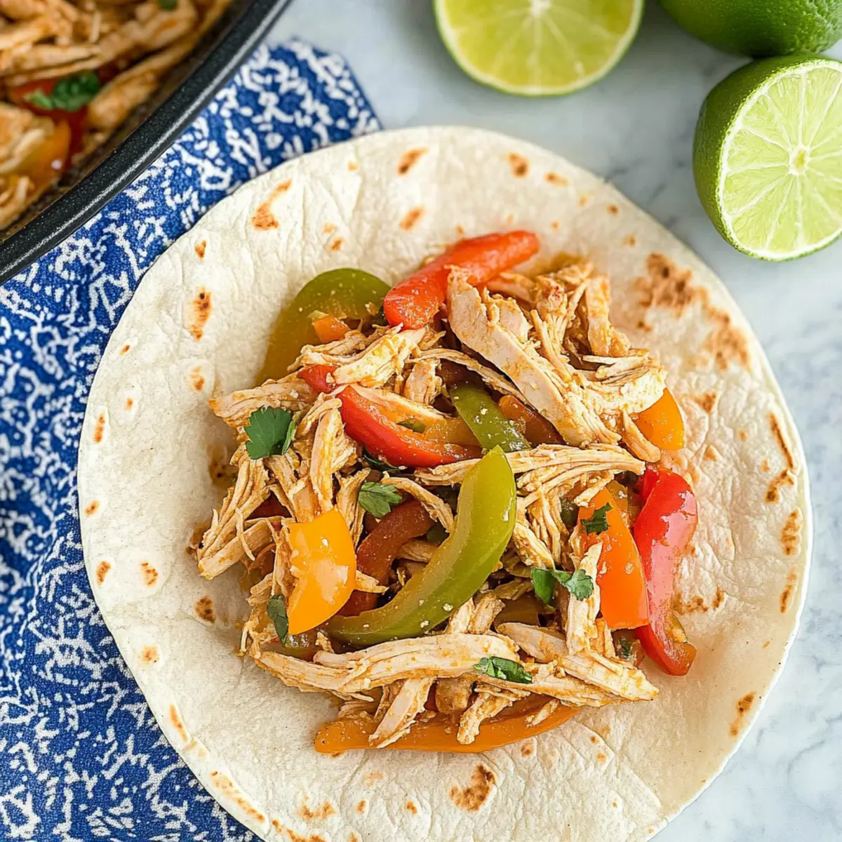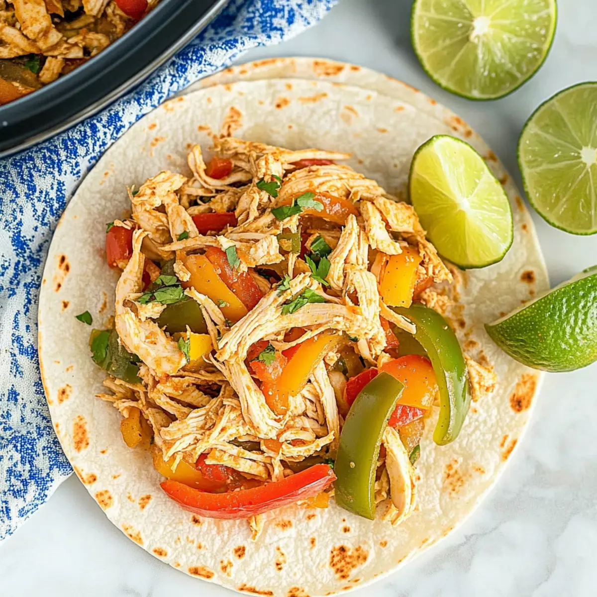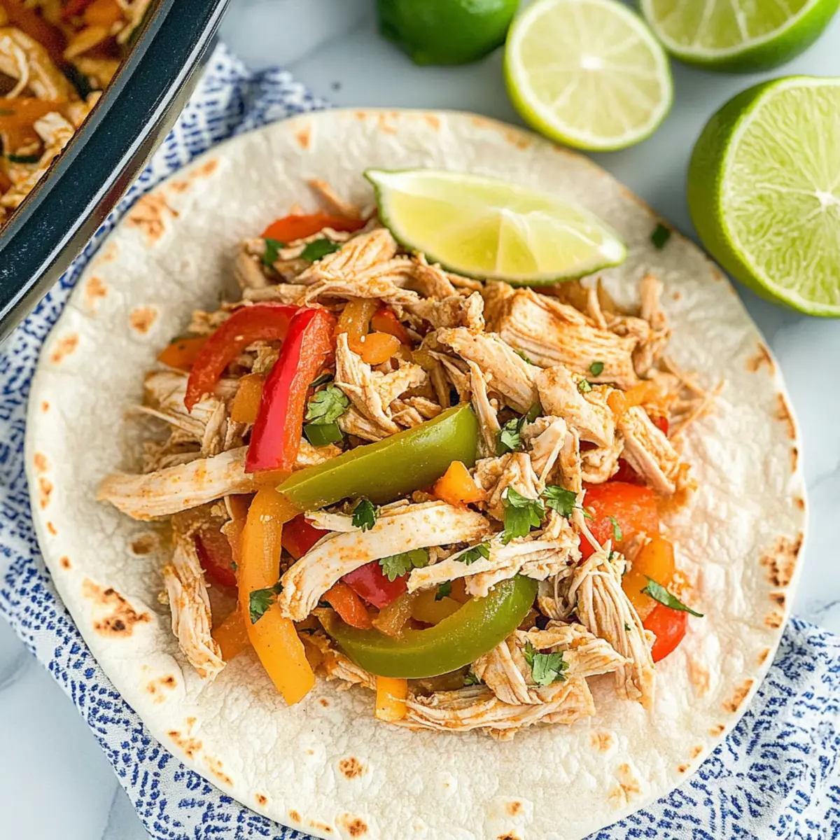 Jump to Recipe Print RecipeThe tantalizing aroma of slow-cooked spices wafting through the house—it’s a warm hug for the senses, isn’t it? That’s precisely what you can expect with this Easy Slow Cooker Chicken Fajitas recipe. Not only is it a breeze to prepare, but it also caters to any health-conscious eater with its low sodium and Whole30-friendly options. Imagine gathering the family around a table filled with fresh, vibrant bell peppers and juicy chicken, each bite delivering a kick of flavor that makes takeout seem like a distant memory. Plus, the versatility of this dish means you can easily swap in steak, shrimp, or pork for a fun twist. Ready to discover how to bring this wholesome delight to your kitchen? Let’s dive in! Why Choose Crockpot Chicken Fajitas? Flavor Explosion: The vibrant mix of bell peppers and spices creates a delicious meal that will tantalize your taste buds. Effortless Preparation: Simply toss everything in the slow cooker and let it work its magic—perfect for busy weeknights! Healthy Choices: This recipe is low in sodium and Whole30 compatible, making it a guilt-free family favorite. Endless Variations: Whether you choose chicken, steak, shrimp, or pork, each version packs a flavorful punch! Enhance with black beans or corn for added nutrition. Crowd-Pleasing Delight: Serve it in tortillas, over rice, or alongside fresh avocado and salsa for a complete meal that everyone will love. Don’t forget to check out our Hawaiian Chicken Salad for another delicious option! Crockpot Chicken Fajita Ingredients • Get ready to whip up a flavorful feast that’s both healthy and hearty! For the Main Dish Rotel – Adds a zesty tomato and chili flavor; substitute with canned diced tomatoes if needed. Honey – Provides a touch of sweetness to balance flavors; can be replaced with maple syrup or omitted for Whole30. Minced Garlic – Enhances taste and aroma; fresh garlic offers the best flavor. Bell Peppers – Offers crunch and sweetness; any color can be used for variety. Diced Onion – Adds depth of flavor; use yellow or white onions for best results. Boneless Skinless Chicken Breasts – The main protein source, making the dish hearty; chicken can be swapped for steak, shrimp, or pork as alternatives. Low Sodium Taco Seasoning – Provides necessary spice; reduces sodium intake compared to packaged options, making it great for the Crockpot Chicken Fajita Recipe. Limes – Used for serving, adding a fresh citrus touch to the dish. Enjoy bringing the vibrant flavors of Mexico into your home kitchen! Step‑by‑Step Instructions for Crockpot Chicken Fajita Recipe Step 1: Prepare the Base In a 6-8 quart crockpot, start by mixing 1 can of Rotel, 2 tablespoons of honey, and 2 minced garlic cloves. Ensure the ingredients are well combined until they form a saucy base, which will meld beautifully with the chicken and vegetables. This zesty mixture adds vibrant flavor to your Crockpot Chicken Fajita Recipe. Step 2: Layer the Vegetables Next, slice your choice of colorful bell peppers and chop a medium onion. Layer these fresh vegetables on top of the Rotel mixture in the crockpot, creating a lush garden of flavor. The peppers will soften and infuse their sweetness into the dish as they cook, setting a perfect backdrop for your chicken to meld with the spices. Step 3: Add the Chicken Carefully place 2-3 boneless skinless chicken breasts on top of the layered vegetables, ensuring they cover the entire surface. Sprinkle a generous 2 tablespoons of low-sodium taco seasoning over the chicken, massaging it lightly to coat all sides. This step is crucial for achieving a flavorful and juicy protein in your Crockpot Chicken Fajita Recipe. Step 4: Cook Until Tender Cover the crockpot with its lid and set it to cook on low for 6-8 hours or on high for 4 hours. The chicken should reach an internal temperature of 165°F, ensuring it’s perfectly cooked and tender. As it simmers, your kitchen will fill with the mouthwatering aroma of perfectly seasoned fajitas! Step 5: Shred the Chicken Once cooked, remove the chicken breasts from the crockpot using tongs and place them on a cutting board. Use two forks to shred the chicken into bite-size pieces. Return the shredded chicken to the crockpot, mixing thoroughly with the peppers and sauce. This melding of flavors is what makes the Crockpot Chicken Fajita Recipe so delightful. Step 6: Serve and Enjoy Serve your delicious fajitas warm, either in soft tortillas or as a standalone dish. For added freshness, squeeze some lime juice over each serving. This final touch elevates the flavors in your Crockpot Chicken Fajita Recipe, making every bite a vibrant experience for you and your loved ones. Crockpot Chicken Fajita Recipe Variations Feel free to customize this delightful recipe to suit your taste buds and dietary preferences! Protein Swap: Substitute chicken with shrimp, steak, or pork for a unique twist. Each protein adds its distinct flavor to the dish. Fajita Seasoning: Use fajita seasoning instead of taco seasoning for a more traditional spice blend. The result will be a lovely balance of flavors that scream “fiesta!” Black Beans Addition: Toss in black beans for an extra protein boost and delightful texture. They meld beautifully with the peppers and chicken. Corn Inclusion: Add sweet corn to enhance the dish’s sweetness and nutrition. It creates a lovely contrast with the spice, making every bite enjoyable. Vegan Option: For a plant-based rendition, replace chicken with diced tempeh or tofu, and use cashew cream for a creamy texture. It’s a hearty, fulfilling meal that even non-vegans will appreciate. Spicy Kick: Add sliced jalapeños or a sprinkle of cayenne for those who crave heat. Adjust according to your tolerance, and enjoy the fiery flavor! Herbaceous Flavor: Garnish with fresh cilantro or parsley just before serving. The herbs will brighten up your dish and add a refreshing finish. Creamy Addition: Mix in a d
