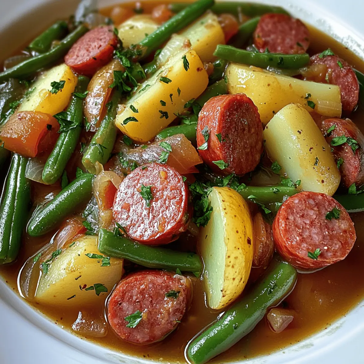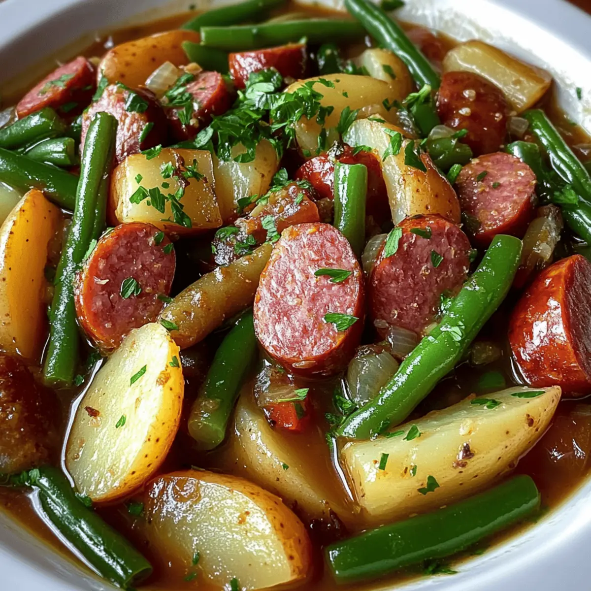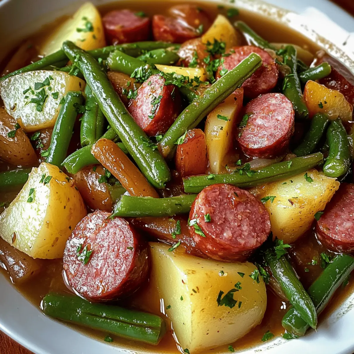 Jump to Recipe Print RecipeAs I stirred the bubbling mixture in my crockpot, the inviting aroma of savory kielbasa mingled with fresh green beans filled my kitchen, reminding me why I love cooking so much. This Easy Crockpot Kielbasa and Green Beans recipe is a delightful one-pot comfort meal that comes together effortlessly, requiring just 15 minutes of prep time. Imagine the joy of walking into your home after a long day and being greeted by the tantalizing scent of a warm, hearty dinner waiting for you! It’s not only beginner-friendly but also a healthy take on comfort food, making it a perfect choice for families and busy nights. With a few customizable options and a set-it-and-forget-it cooking method, this dish invites both creativity and ease. Ready to indulge in a comforting bowl of this warm goodness? Let’s dive into the details. Why is this dish your new favorite? Ease of Preparation: This Crockpot Kielbasa and Green Beans recipe only takes 15 minutes of prep—perfect for busy evenings! Flavor Explosion: The savory kielbasa melds beautifully with tender green beans and rich broth, creating a deeply satisfying meal. Healthy Comfort: Packed with nutritious ingredients, this dish offers the warmth of comfort food while keeping your health in check. Versatile Variations: Customize with extra veggies or different proteins, like using turkey kielbasa or adding carrots, for a twist on a classic. Crowd-Pleaser: Whether you’re hosting a cozy dinner or a family gathering, this recipe is sure to impress everyone at the table, just like my Sticky Chicken Rice or BBQ Chicken Sandwiches. One Pot Wonder: Everything cooks together, allowing flavors to blend perfectly while you relax and unwind. Crockpot Kielbasa and Green Beans Ingredients For the Main Dish Kielbasa sausage – Provides a rich, smoky flavor and serves as the protein component; you can try turkey, pork, or beef kielbasa. Fresh green beans – Adds a pop of color and freshness, while imparting a satisfying crunch; frozen green beans work too, just adjust the cooking time. Medium-sized potatoes – Acts as the hearty base that soaks up flavors; Yukon Gold or red potatoes can also be used for a twist. Medium onion – Brings natural sweetness and aromatic quality to the dish; shallots can substitute for a milder flavor. Garlic cloves – Imparts a pungent kick and deepens overall flavor; fresh is preferred, but garlic powder can be a good alternative. Chicken broth – Provides moisture and enhances the savory profile; opt for vegetable broth for a lighter dish or low-sodium for a healthier option. Olive oil – Used for sautéing kielbasa and aromatics, imparting a clean flavor; feel free to use canola or vegetable oil if you prefer. Salt and black pepper – Essential for seasoning and enhancing flavors; adjust usage based on dietary needs but no substitutions recommended. Red pepper flakes – Optional for those who like a bit of heat; fresh chili flakes can be used or just omit if you prefer no spice. Fresh parsley – For garnish, adds vibrant color and herbal freshness; chives or green onions are great alternatives. Optional Add-ins Carrots – Enhance nutrition and sweetness; cut them to a similar size for even cooking. Bell peppers – Vibrant and colorful, offering a nice crunch; use any variety you love! Sweet potatoes – Swap with regular potatoes for a sweeter twist that complements the dish beautifully. This Crockpot Kielbasa and Green Beans recipe is not only simple but also filled with delicious possibilities that can fit your taste preferences! Step‑by‑Step Instructions for Crockpot Kielbasa and Green Beans Step 1: Prep the Crockpot Start by setting your crockpot to low heat, allowing it to warm up. This is the heart of your Crockpot Kielbasa and Green Beans dish, where all the ingredients will meld beautifully over time. Make sure you have all your ingredients ready for the next steps, as the simplicity of this recipe shines in its ease of preparation. Step 2: Brown the Kielbasa In a skillet, heat olive oil over medium heat. Add sliced kielbasa and cook for about 5 minutes, stirring frequently until golden brown and slightly crispy. This step enhances the smoky flavor of the sausage, creating a delicious base for your dish. Once browned, transfer the kielbasa to a plate, leaving the flavorful drippings in the skillet. Step 3: Sauté the Aromatics In the same skillet, add chopped onion and minced garlic. Sauté for about 2-3 minutes until the onion becomes translucent and the garlic is fragrant. This step infuses the dish with a delightful aroma that pairs wonderfully with the kielbasa. After sautéing, set this mixture aside to layer in the crockpot soon. Step 4: Layer the Vegetables In your prepared crockpot, layer the cubed potatoes first, followed by the fresh green beans. The potatoes will provide a hearty base for the Crockpot Kielbasa and Green Beans, soaking up all the lovely flavors. Ensure that the vegetables are arranged evenly to promote uniform cooking. Step 5: Add the Aromatics and Kielbasa Next, sprinkle the sautéed onion and garlic mixture over the layered potatoes and green beans. Then, top everything with the browned kielbasa. This layering technique will allow each ingredient to enhance the flavors of those around it as they slowly cook together in the crockpot. Step 6: Pour in the Broth Now, carefully pour chicken broth over the entire mixture in the crockpot, ensuring all ingredients are well covered. The broth adds moisture and depth to your Crockpot Kielbasa and Green Beans, creating a savory base for the dish to simmer in. Feel free to adjust the amount of broth to your desired soupiness. Step 7: Season the Dish Season your dish with salt, black pepper, and optional red pepper flakes for a touch of heat. Gently stir the ingredients to combine flavors but avoid breaking up the potatoes. These seasonings will elevate the natural flavors of the sausage and vegetables, making for a 